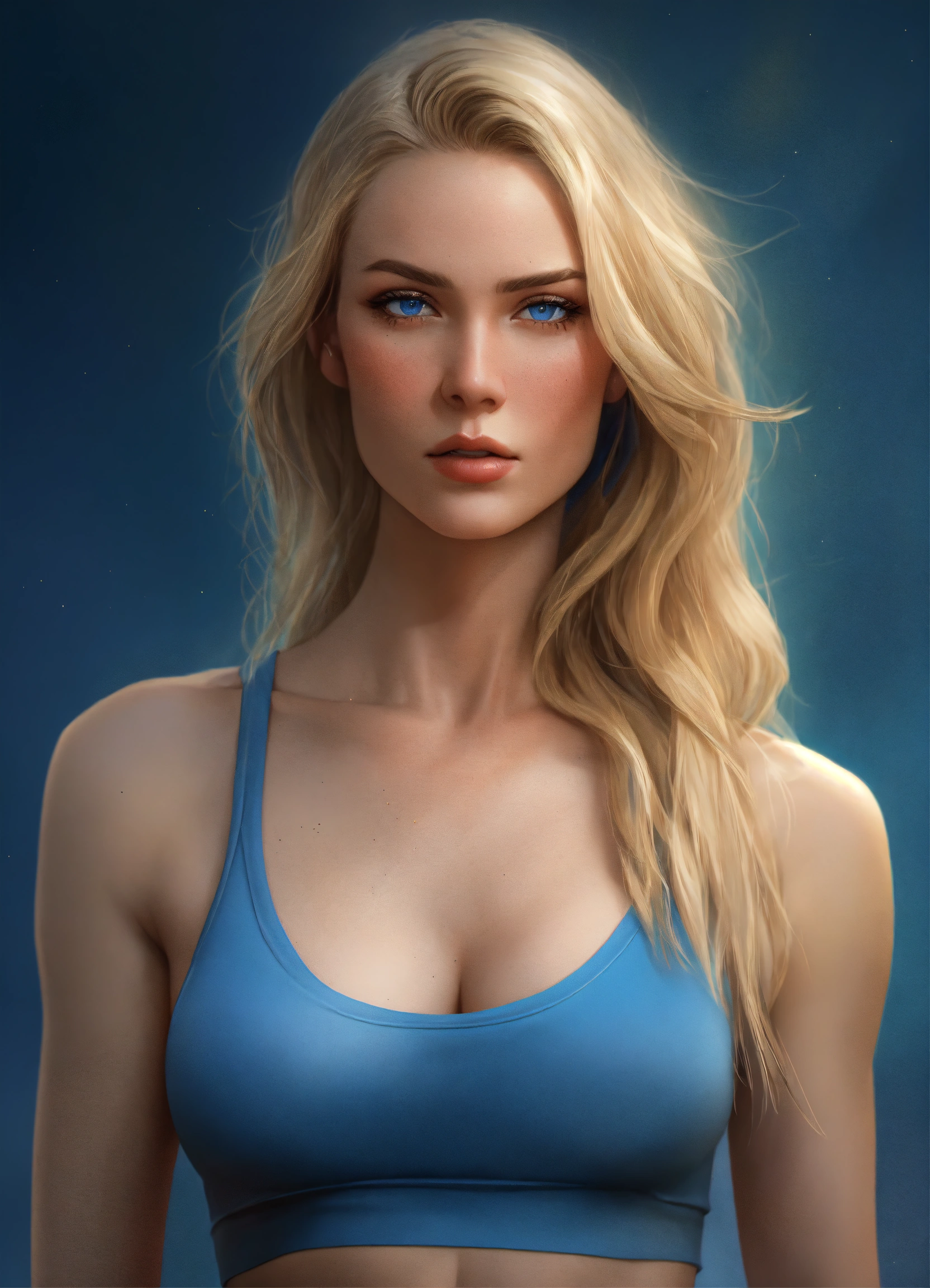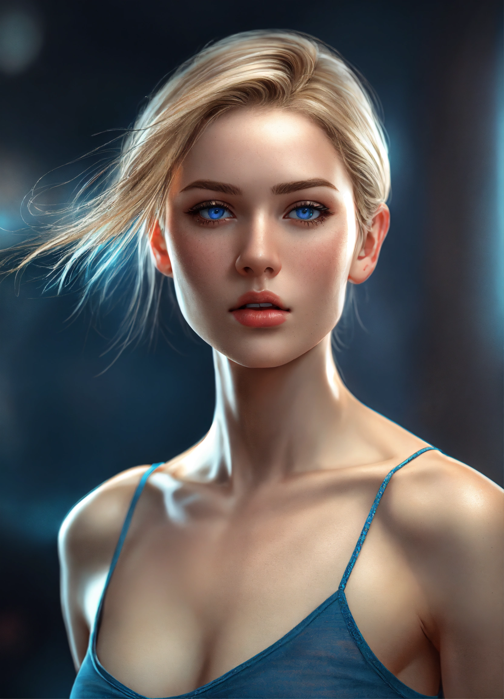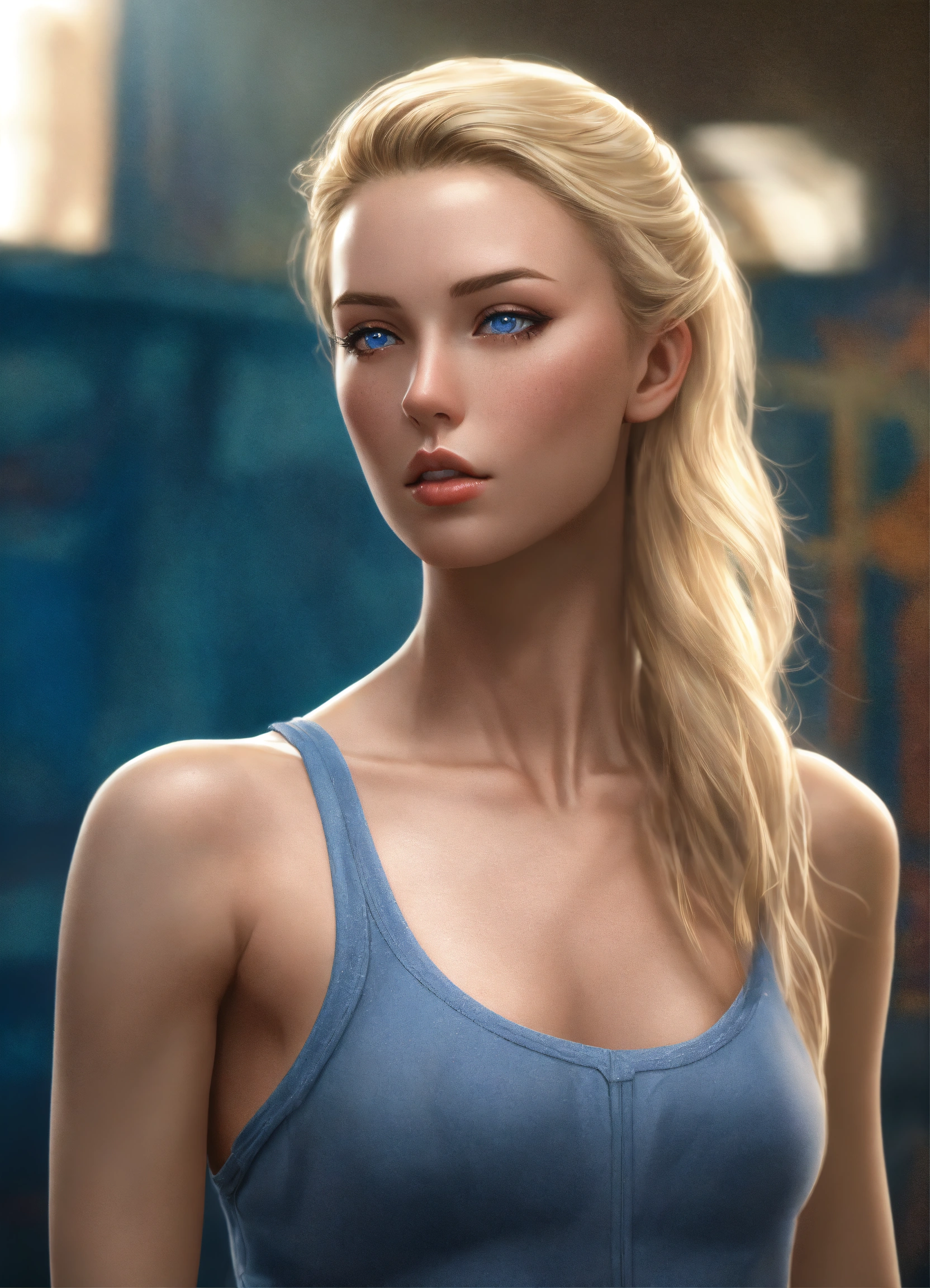 Full body potrait of thin beautiful faced tall woman with high cheekbones, pale skin, blonde hair, blue eyes, heavy chest, thin muscular midriff in pain, illustration, hyper realistic, highly detailed, digital photography, side glamor pose, 4k, hdr, smooth, sharp focus, high resolution, aspiring photographer, 8k, 3d