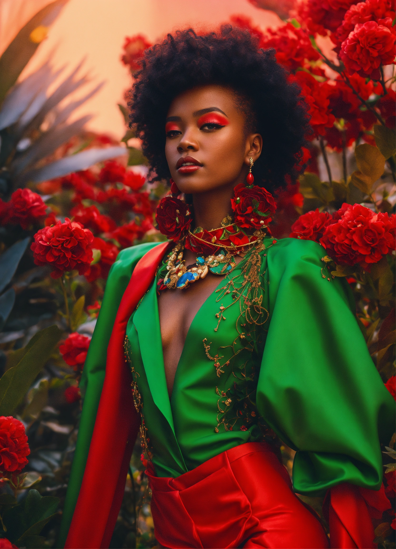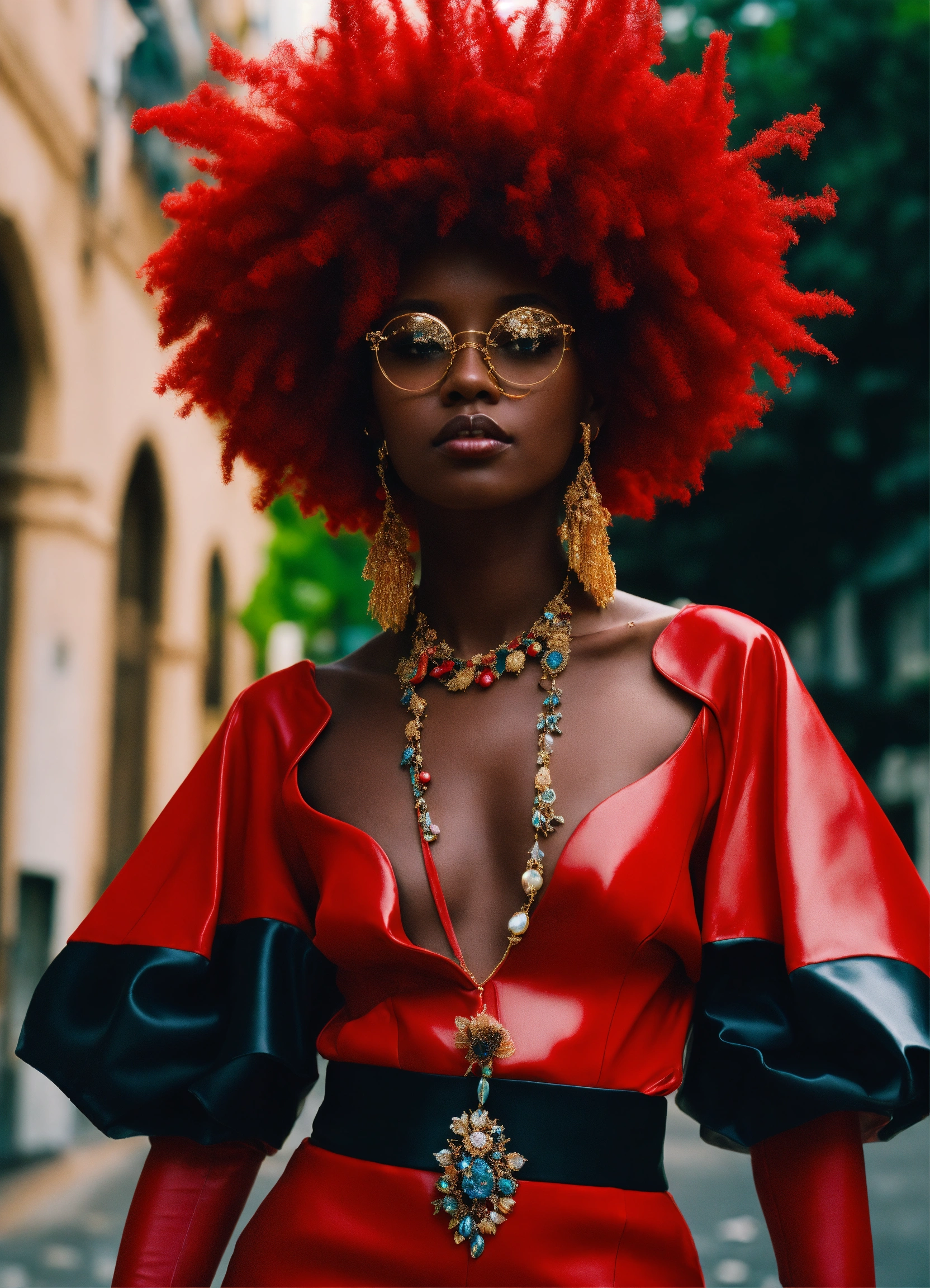 Black woman, size 12, 8k resolution, hyper realistic, day, 35mm film, editorial, high fashion, girl in eco friendly haute couture outfit in the style of anime, surrealism, akira style. details. fine jewelry. eco friendly. red vibe.