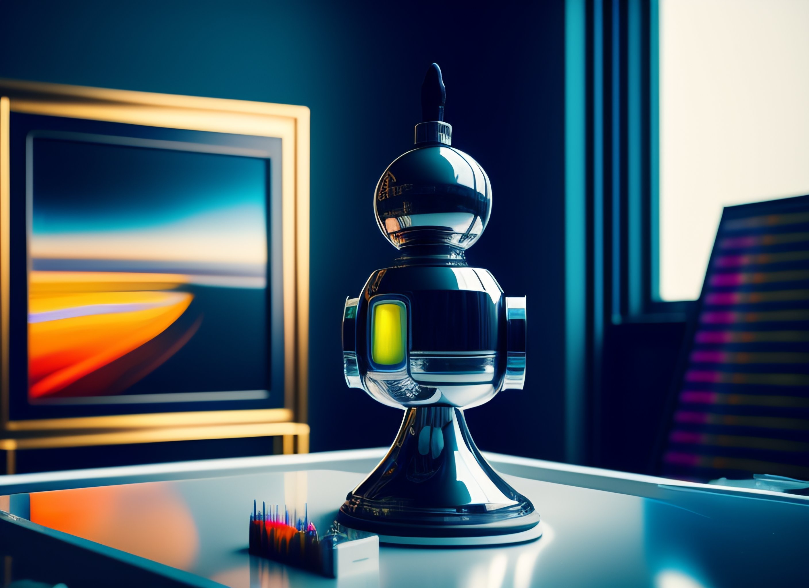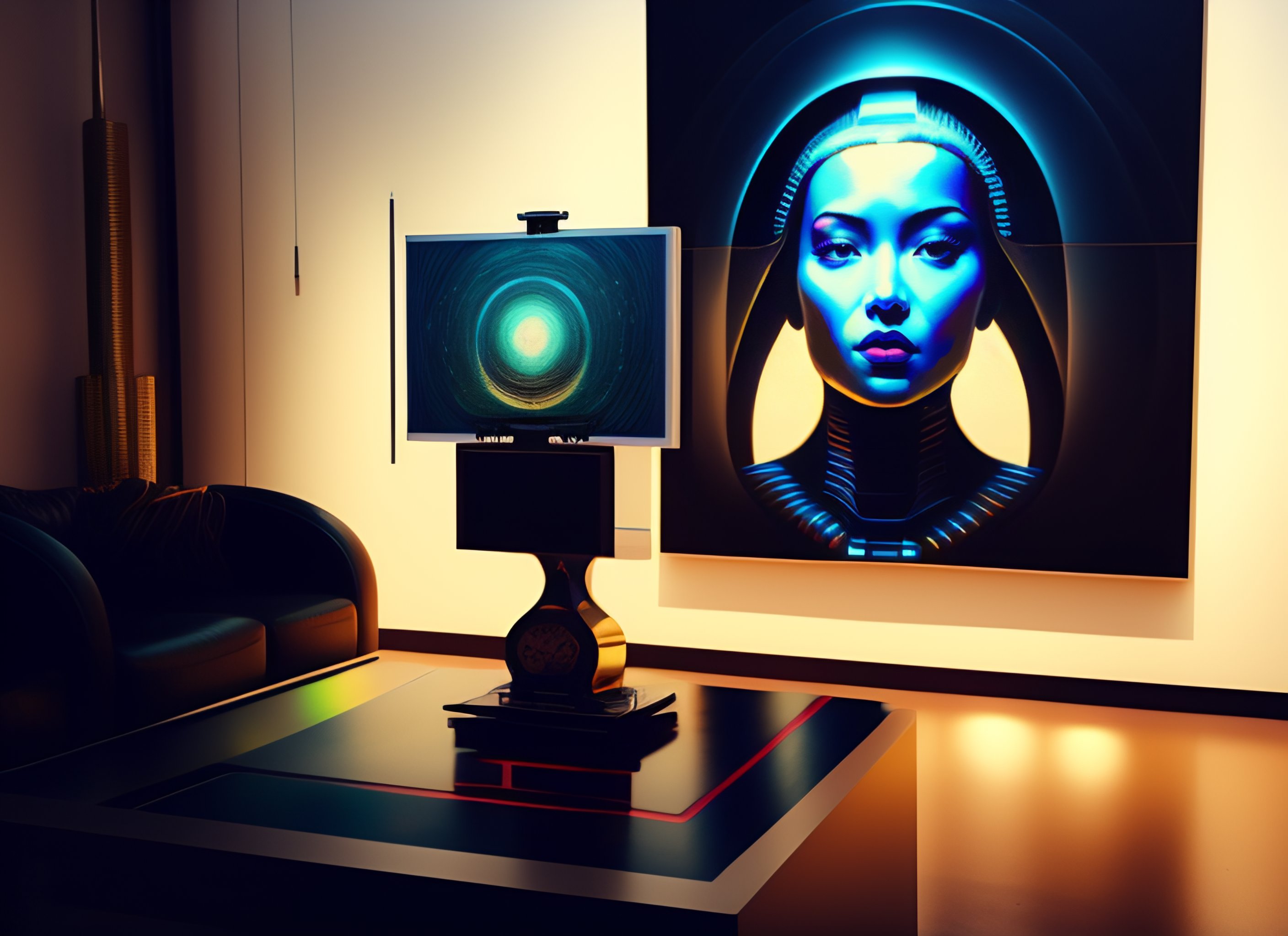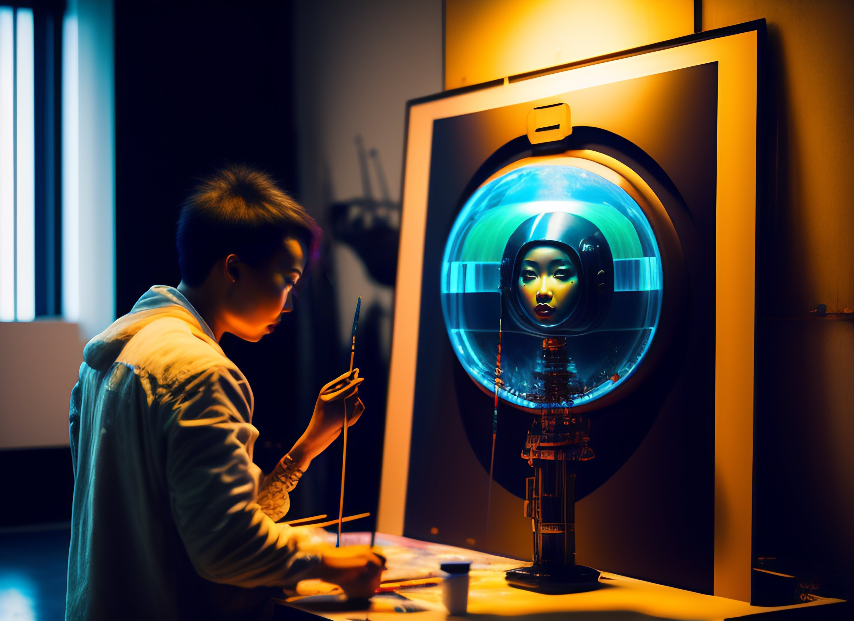 Photo of futuristic ai robot painter as artist with robot head, creating a painting with acrylic paint and brushes in a futuristic large open artist studio, looking down from corner of the room camera angle, by h. r giger, by, rich deep colors. masterpiece, intricate artwork by tooth wu and wlop and beeple, gaspar noe, james cameron
