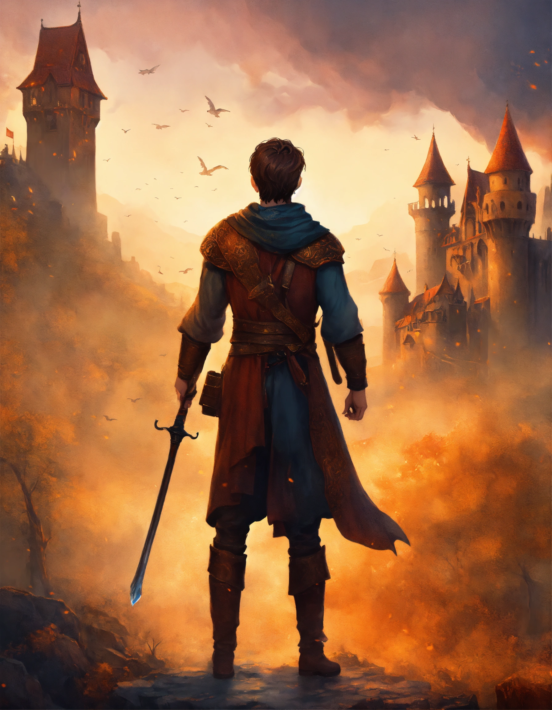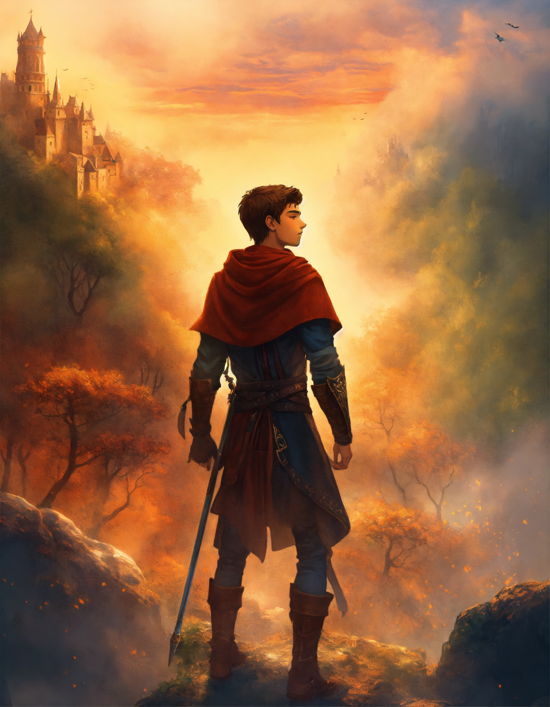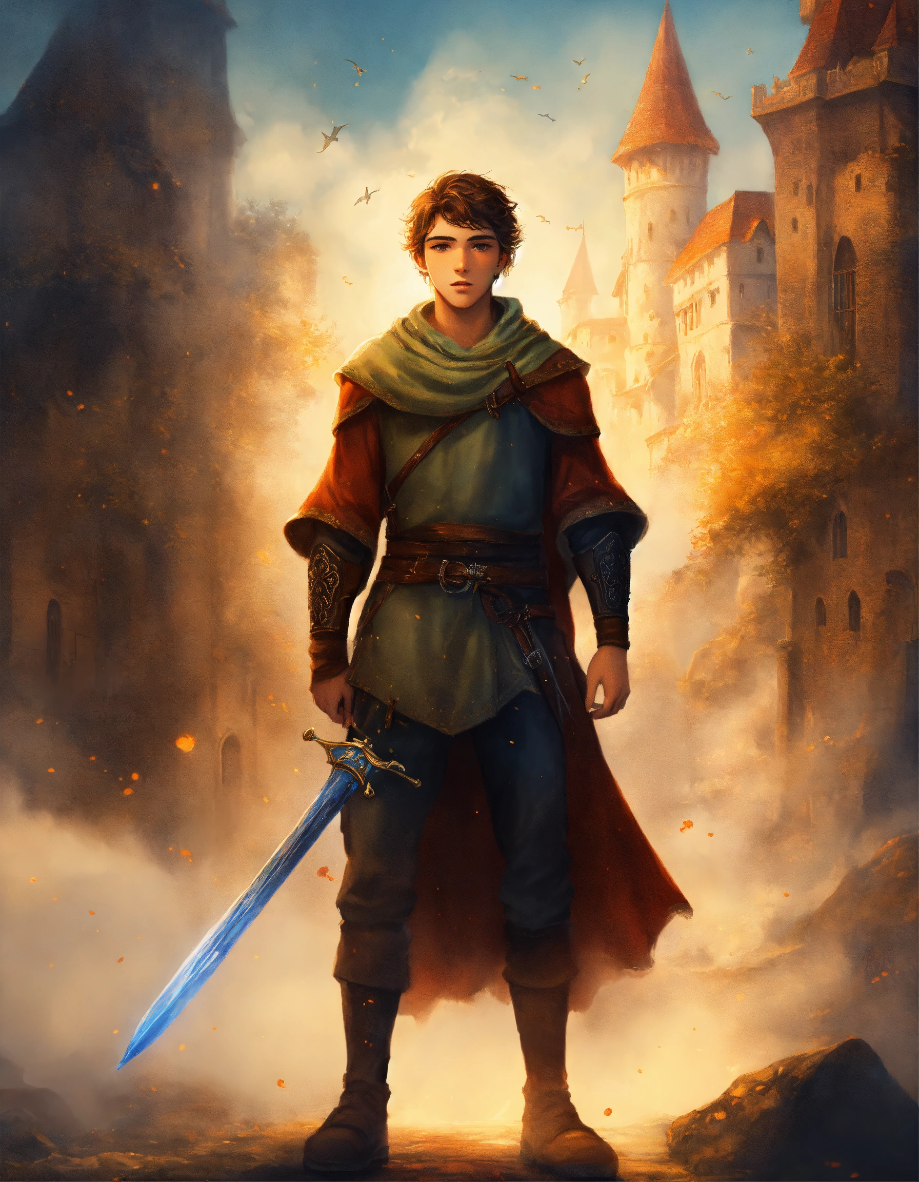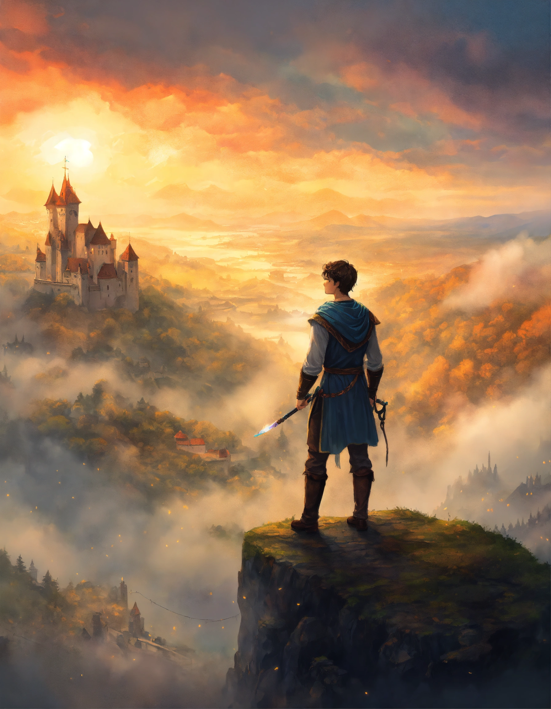 Create a beautiful cover illustrated paint, drawing paint a a 15 years old young man standing surrounded by fogs, epic adventure, fantasy background design with effects, illustrated paint art, paint art, cartoon illustration, daylight, medieval, epic fantasy, surrounded by fogs, medieval, detailed face
