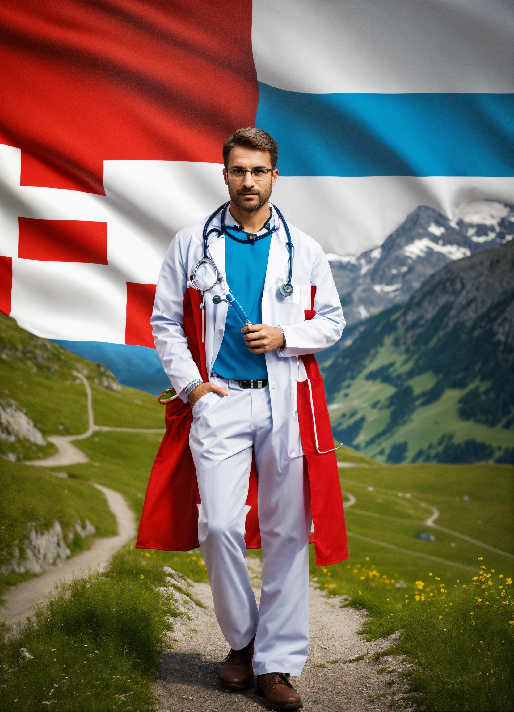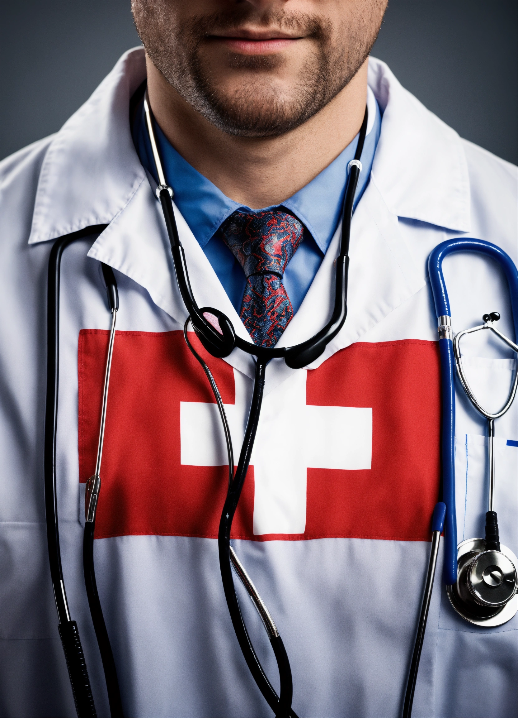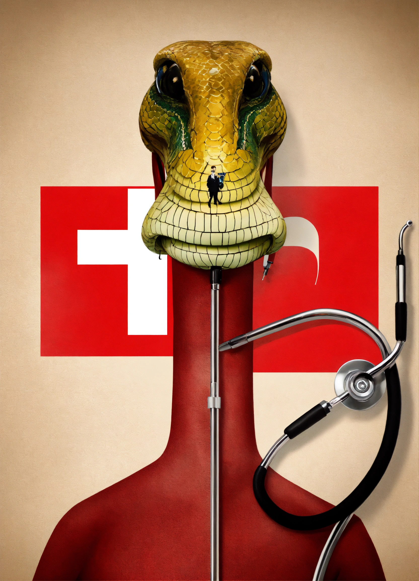 A symbol representing medical activity in switzerland, with a doctor with a stethoscope around his neck next to the swiss flag and a snake wrapped around a needle.