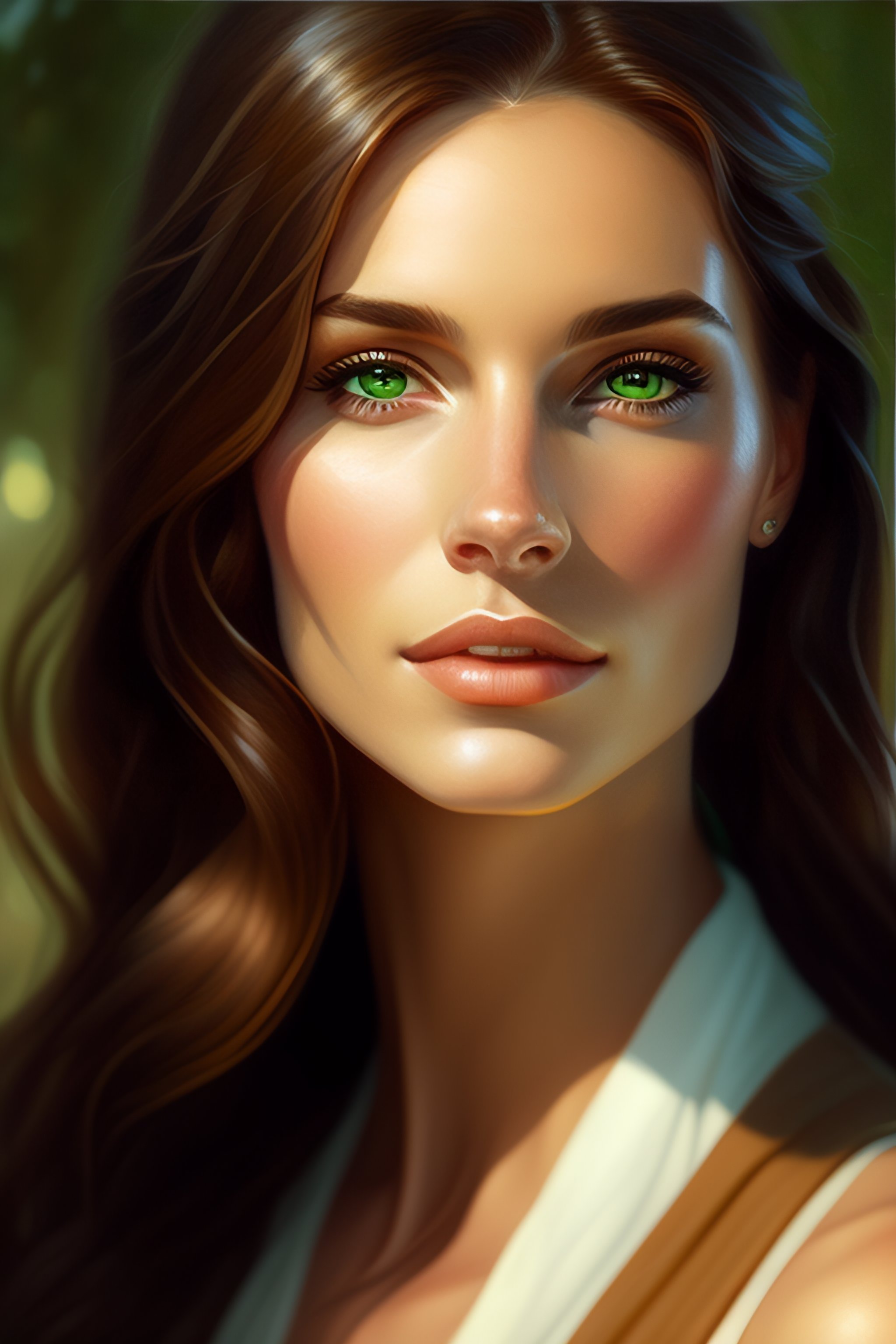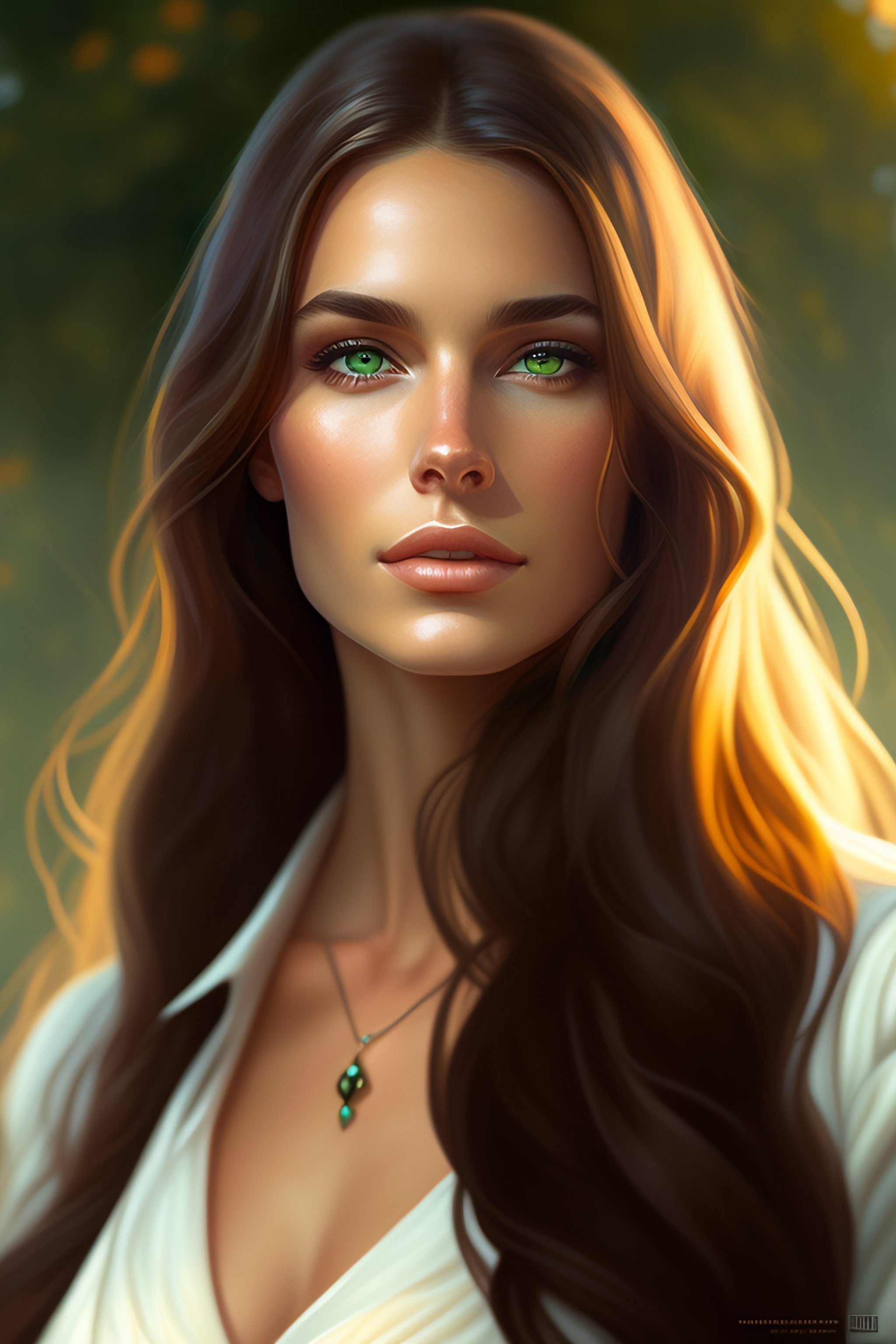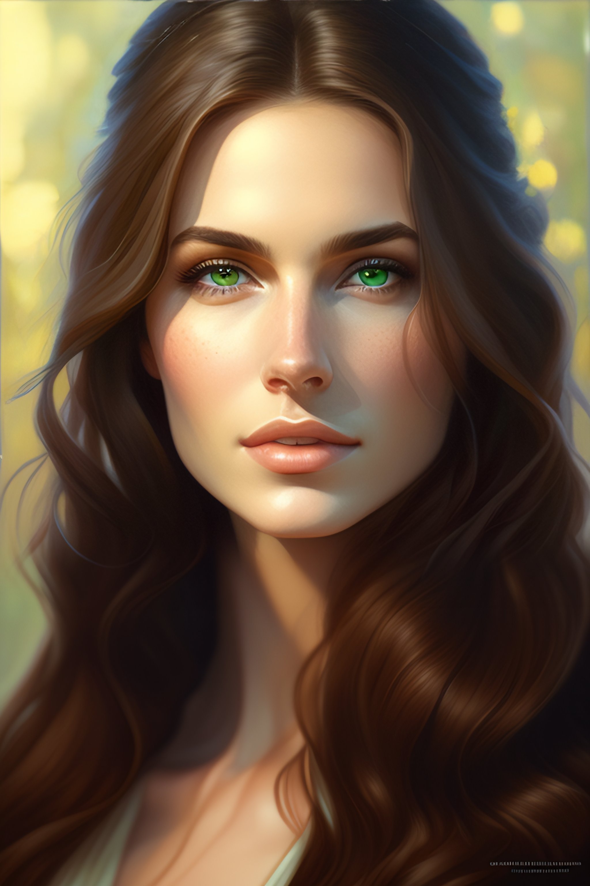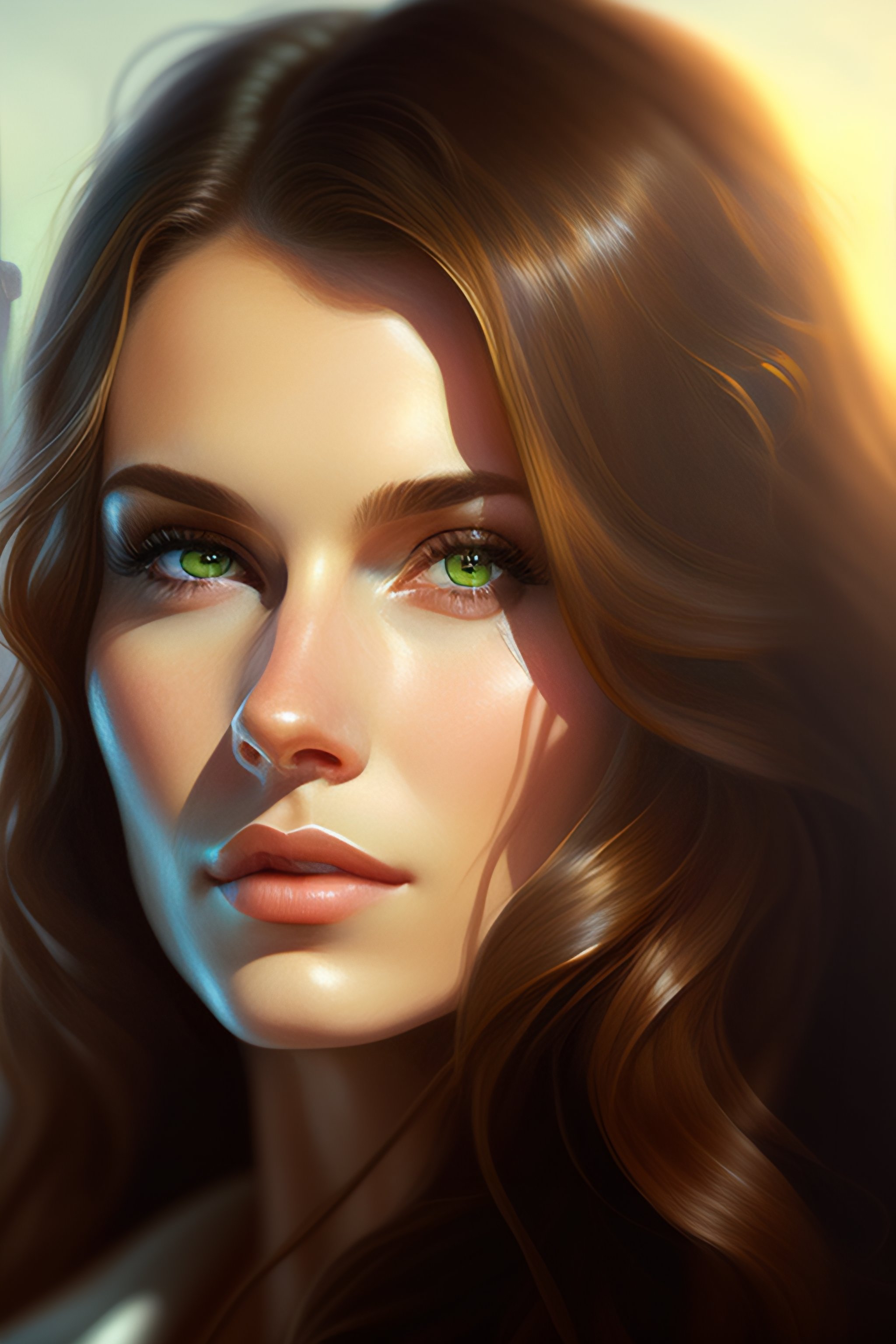Portrait of a 30-year-old woman, straight long light-brown hair, round face, green eyes, drooping eyelid, cinematic lighting, highly detailed, digital painting, artstation, concept art, smooth, sharp focus, illustration, art by artgerm and greg rutkowski, alphonse mucha and charlie bowater