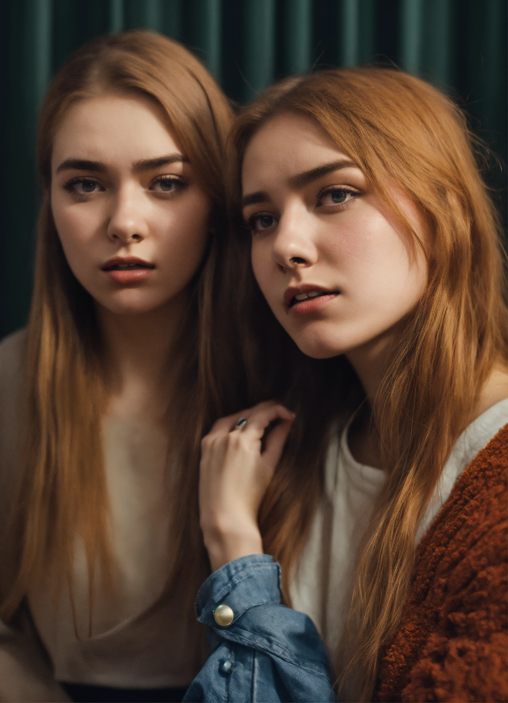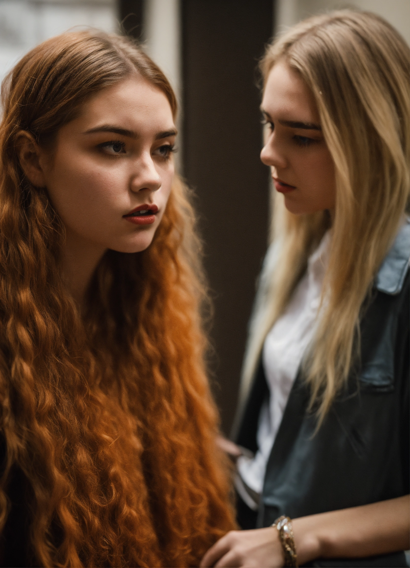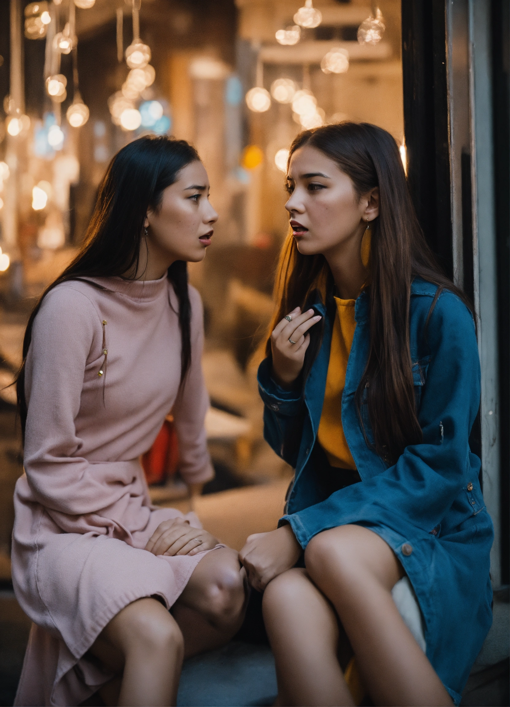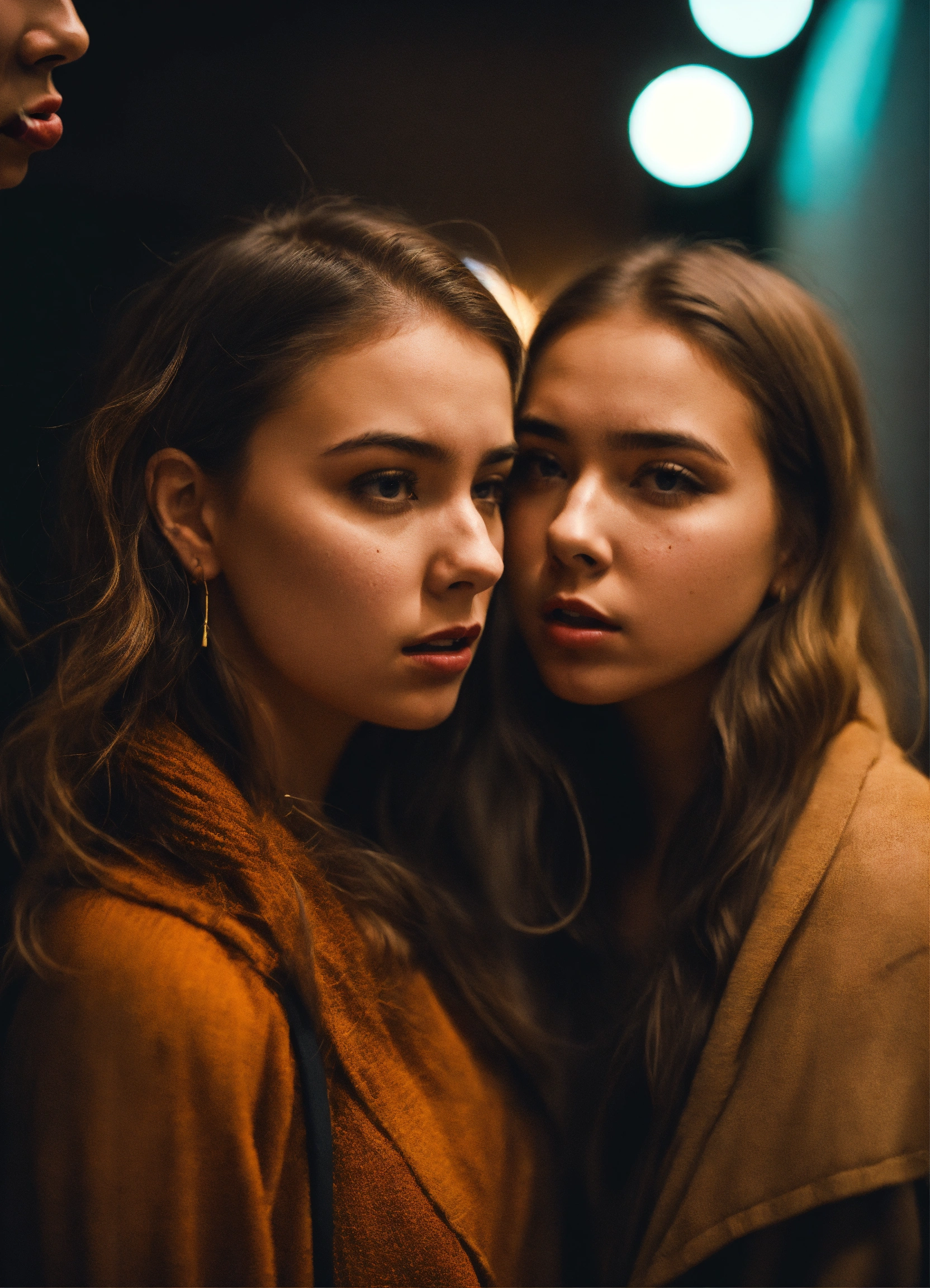 Avant-garde young women sharing in panic with each other about spine-chilling incident