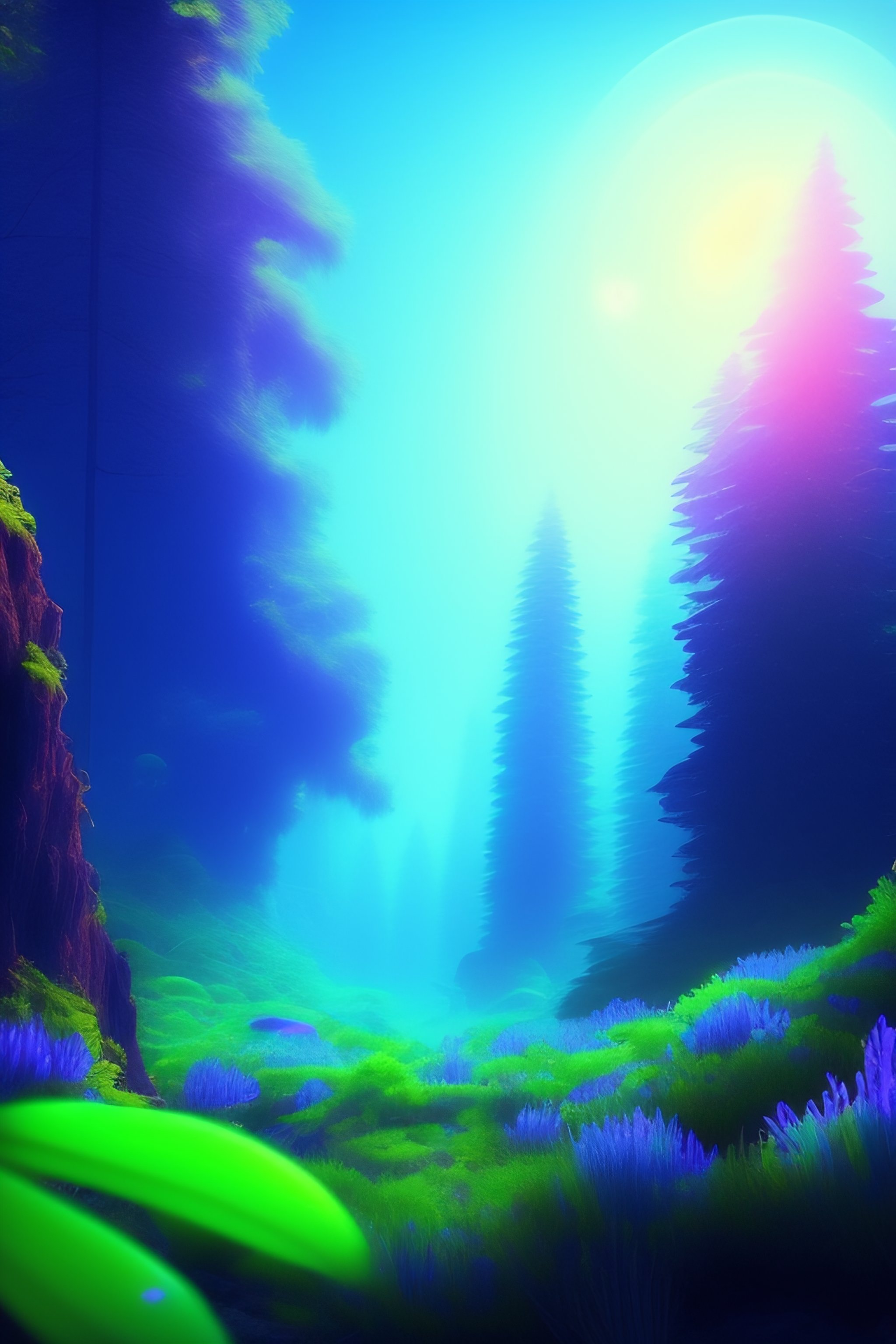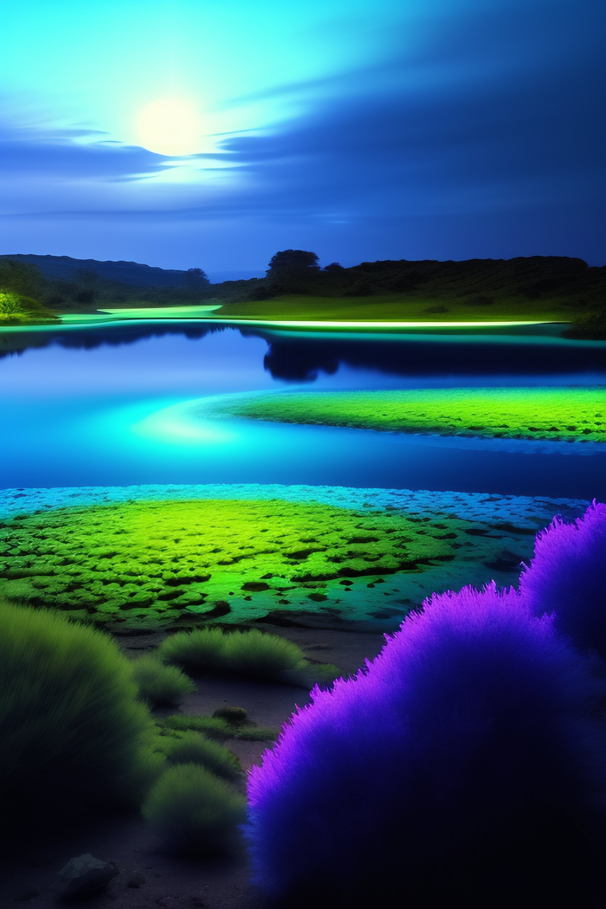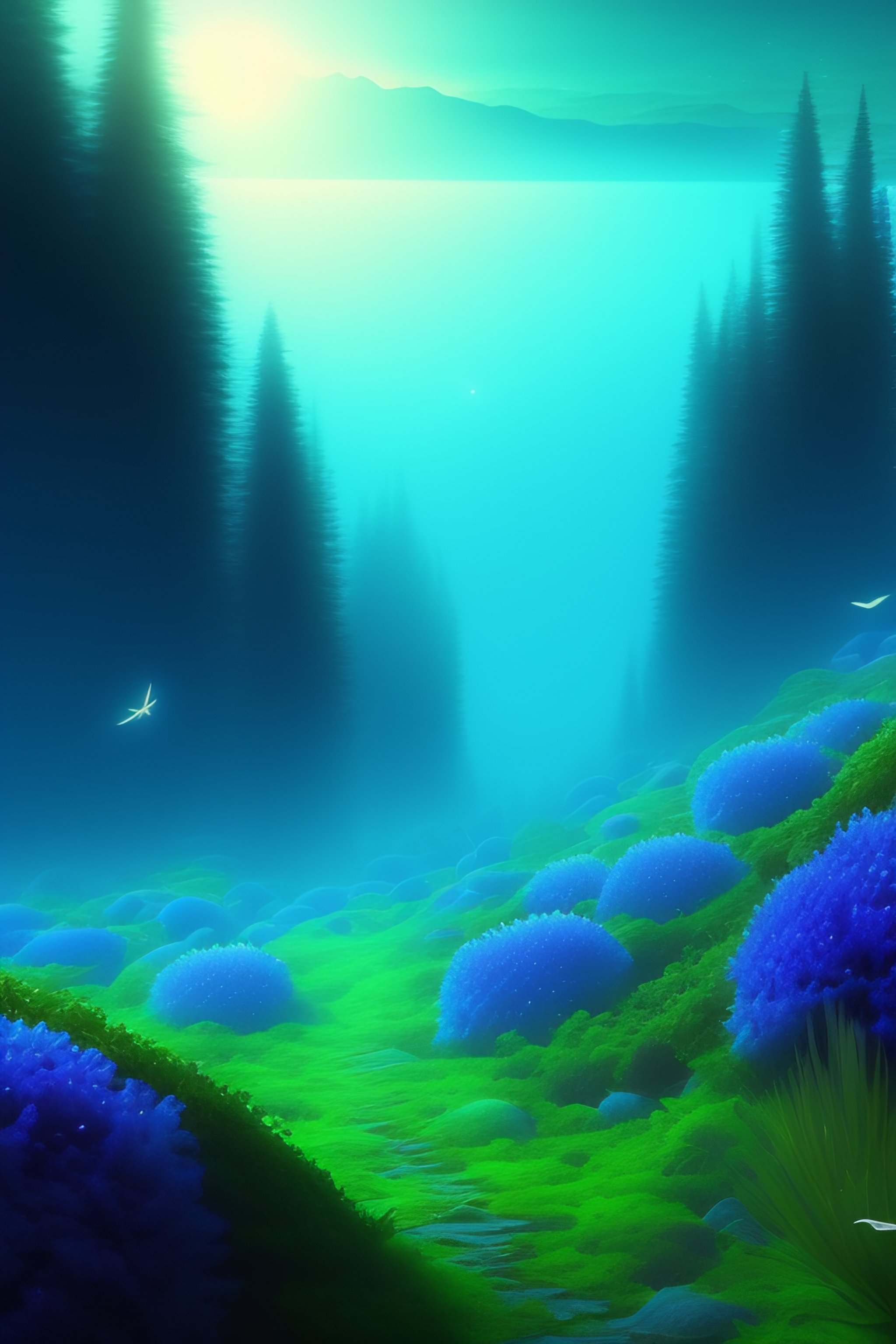 A hyper realistic photo of a blue bioluminescent world, green vegetation with blue details, a lot of colorful bioluminescent creatures.