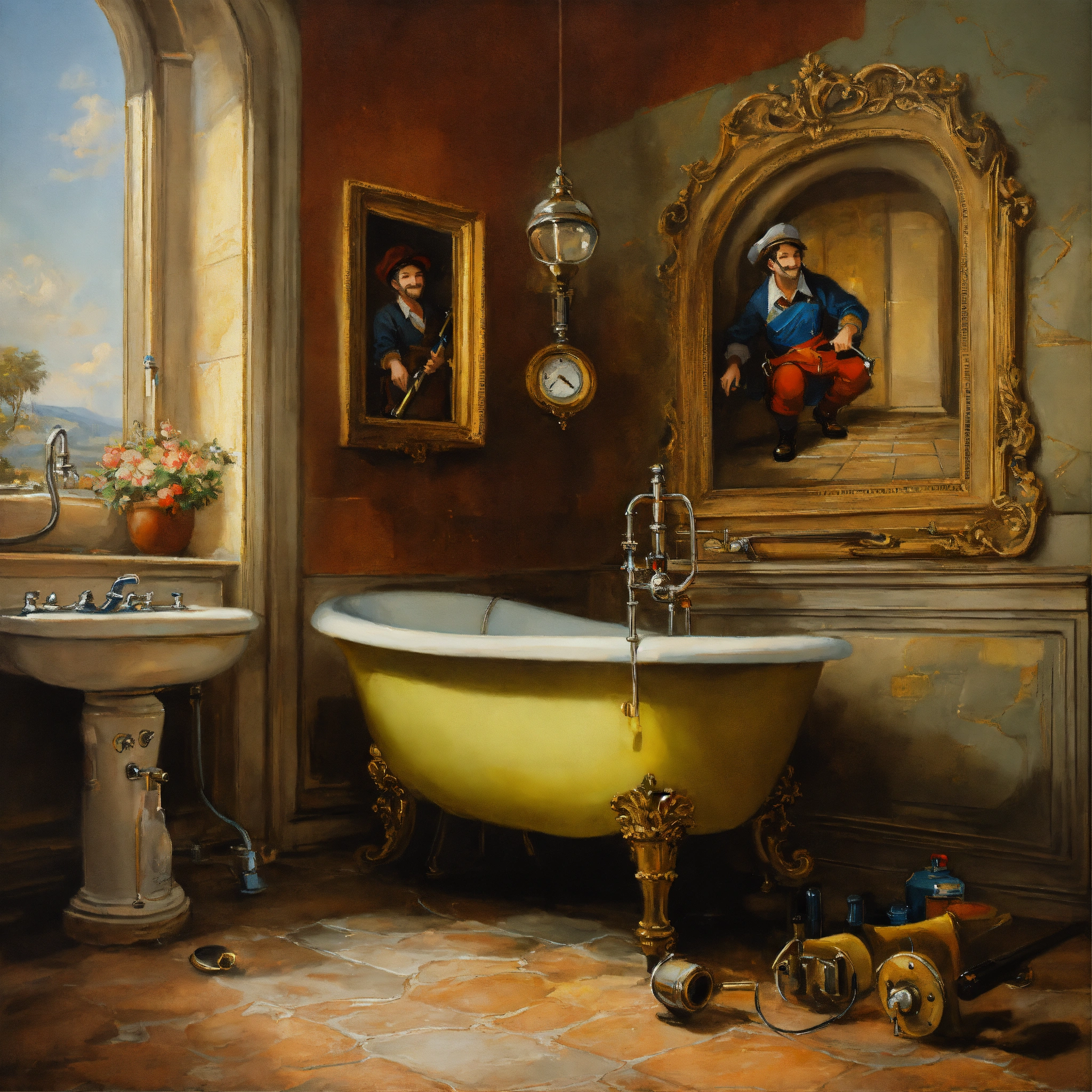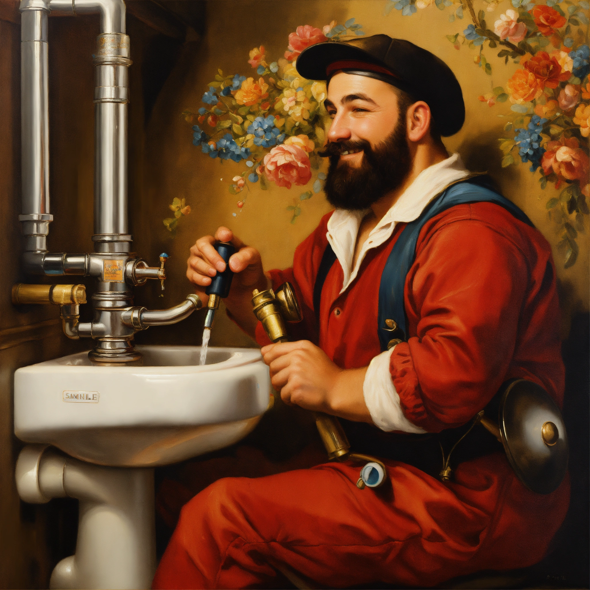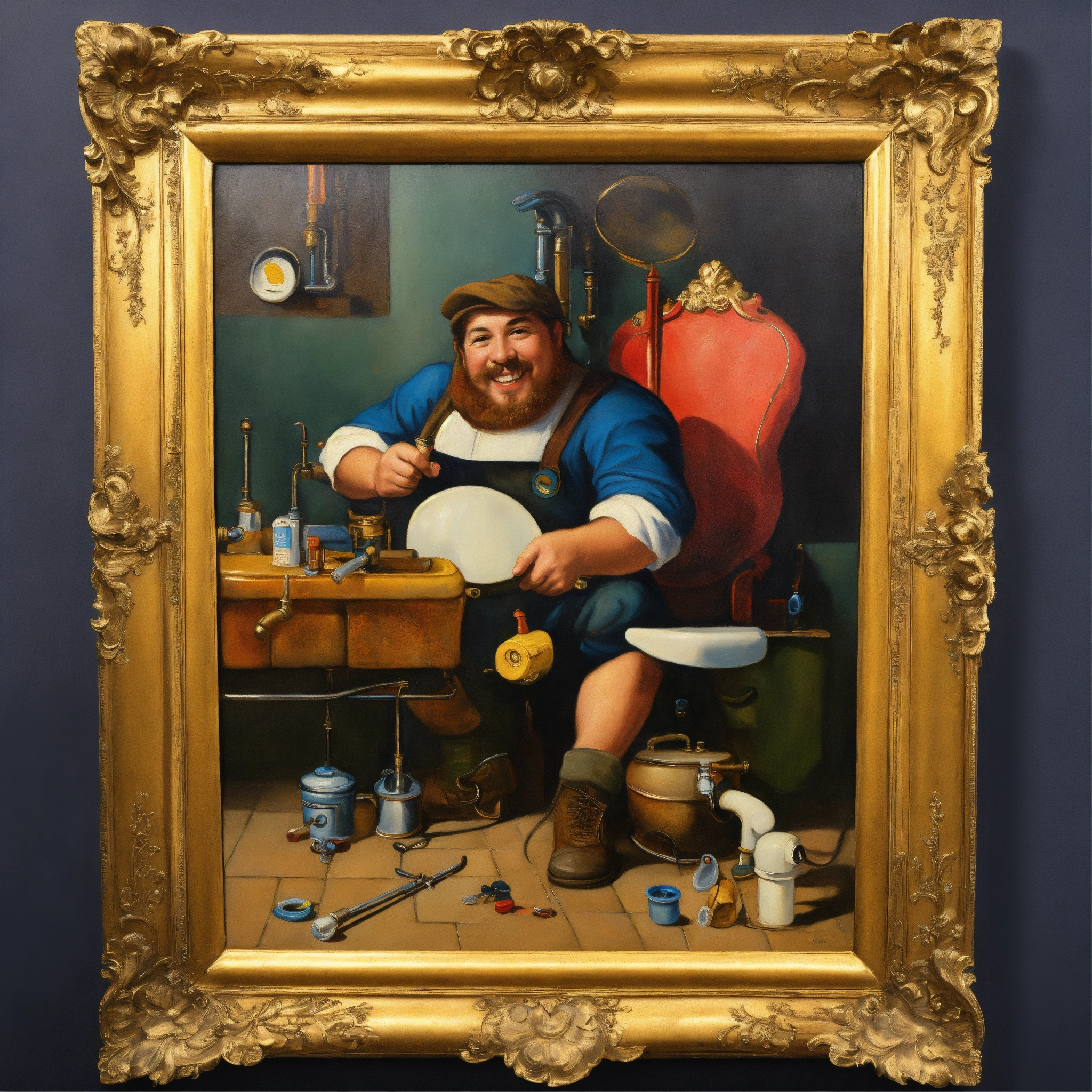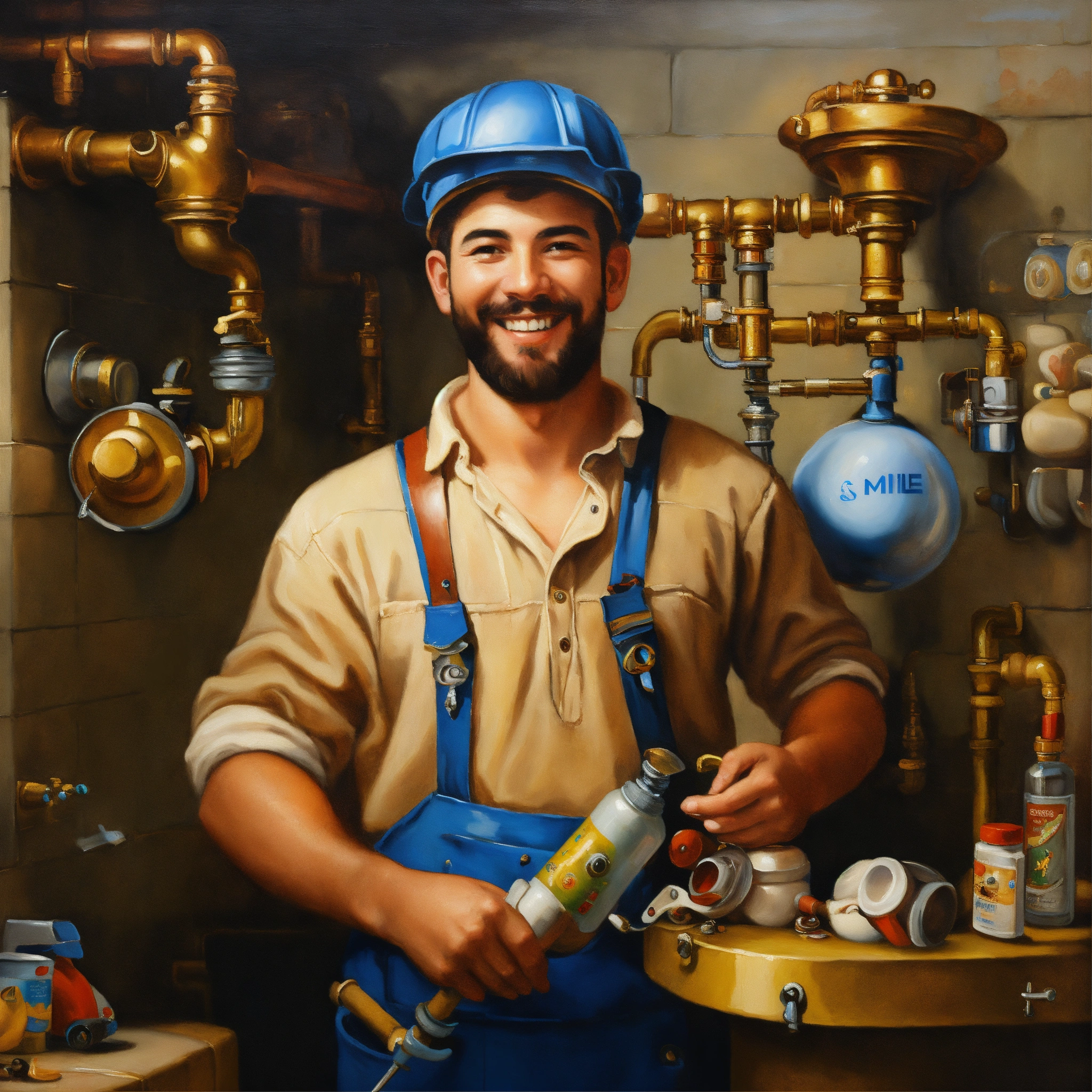 Modern plumber and plumbing device working with smile oil painting baroque art