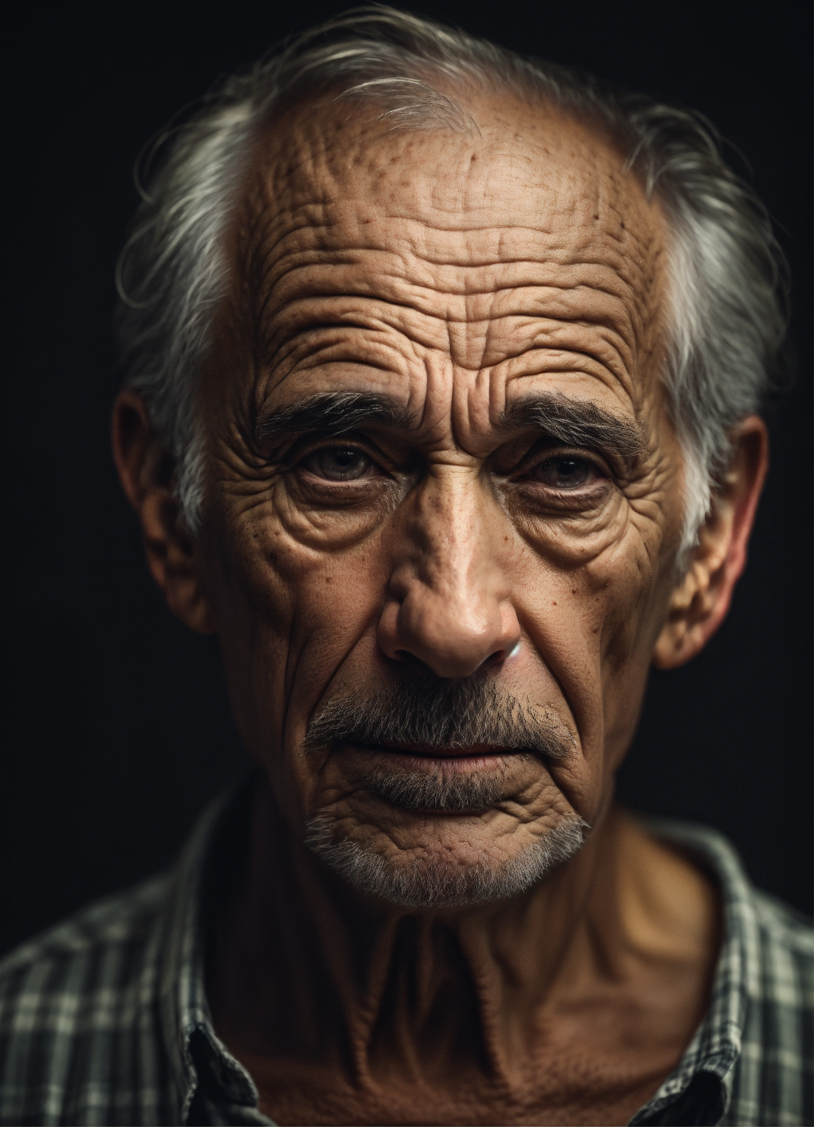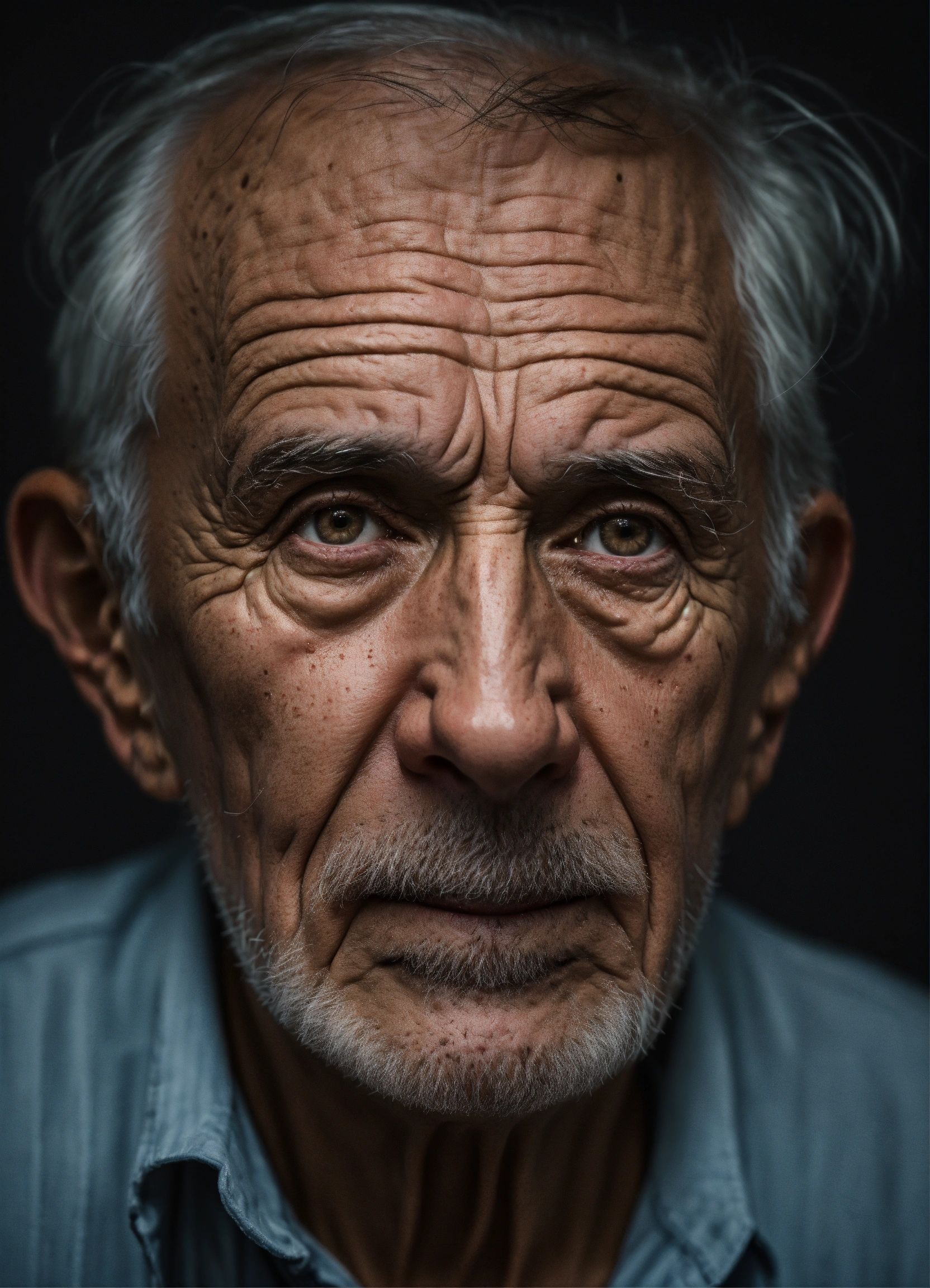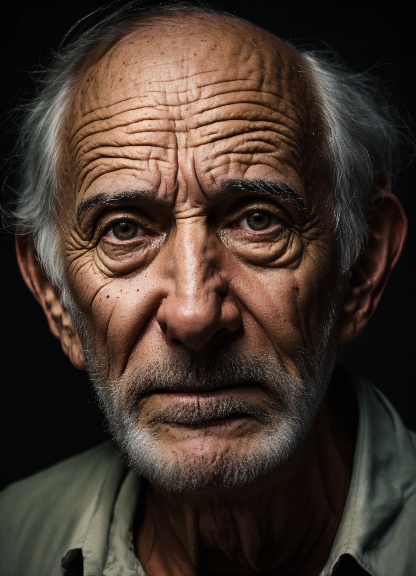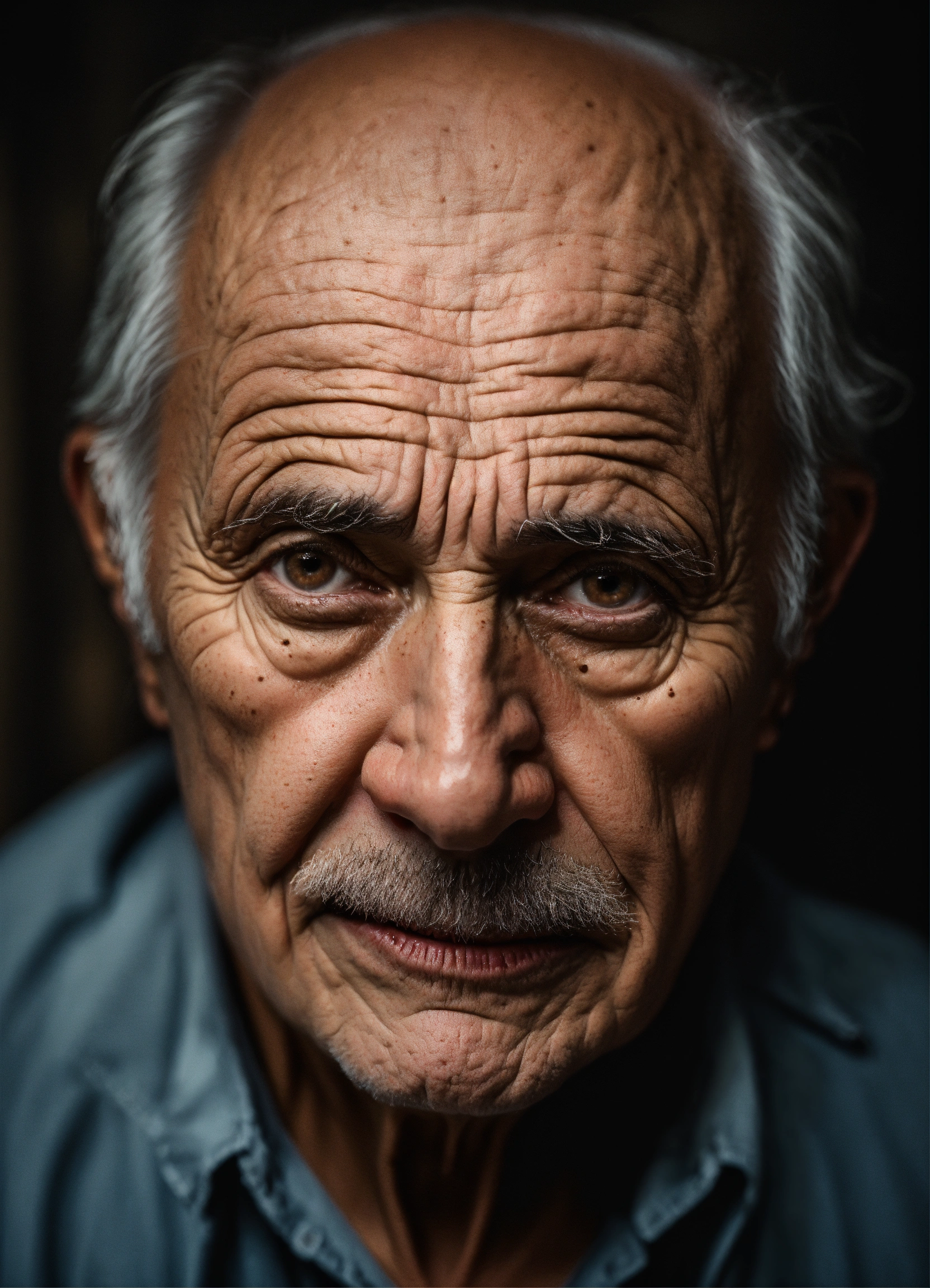 Portrait old scary american man, thinning hair, small little almond eyes, with wrinkles and dark circles telling a story, dark room background