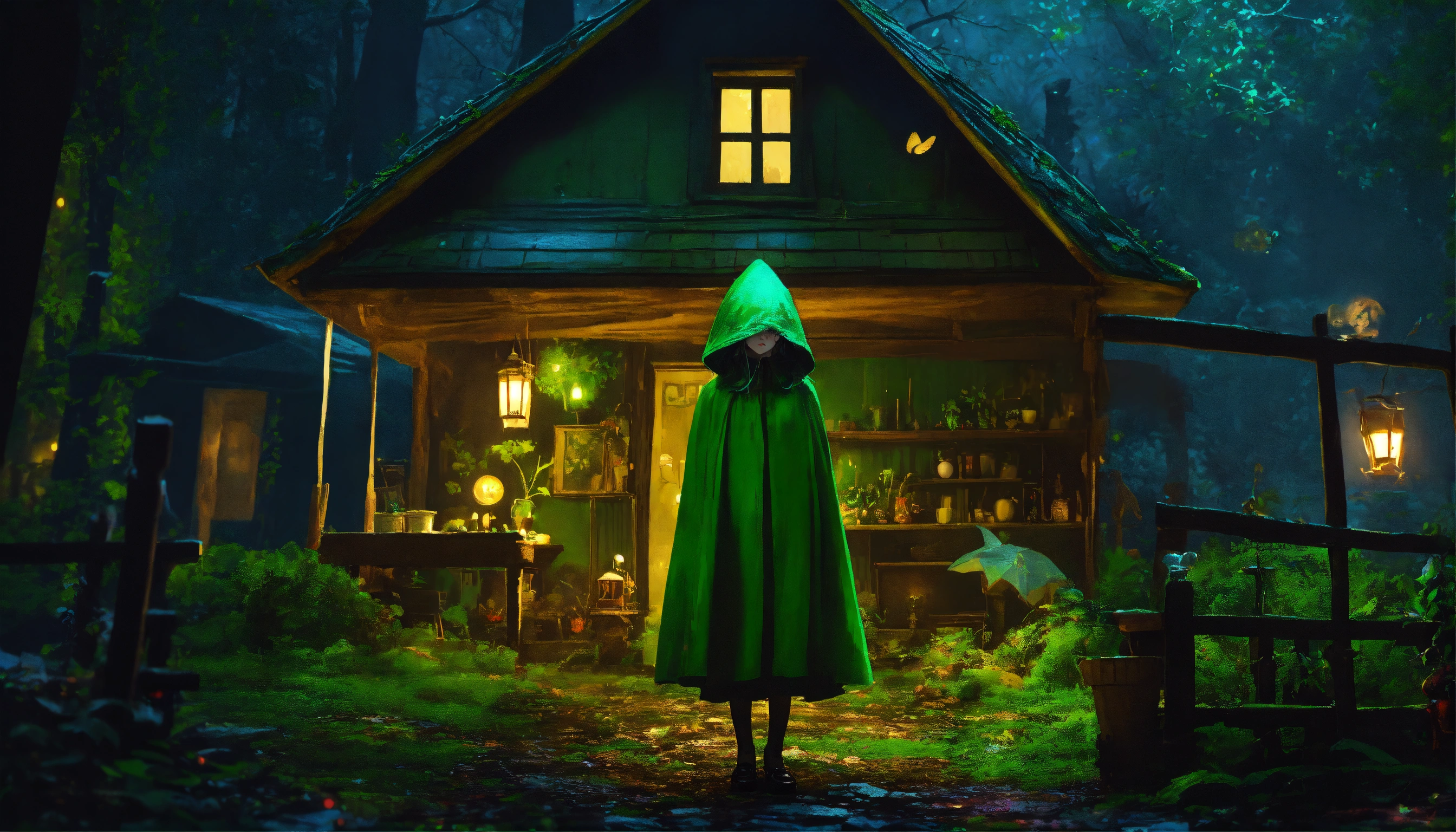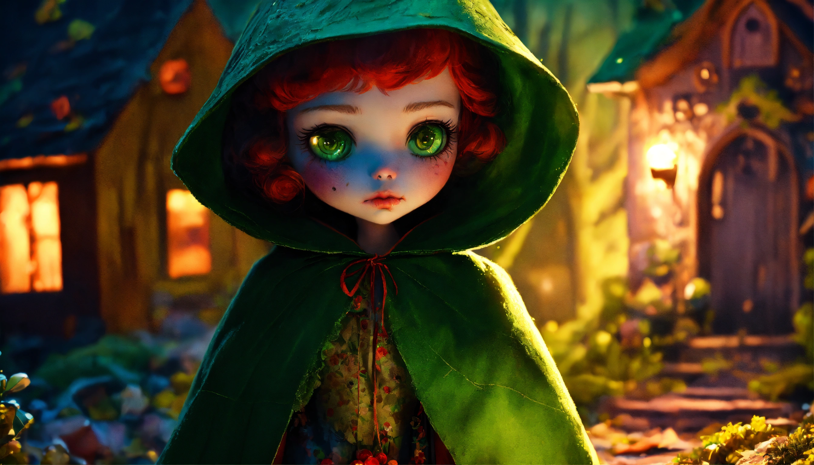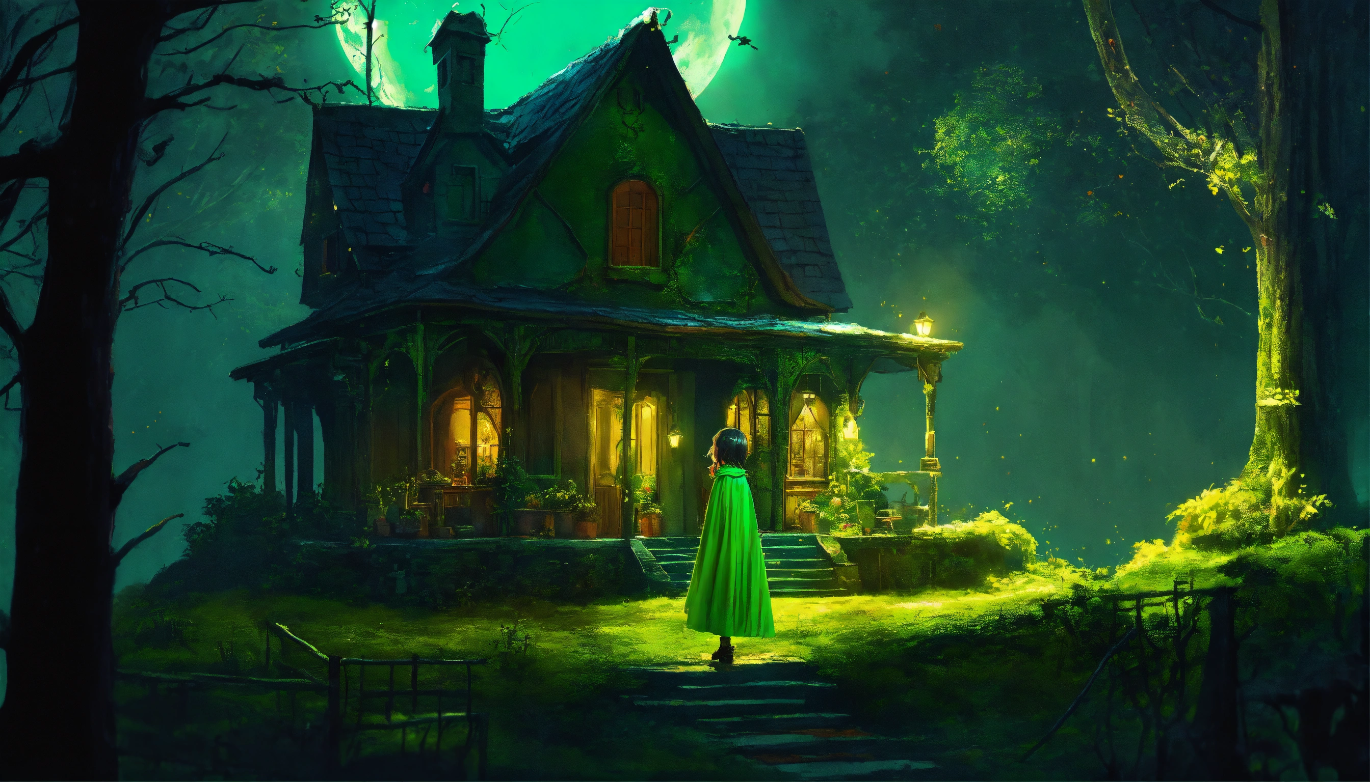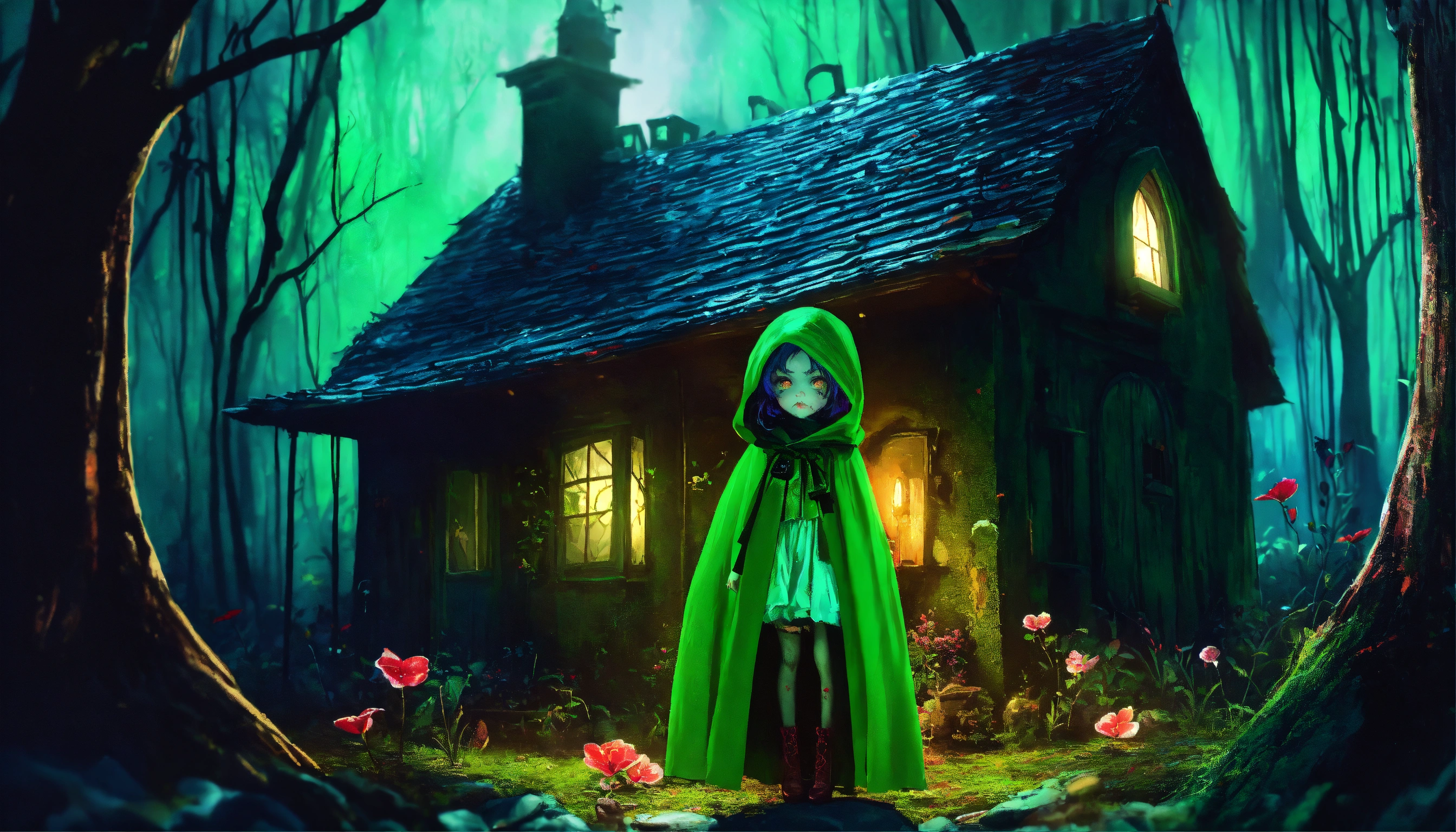 An adorable pouty zombie girl, green cape, in a cute whimsical zombie house at night in dark midnight forest, style by holly hobbie, richard burlet, tim burton and russ mills; fruity but spooky, dreamy but dense, 8k, ultra sharp, cinematic lighting
