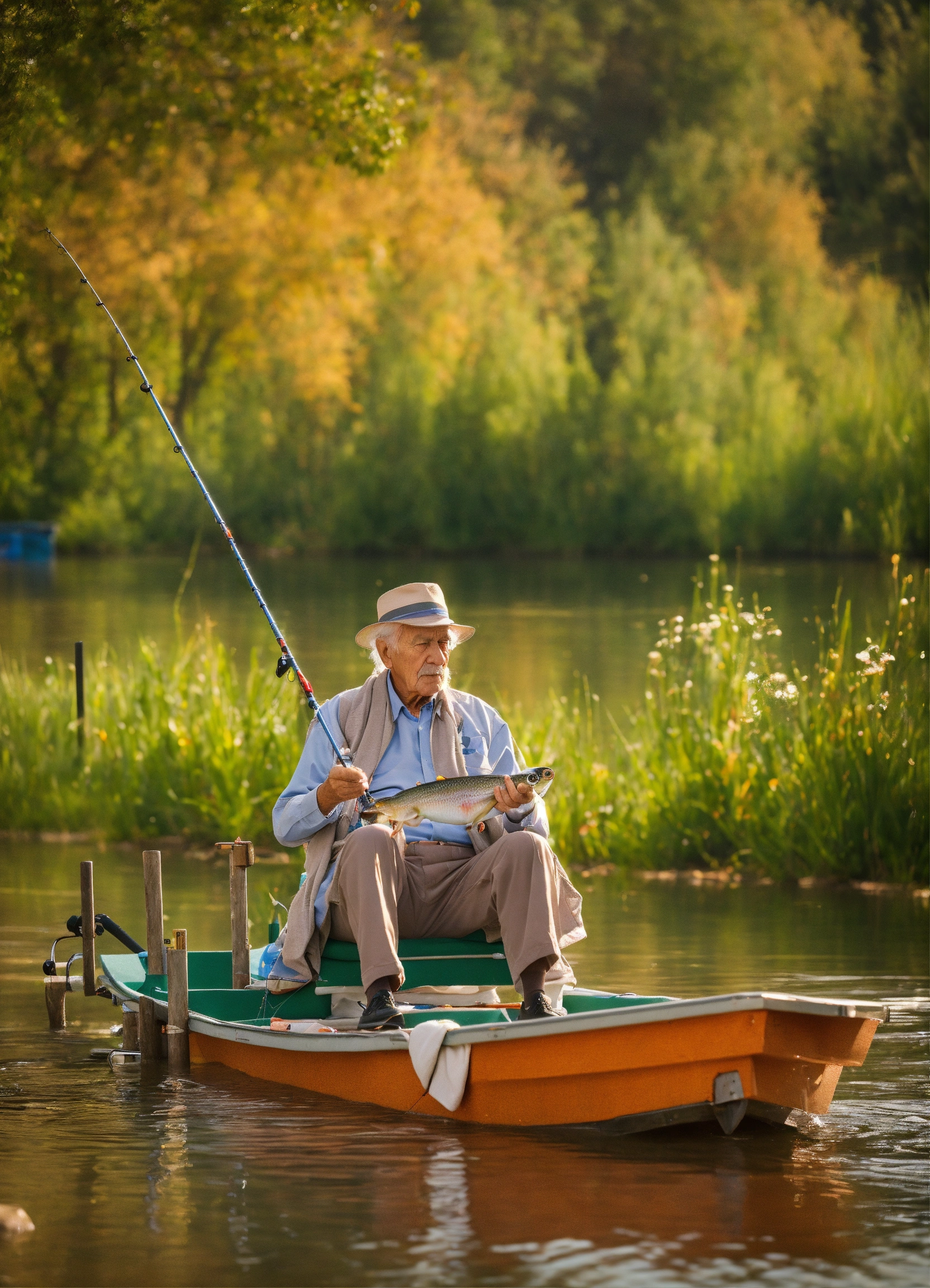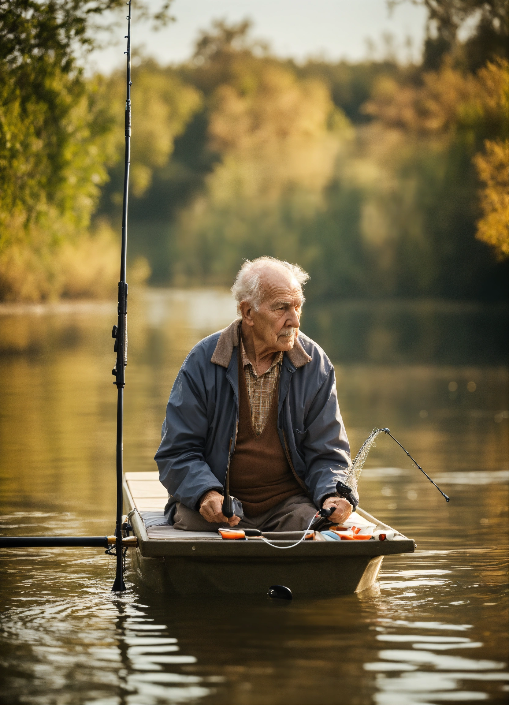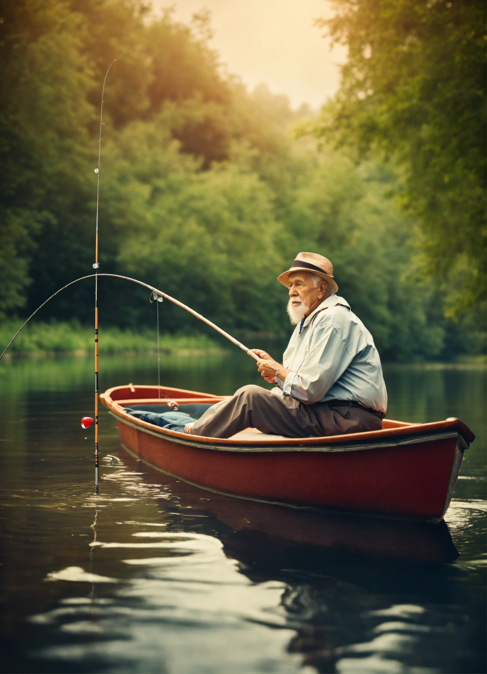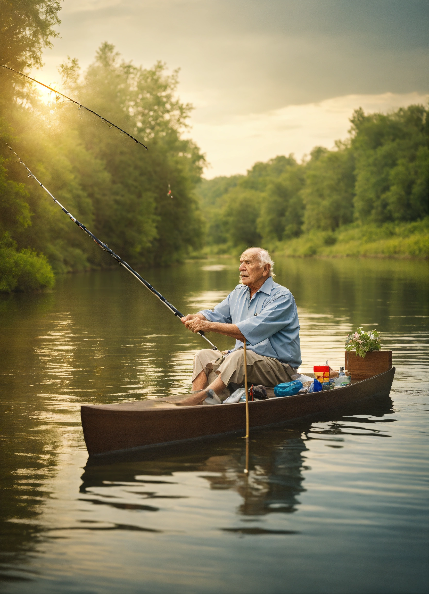 An elderly man under on the hospital bed with a fishing rod in his hand, floating on the serene river. humorous scene.