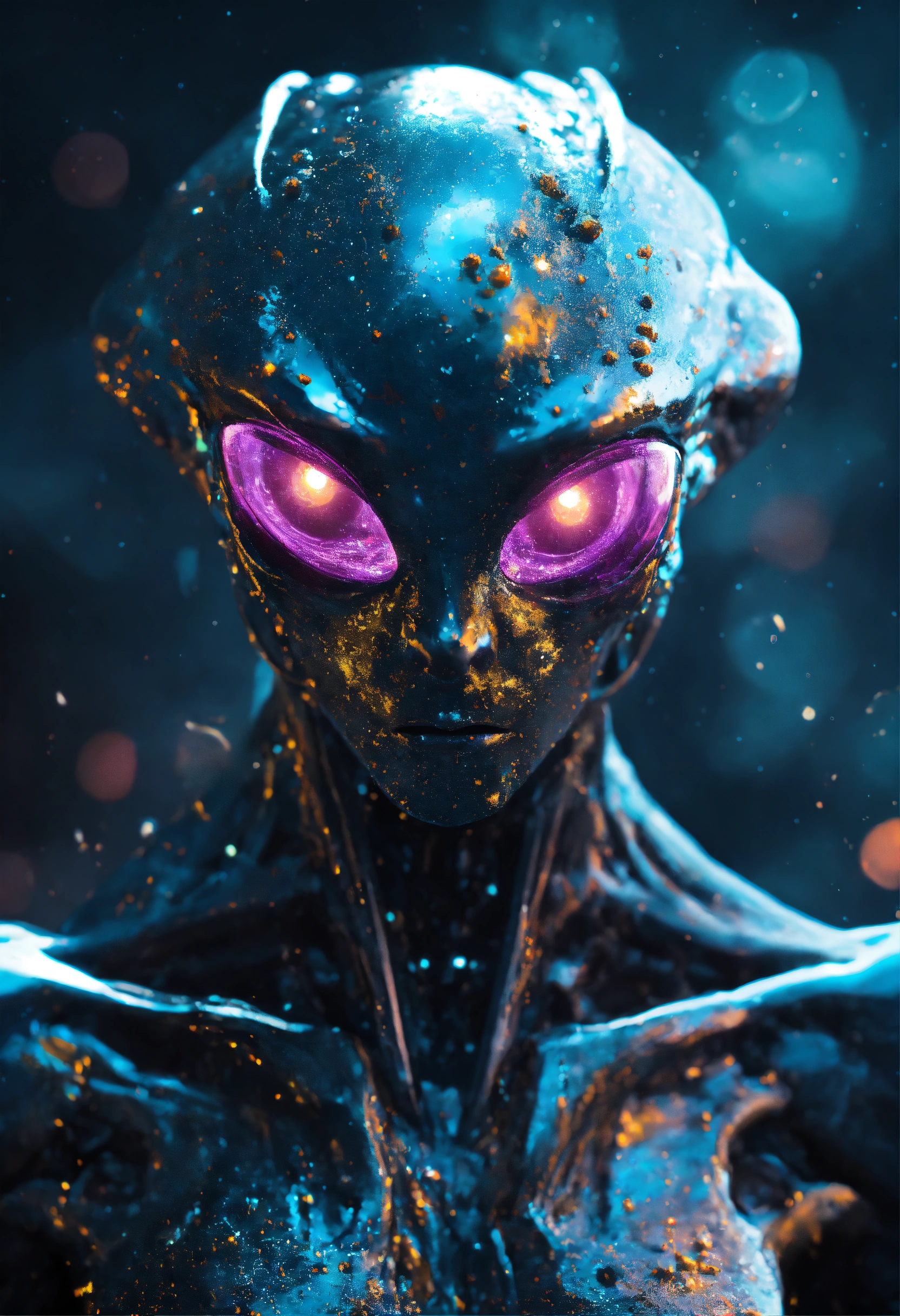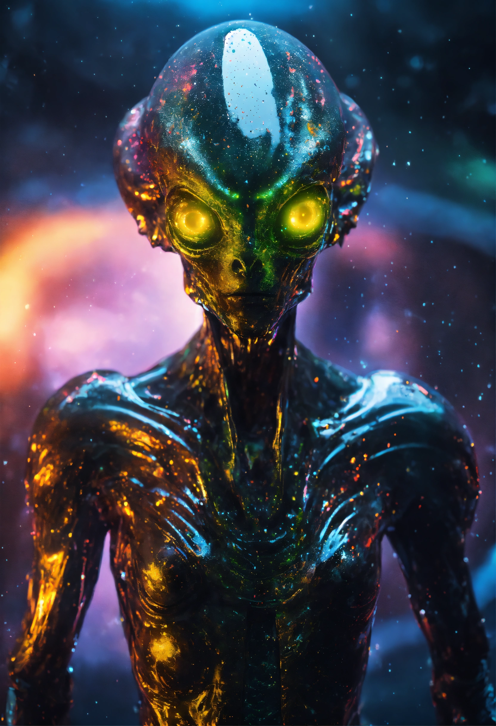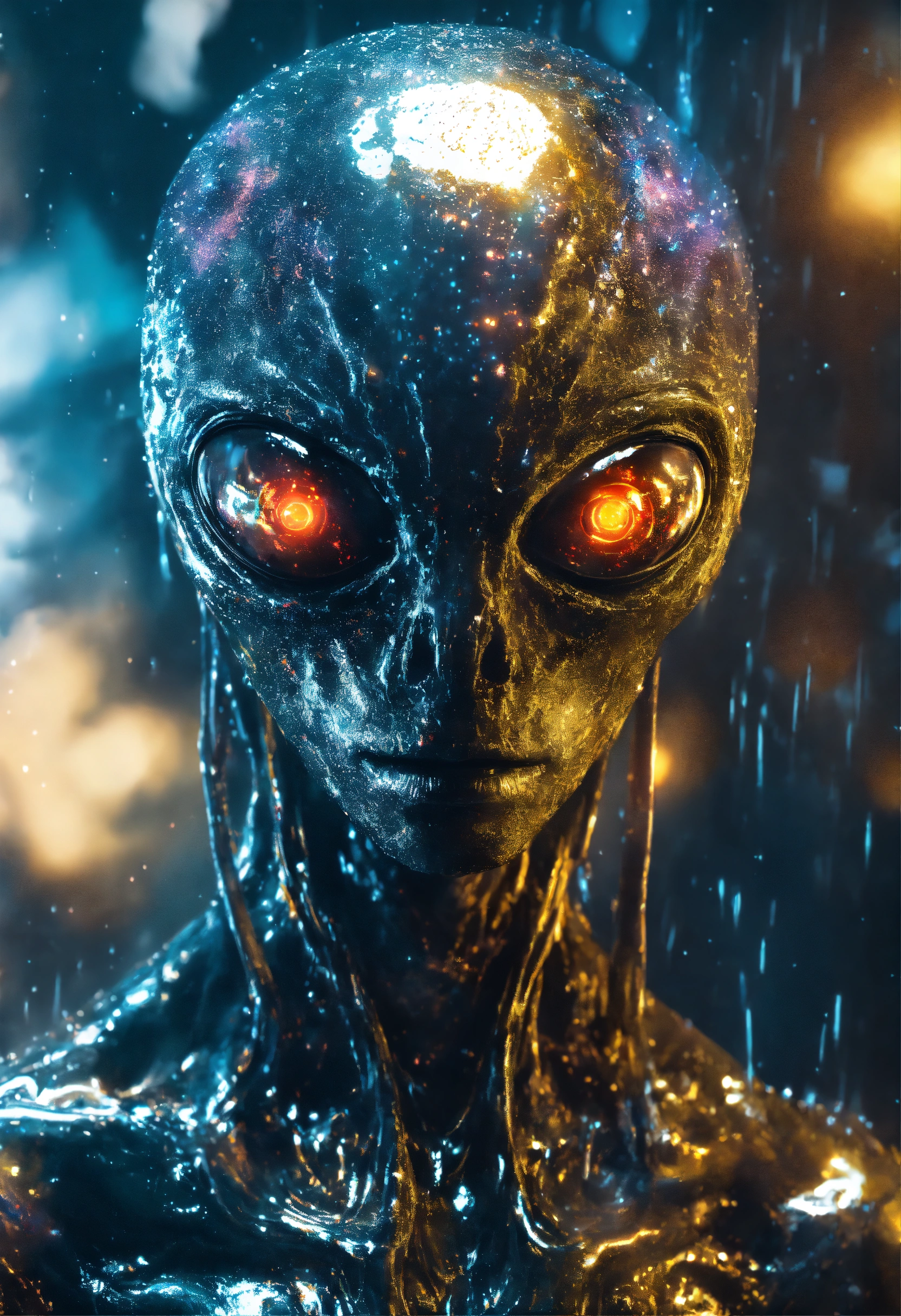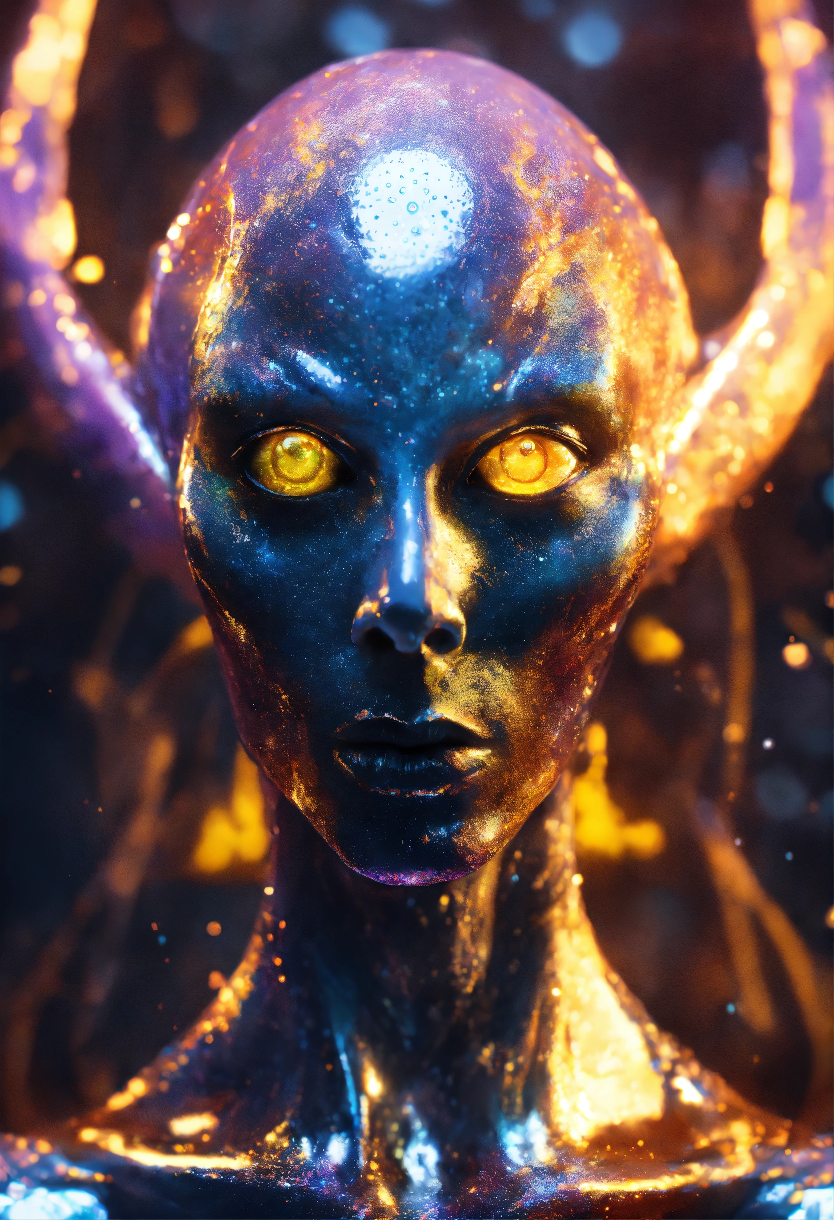 An sterotypical alien with glowing eyes in the style of translucent liquid metal filled with swirling galaxies, ray tracing, raw character, 32k uhd, schlieren photography, conceptual portraiture, wet - on - wet blending