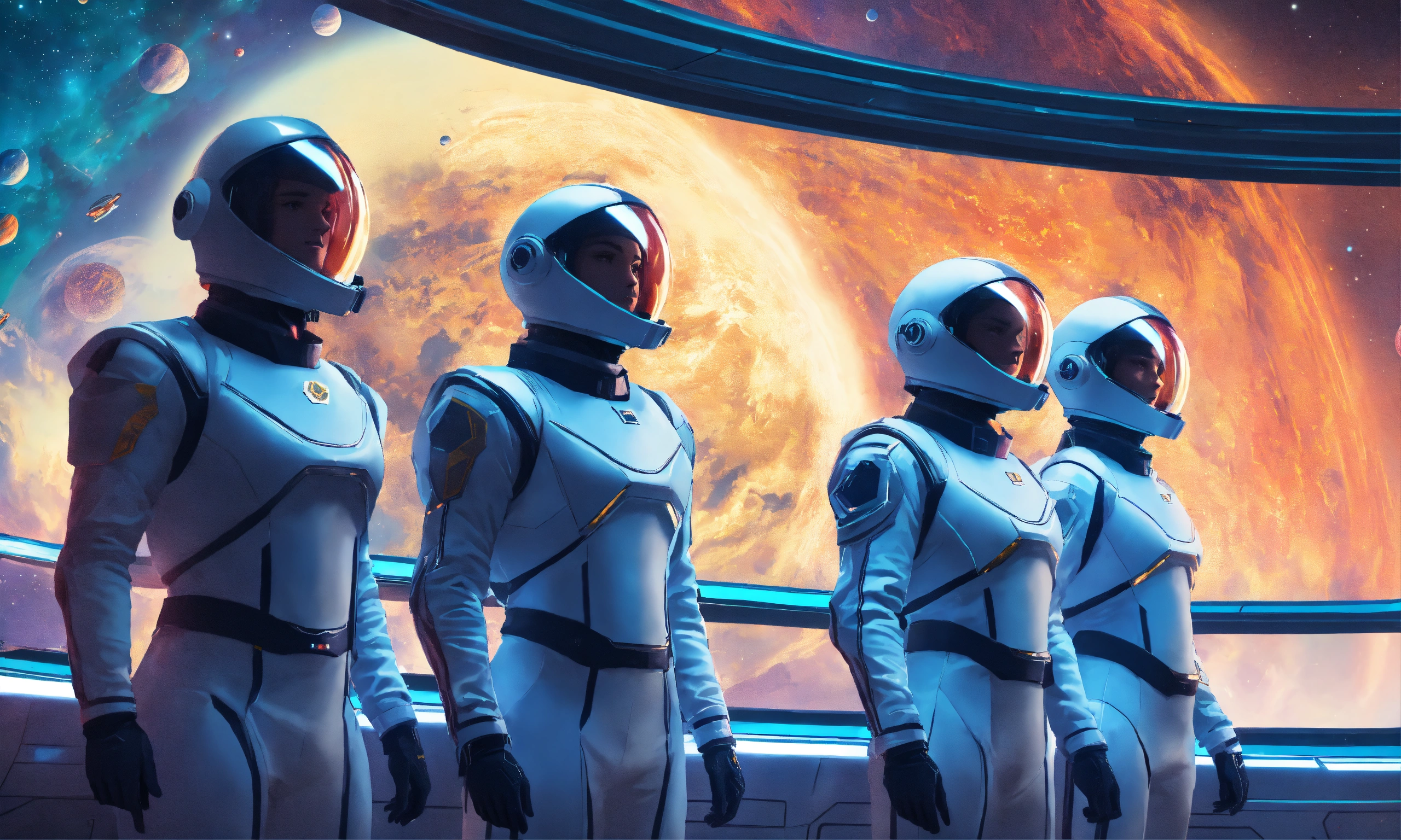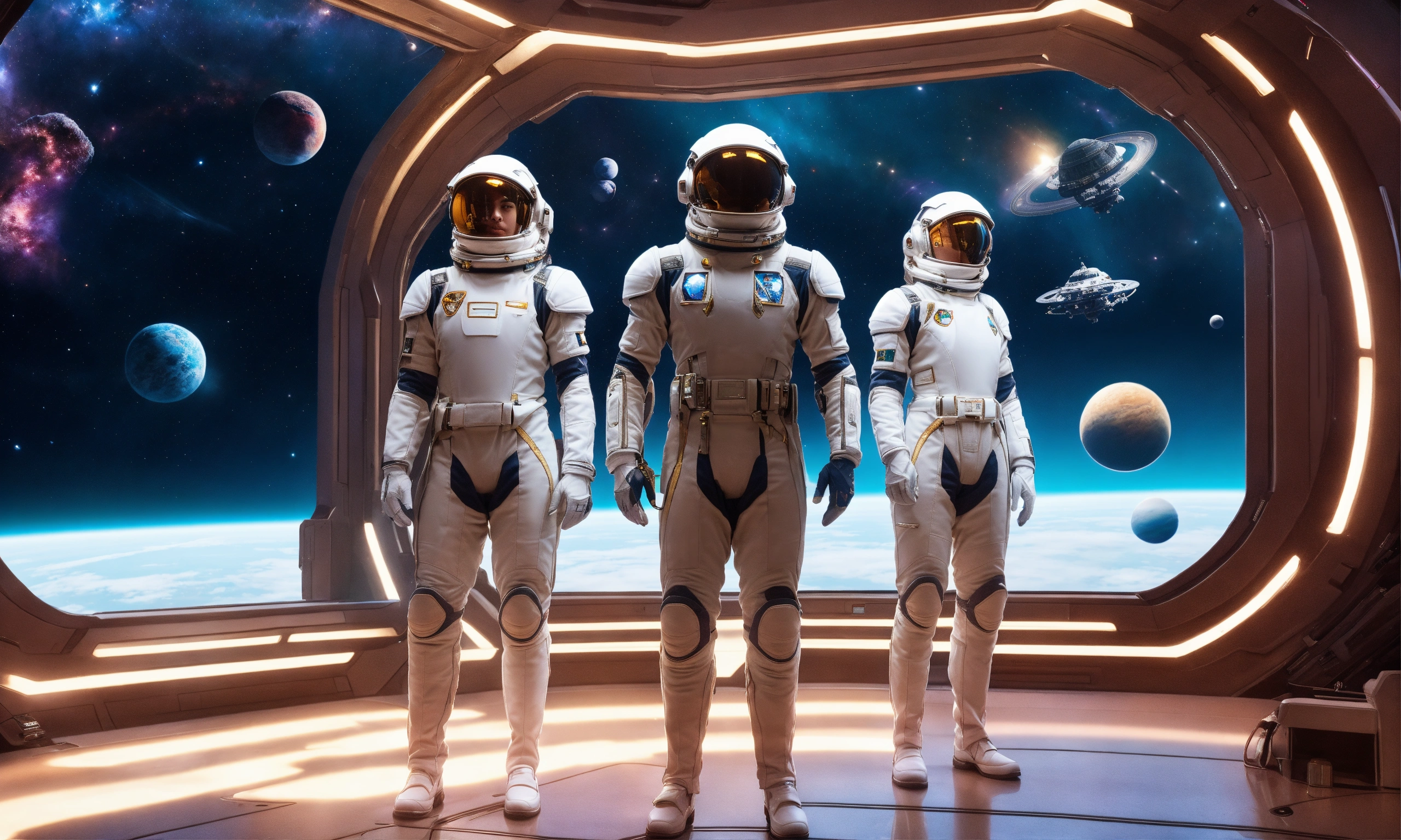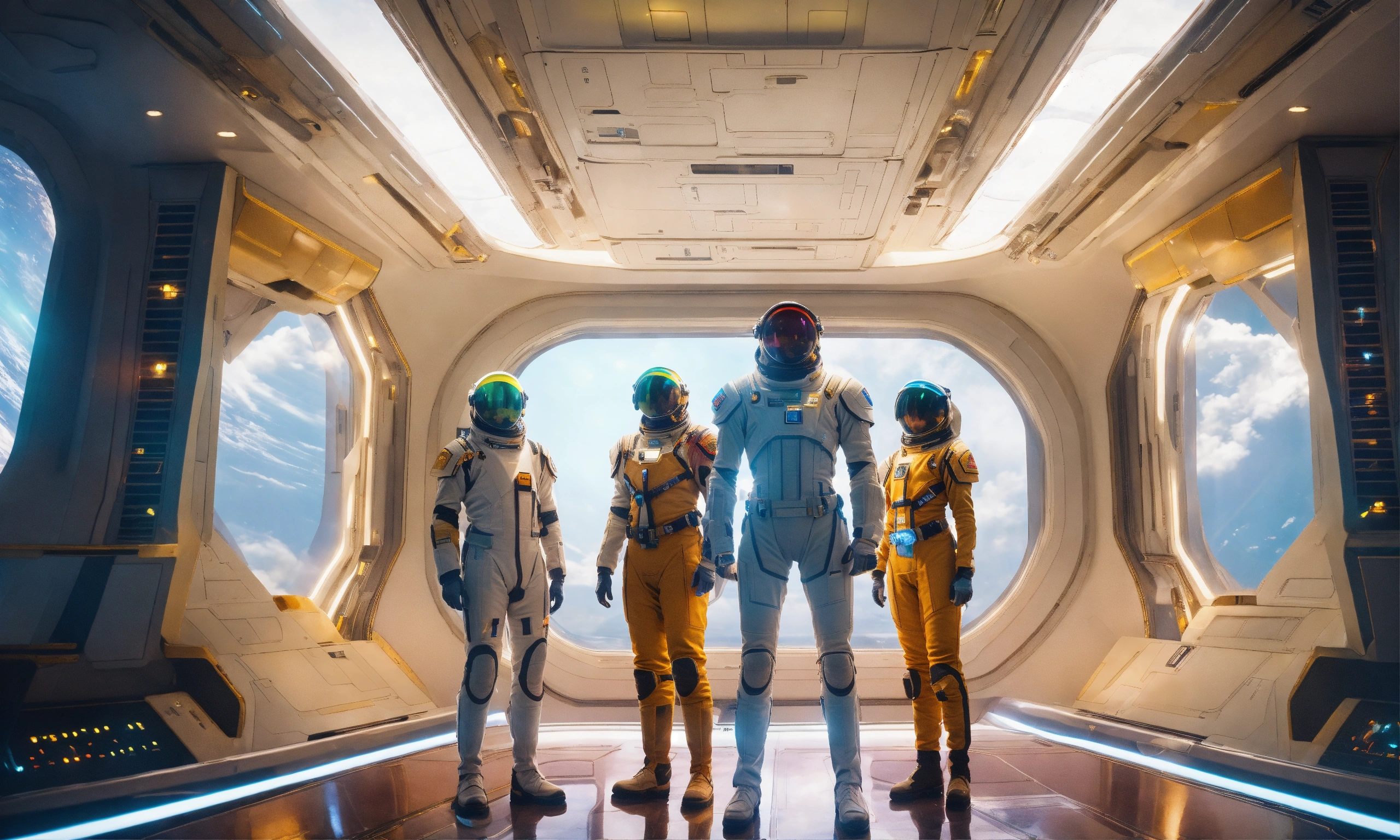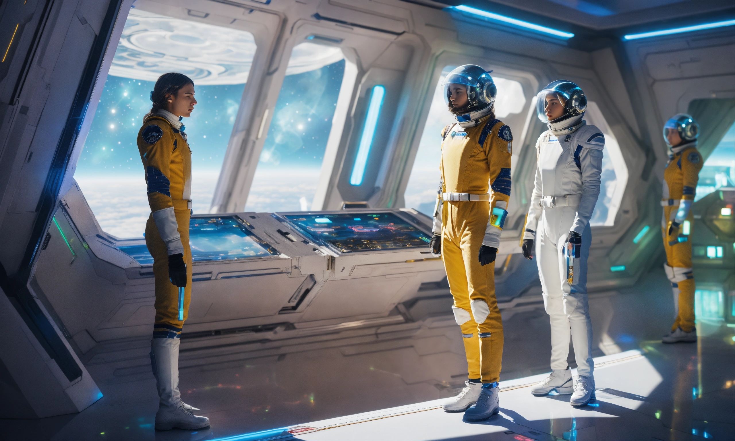 High futuristc white nobles in splendid uniforms of different colours standing on a spaceship in front of a window into space