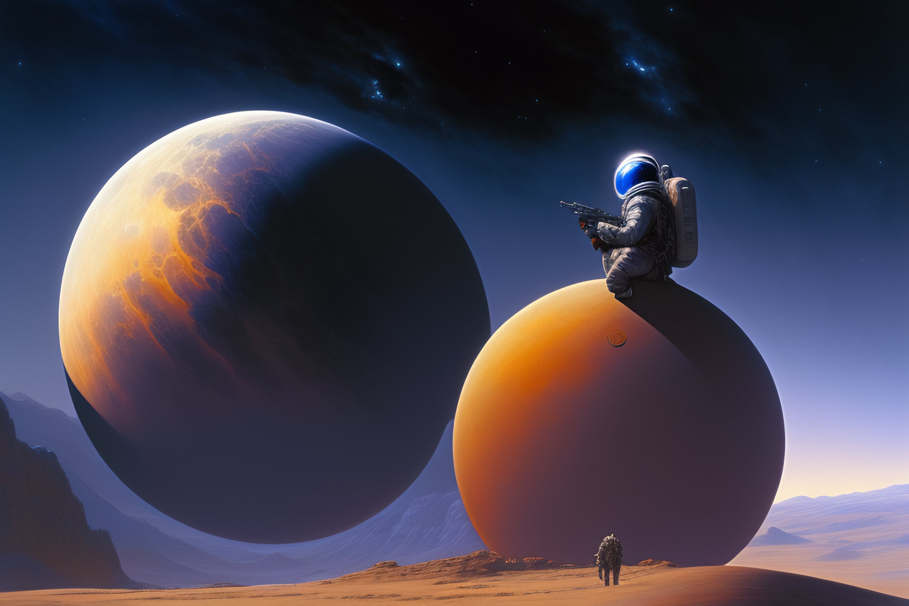 A highly detailed matte painting, space man, space suit, imax render, 8k resolution, trending on artstation, style of alan lee and john howe
