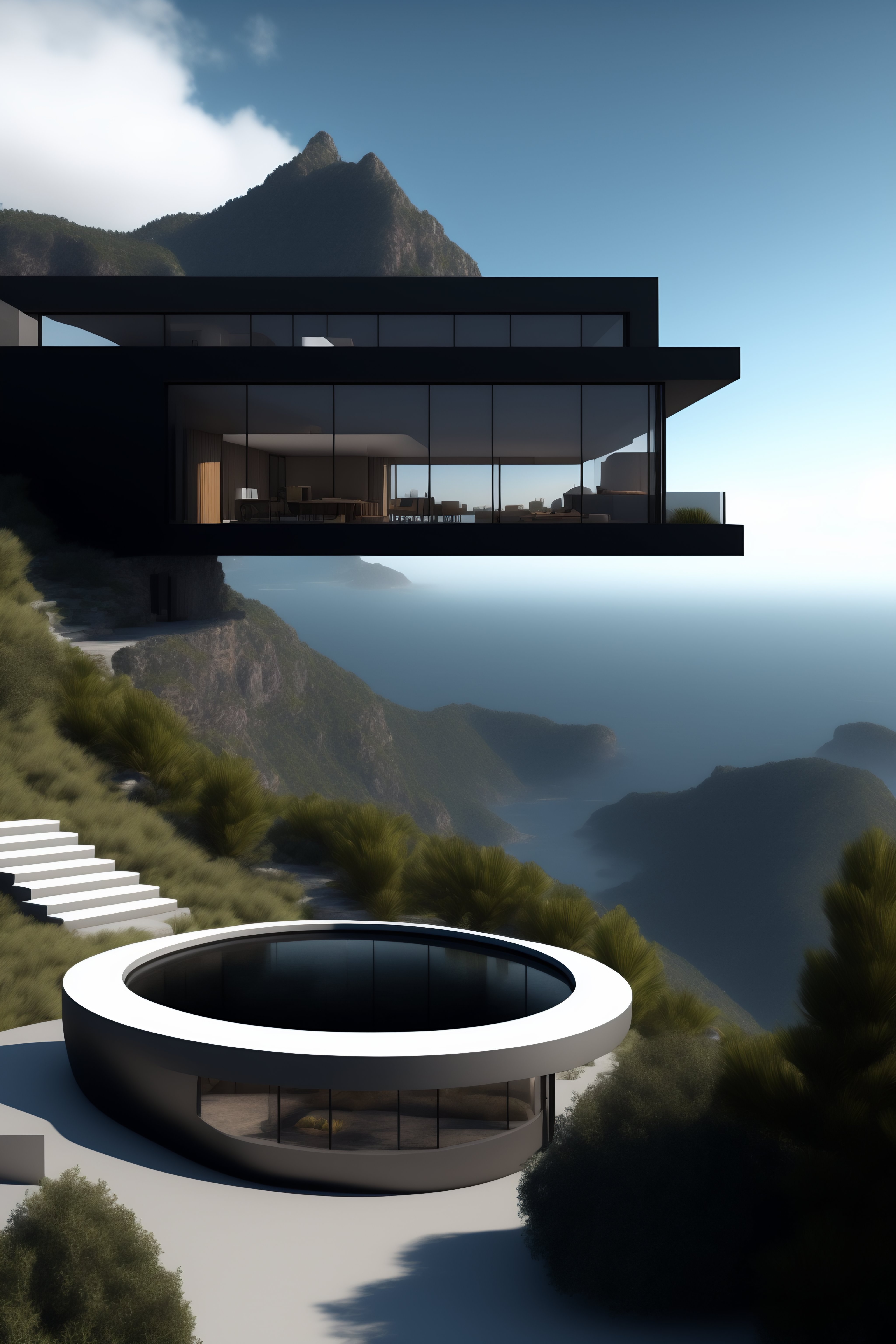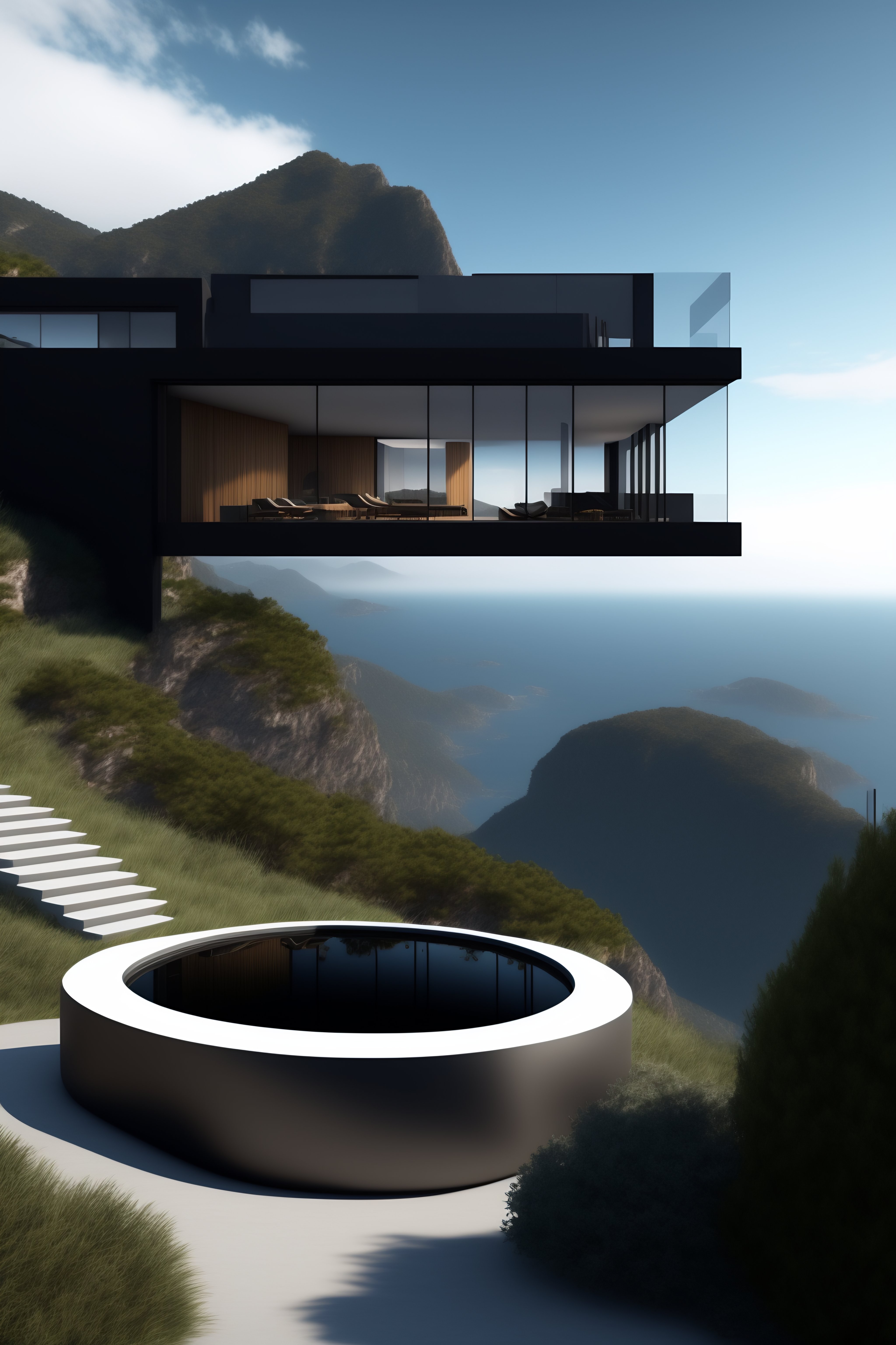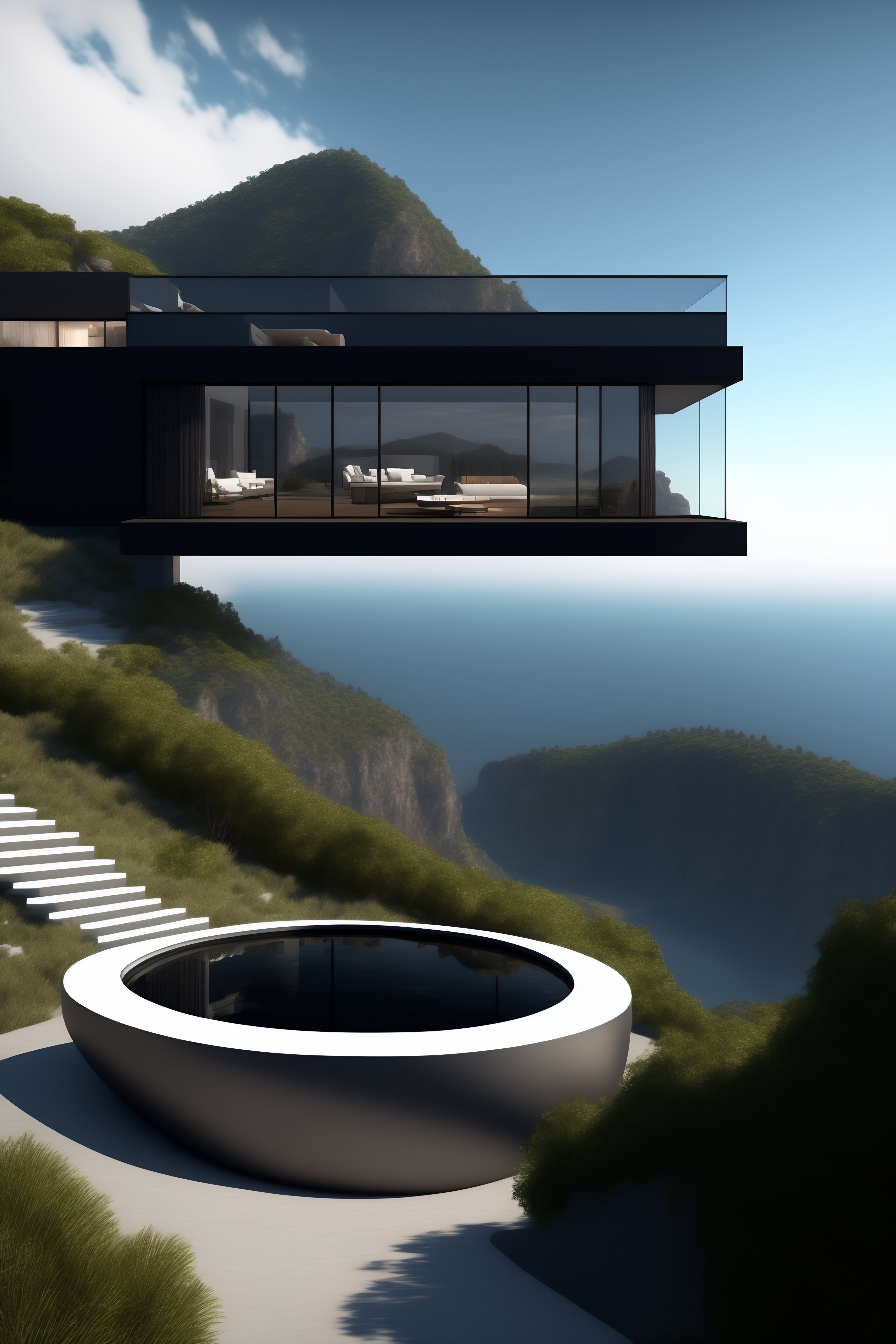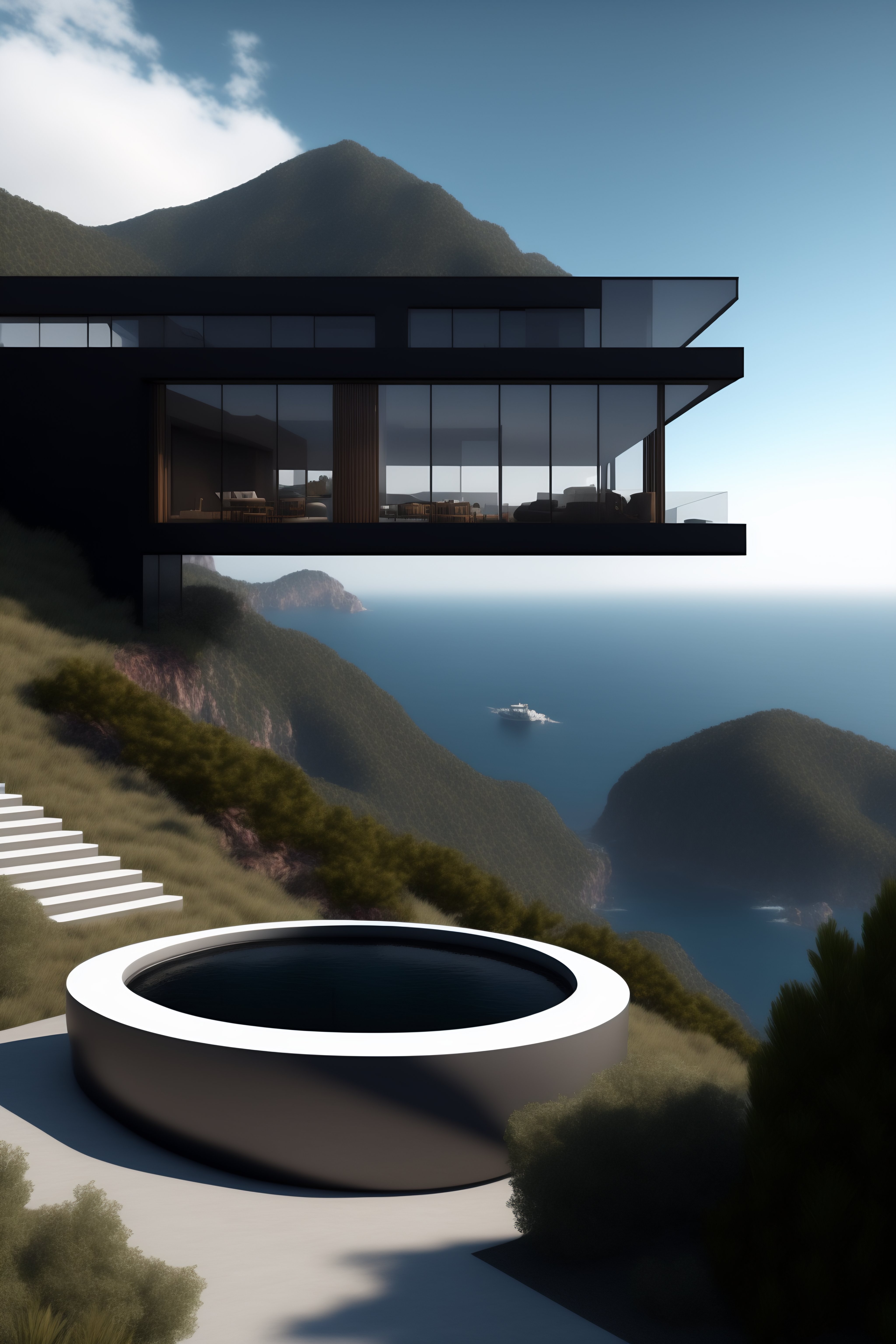 A black modern mansion in mountain alone, award winning, 8k, ultra realistic, view on the ocean, jacuzzi