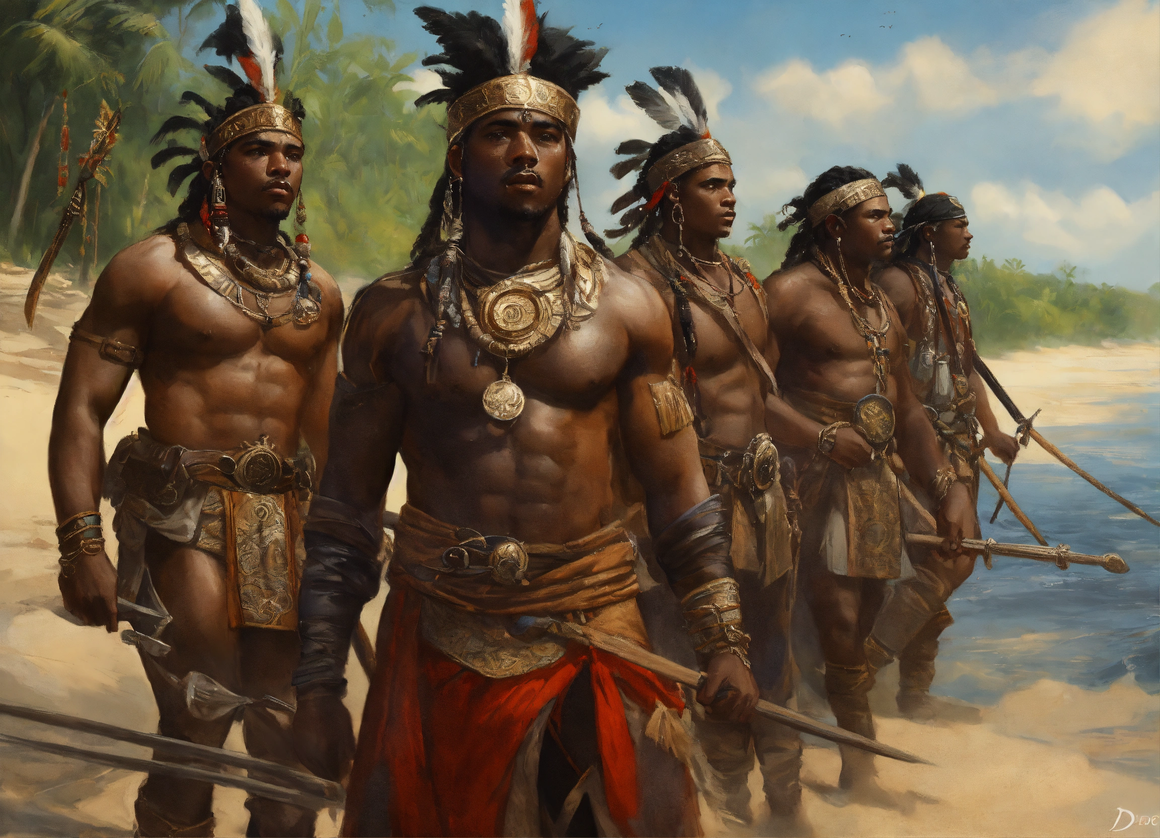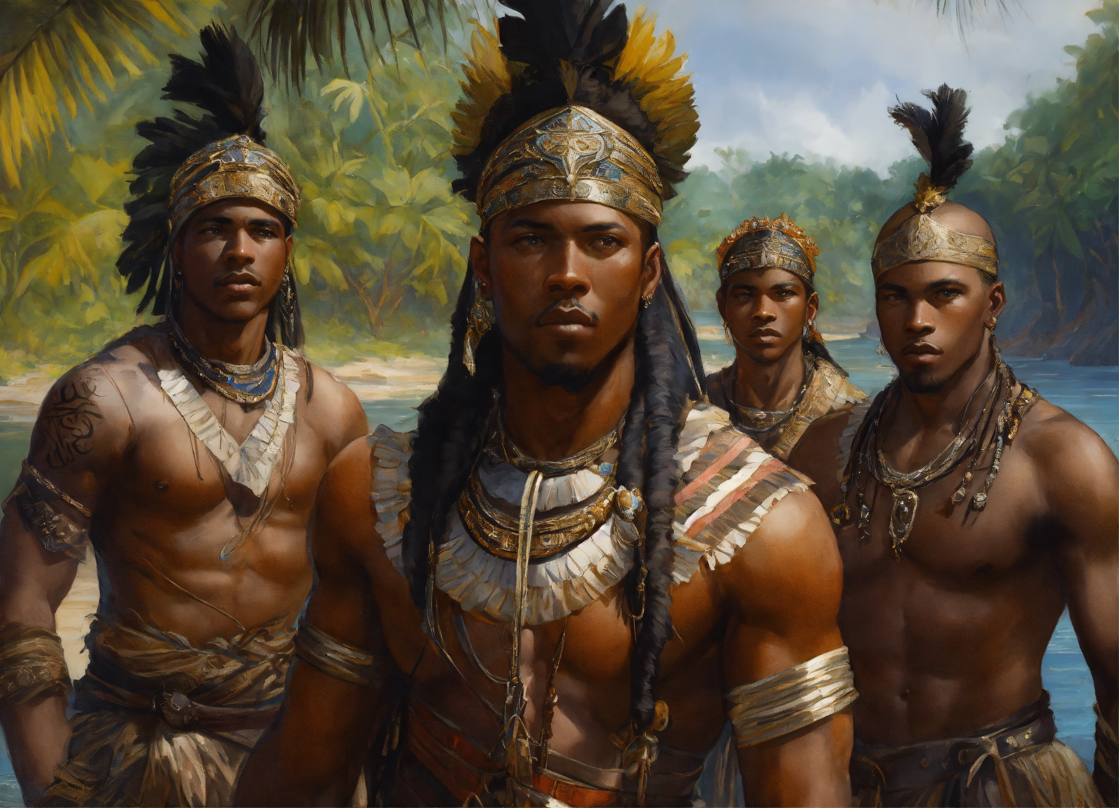 Close up, black male tribal warriors standing up at the river margin, epic, dramatic, intrincate, bahamas, 16th century, colonial, highly detailed, art by donato giancola and james gurney, digital art, trending on artstation, pinterest.
