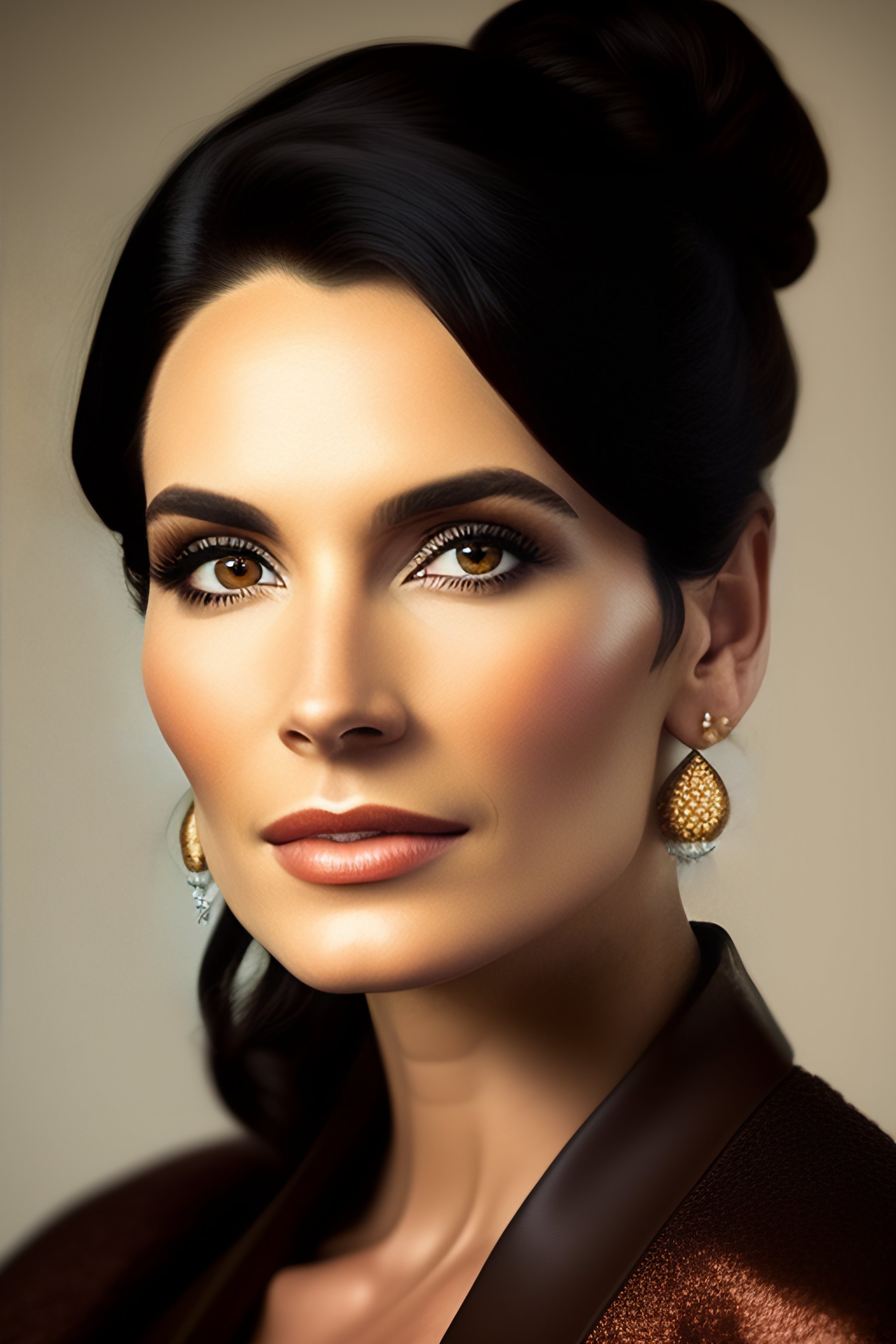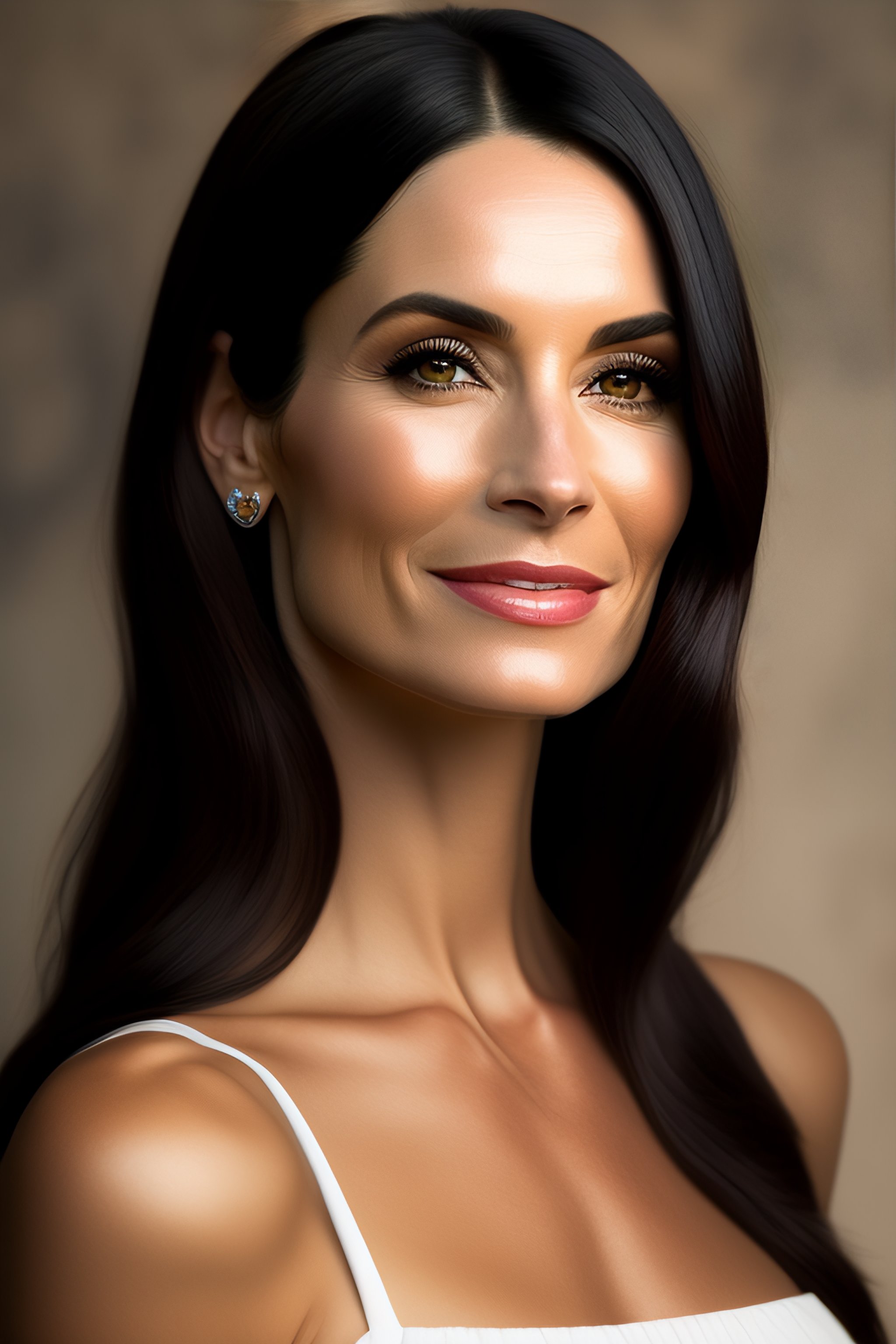 Beautiful woman, brown eyes, white pale skin, straight dark hair, almond eyes, round face, 43 years old, some wrinkles