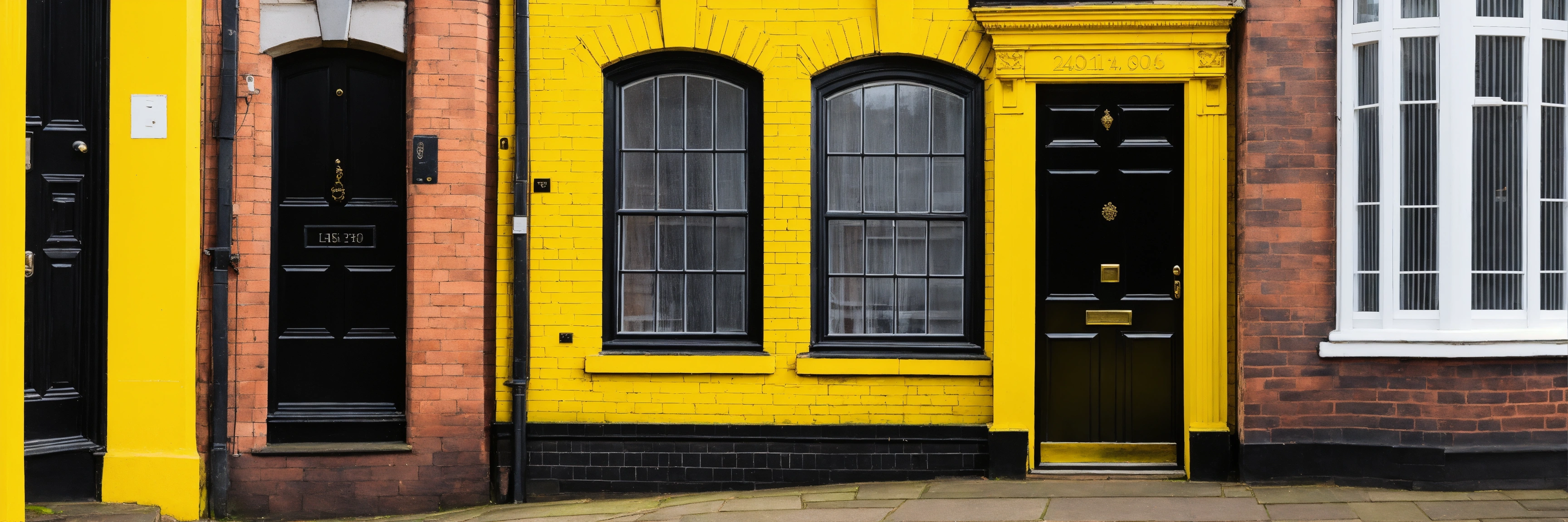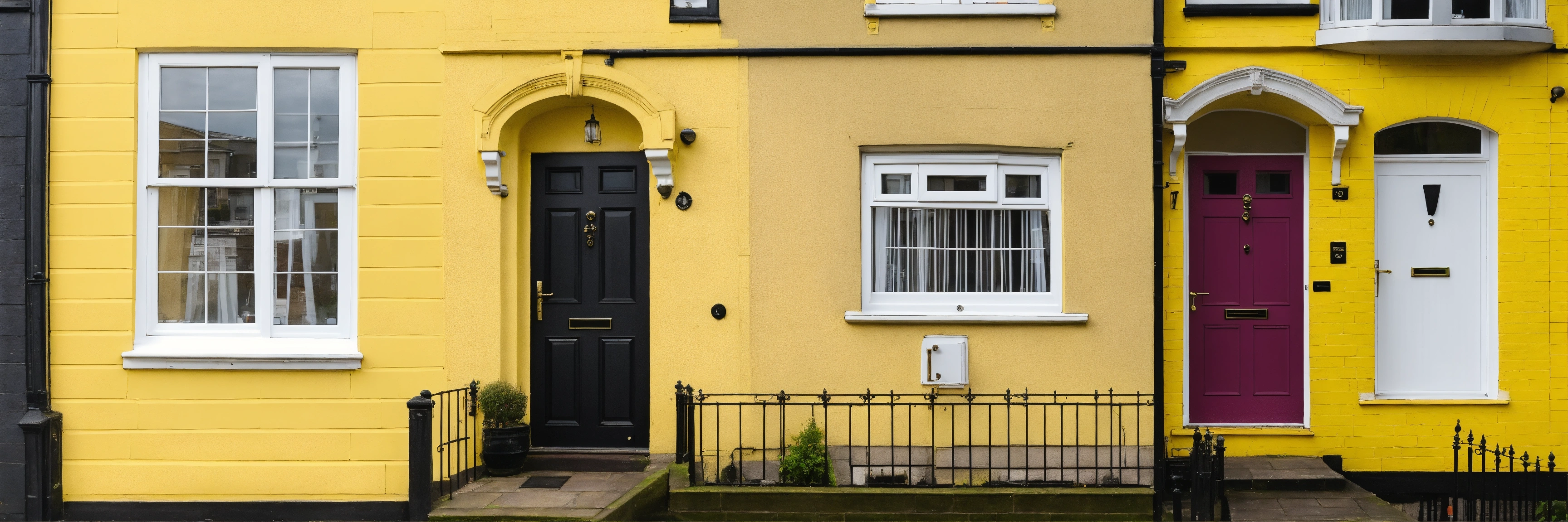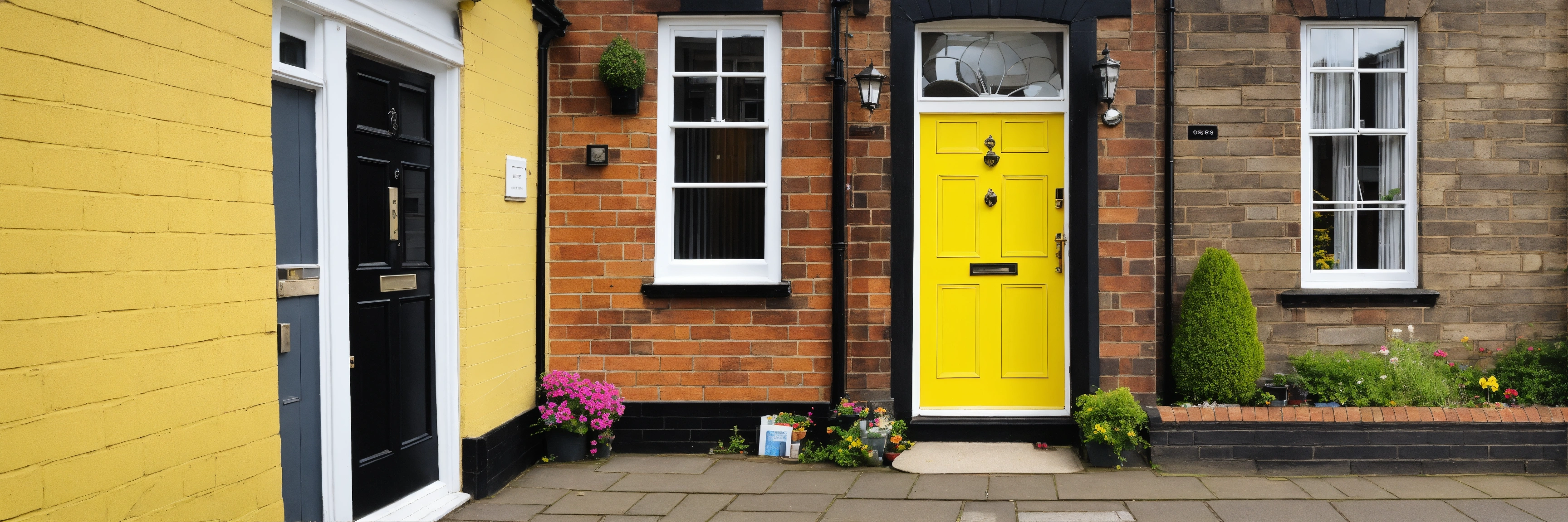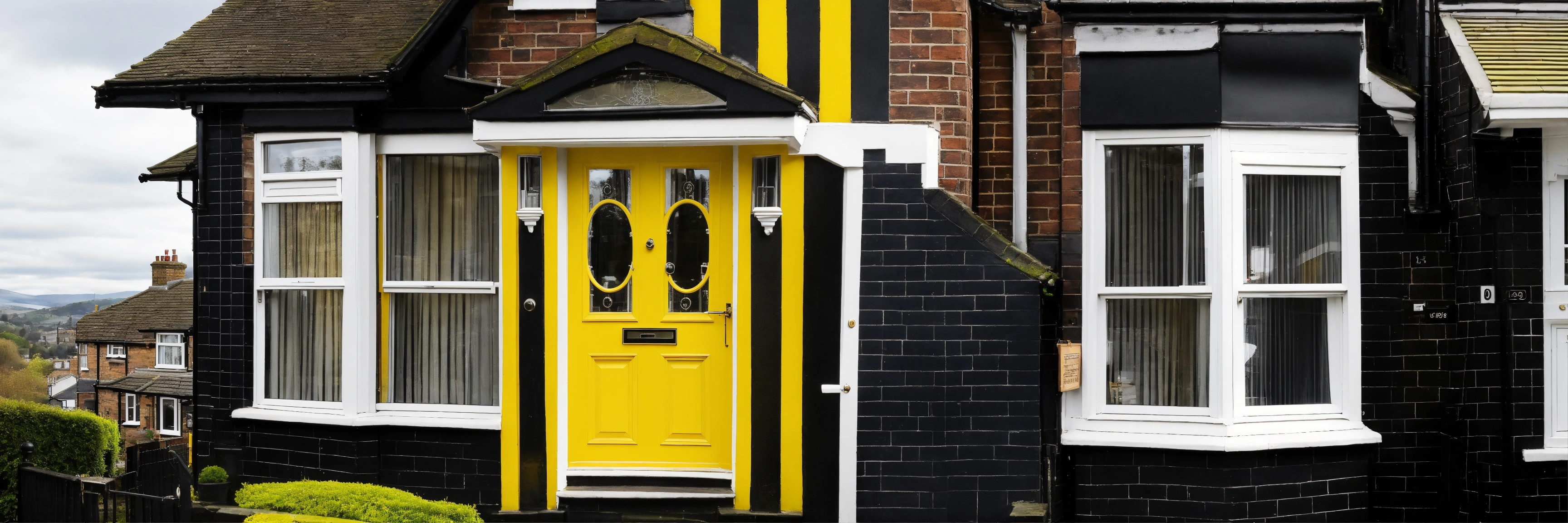 Door with yellow color, show the facade of a typical middle class house in macclesfield uk, black and white color house in manchester.
