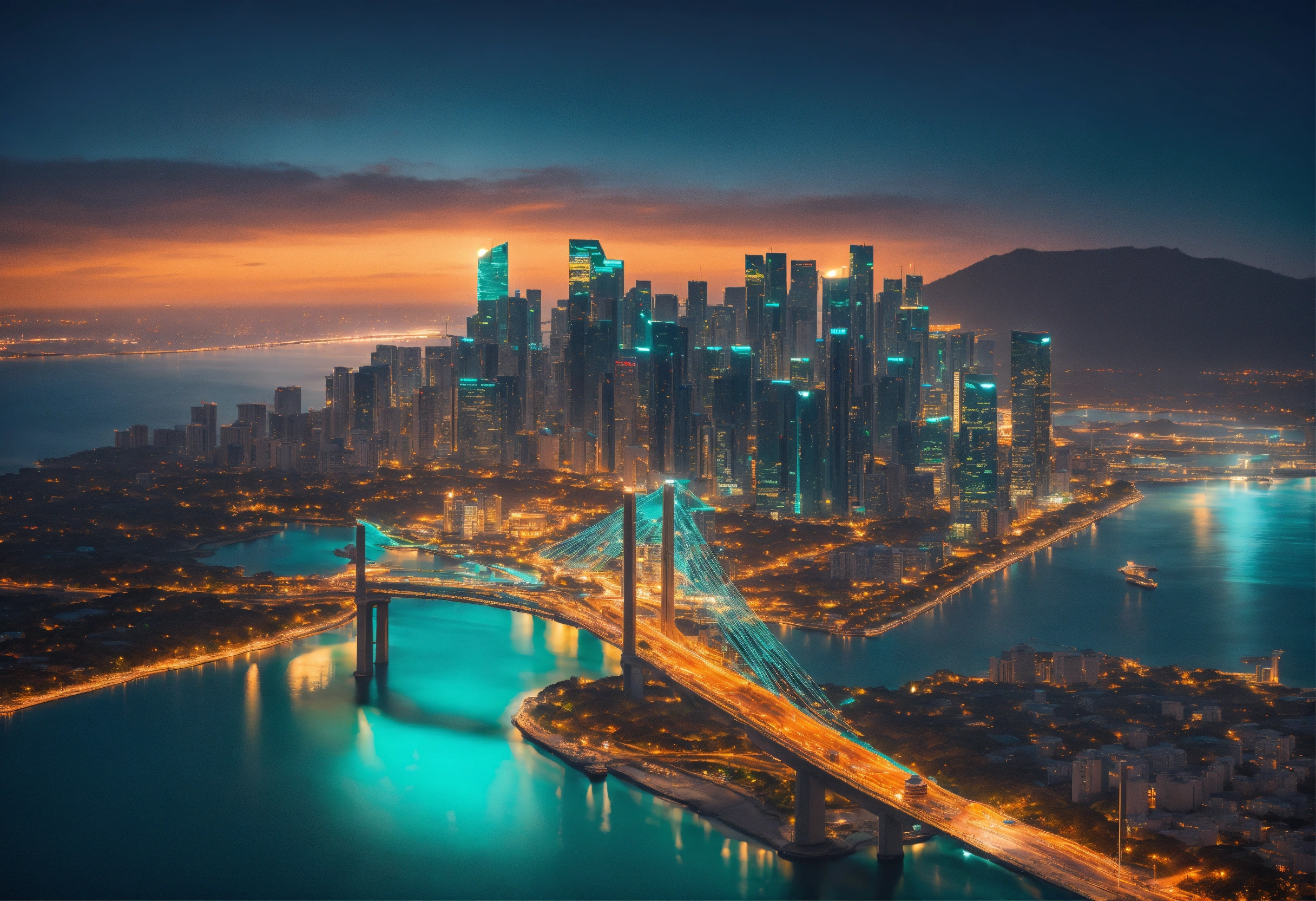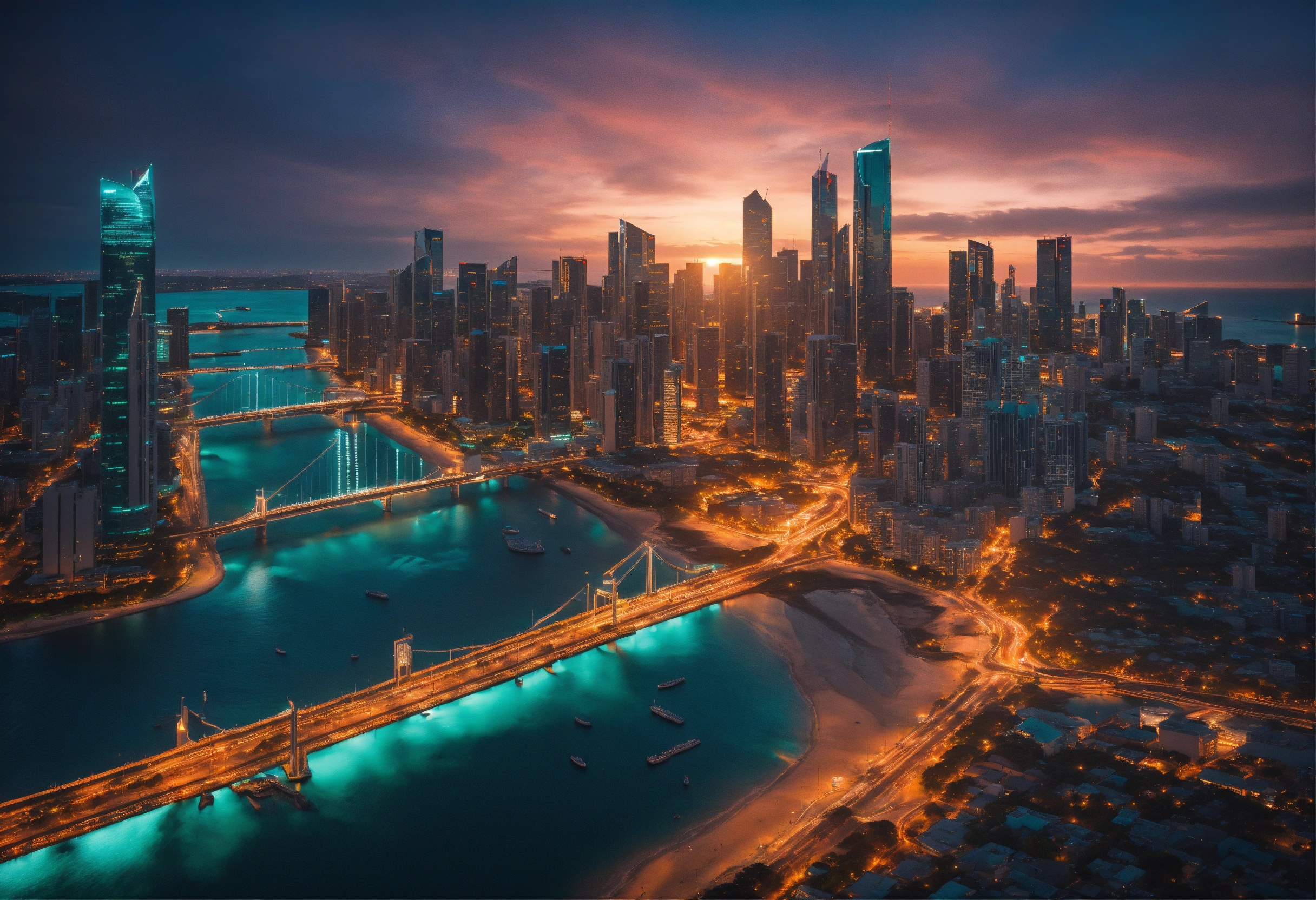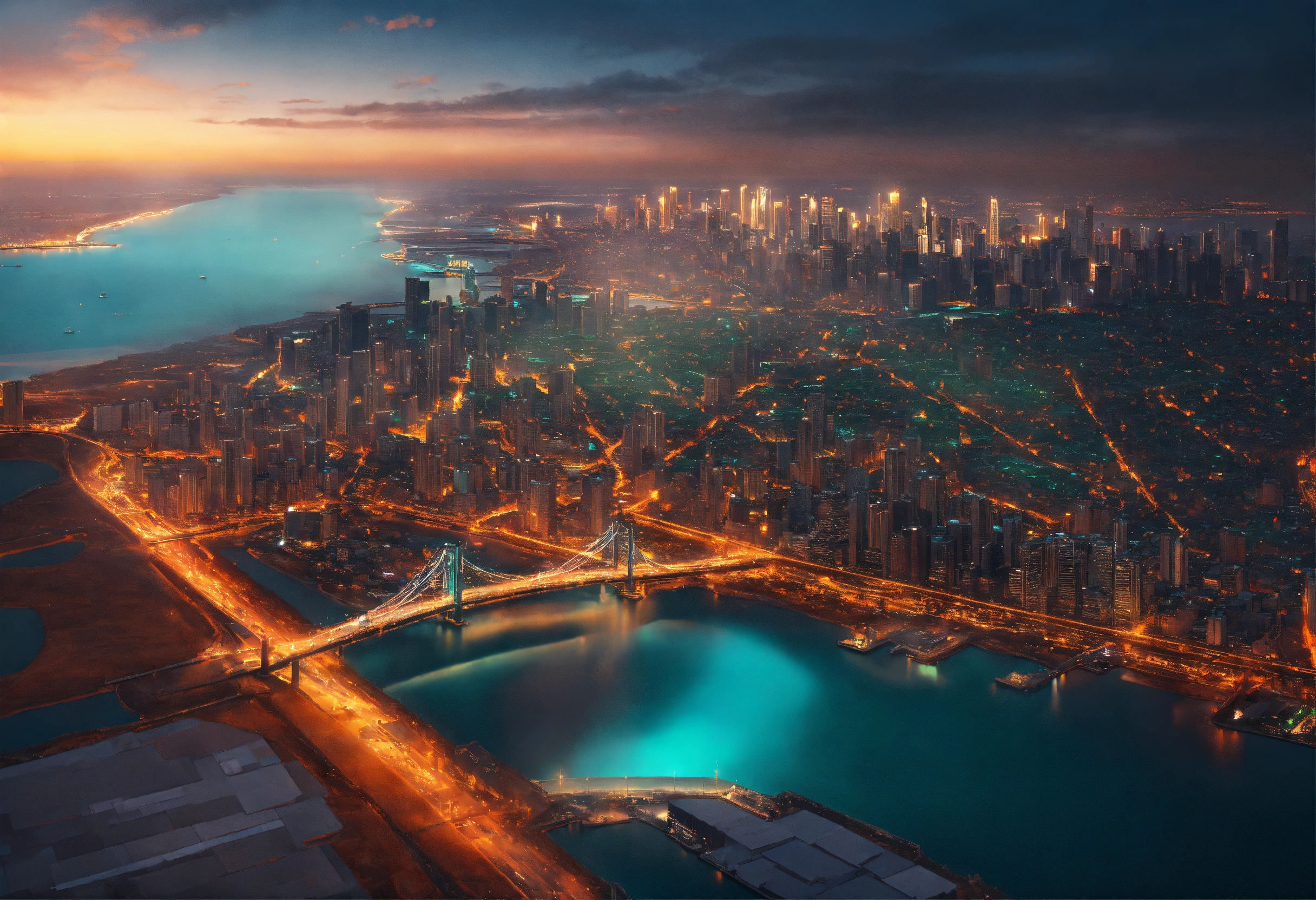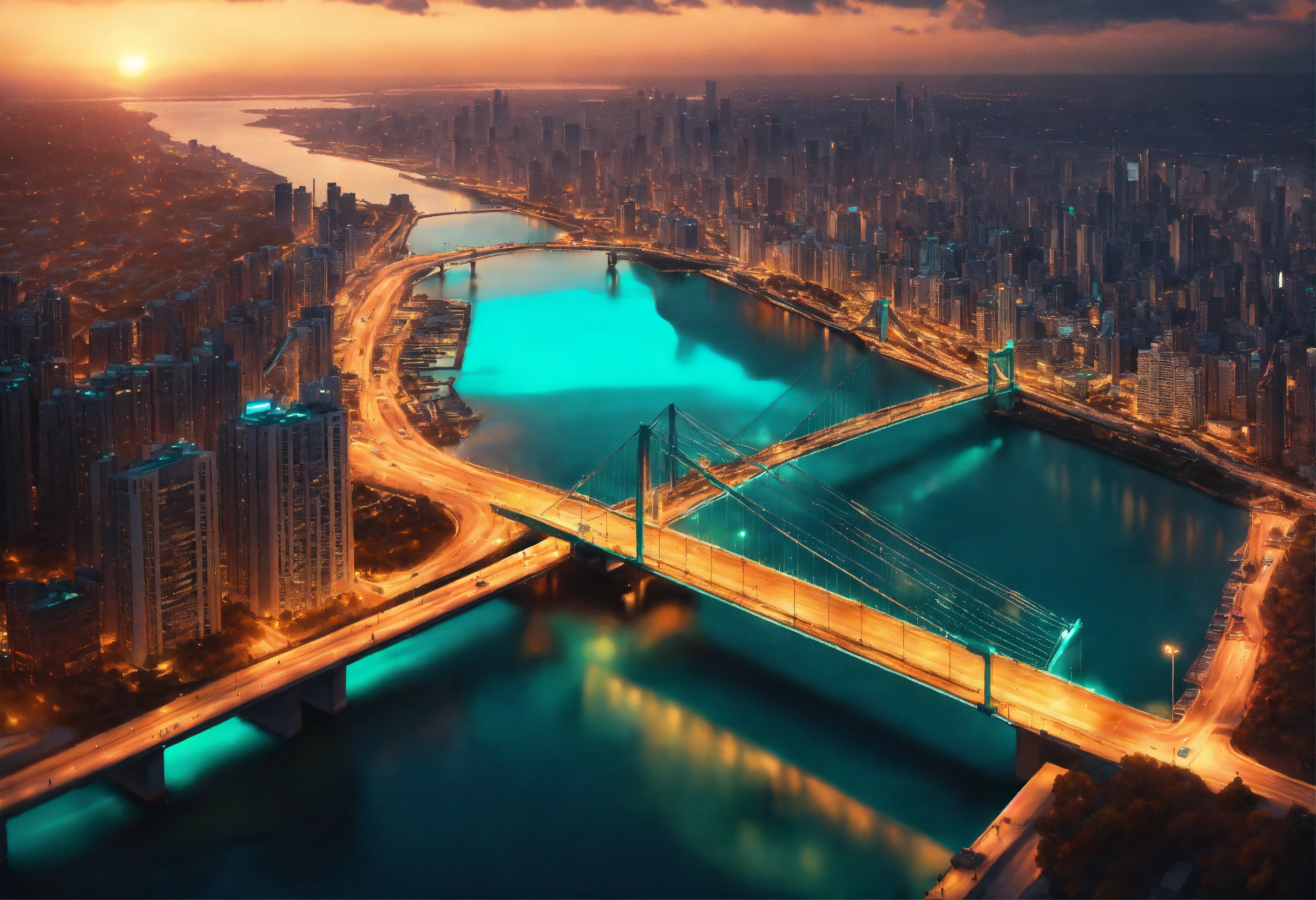 Ultra realistic aerial view of a sunset lit teal colored megapolis downtown on ocean with bridge, streets lit with orange street light, the shot is peaceful and graceful