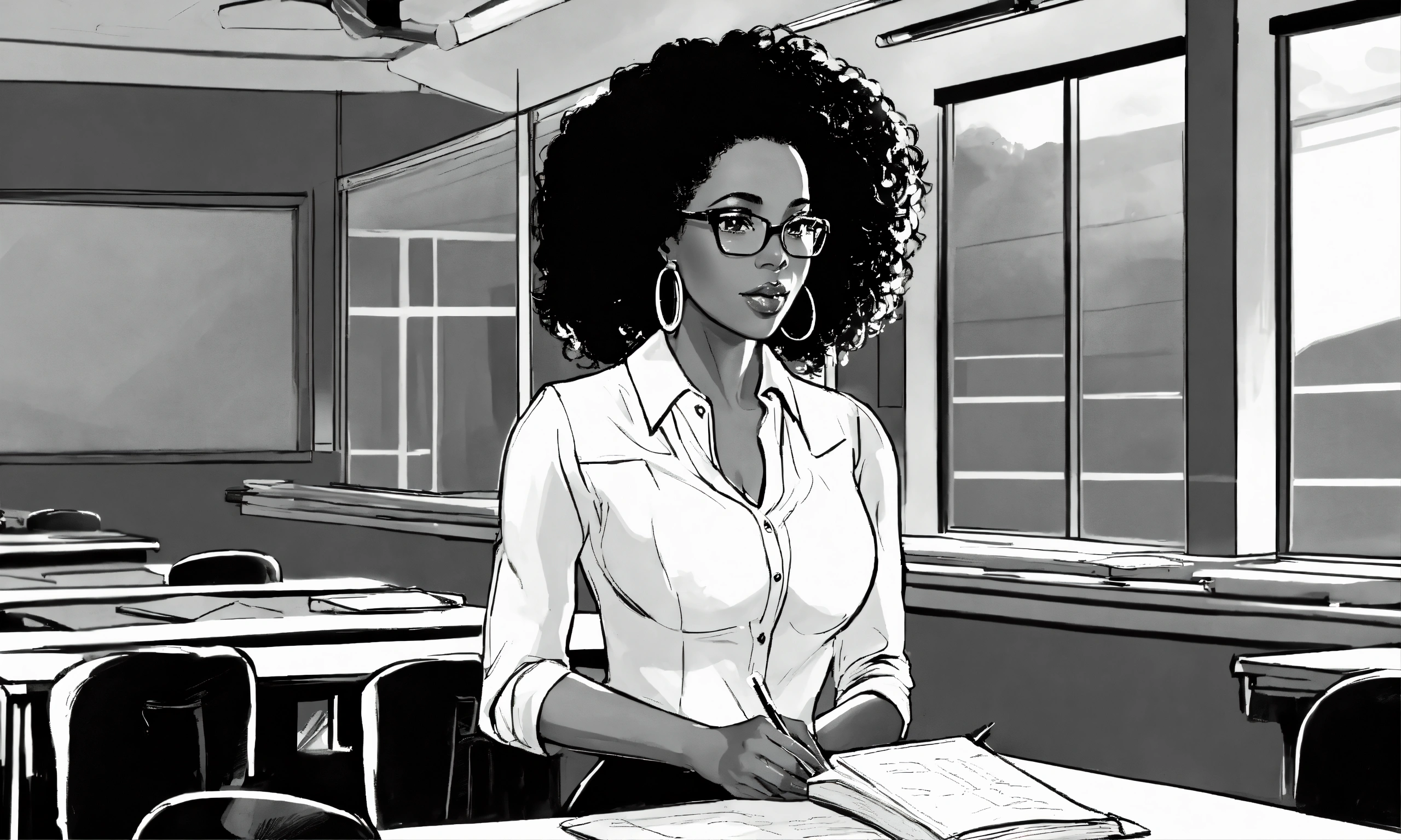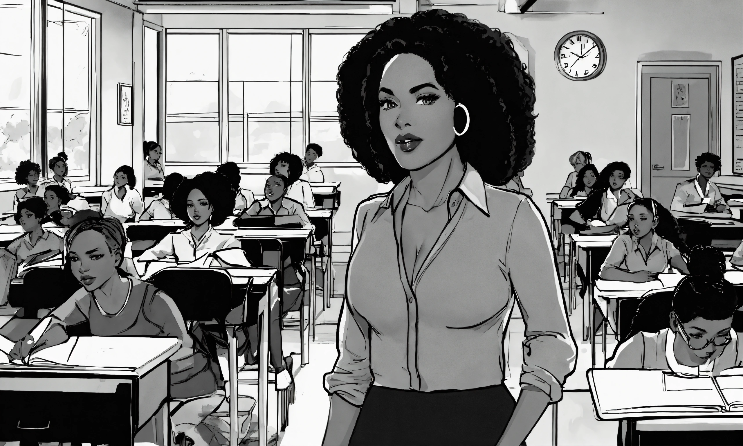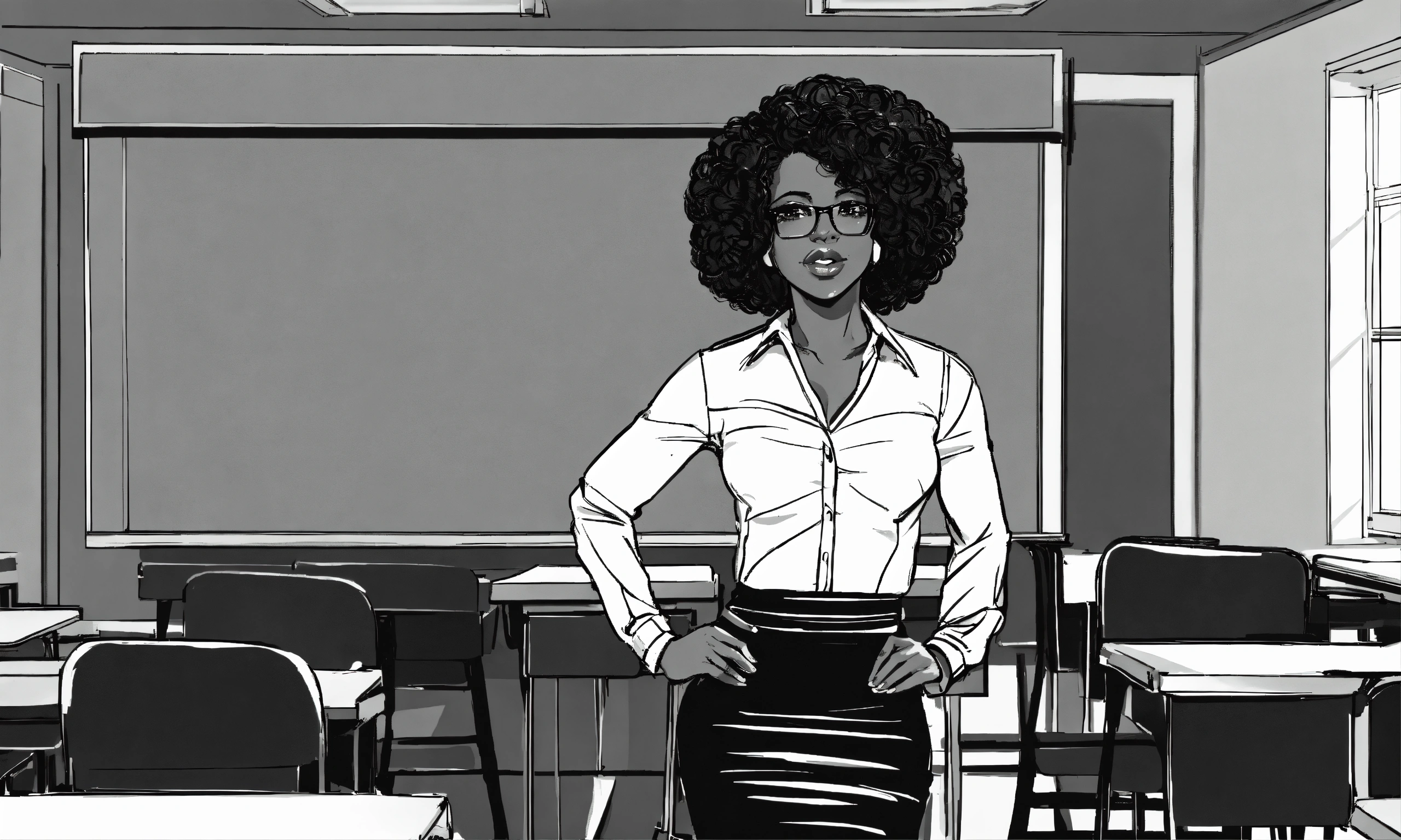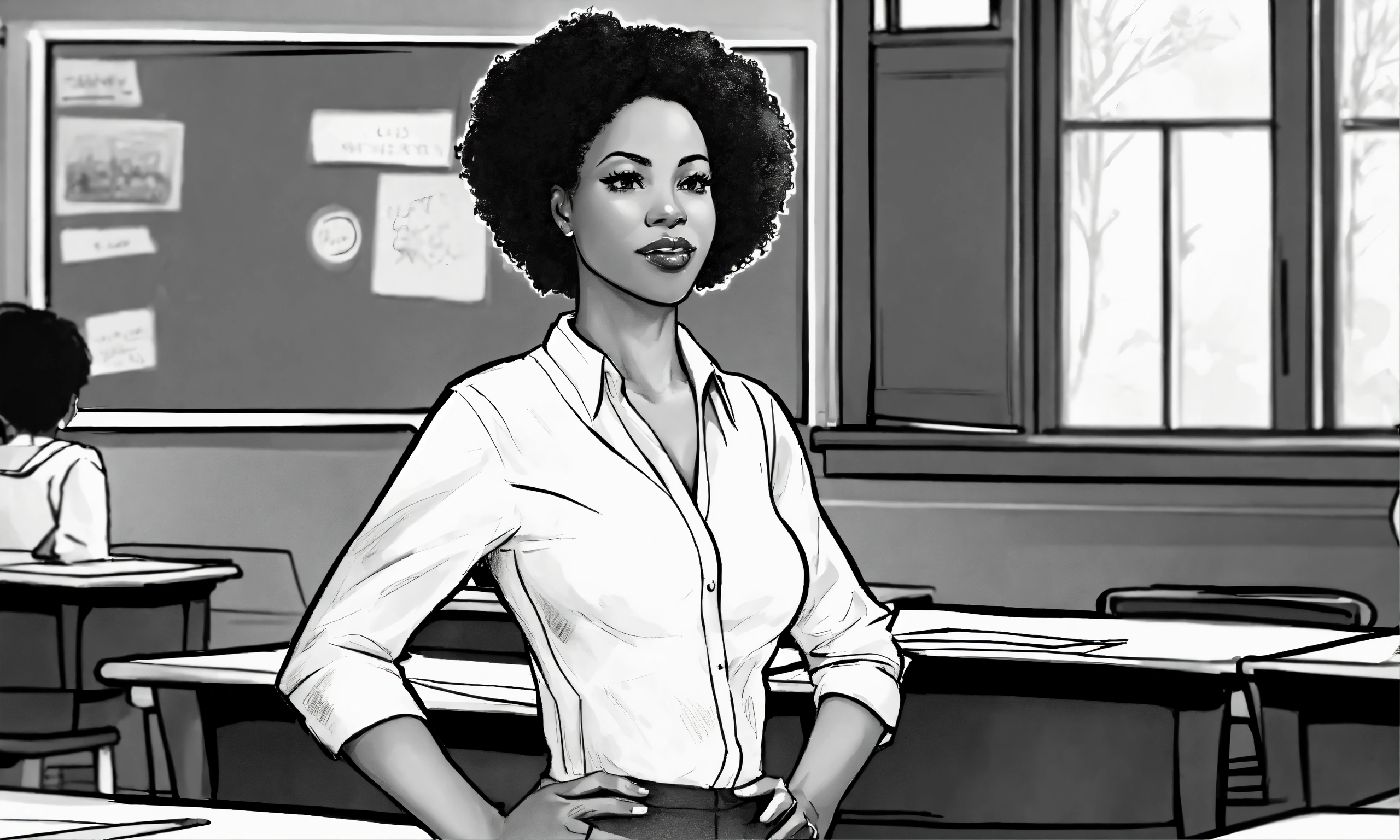 A black and white illustration of a attractive black woman teacher, standing in class, nice body, pretty, big lips, 40 years old, natural hair, fiesty, fussing, standing in classroom