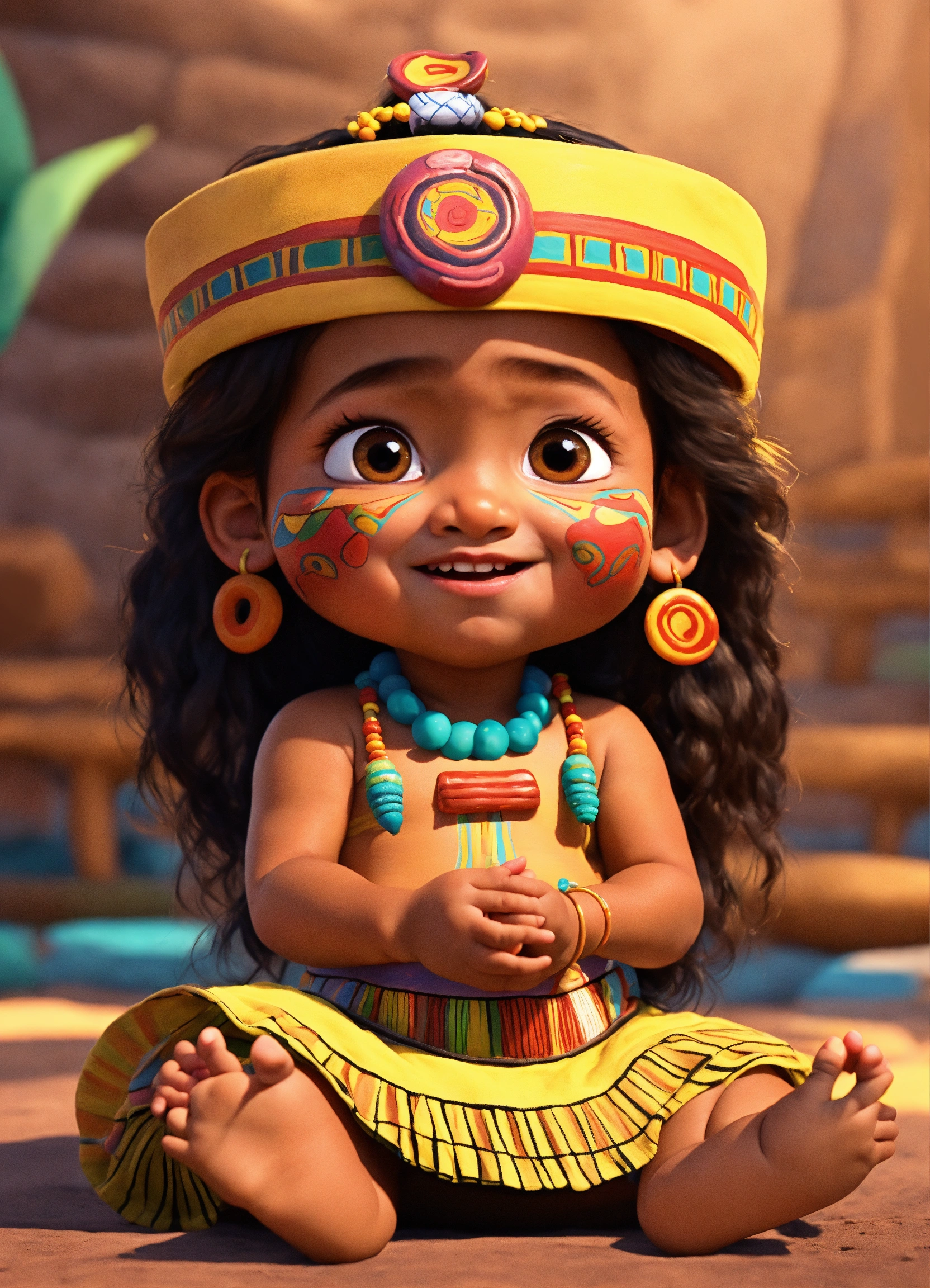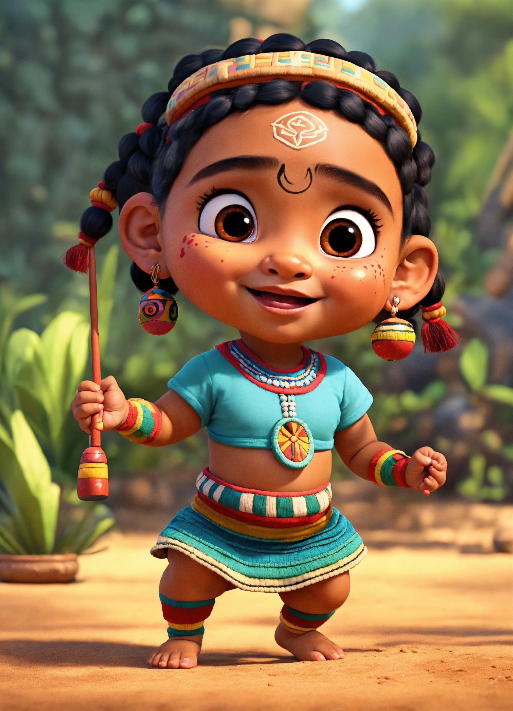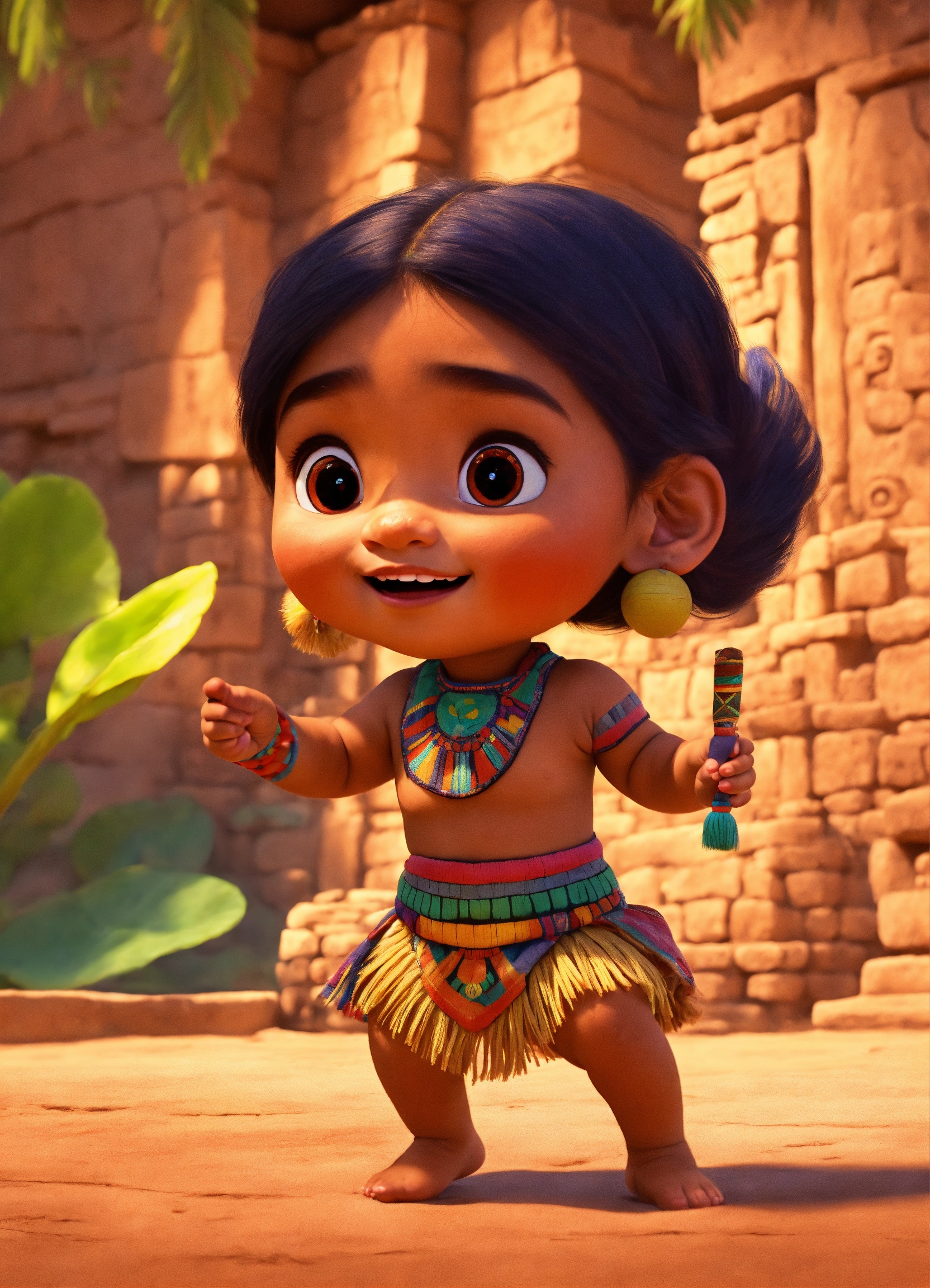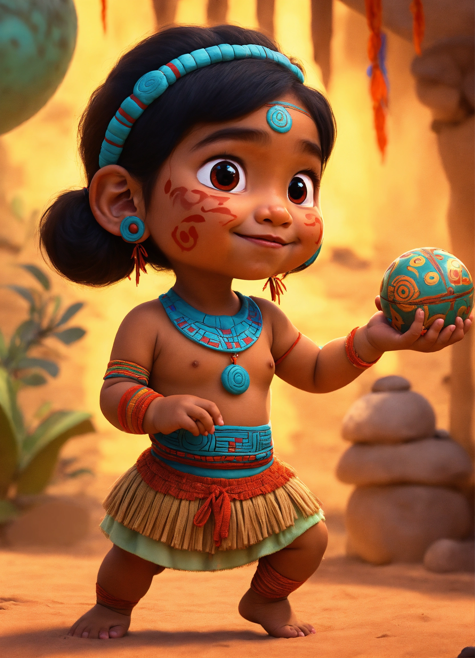 Pixar animation of a baby mayan indigenous girl playing the mayan ball game, skin painted, pixar style cartoon
