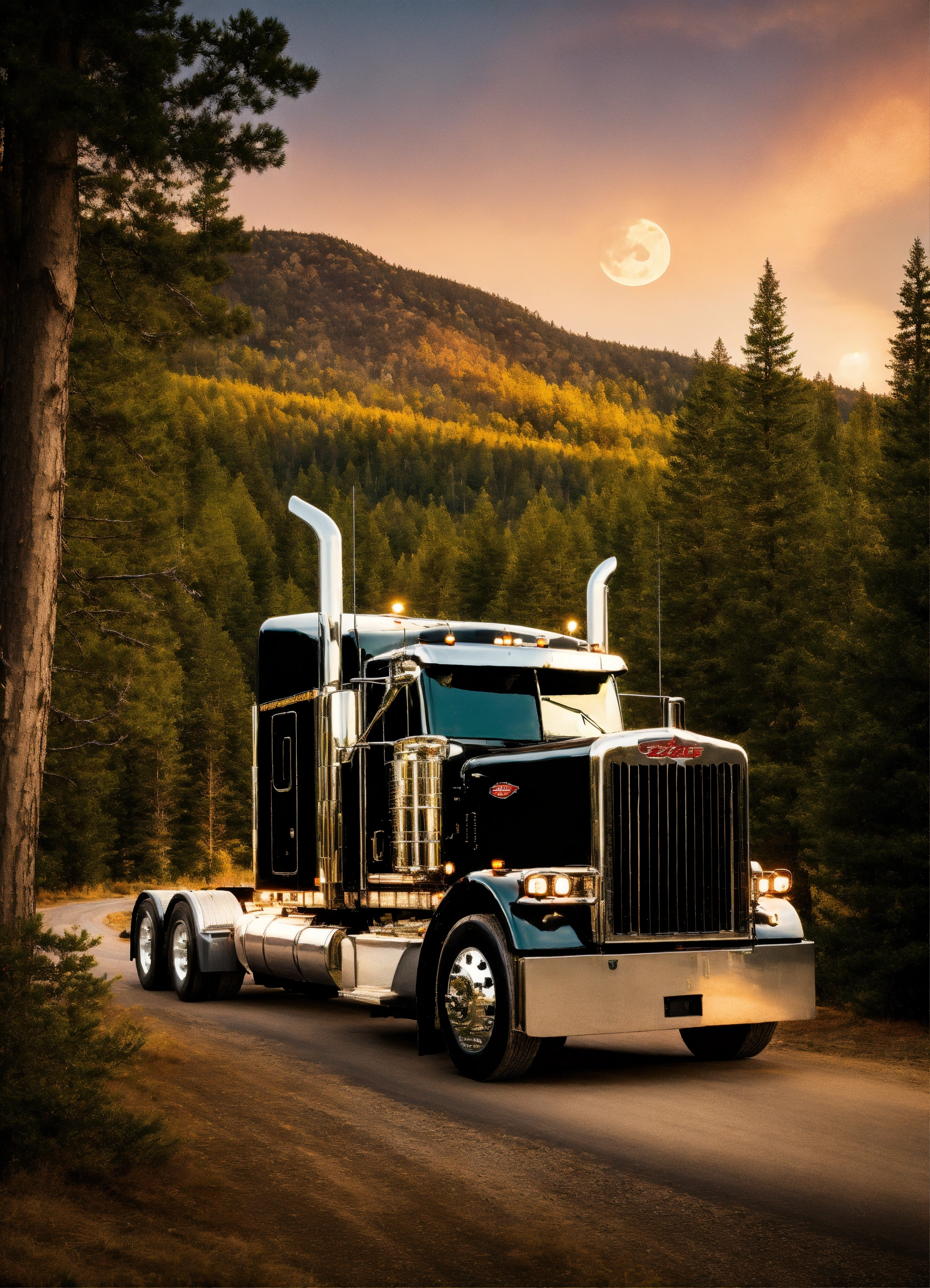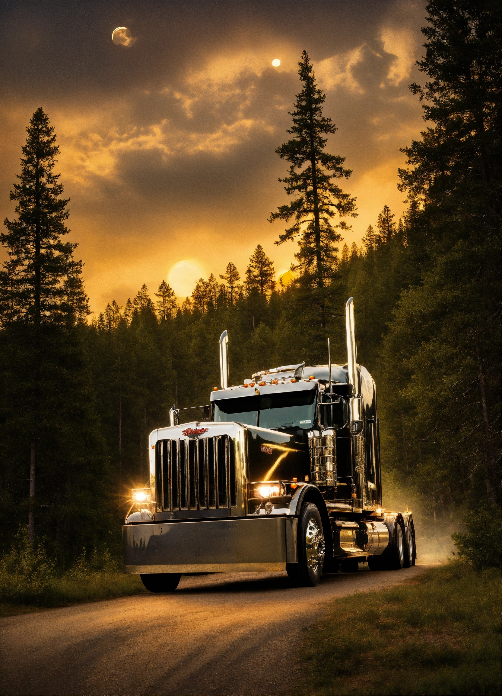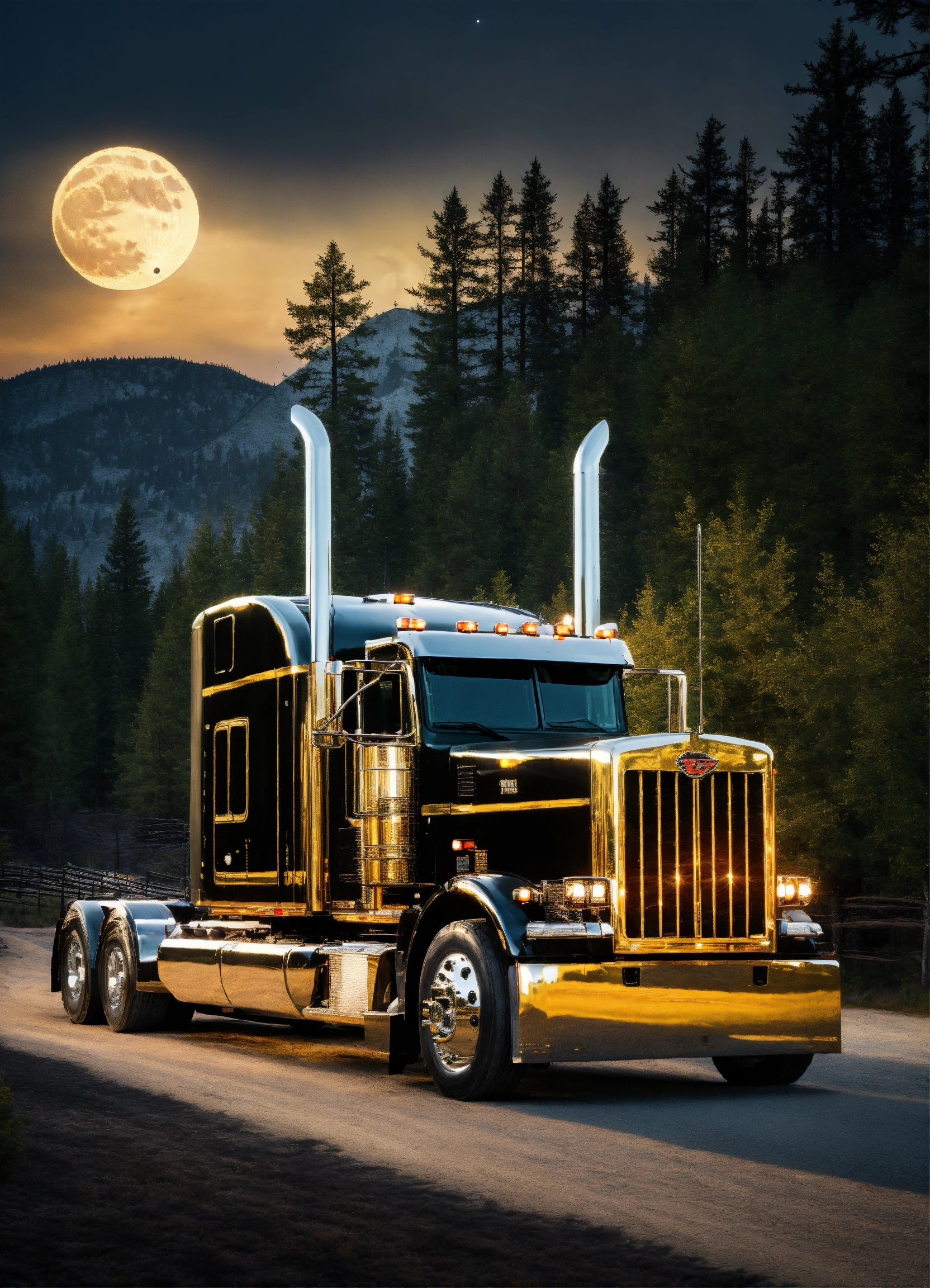 2023 peterbilt 389 black and gold trim with woodland pine trees landscape and golden moonlight landscape