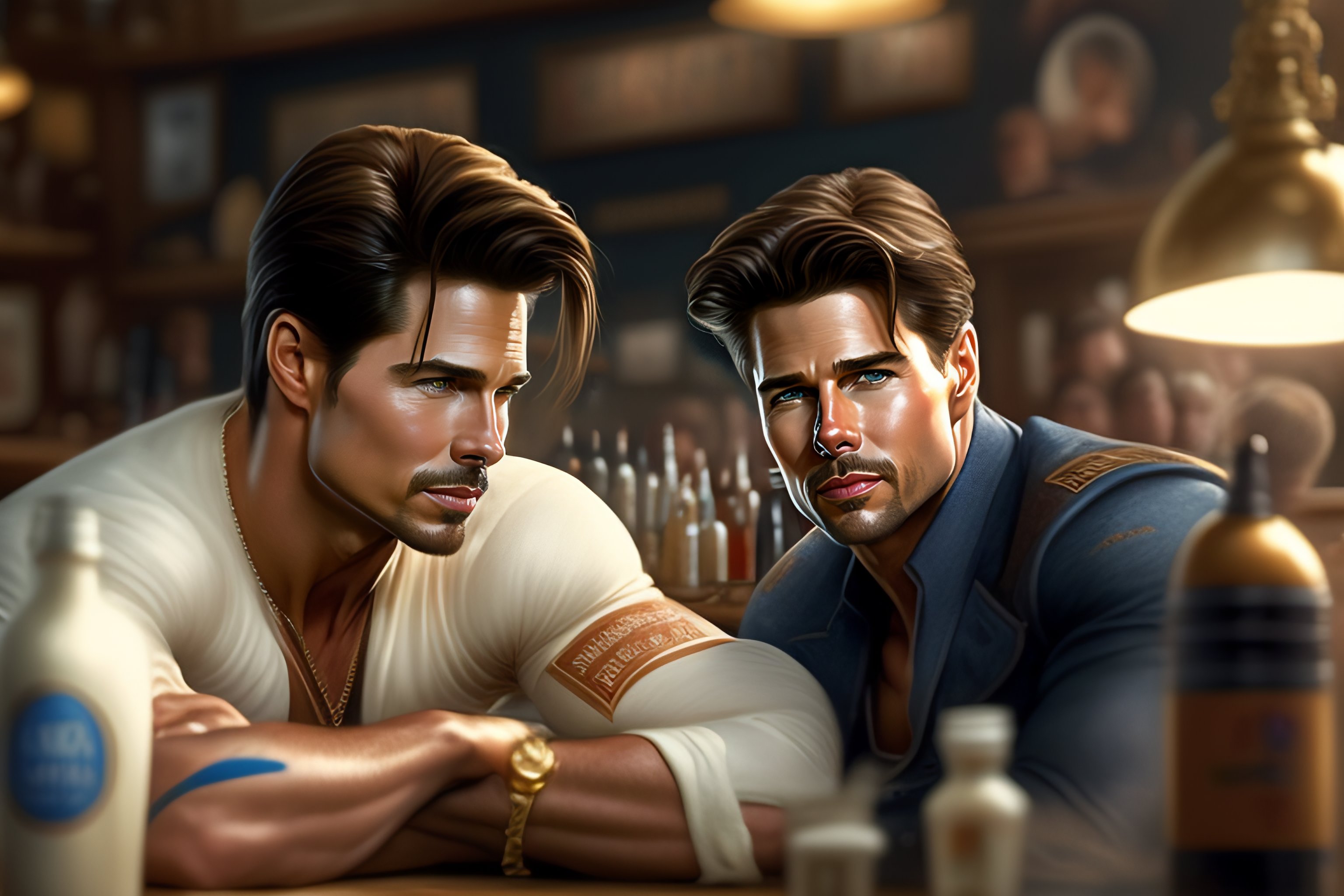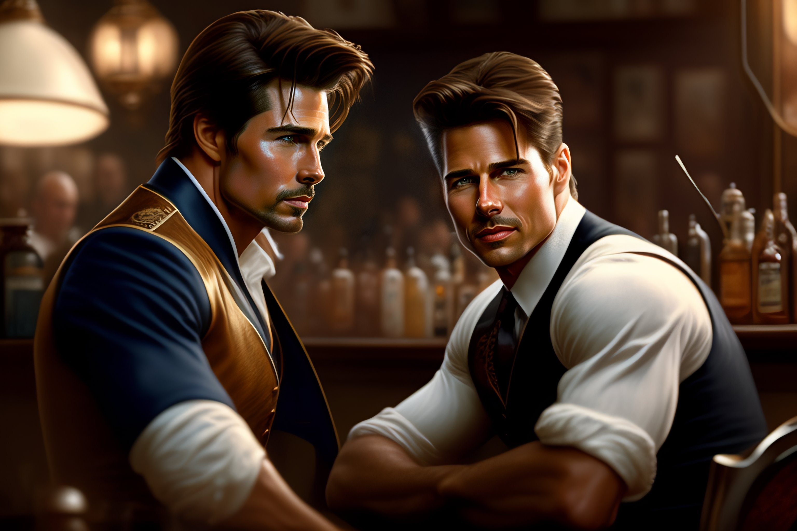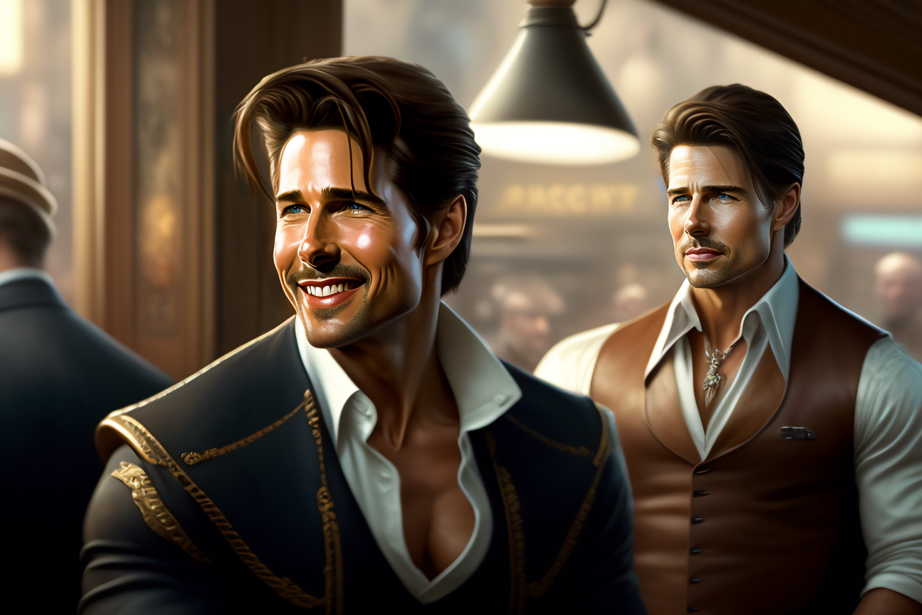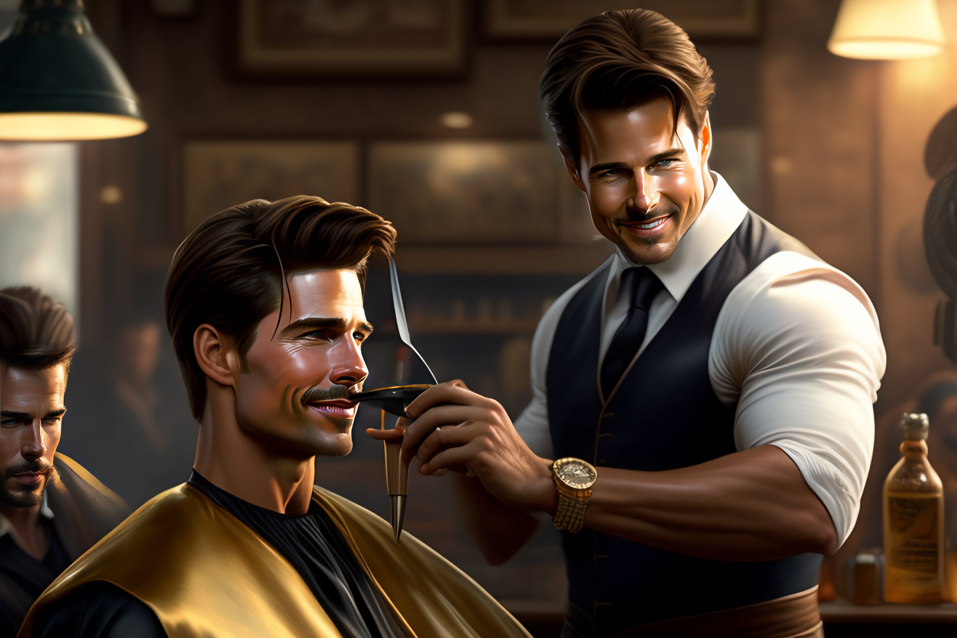 A detailed picture depicting tom cruise sitting on a chair in a barbershop, brad pitt working as a barber standing behind to cut tom cruise's hair, illustrator, by justin gerard and greg rutkowski, digital art, realistic painting, dnd, character design, trending on artstation