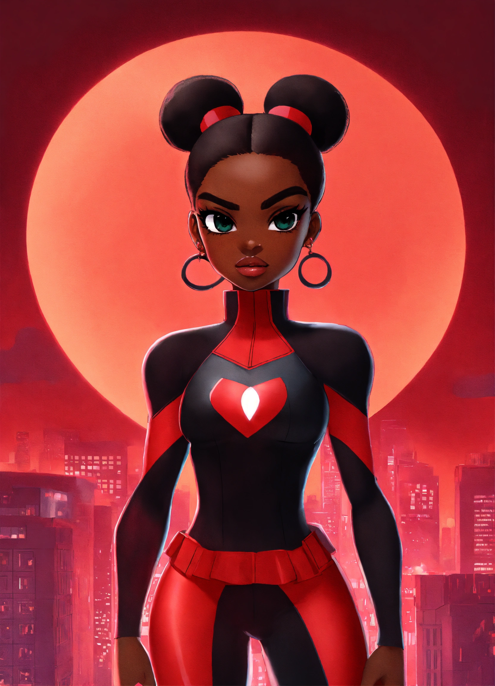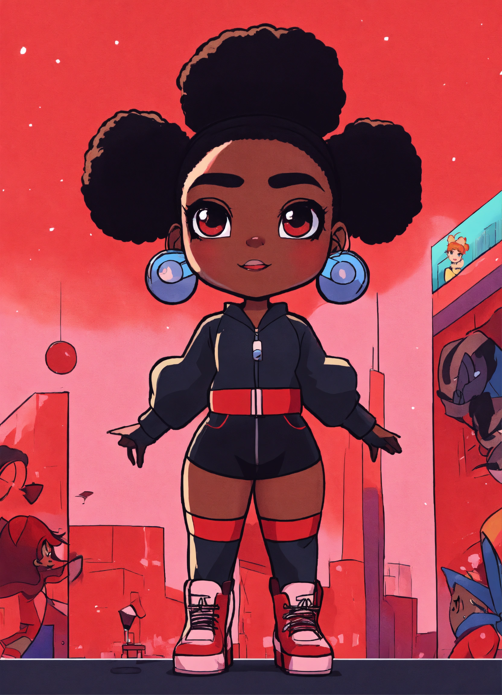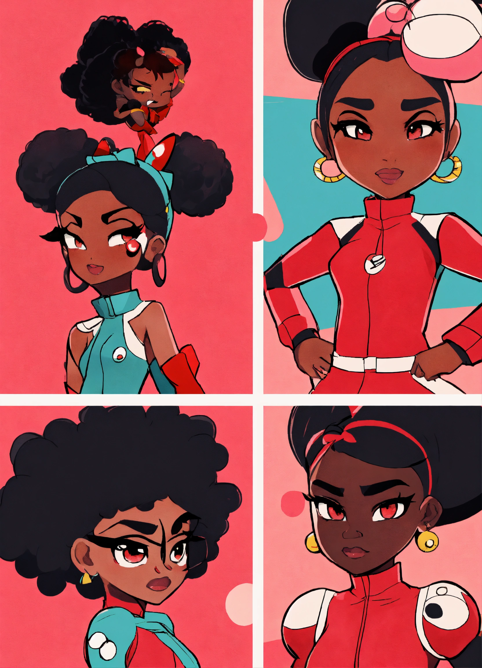 Create a playful power puff girl inspired 4 black female characters in red, stern looking in front of the camera