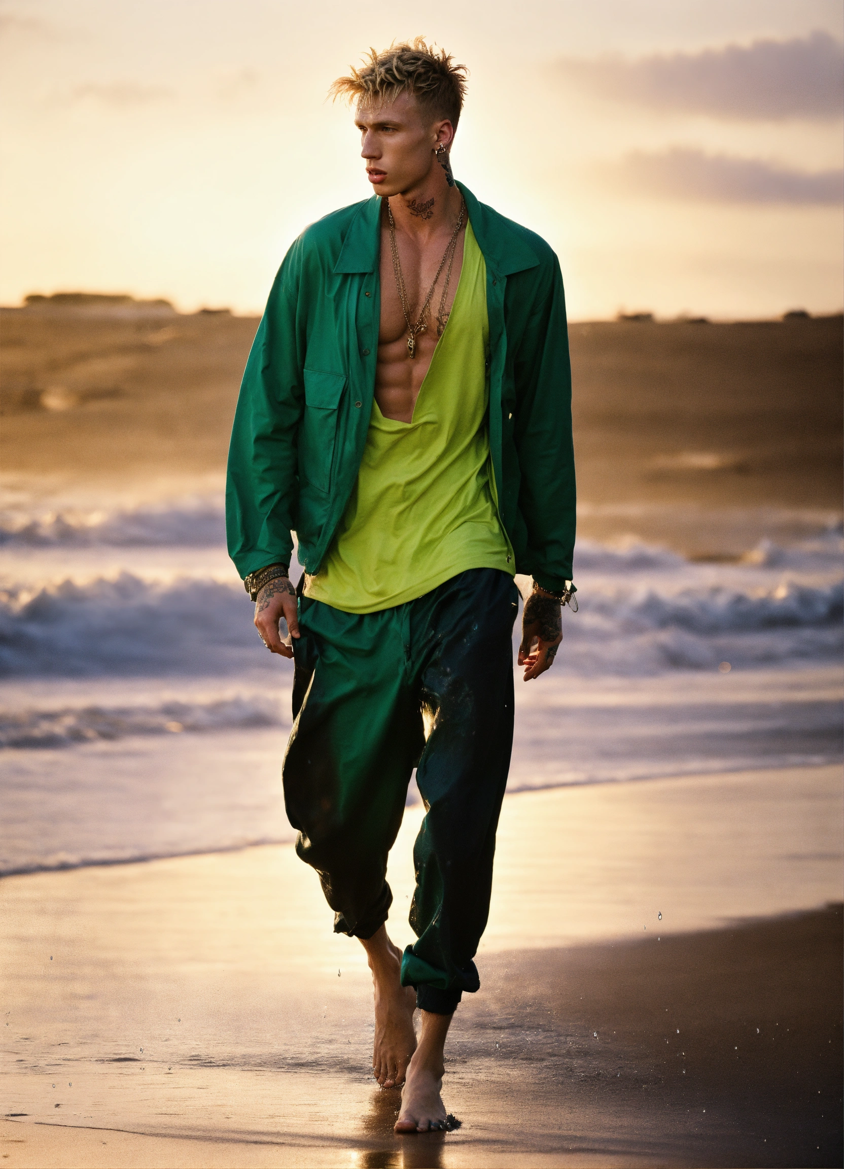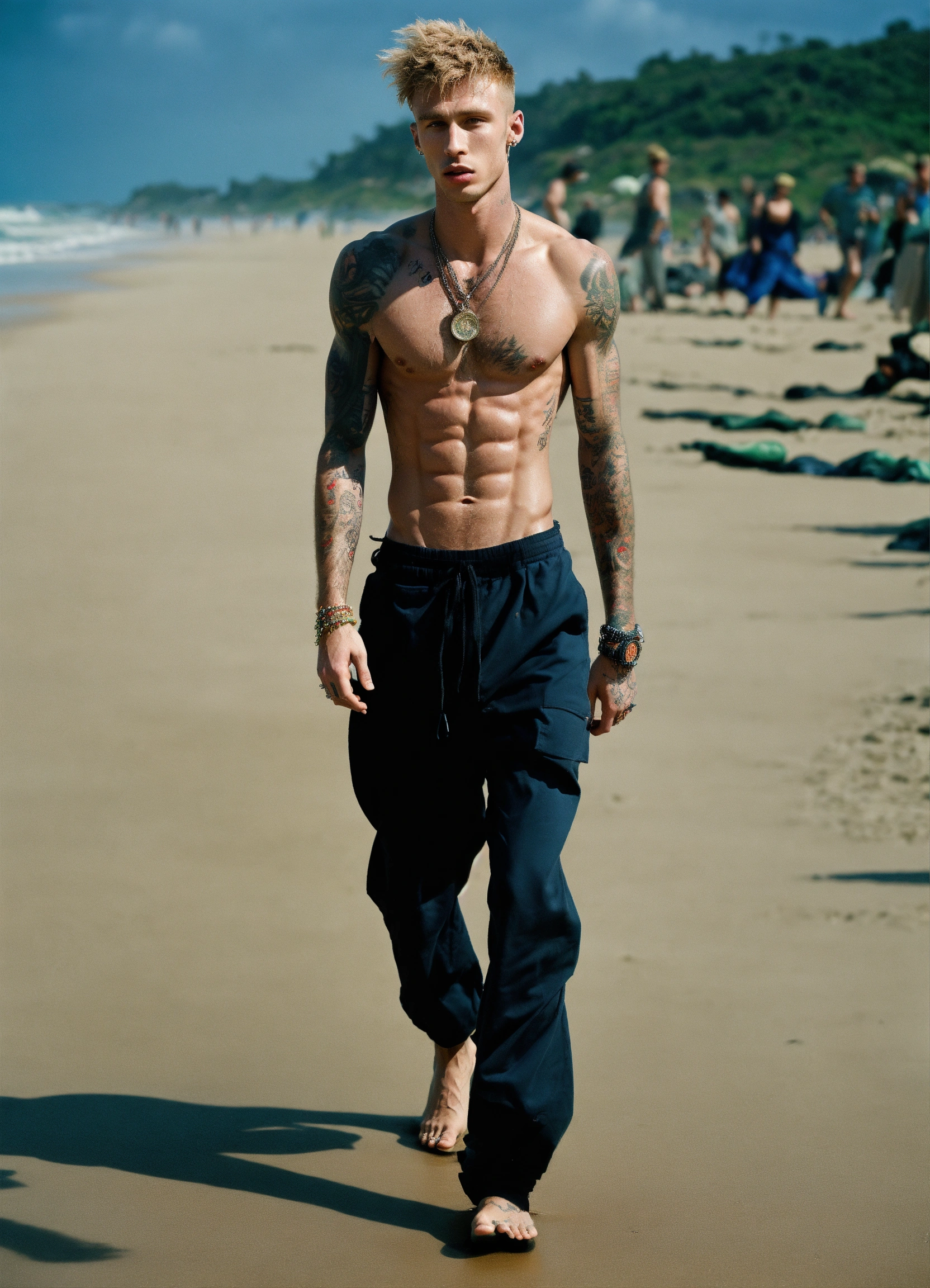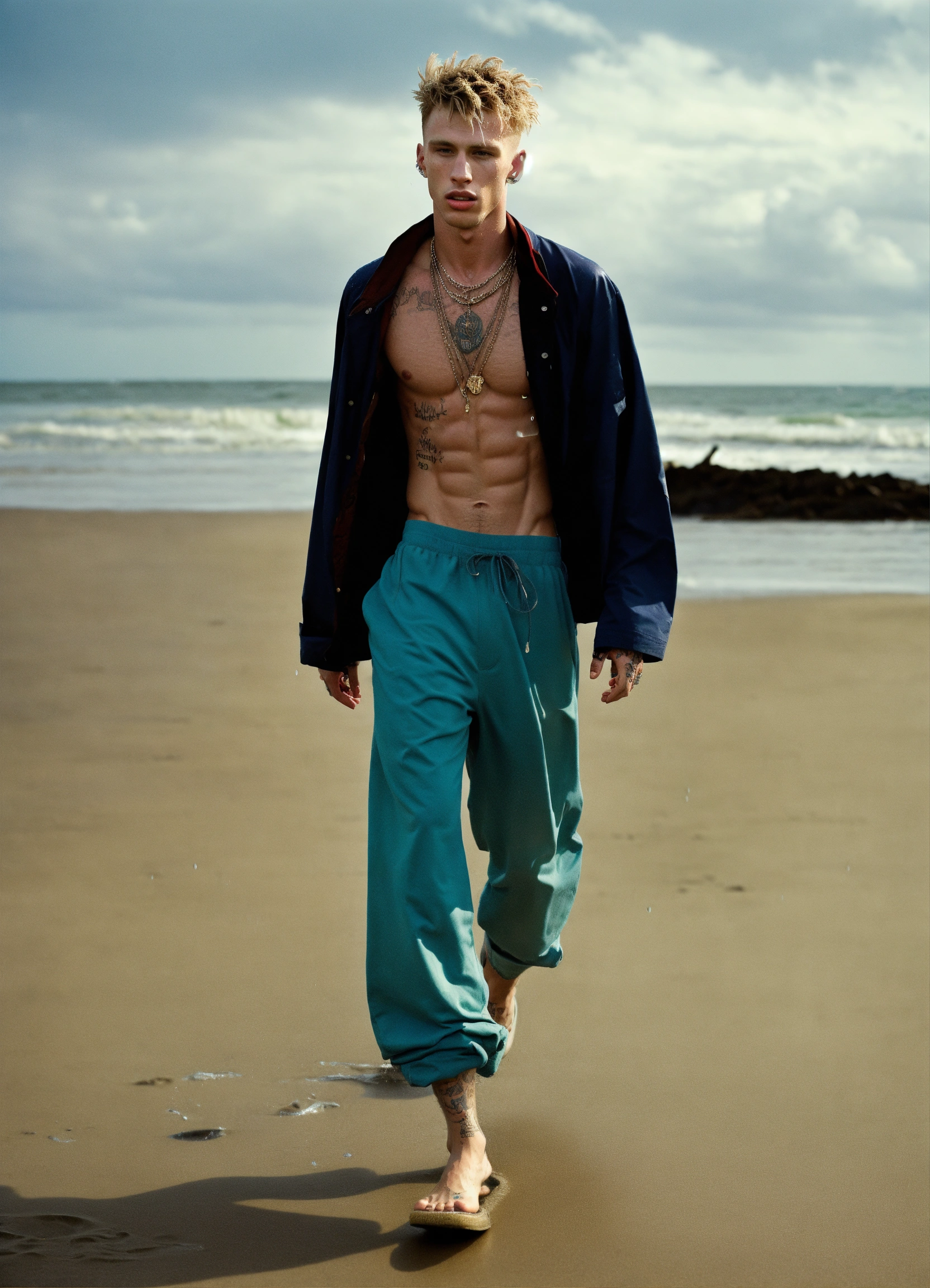 An impressive realistic photo of machine gun kelly walking on the beach in baggy pants, arrogant, muscular physique, sweating, raining, warm day, photographed by bruce weber
