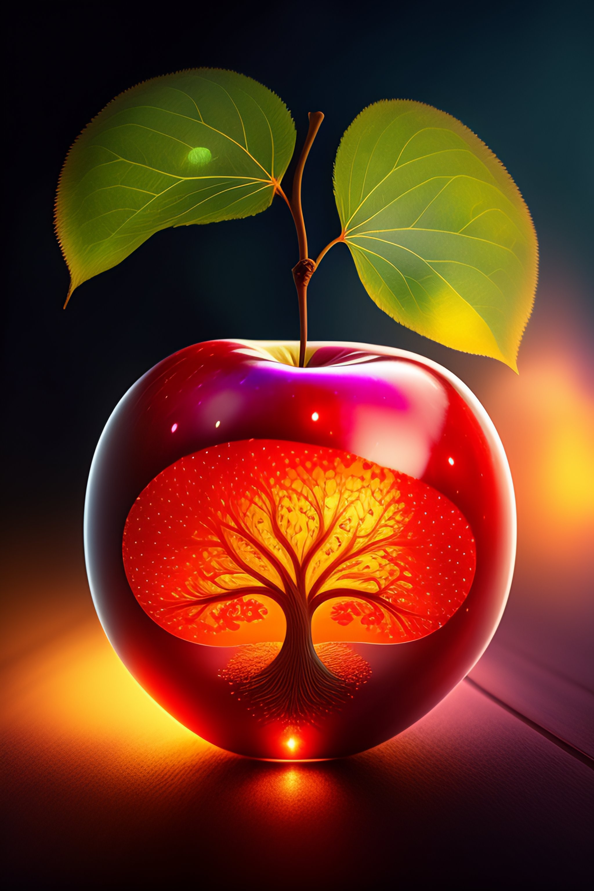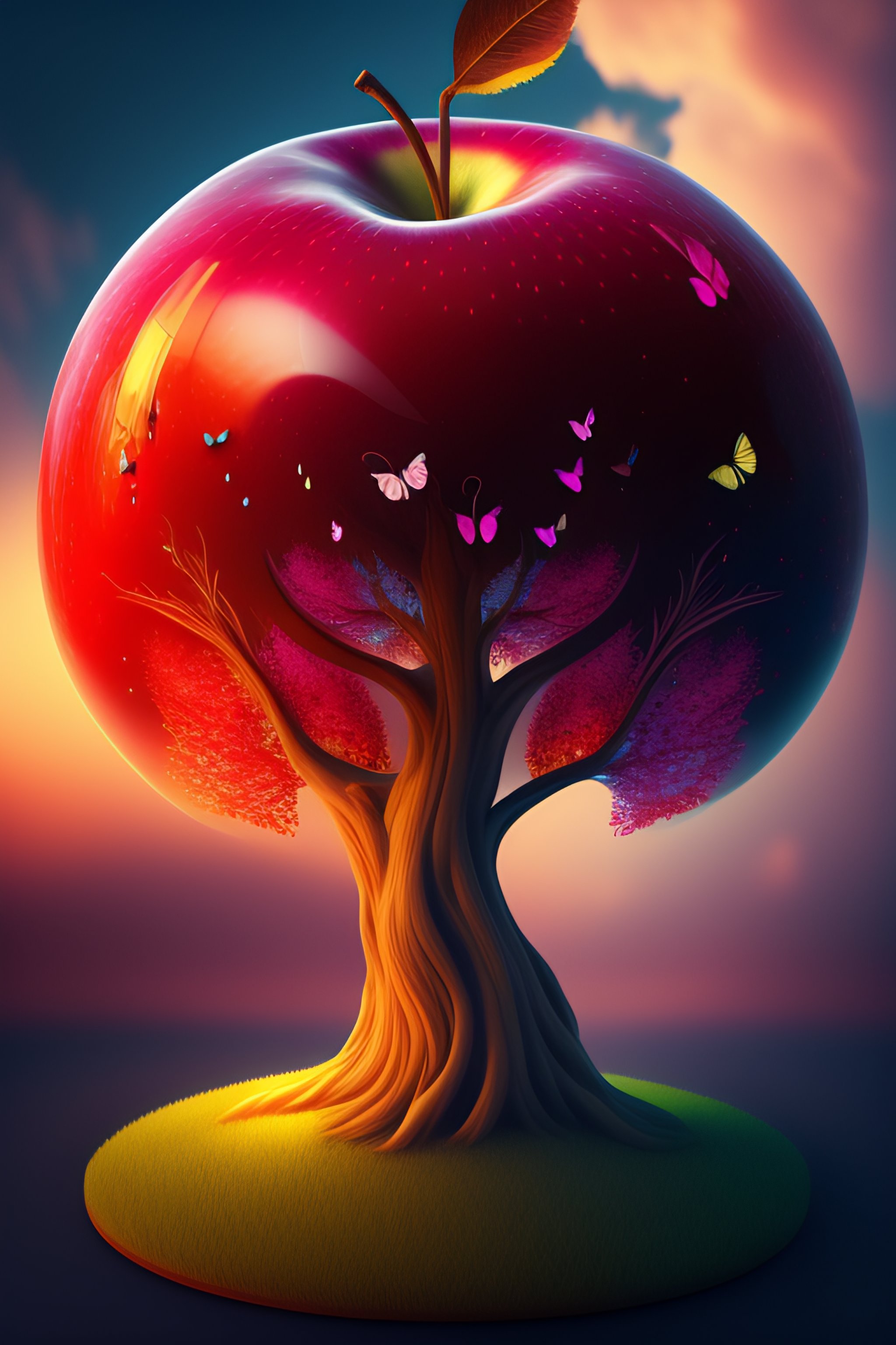 A dream within a dream, a fantastic, beautiful dream magic tree in a middle of a fiel, its fruits are red transparent widow apples, inside the apples there are colorful lightning butterflies, photo realistic detailed sharp focus, center