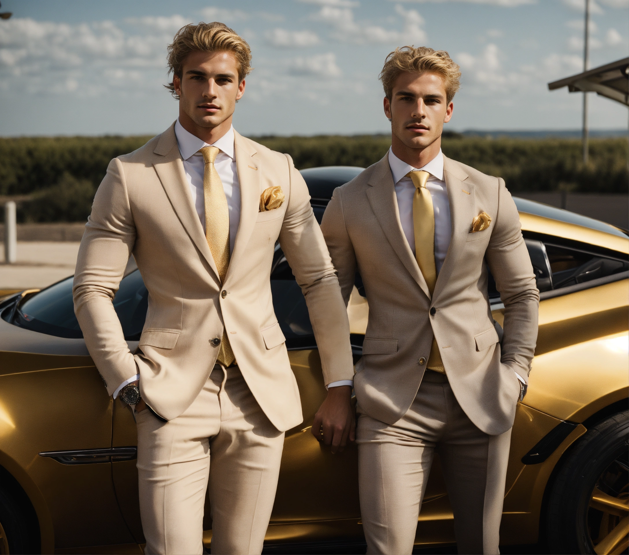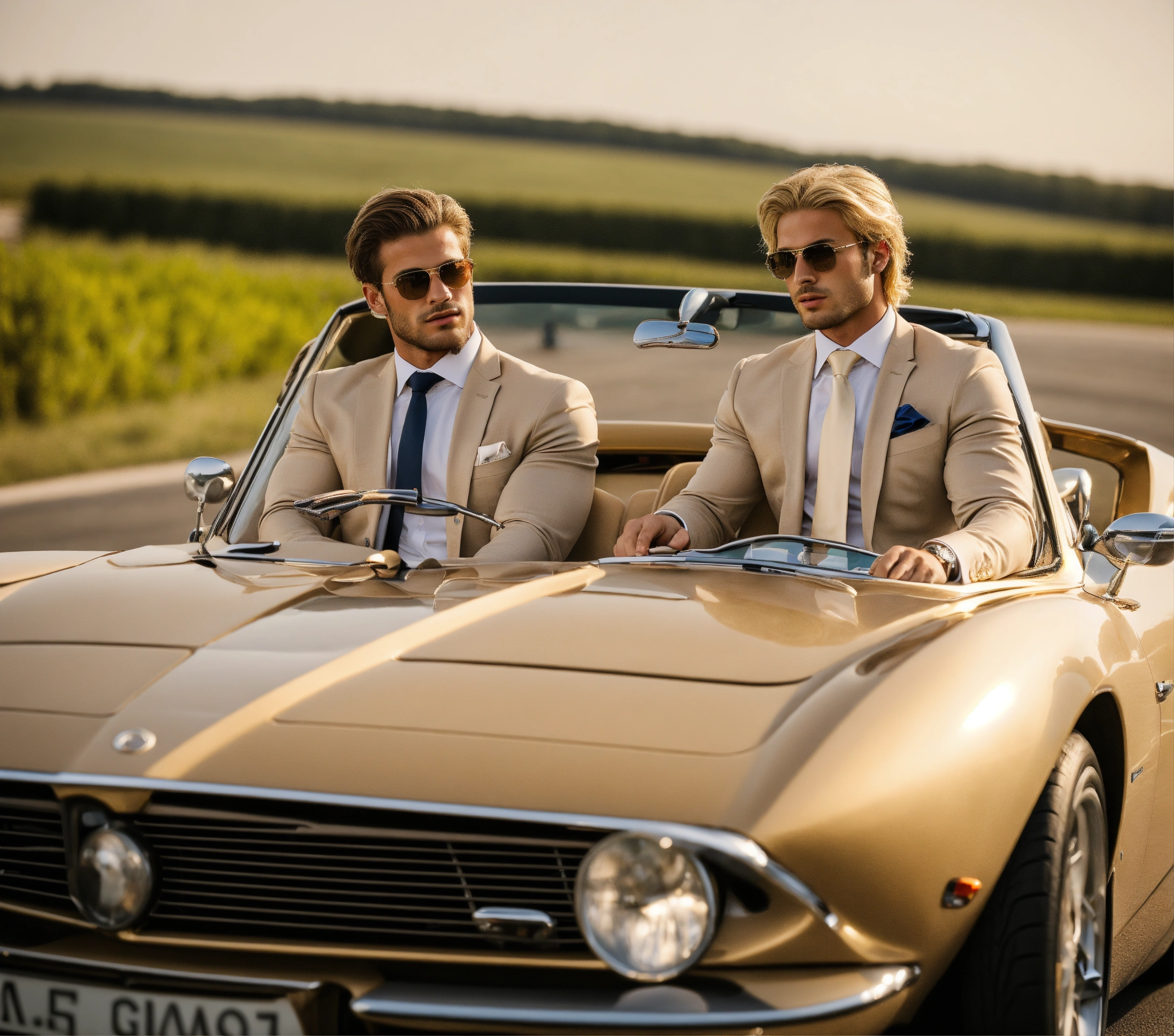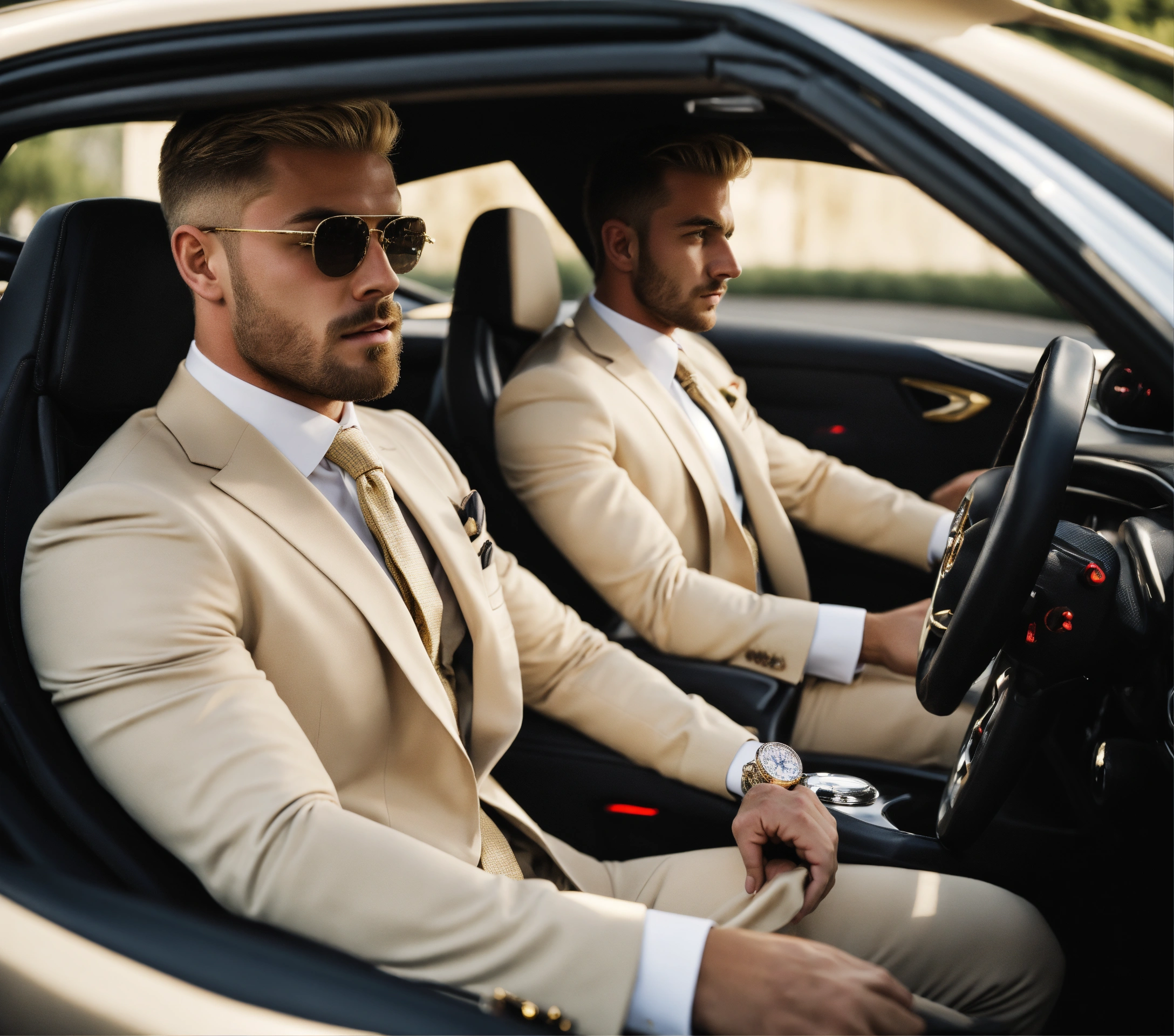 Two young muscled italian sportsmen in light beige suit, golden tie, blonde brushed hair, at the wheel of a sport car