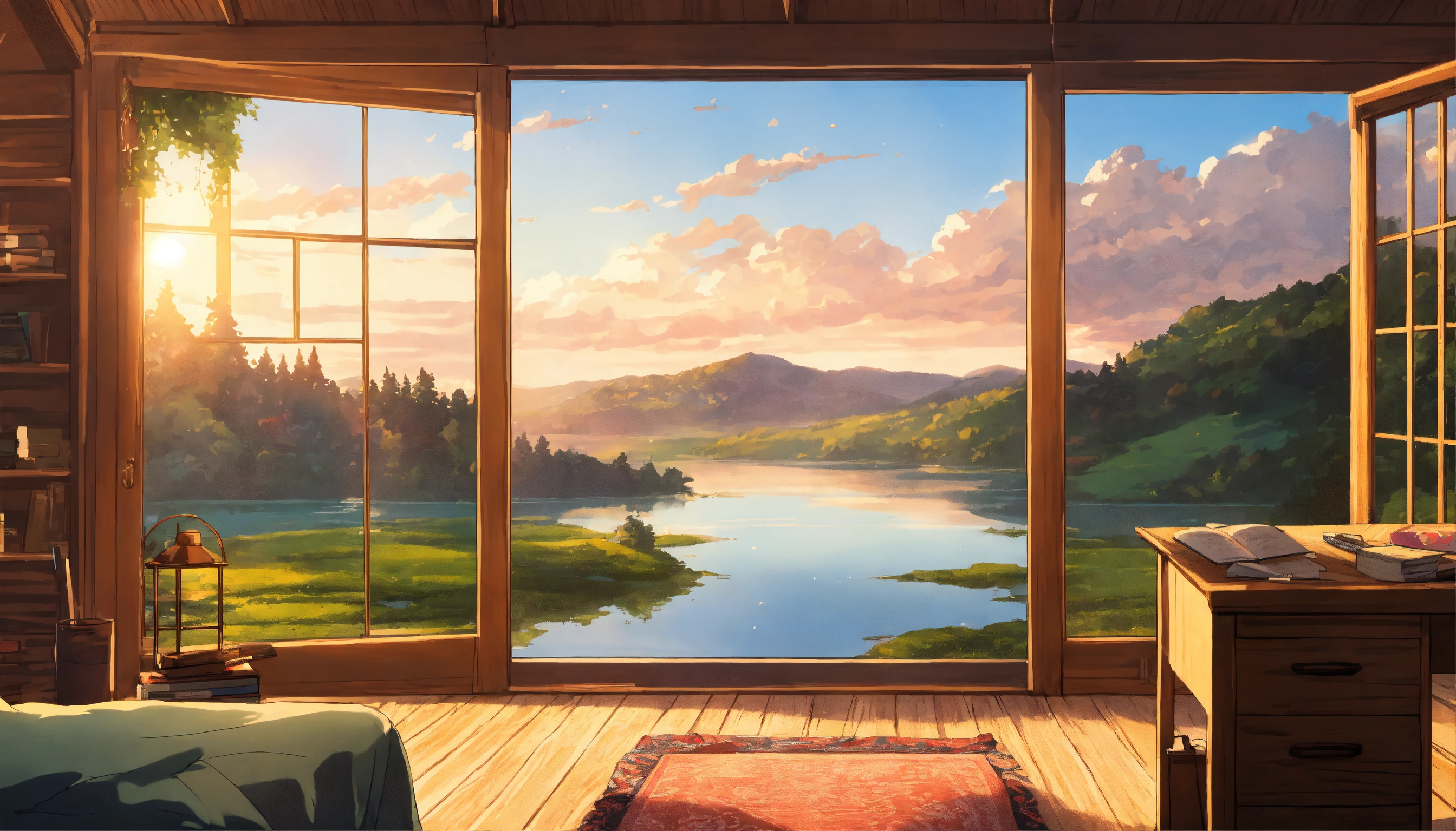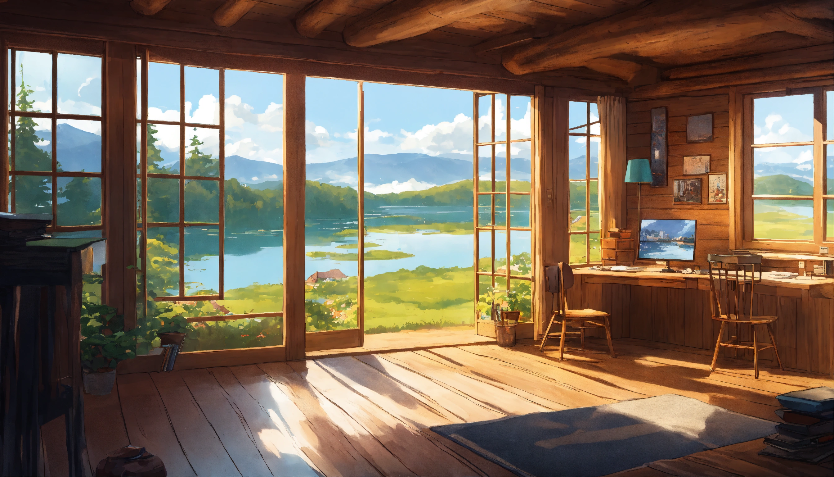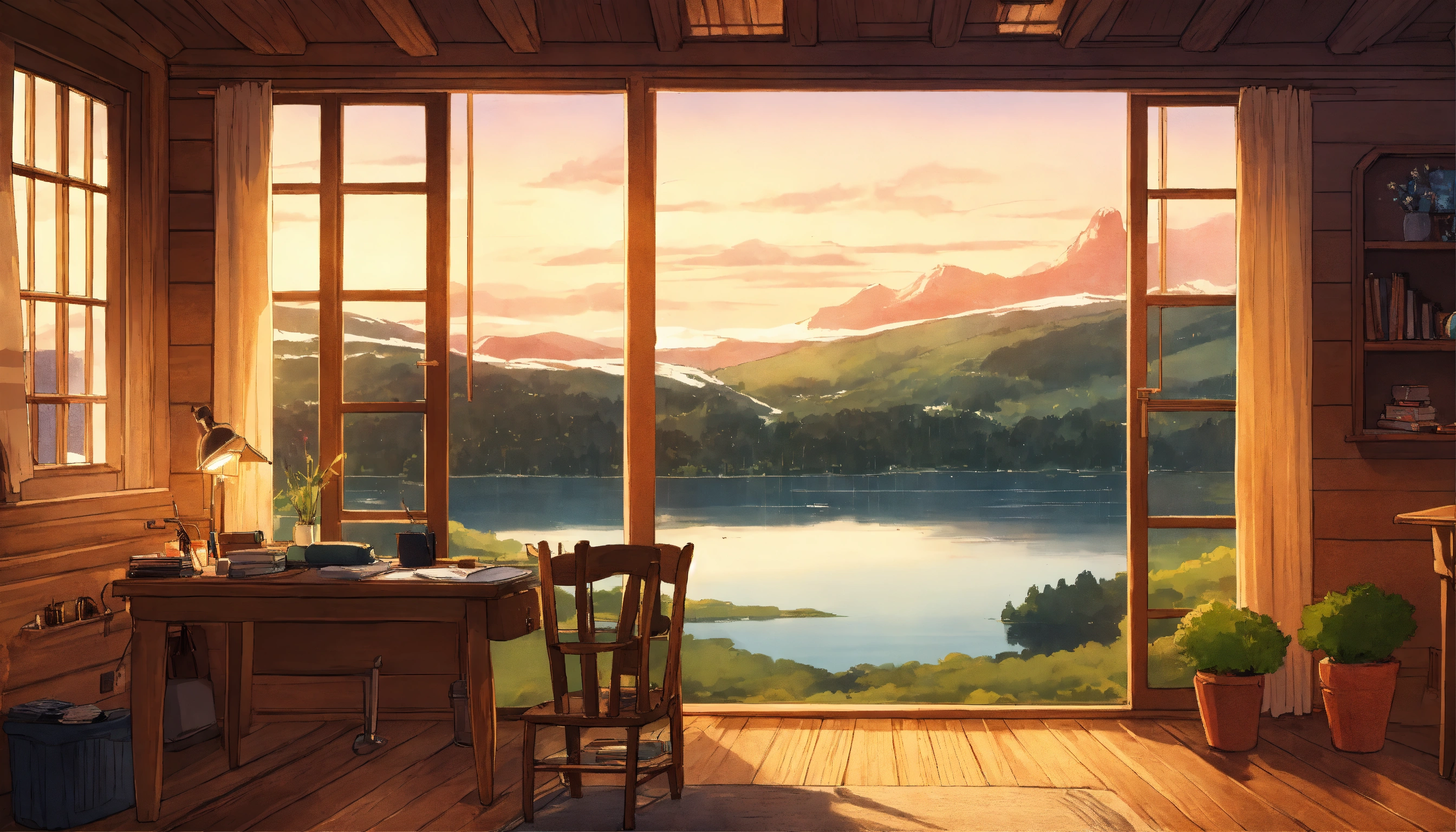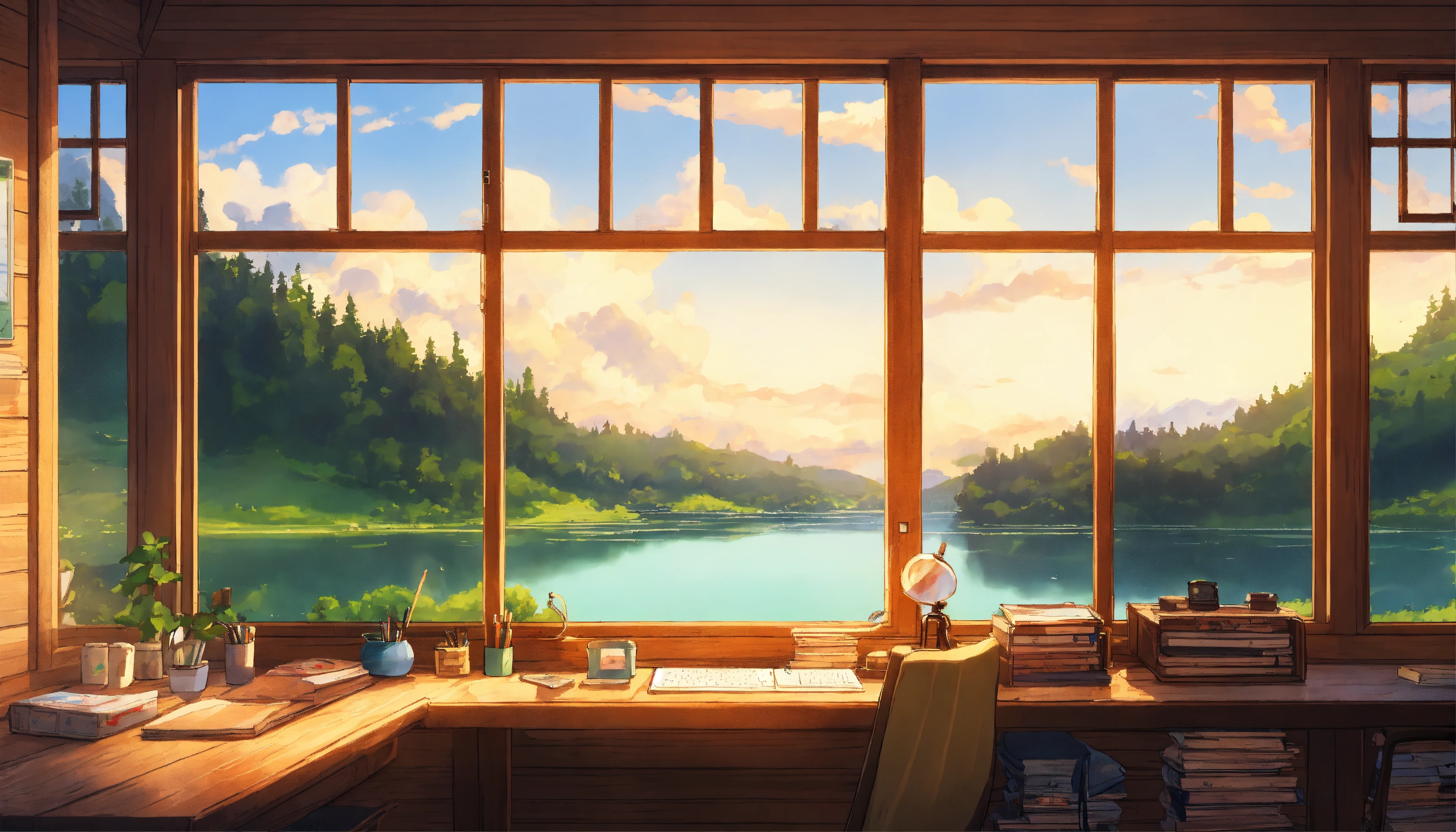 Log cabin in denmark, anime, studio ghibli, minimalistic, big window view of lake and hills and trees, study desk, anime lofi artwork