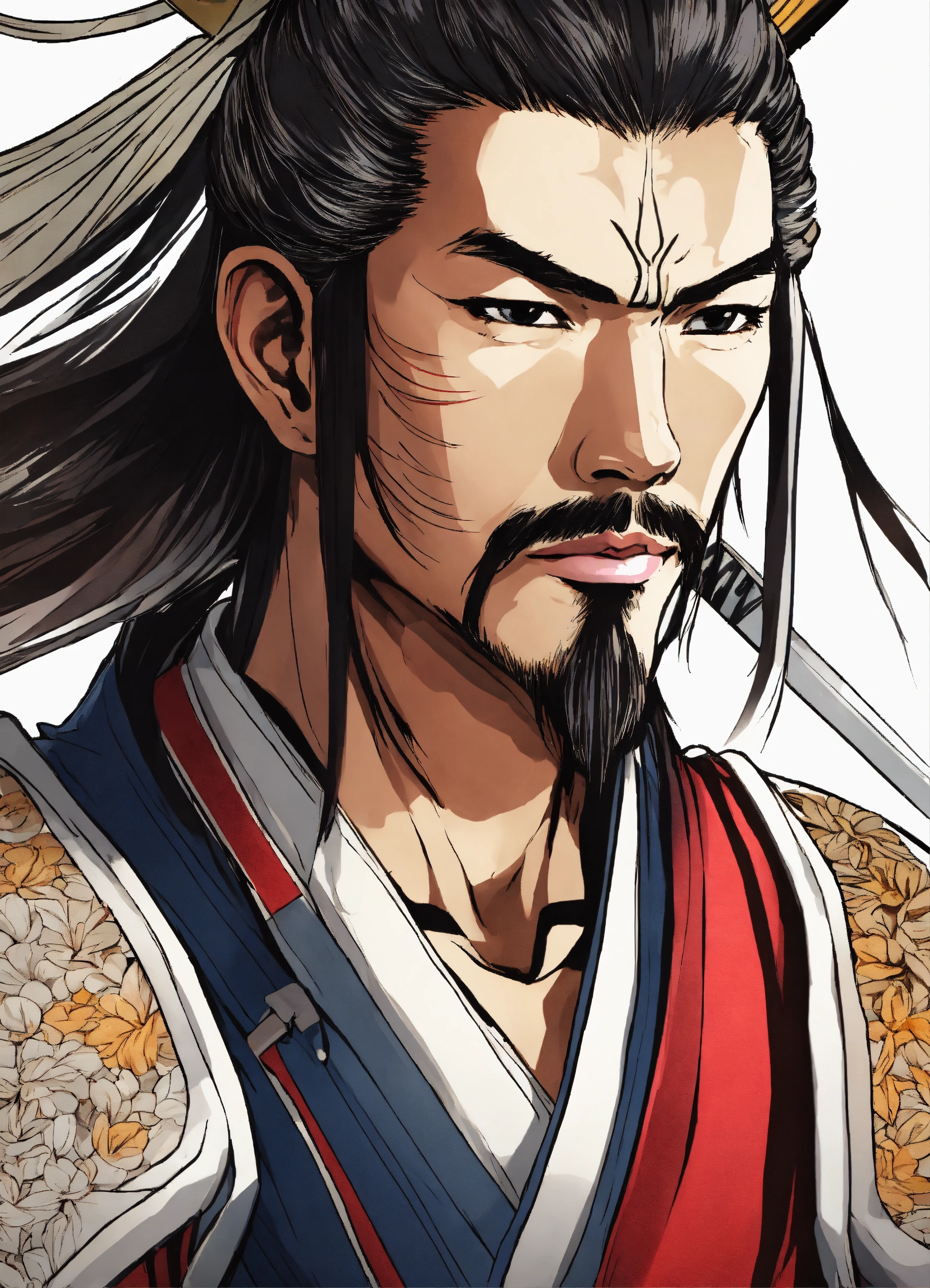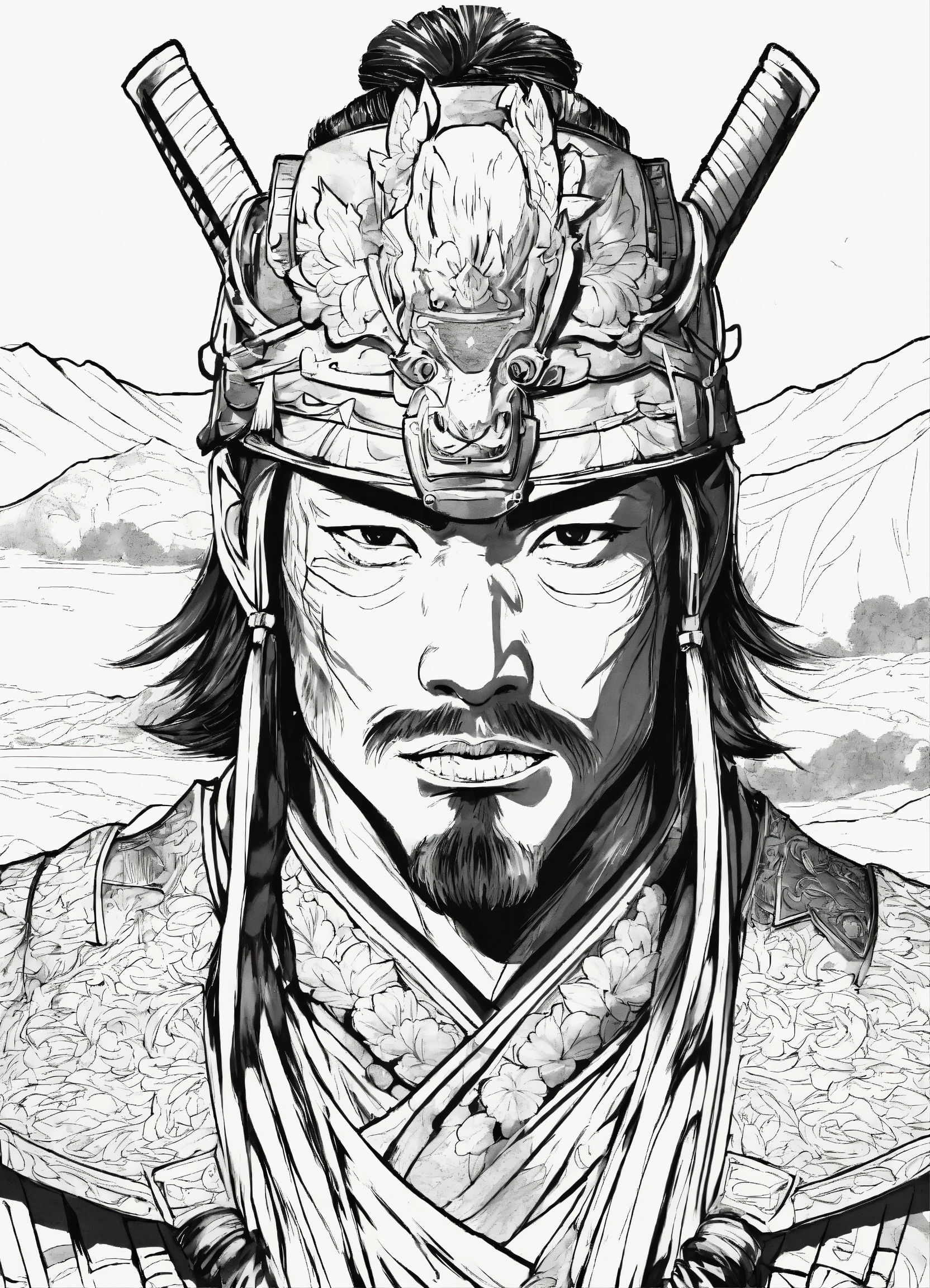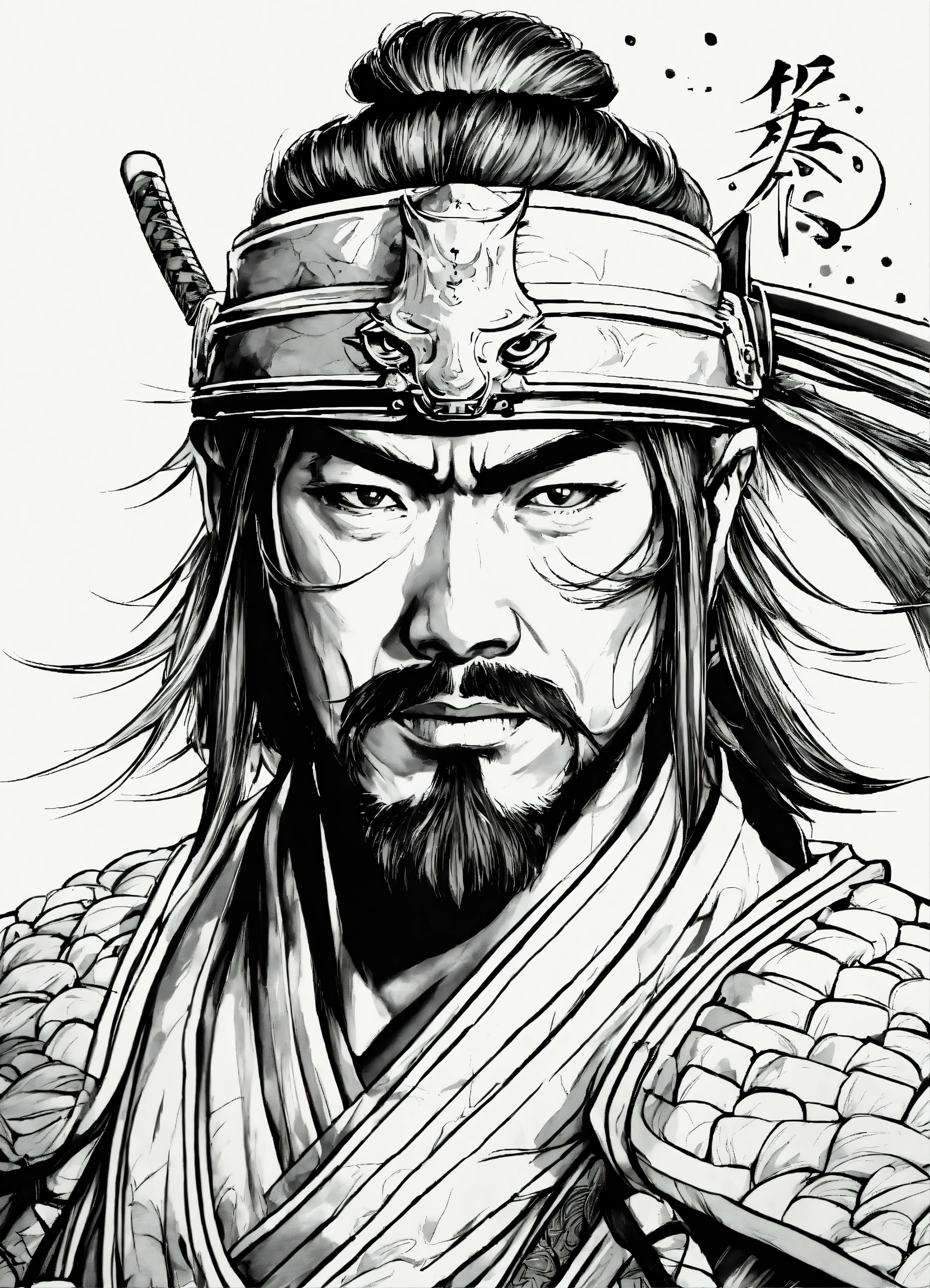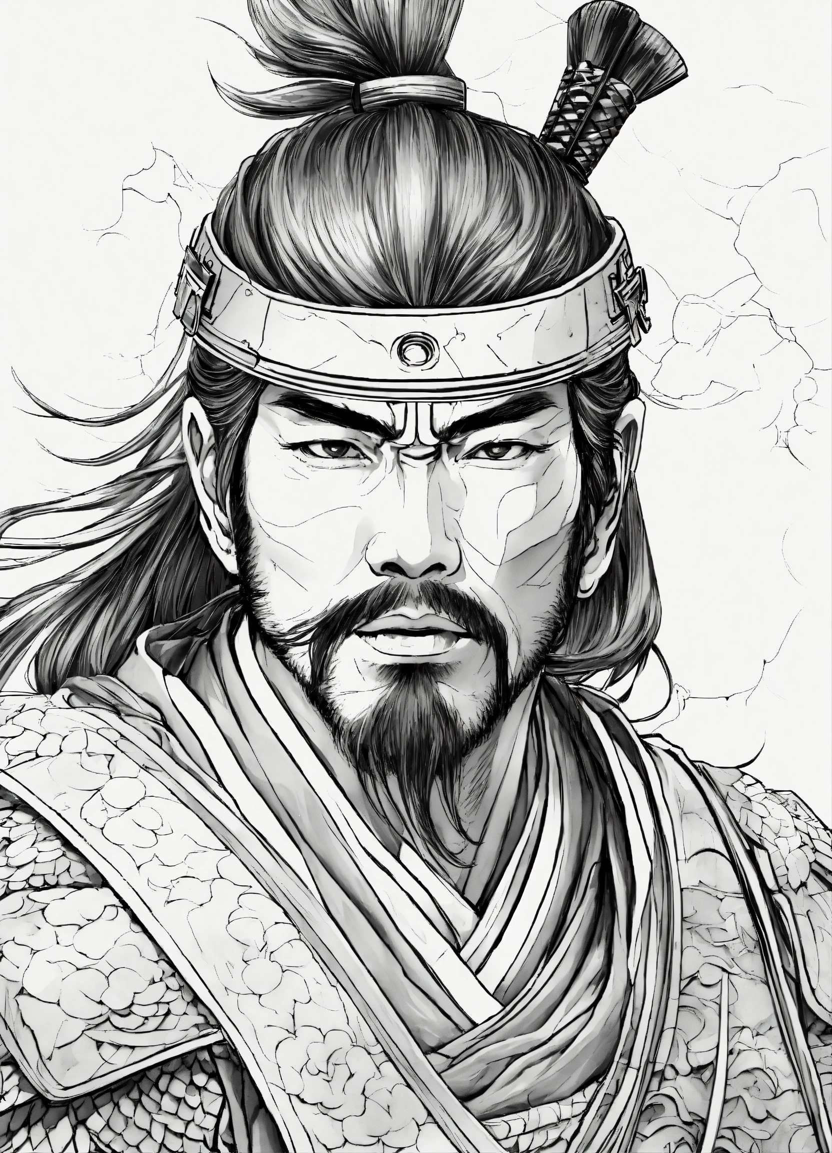 Generate a portrait of a samurai, 4k resolution, anime, with clear lines, no shadows, on a pure white background suitable for a adult's coloring book.