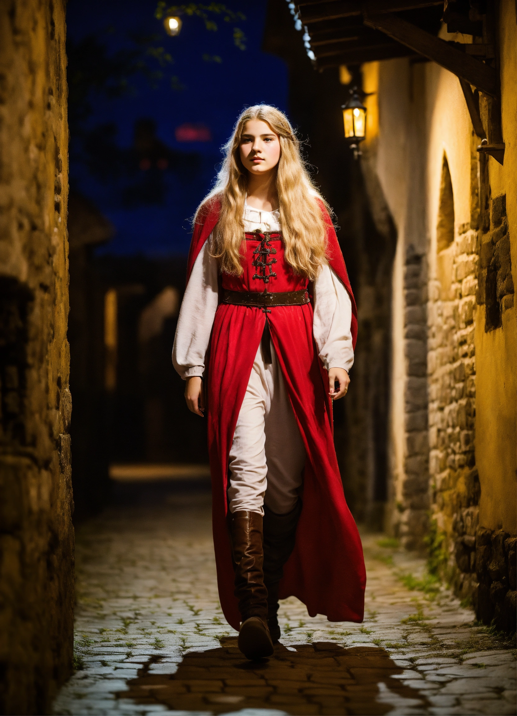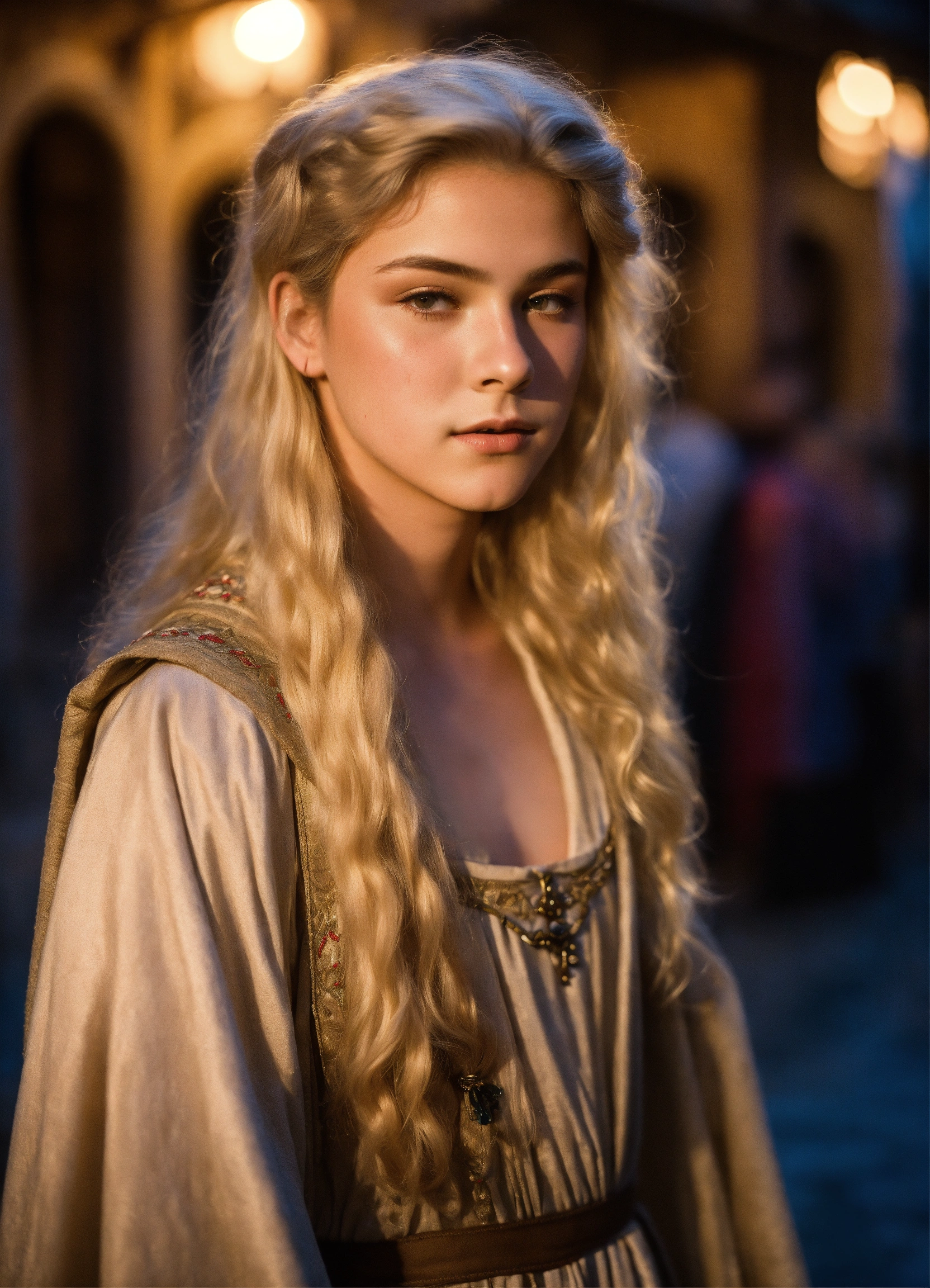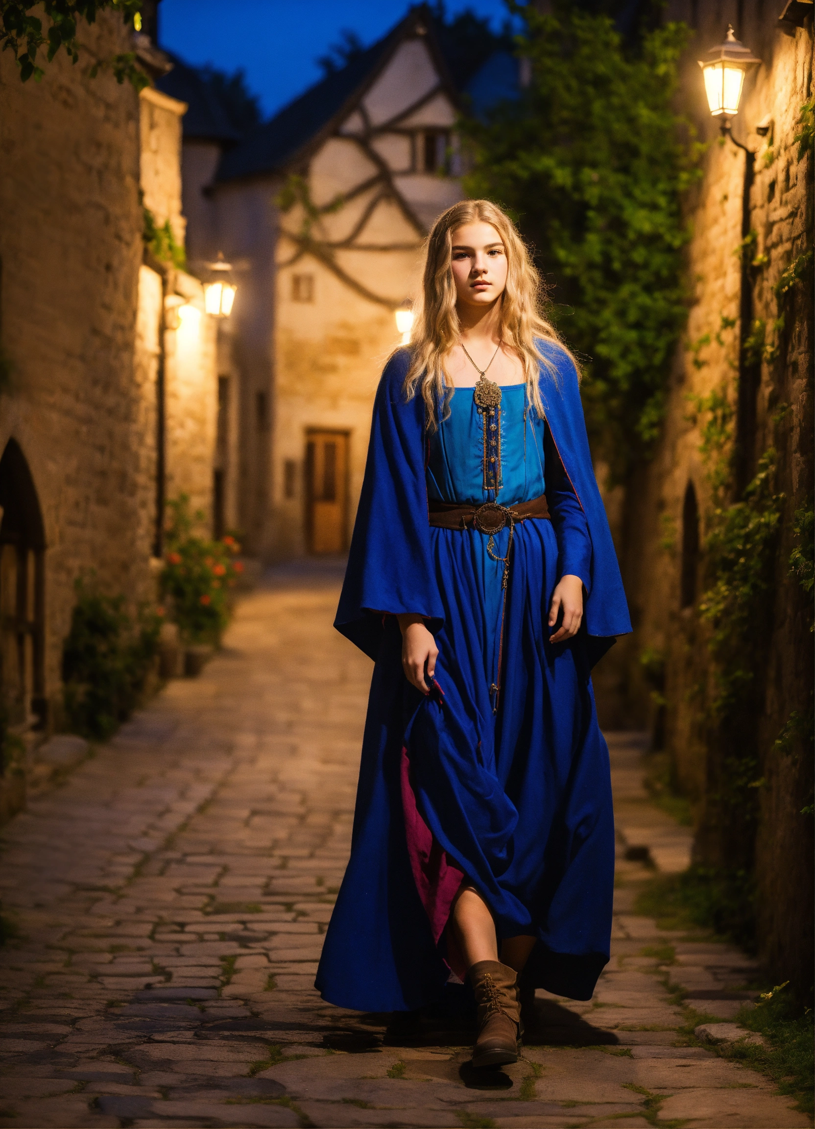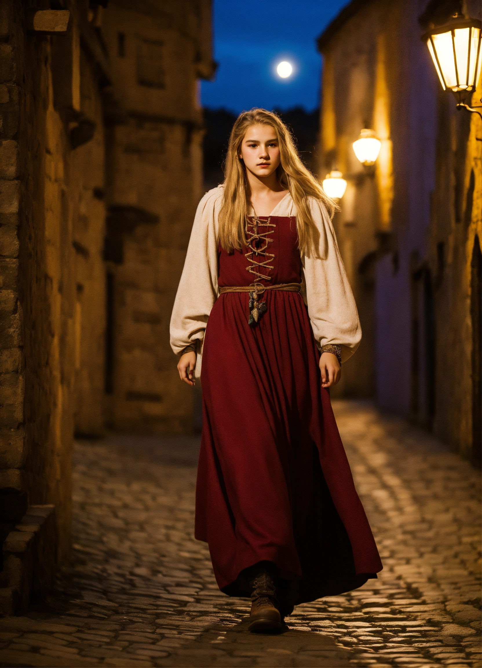 A beautiful genderqueer 16-year-old boy walking nervously. feminine features, natural-looking feminine makeup, sculpted curves, long flowing blond hair, wearing a peasant dress and a cloak, set in a medieval town at night.k.