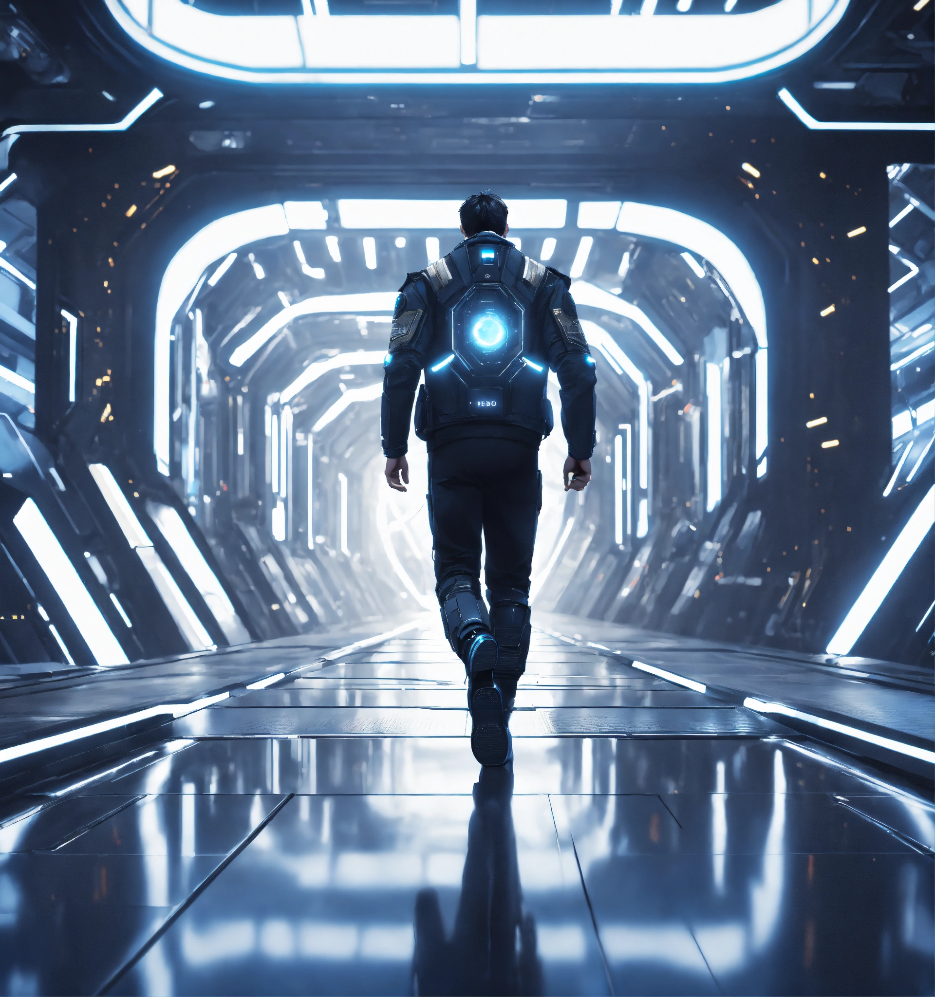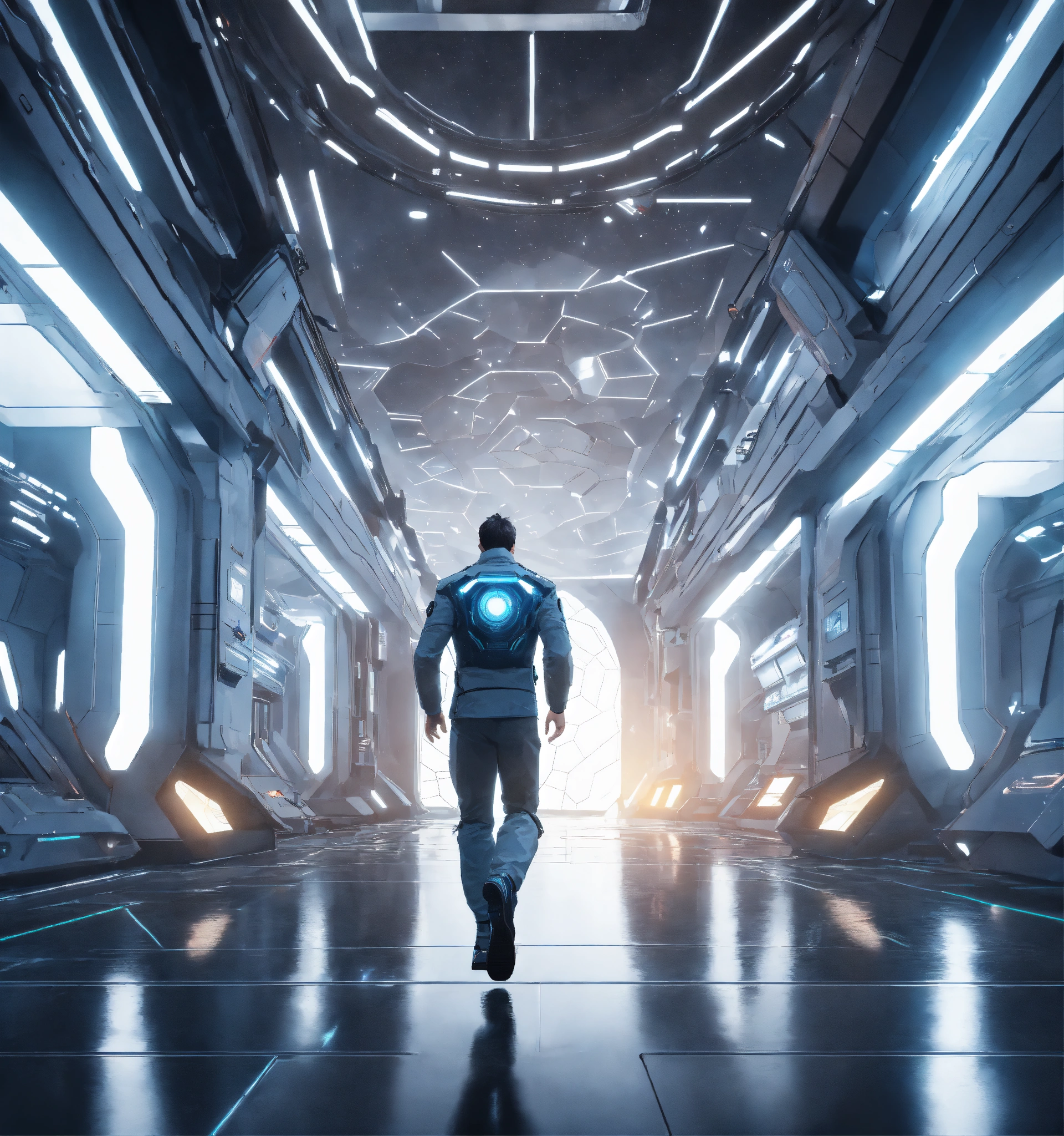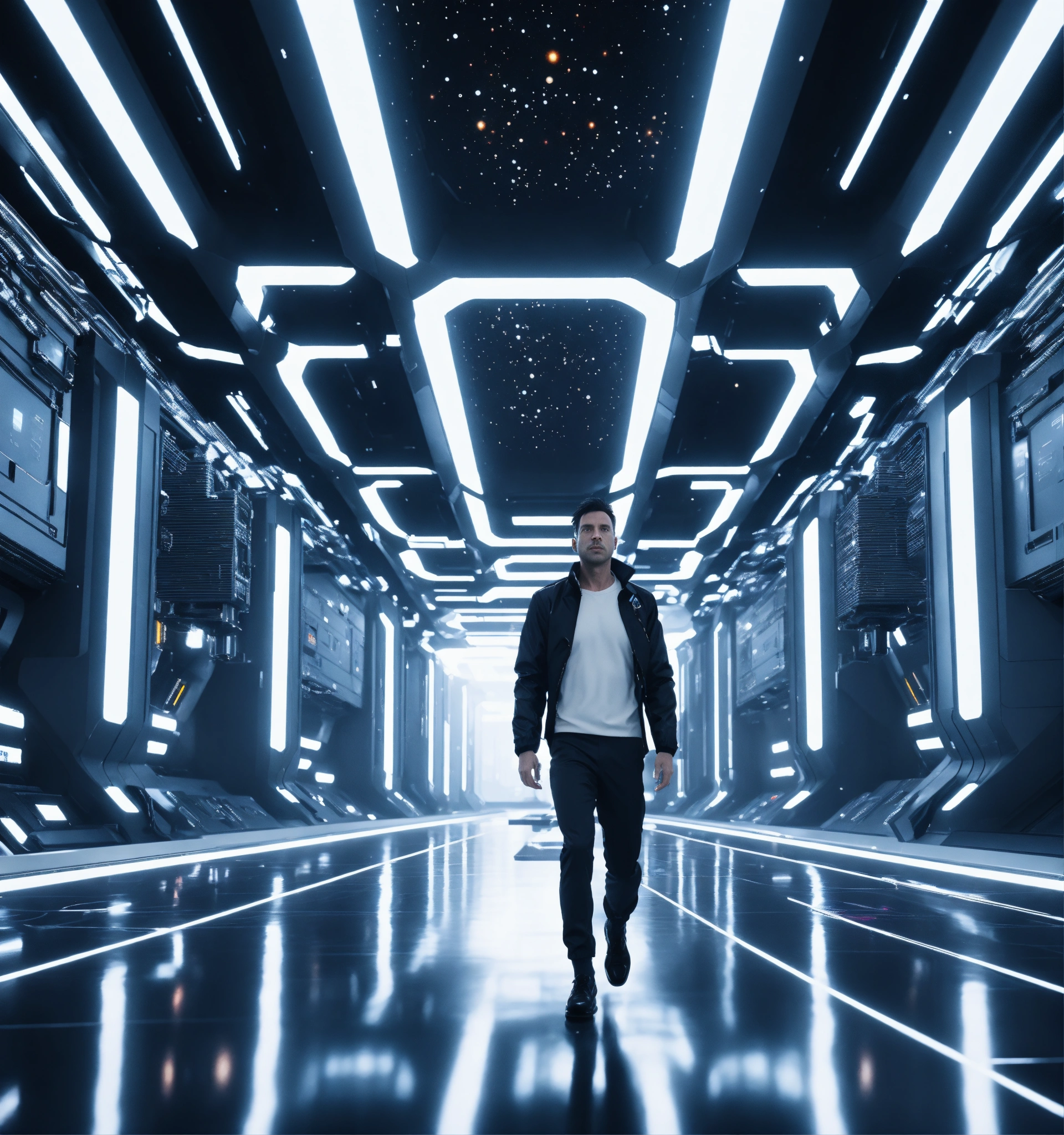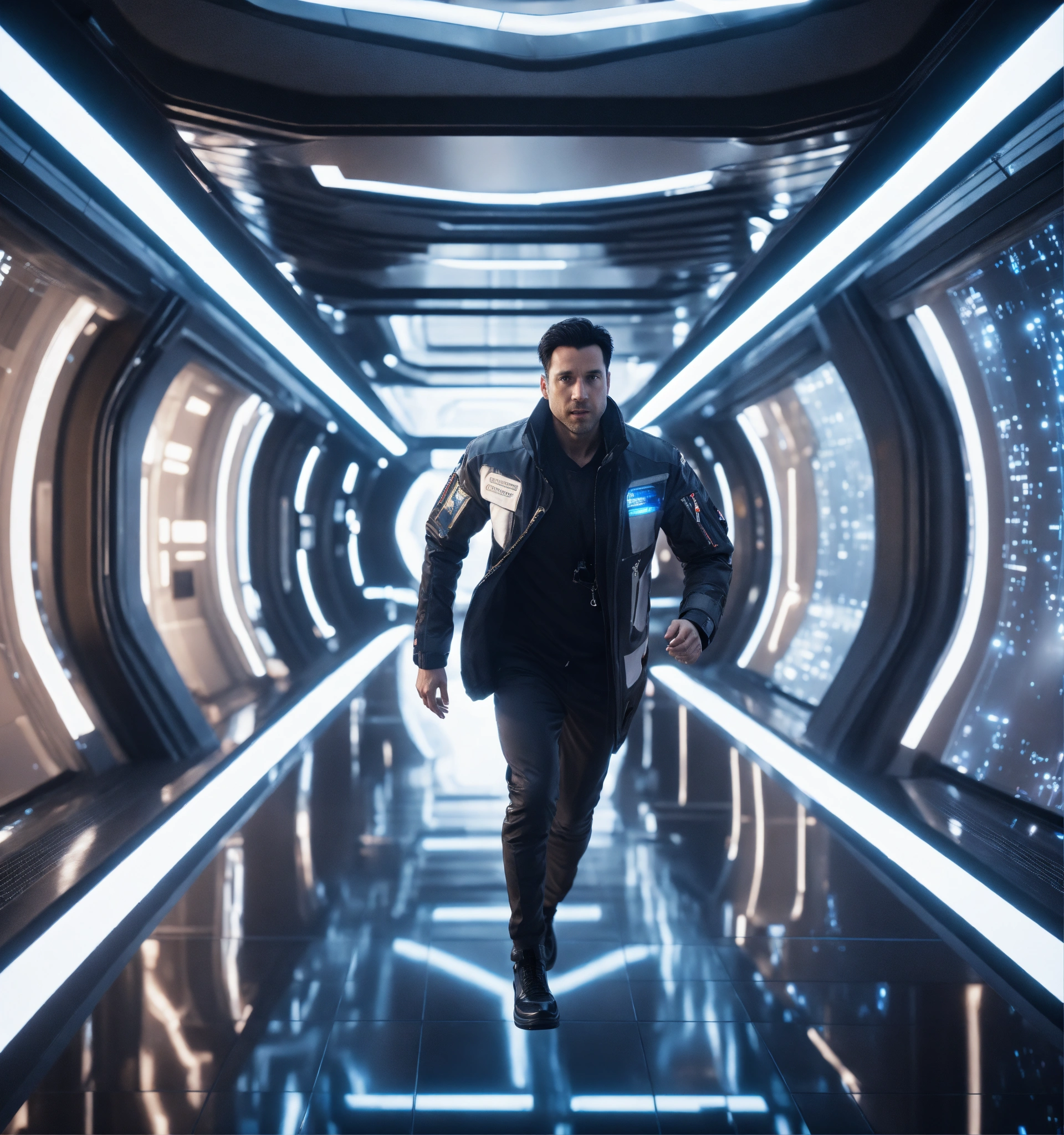 35 year old white male doctor with black hair wearing futuristic spy jacket runs through a beautiful clean white space port cosmic atrium in deep space, cosmic, realistic, futuristic, sci-fi, 8k, unreal engine, pixar, zaha hadid