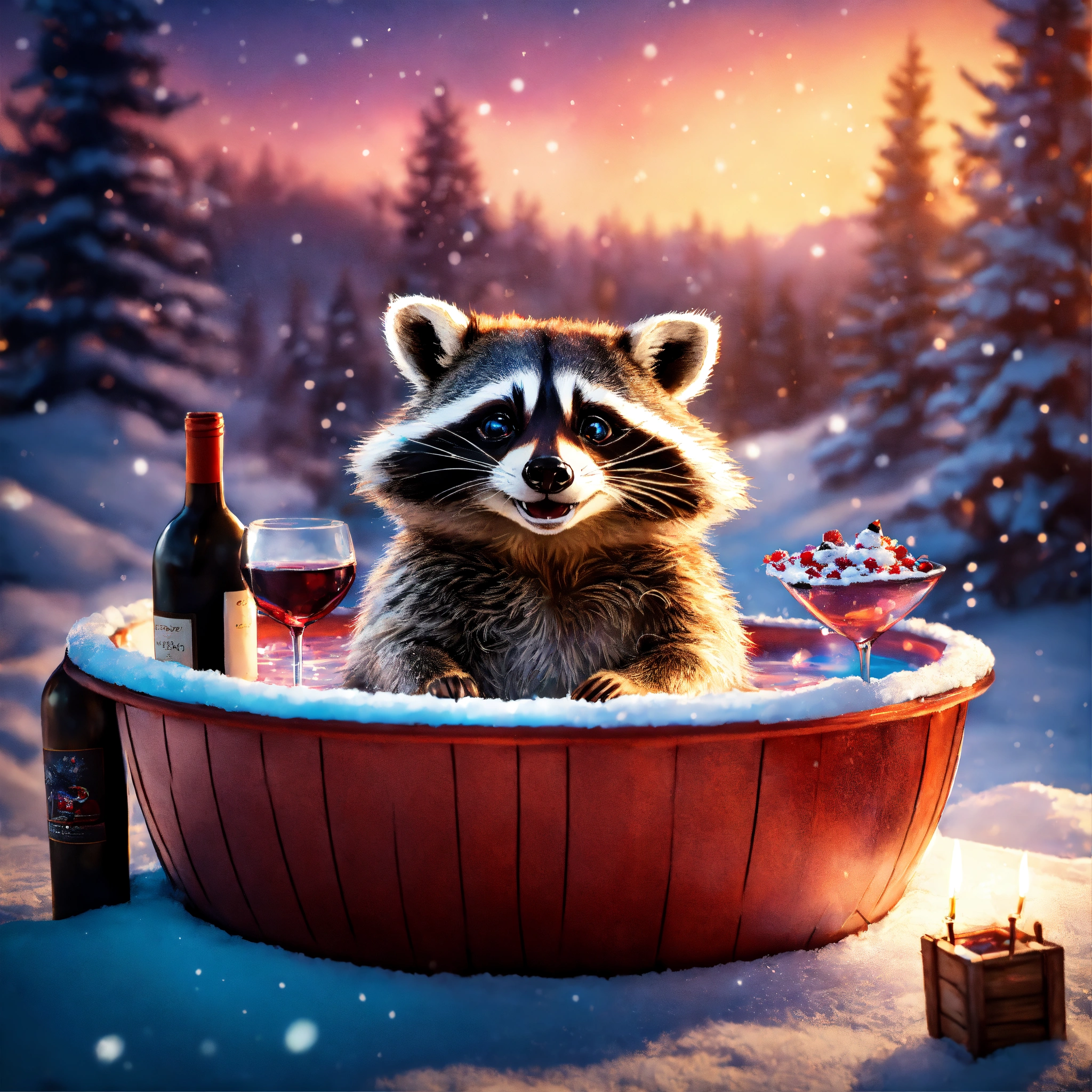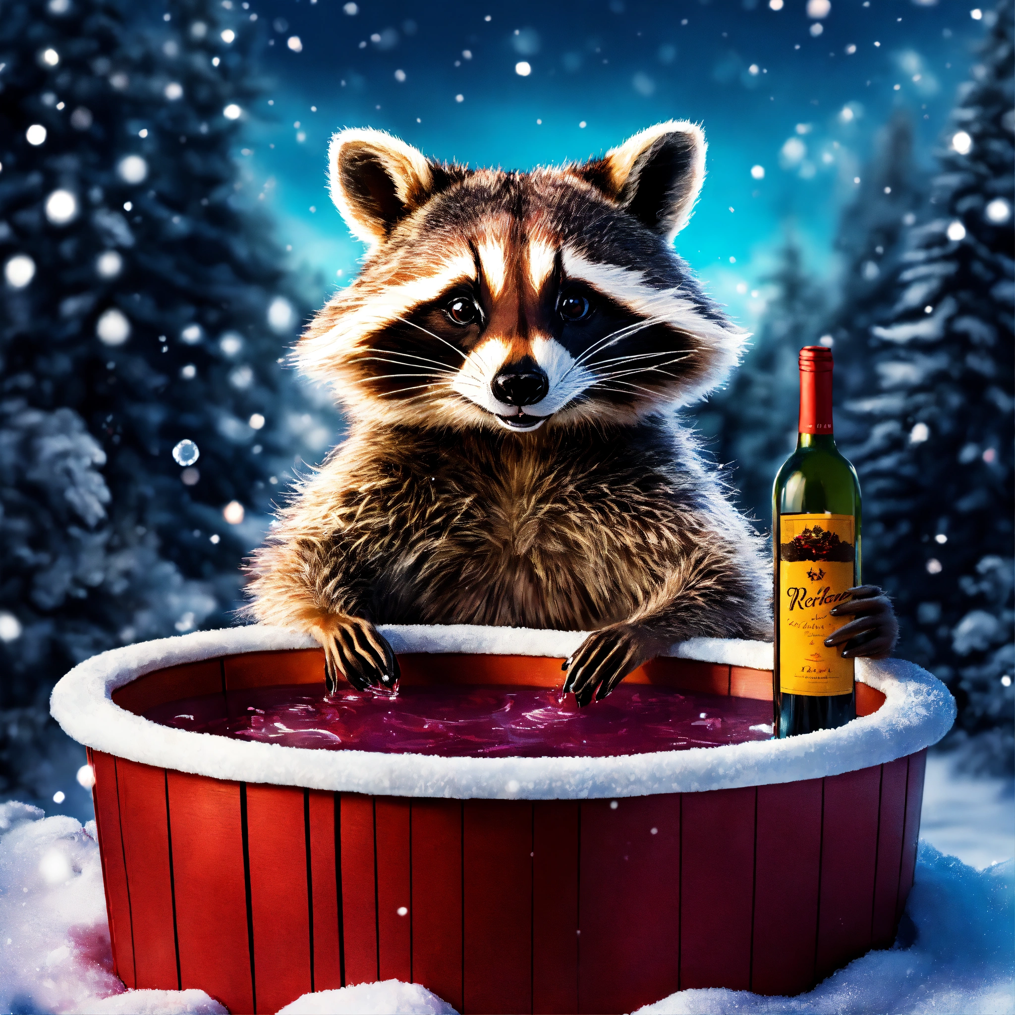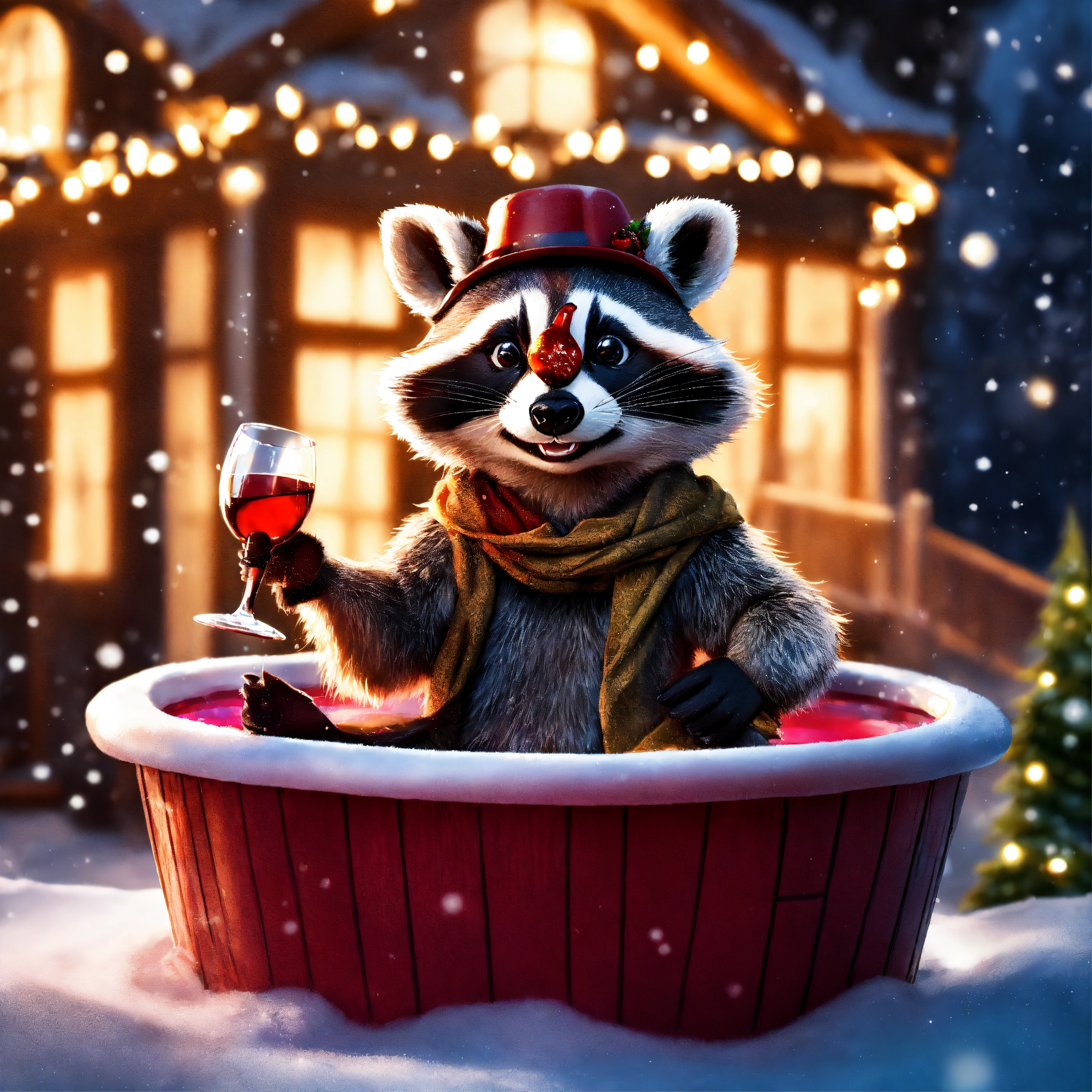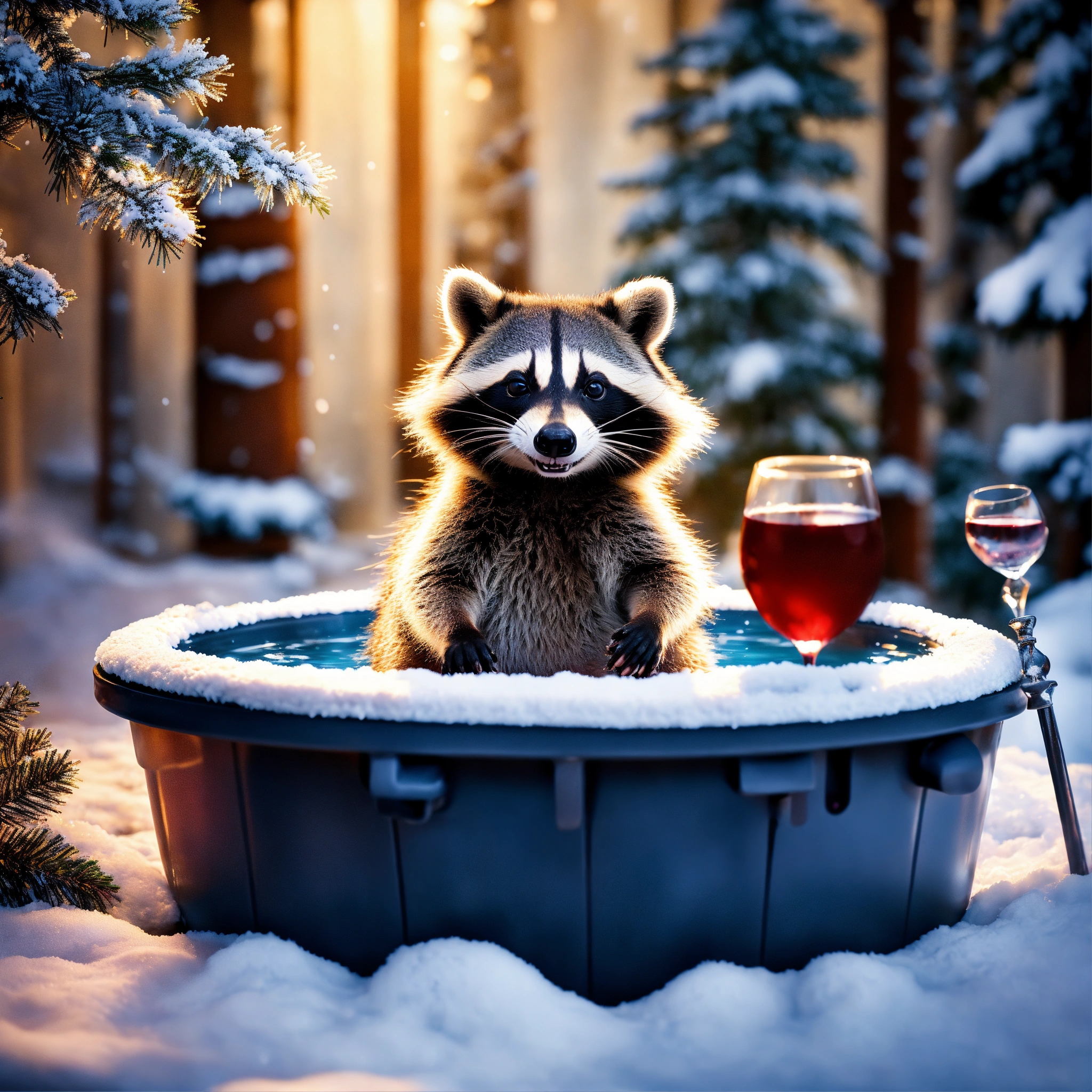 Create a photo-realistic pixar style photography image of a happy raccoon sitting in a hot tub with a glass of red wine in a winter wonderland. product photography, whimsical and playful, warm and light environment, a medium shot ultra realistic
