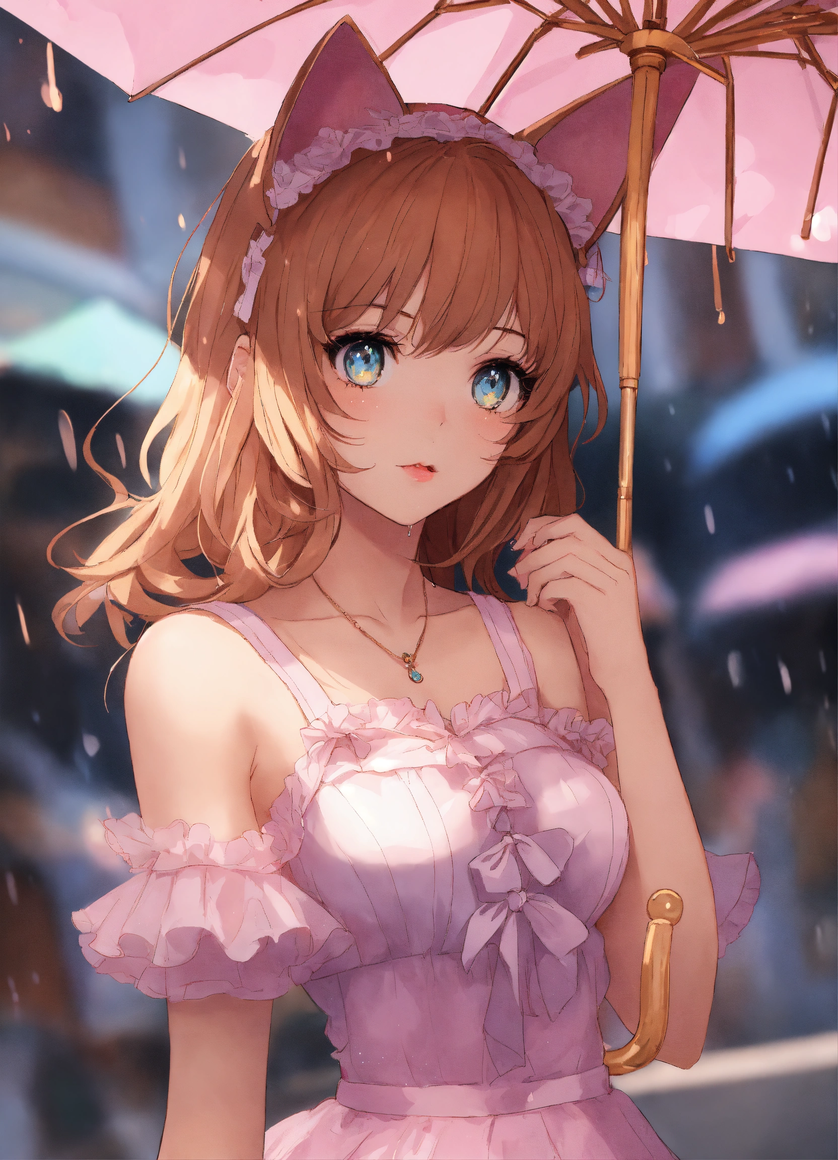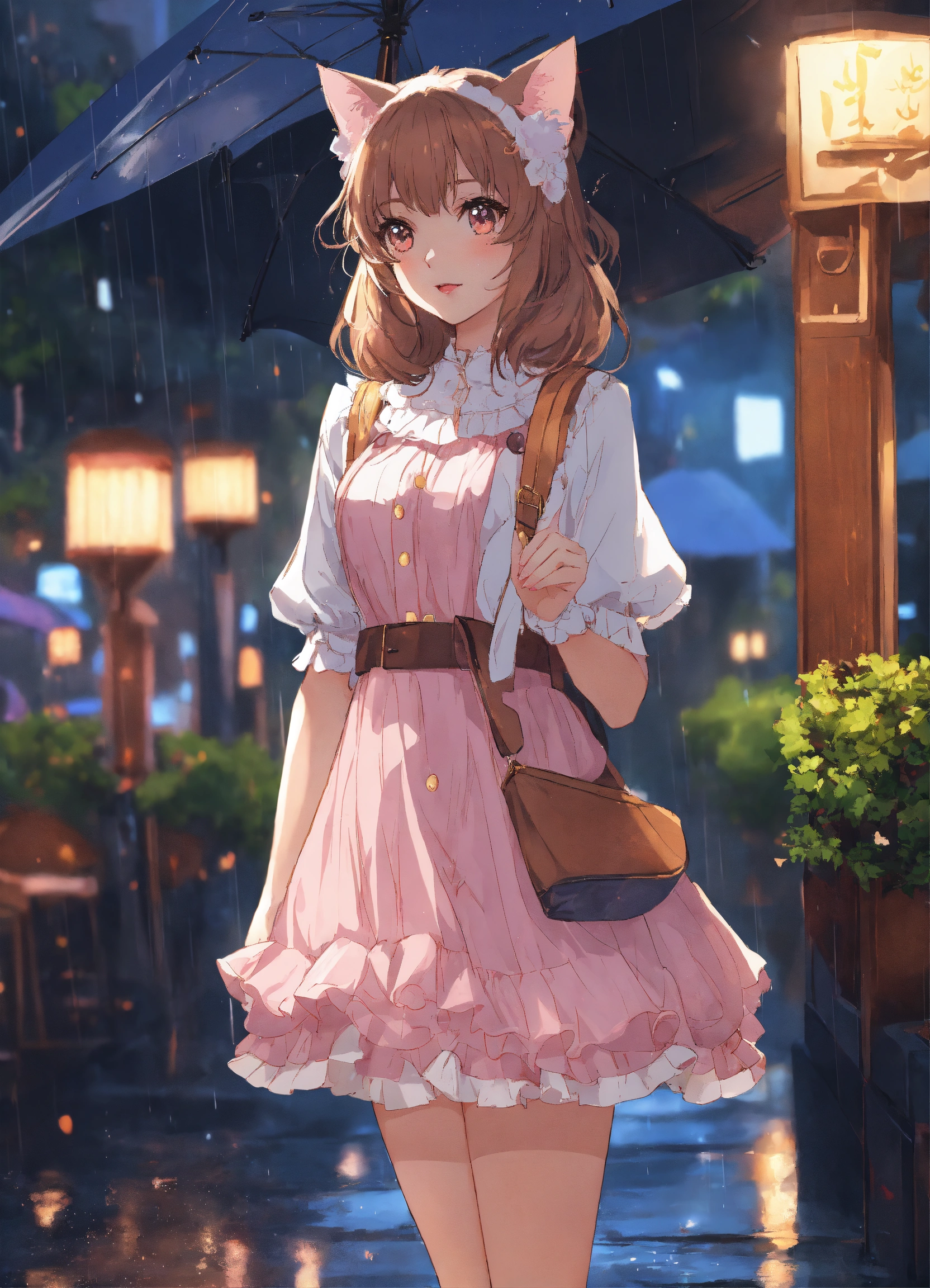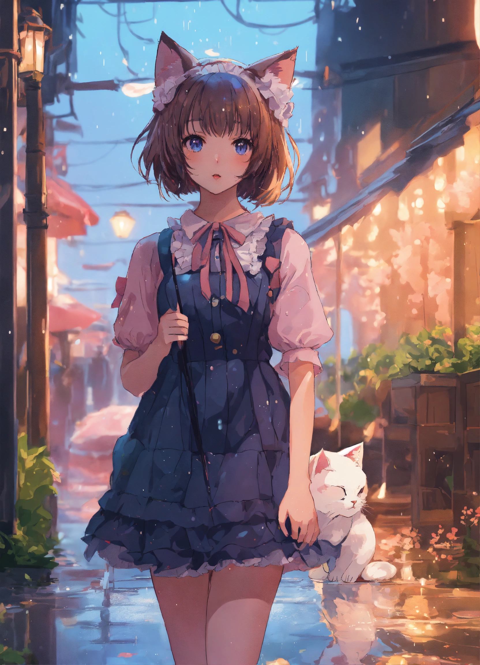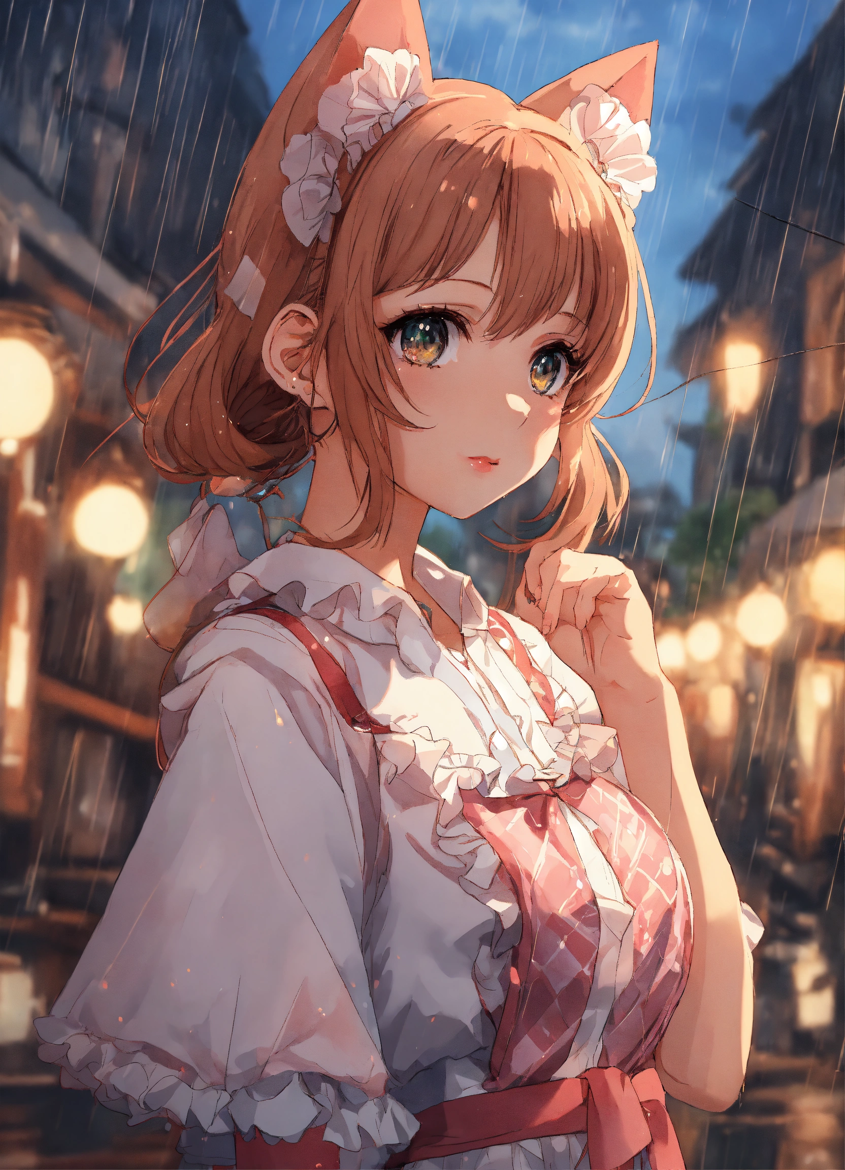 Anime art of a girl, young, beautiful, nekomimi, cat ears, frilly dress, detailed scene, stunning details, trending on artstation, rainy day, ray-traced environment, vintage 90's anime artwork.