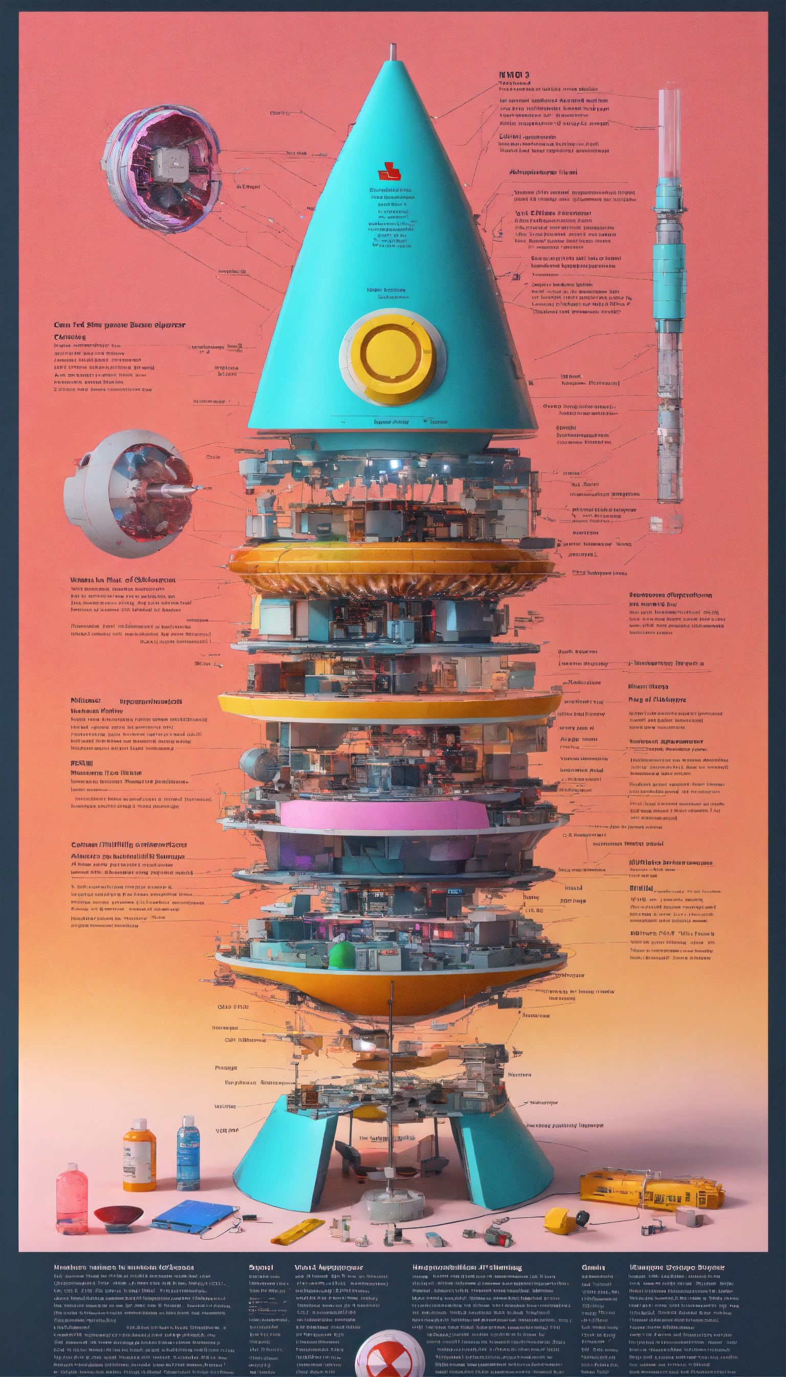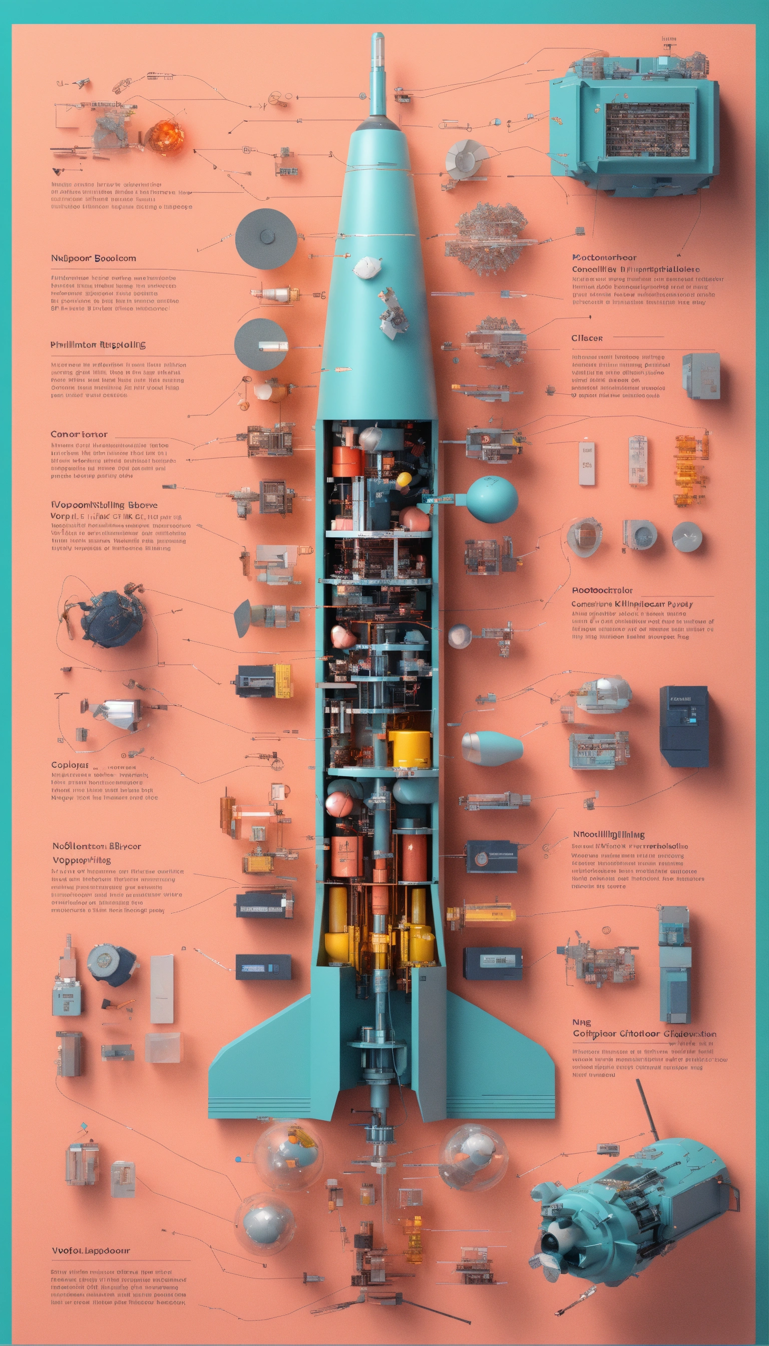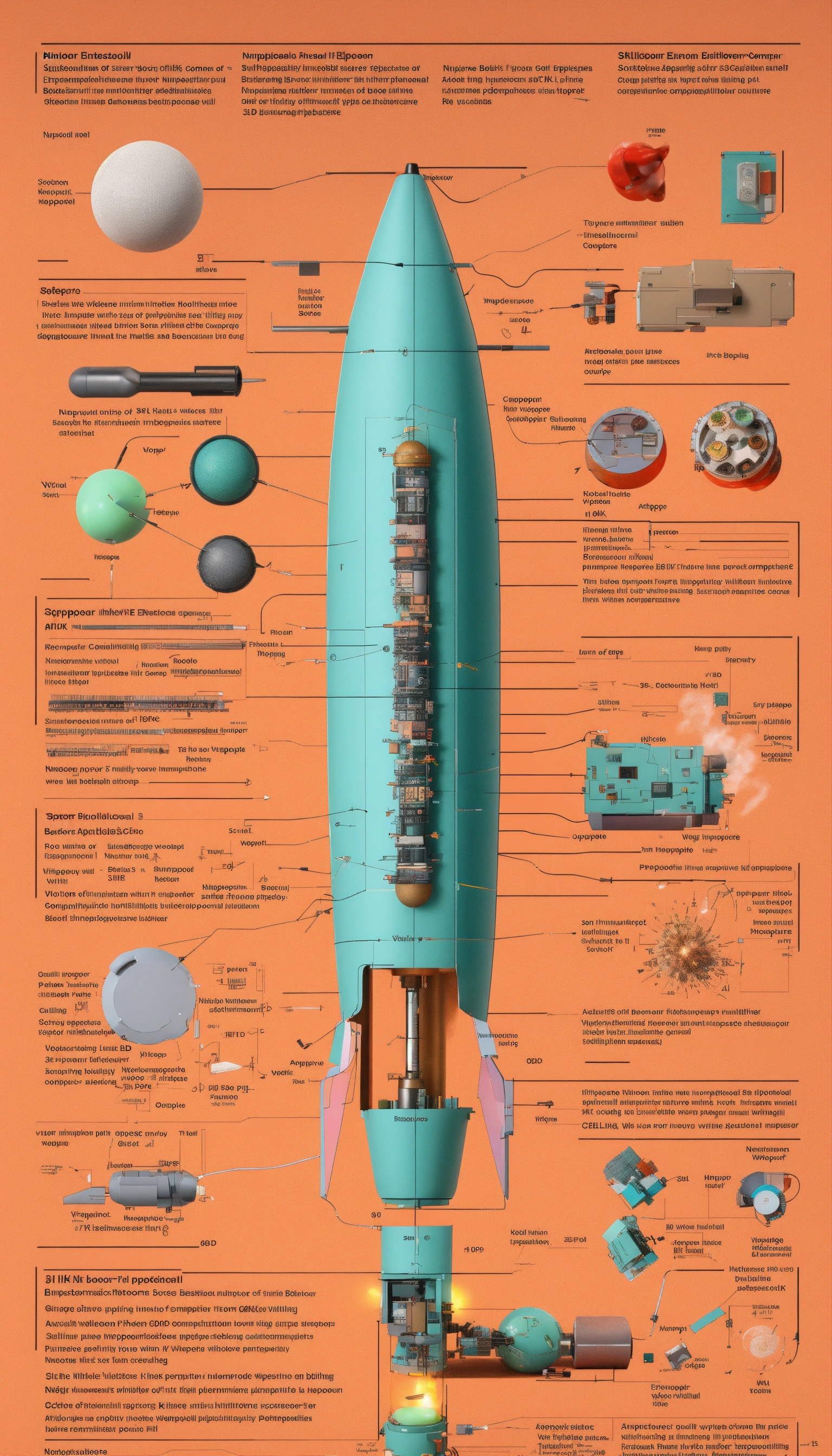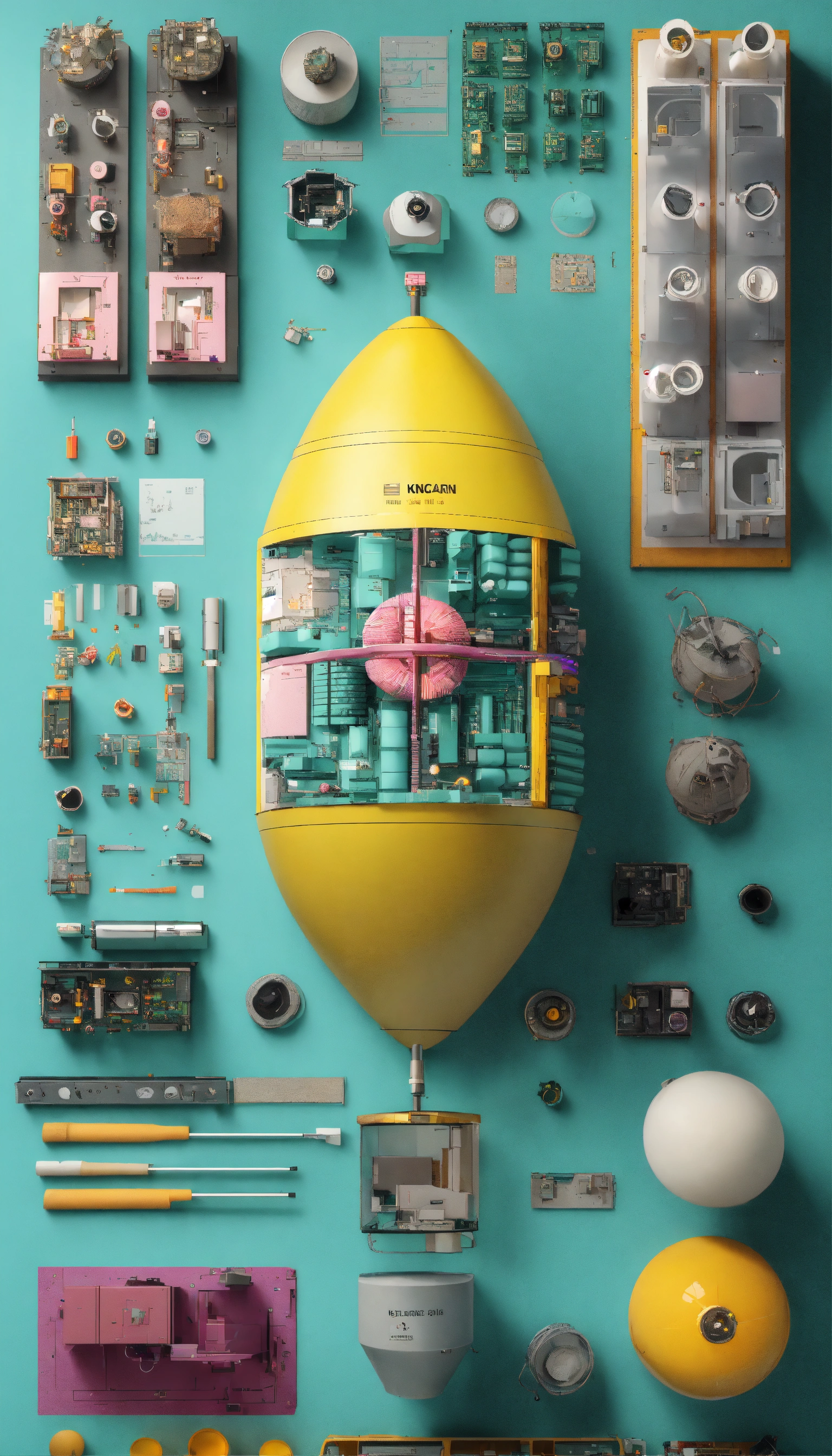 An exploded view diagram of the components of a nuclear bomb, knolling layout, 8k, photorealistic 3d with vaporwave colours