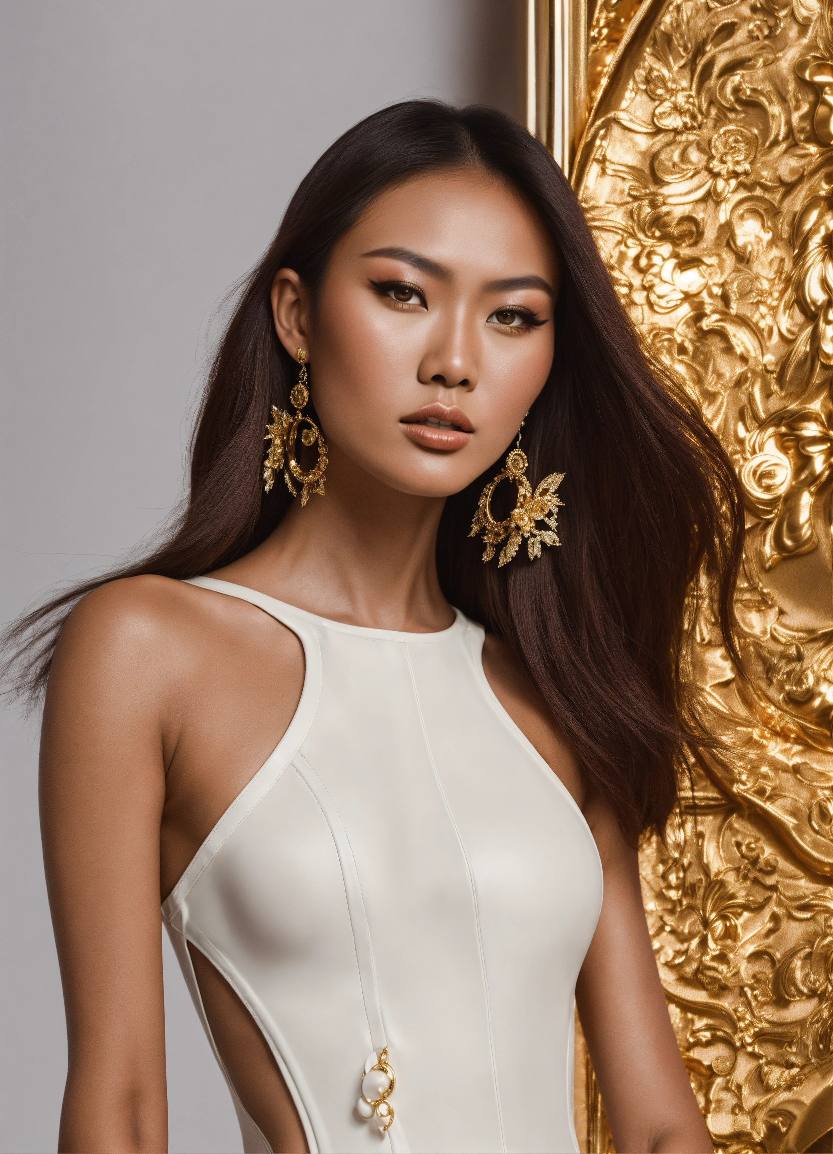 Create a visually stunning versace inspired photoshoot featuring a tanned asia supermodel wearing basic white mini dress iso 400, surrealistic, 8k, full frame, white studio background