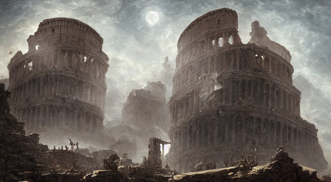 Gigantic extraterrestrial futuristic alien ship landed on the kingdom of julius caesar, roman historic works in brand new condition, not ruins, hyper-detailed, artstation trending, world renowned artists, historic artworks society, antique renewel, good contrast, realistic color, cgsociety, by greg rutkowski, gustave dore, deviantart