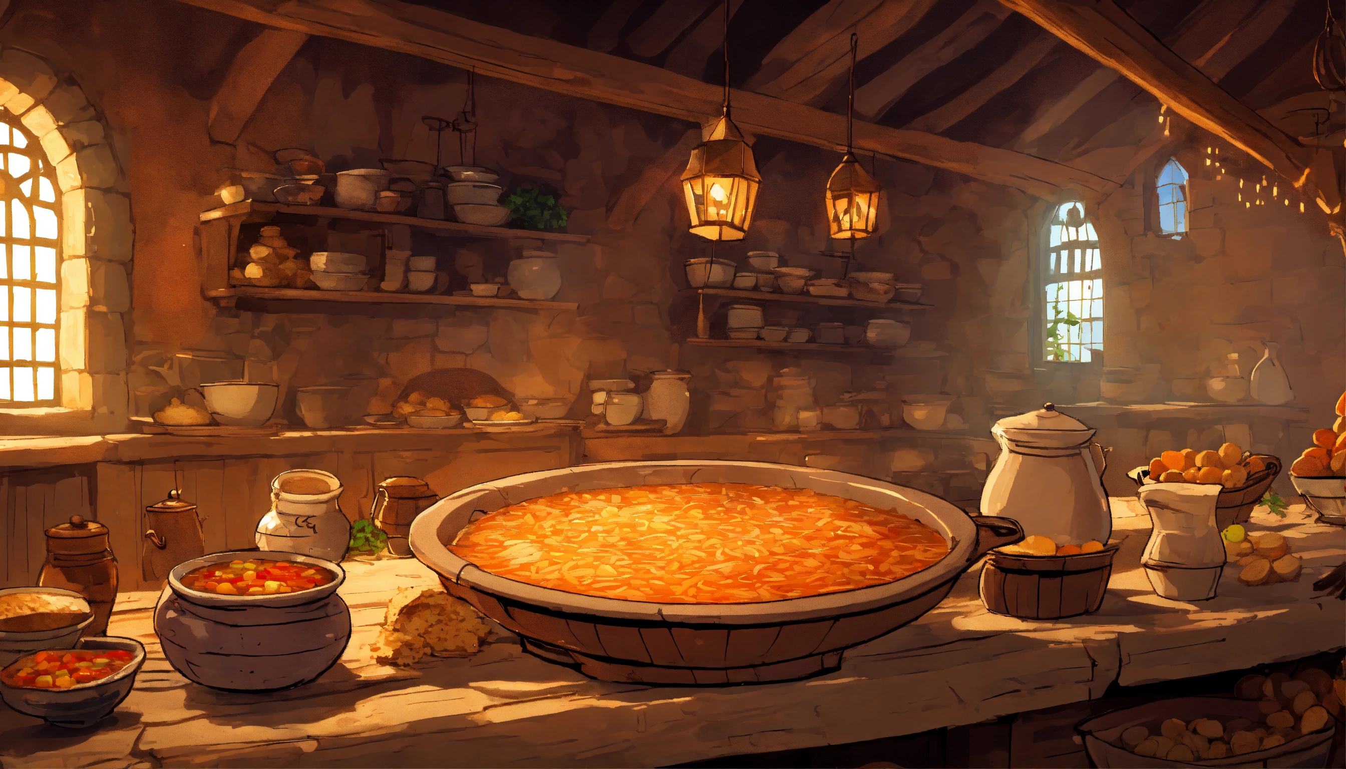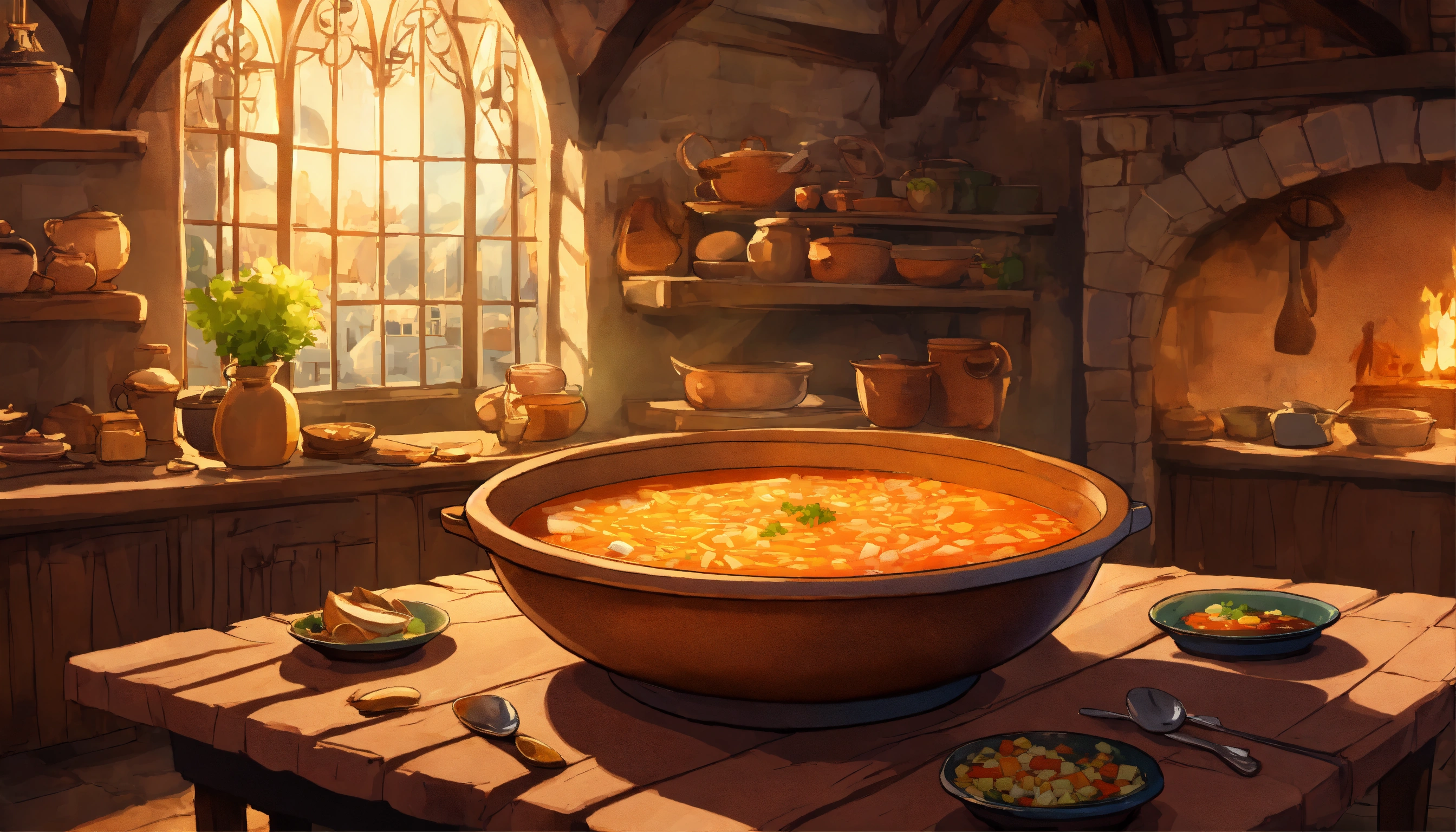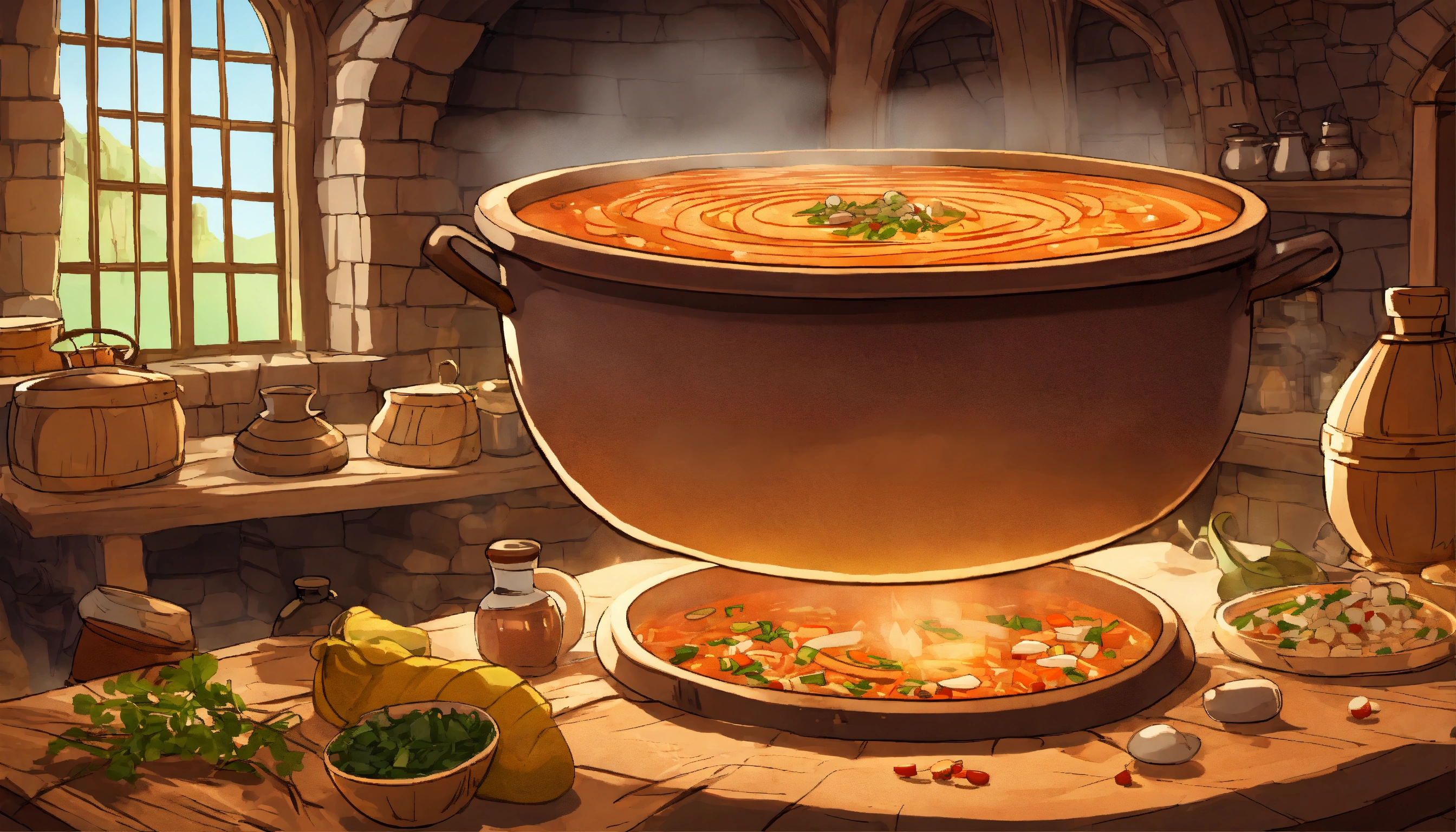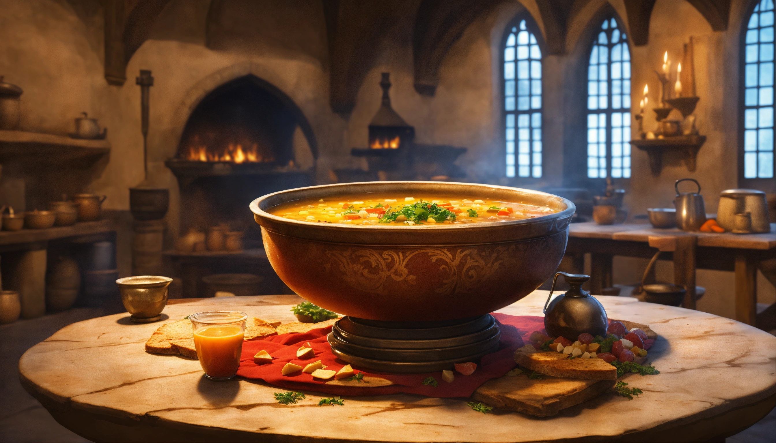 A cartoon-style huge bowl of soup in the medieval kitchen is standing on a big table