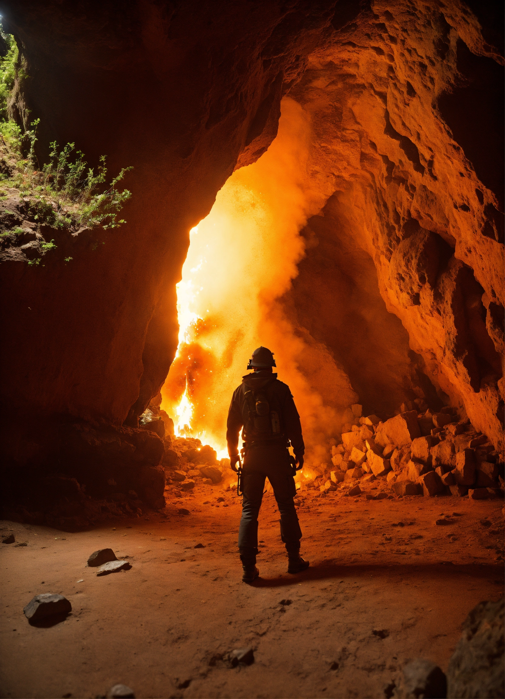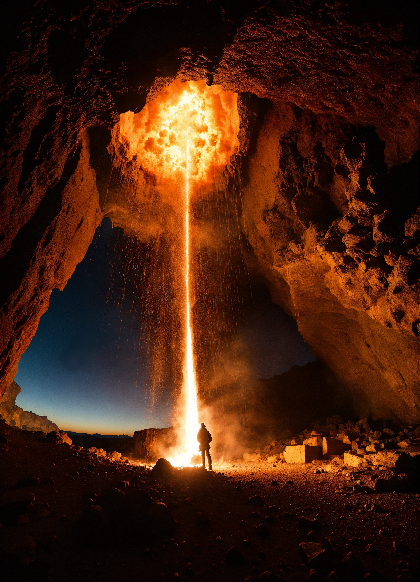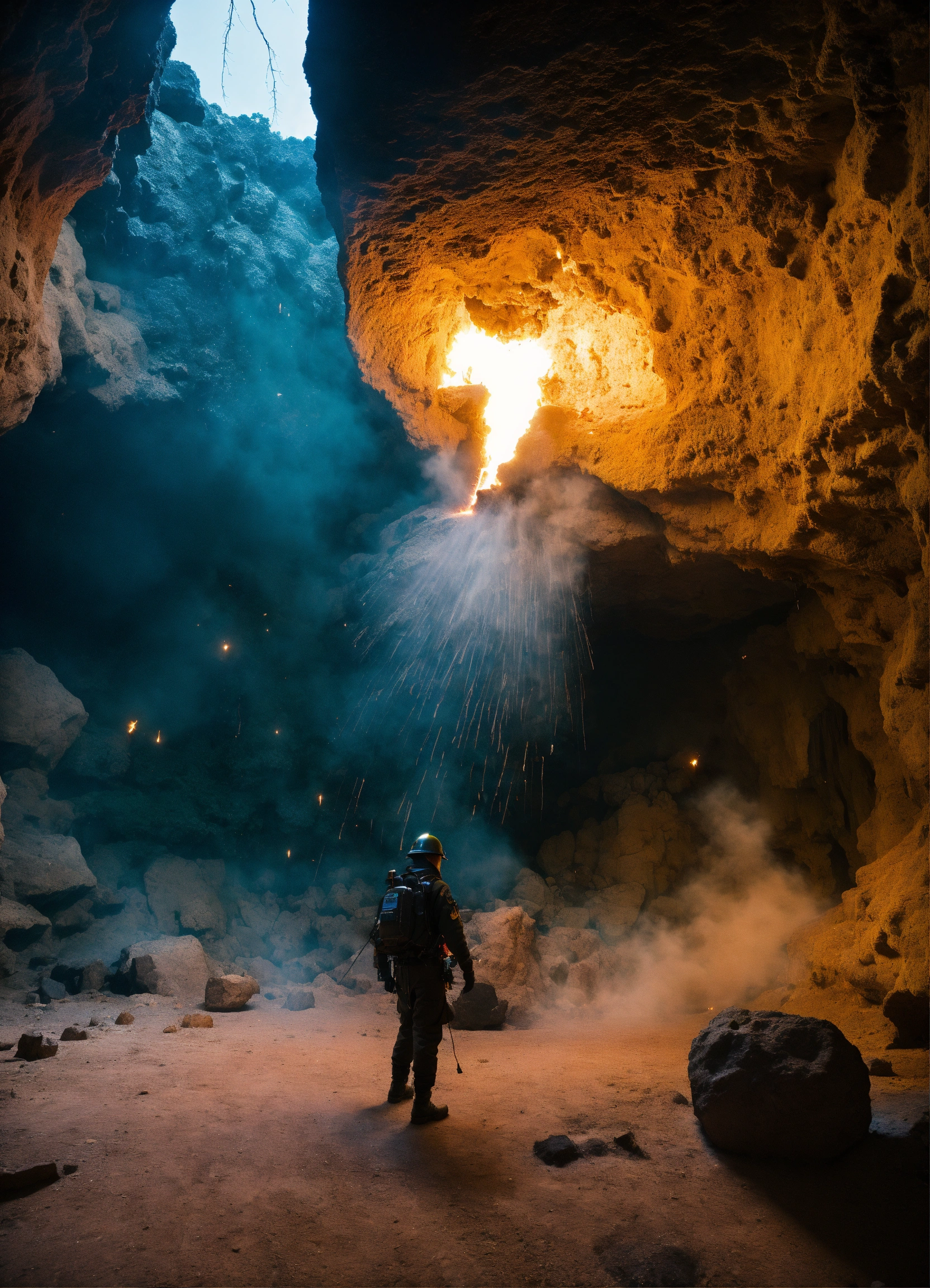 Wide angle environmental shot of explosion in a cave