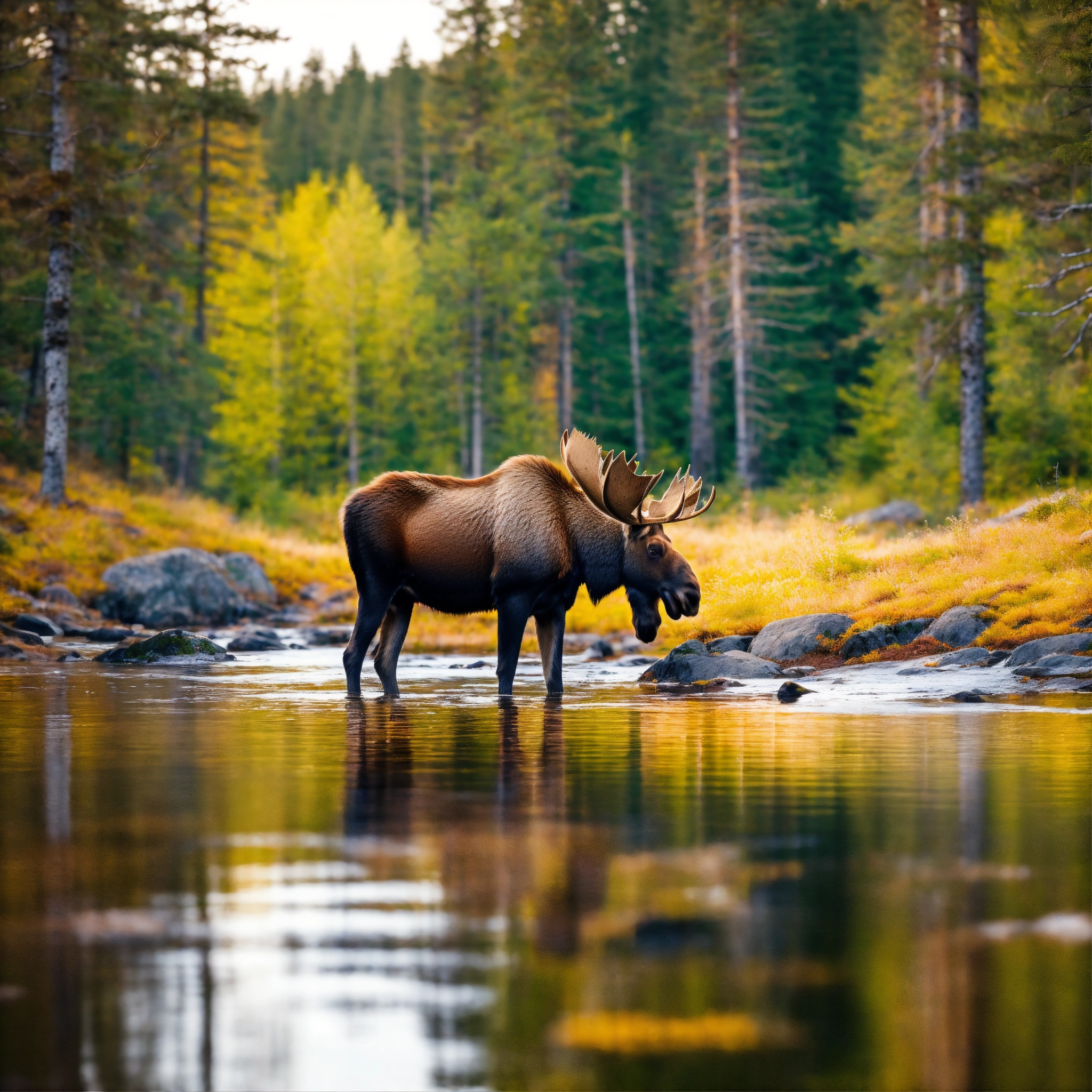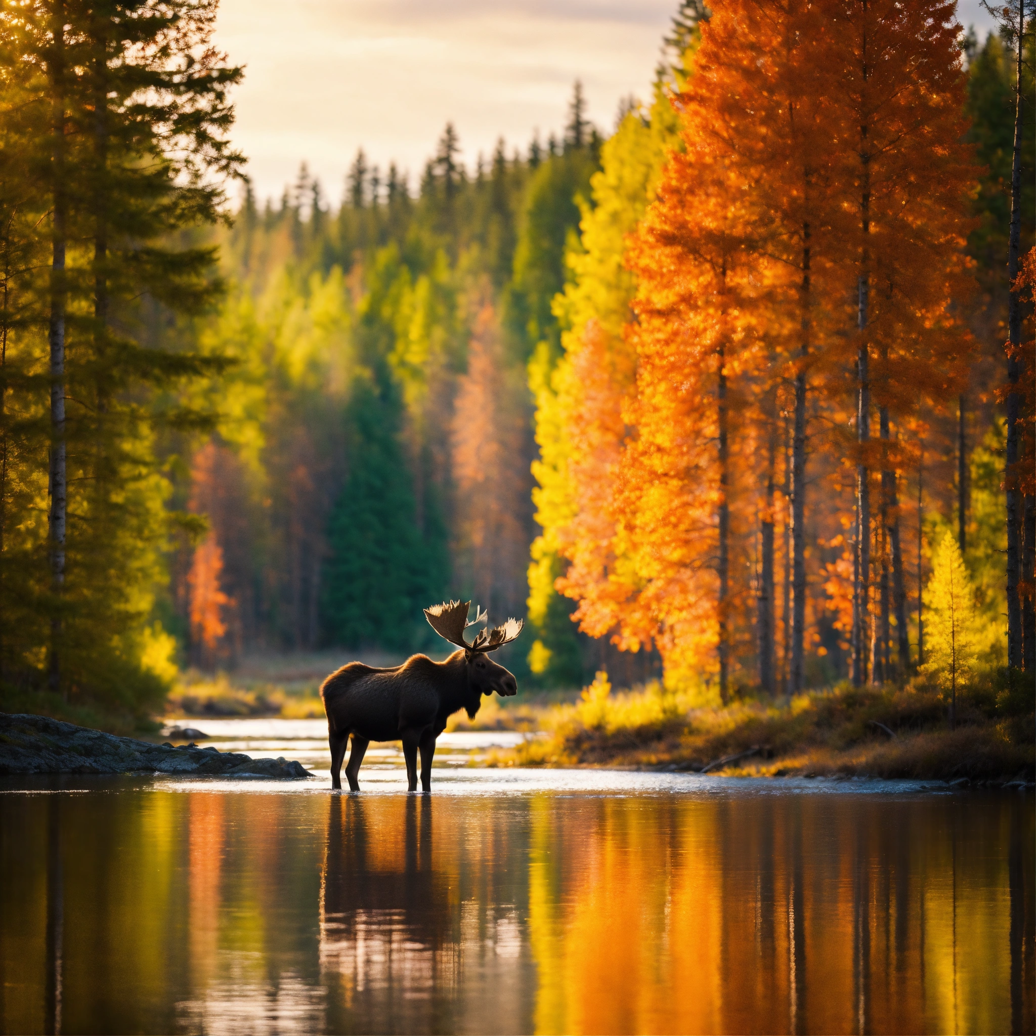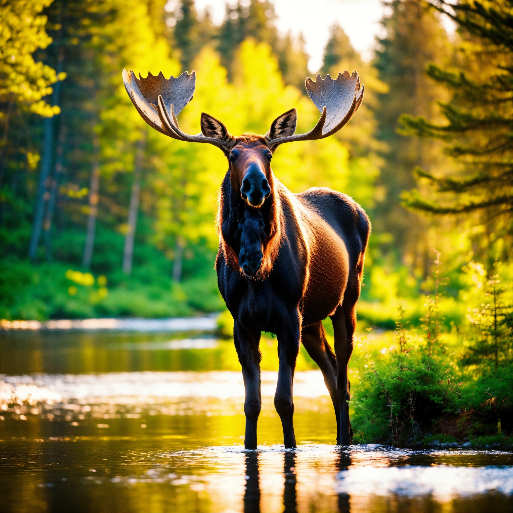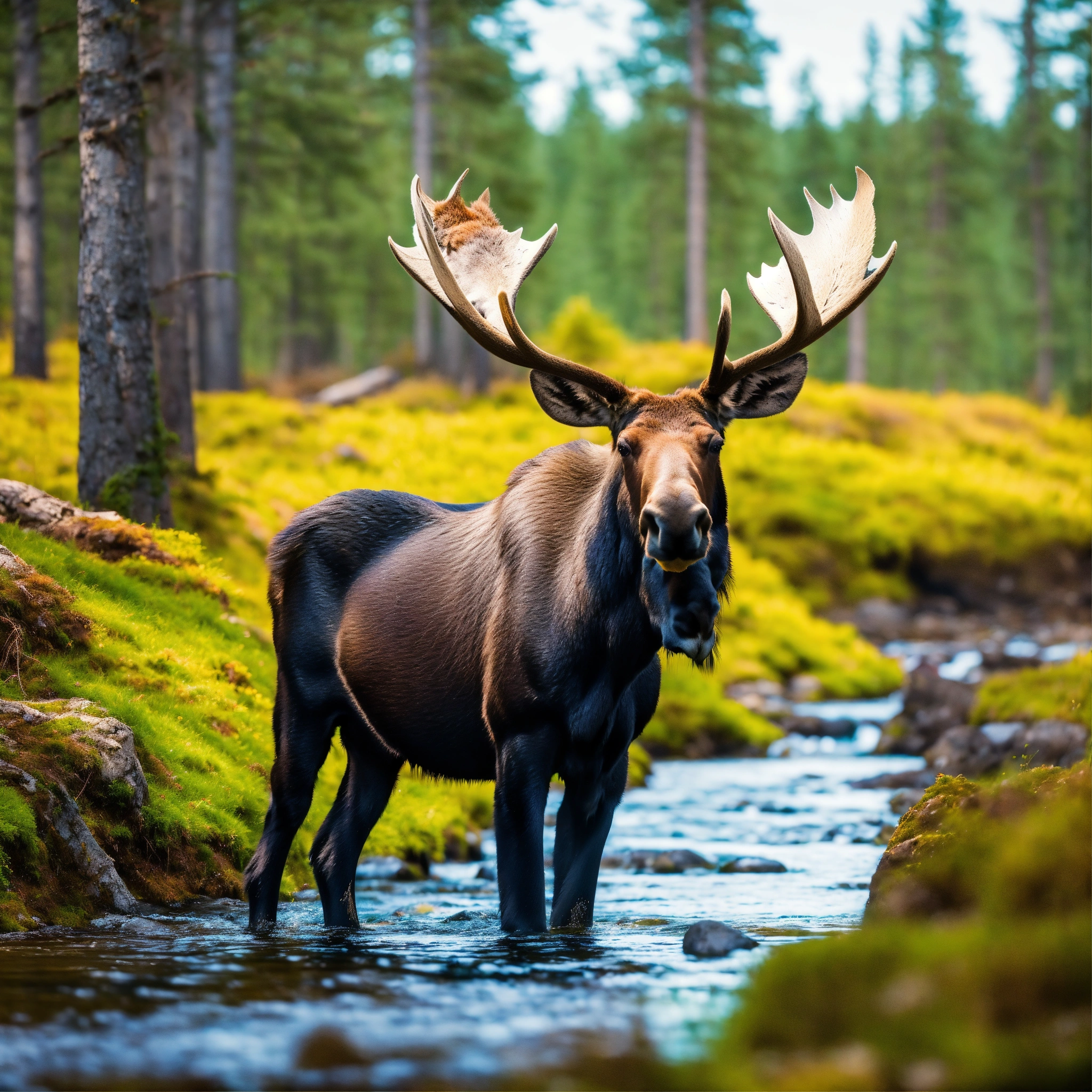 Soo sweet moose in the sweden forest near a small river, colorful scene, 8k, highest resolution, perfect view