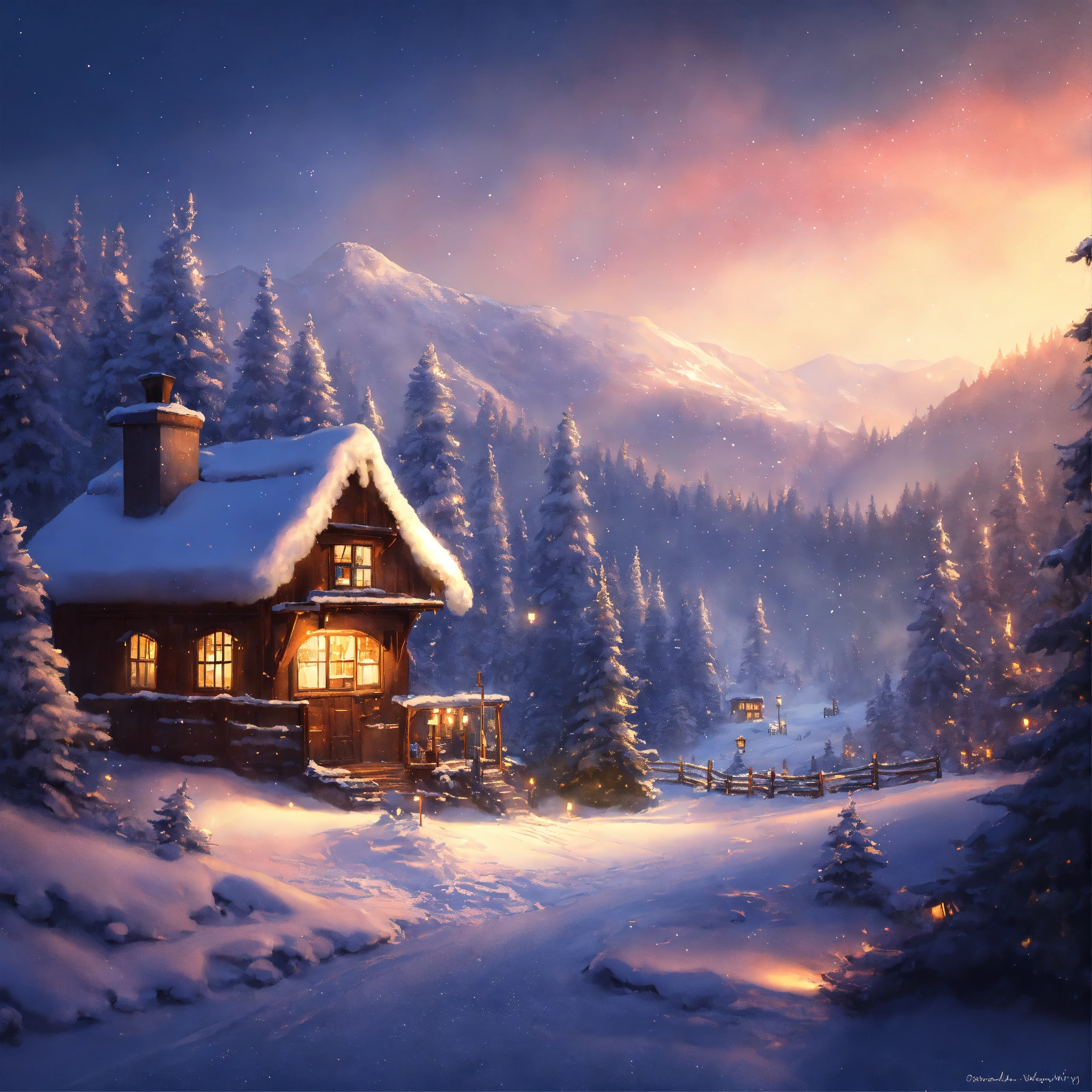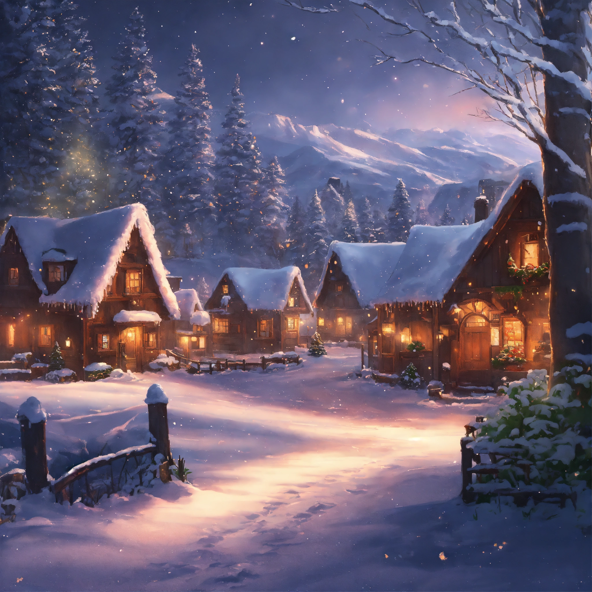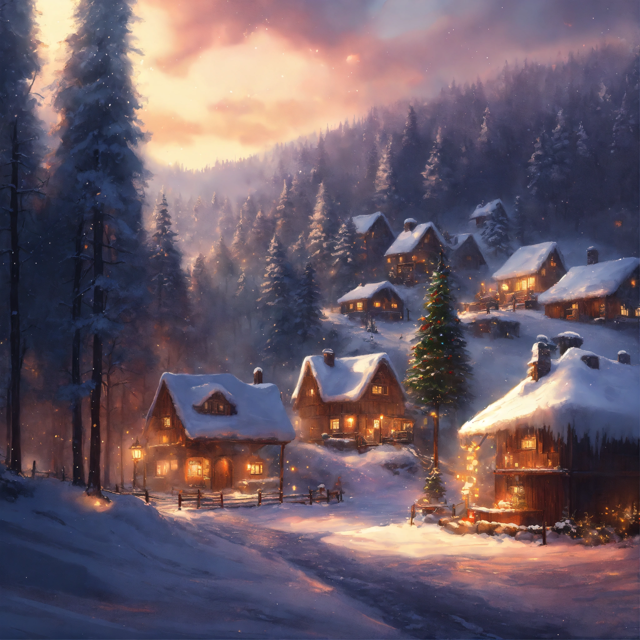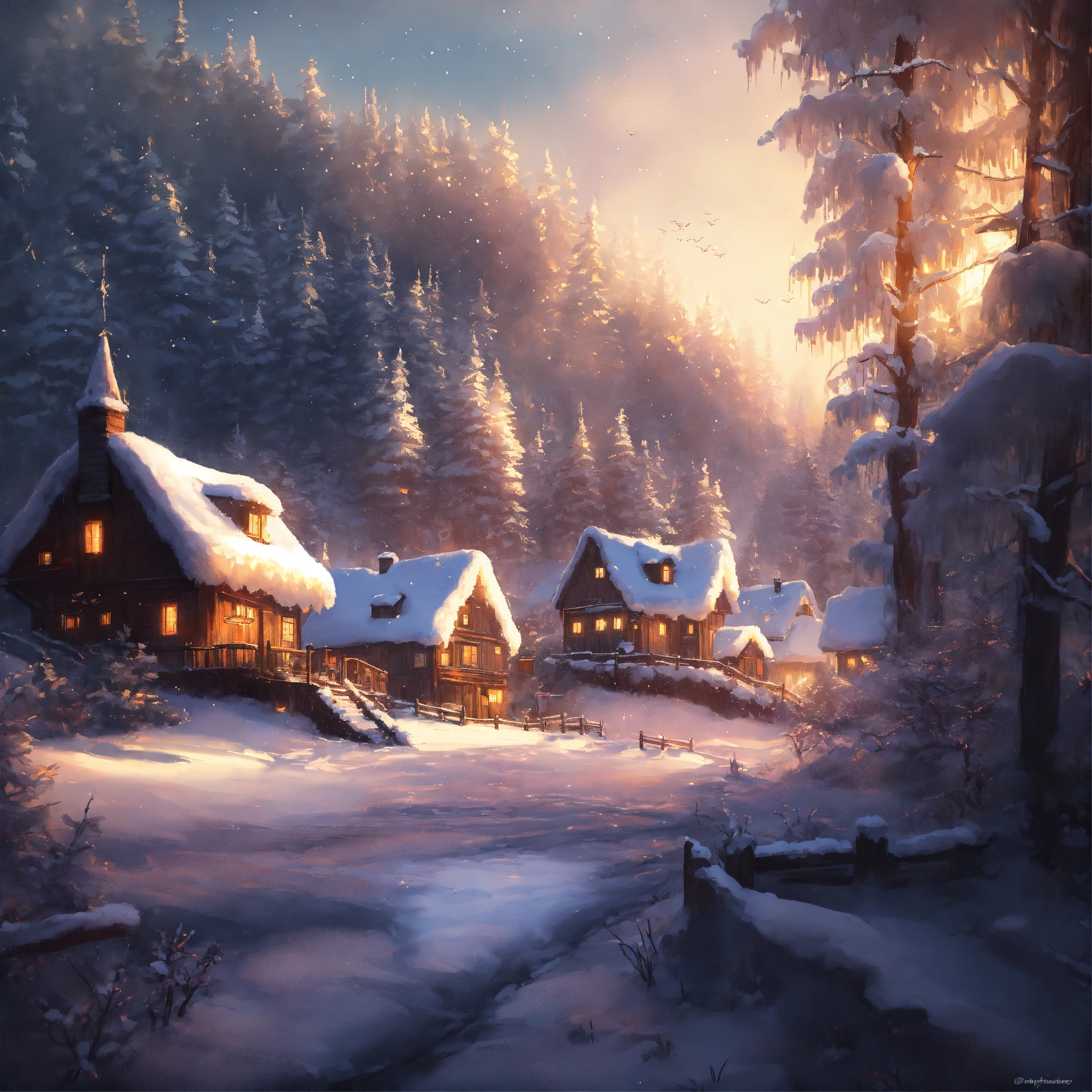 Epic shot of a ultra cozy winter forest of wishes, small village, winterwonderland, digital painting, little photorealistic, sharp focus, ultra cozy and inviting, wish to be there. very detailed, arty, should rank high on youtube for a dream trip.