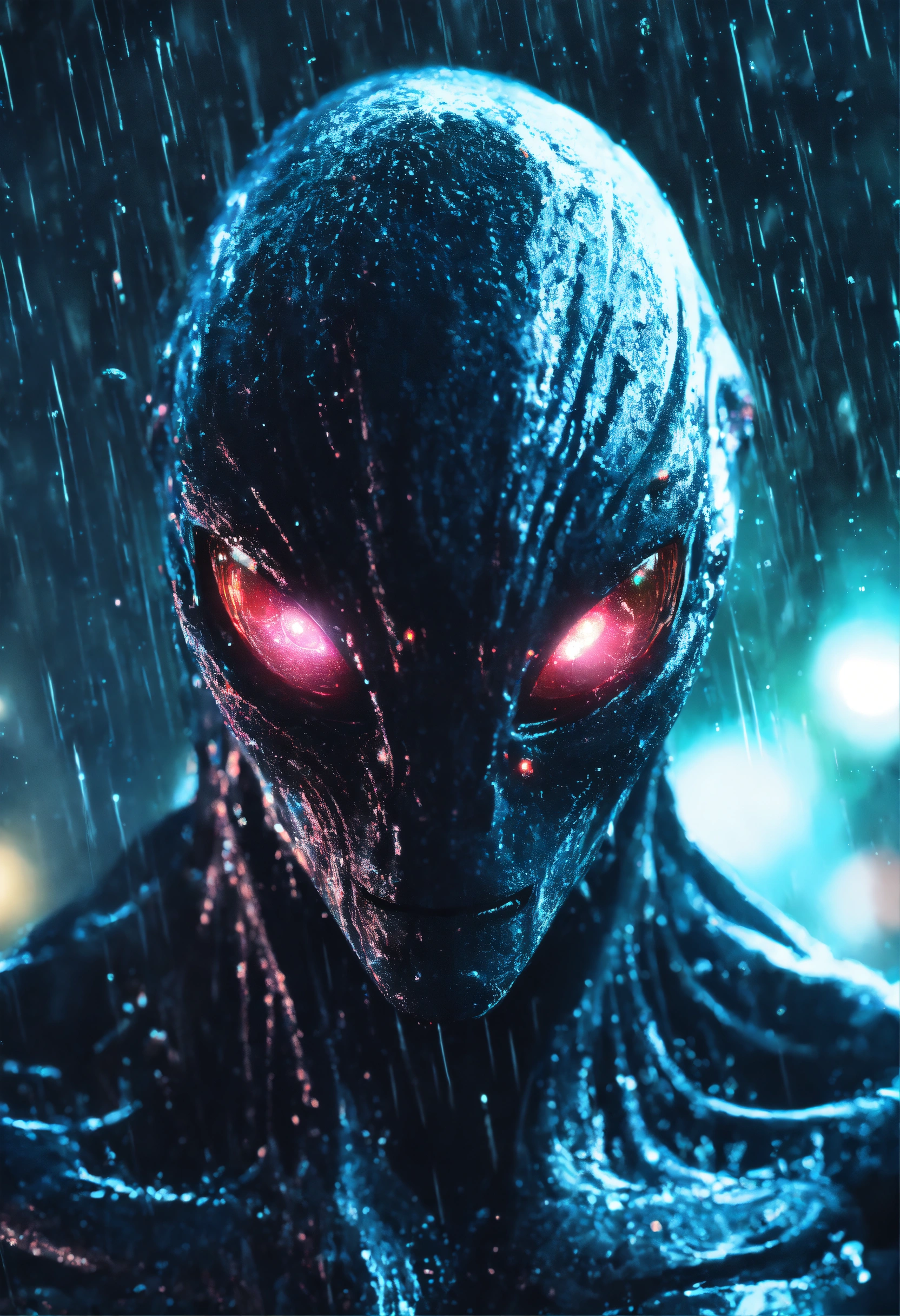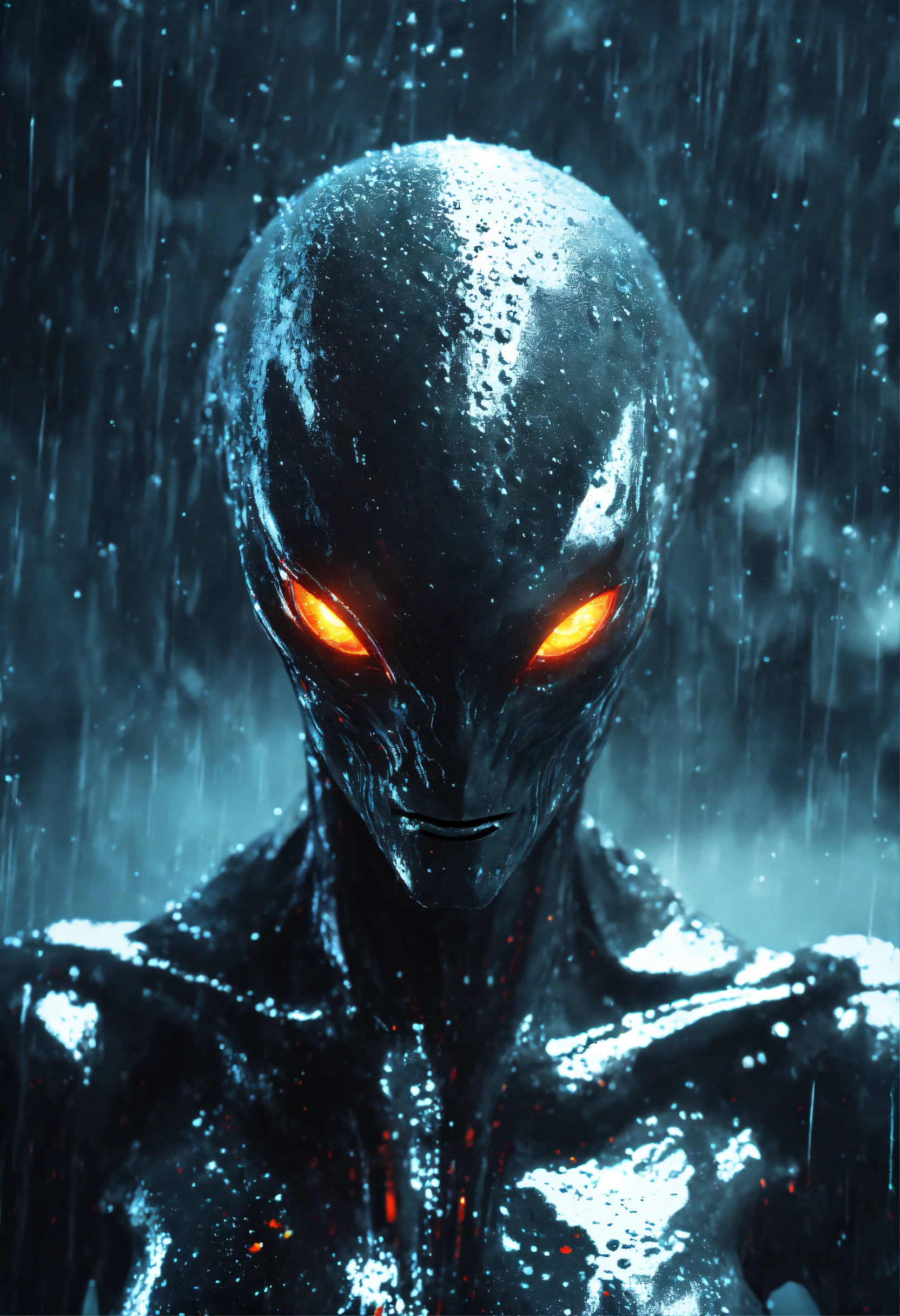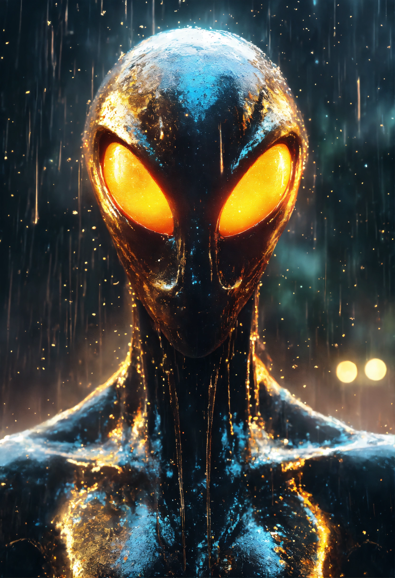 An menacing alien with glowing eyes, in the pouring rain, in the style of translucent liquid metal, filled with swirling galaxies, ray tracing, raw character, 32k uhd, conceptual portraiture, wet - on - wet blending