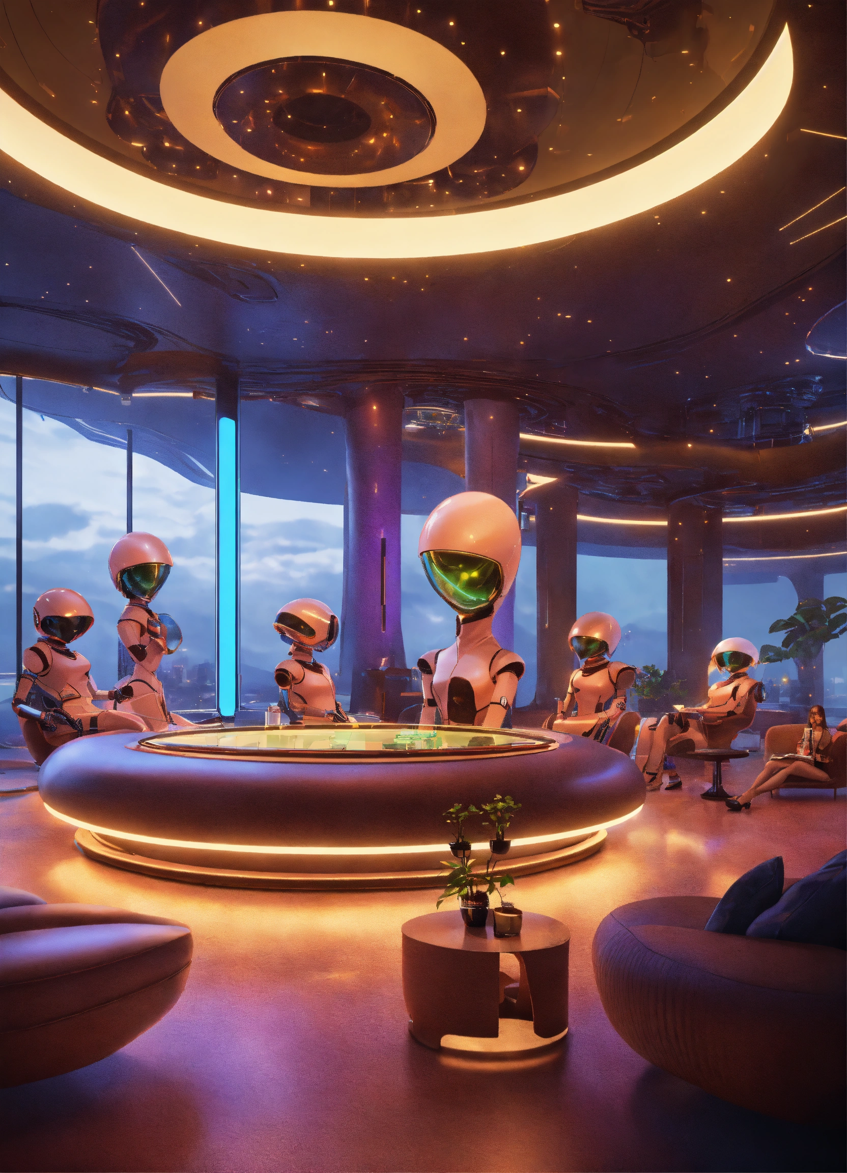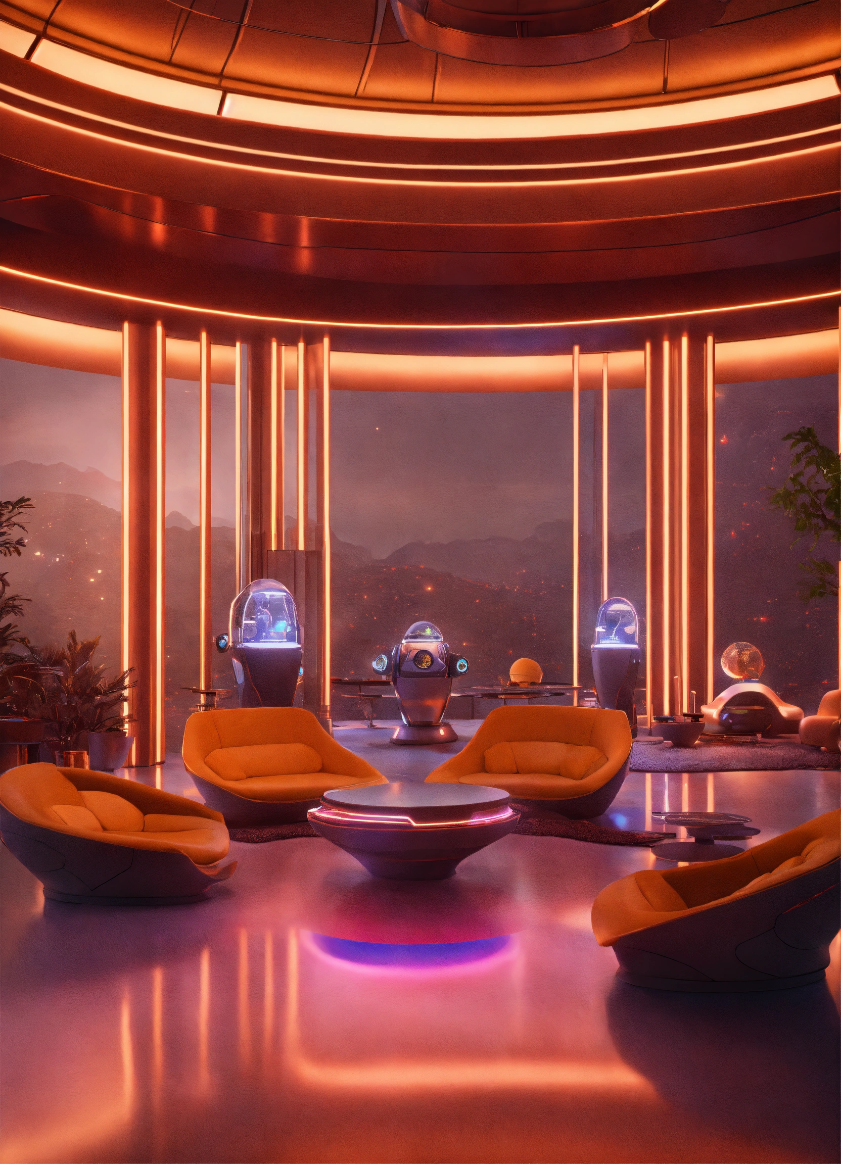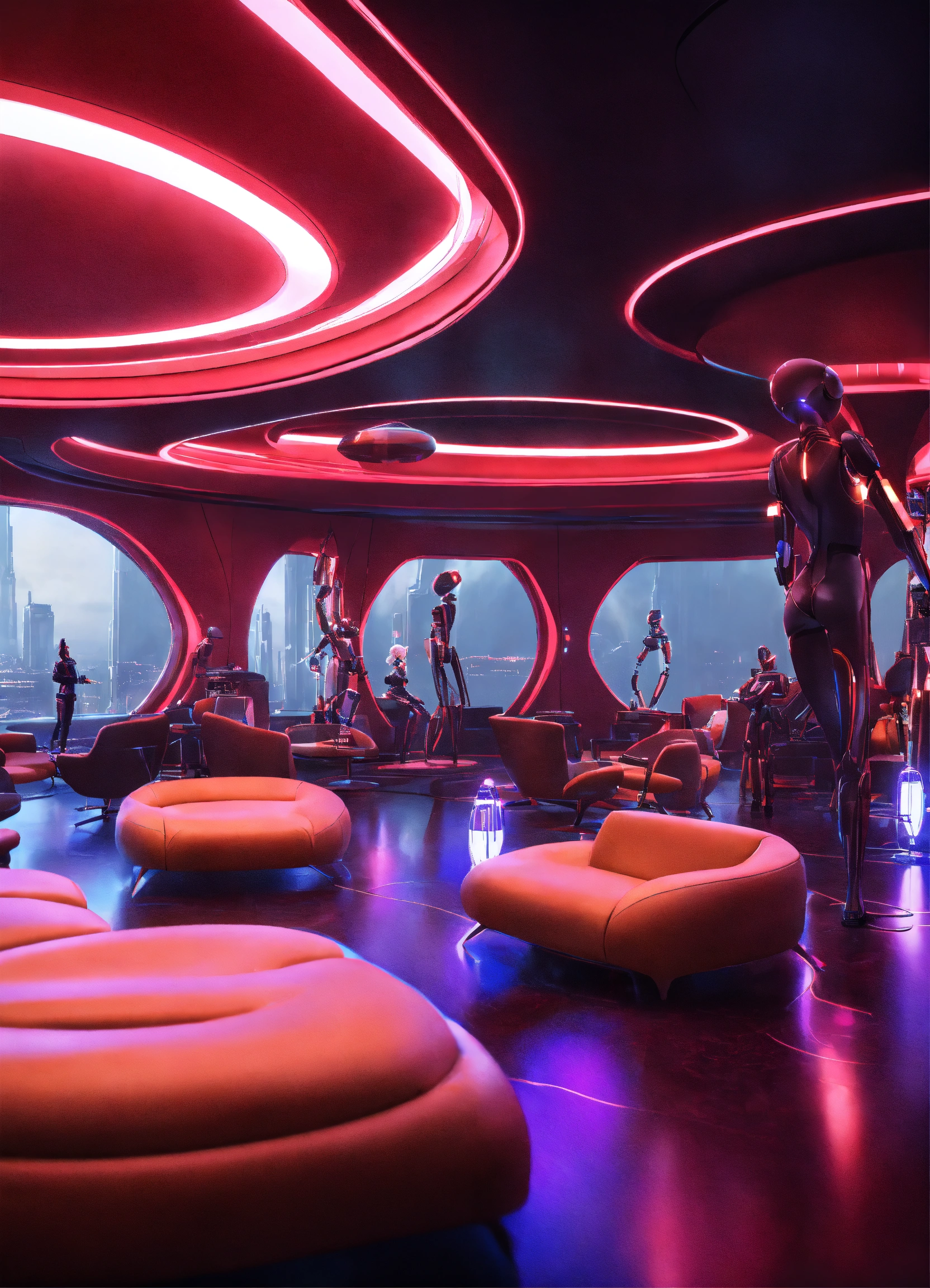 Lounge with band of alien robots playing hypnotize a crowd in a luxury space port lounge reception area, realistic, futuristic, sci-fi, 8k, unreal engine, pixar, disney, zaha hadid
