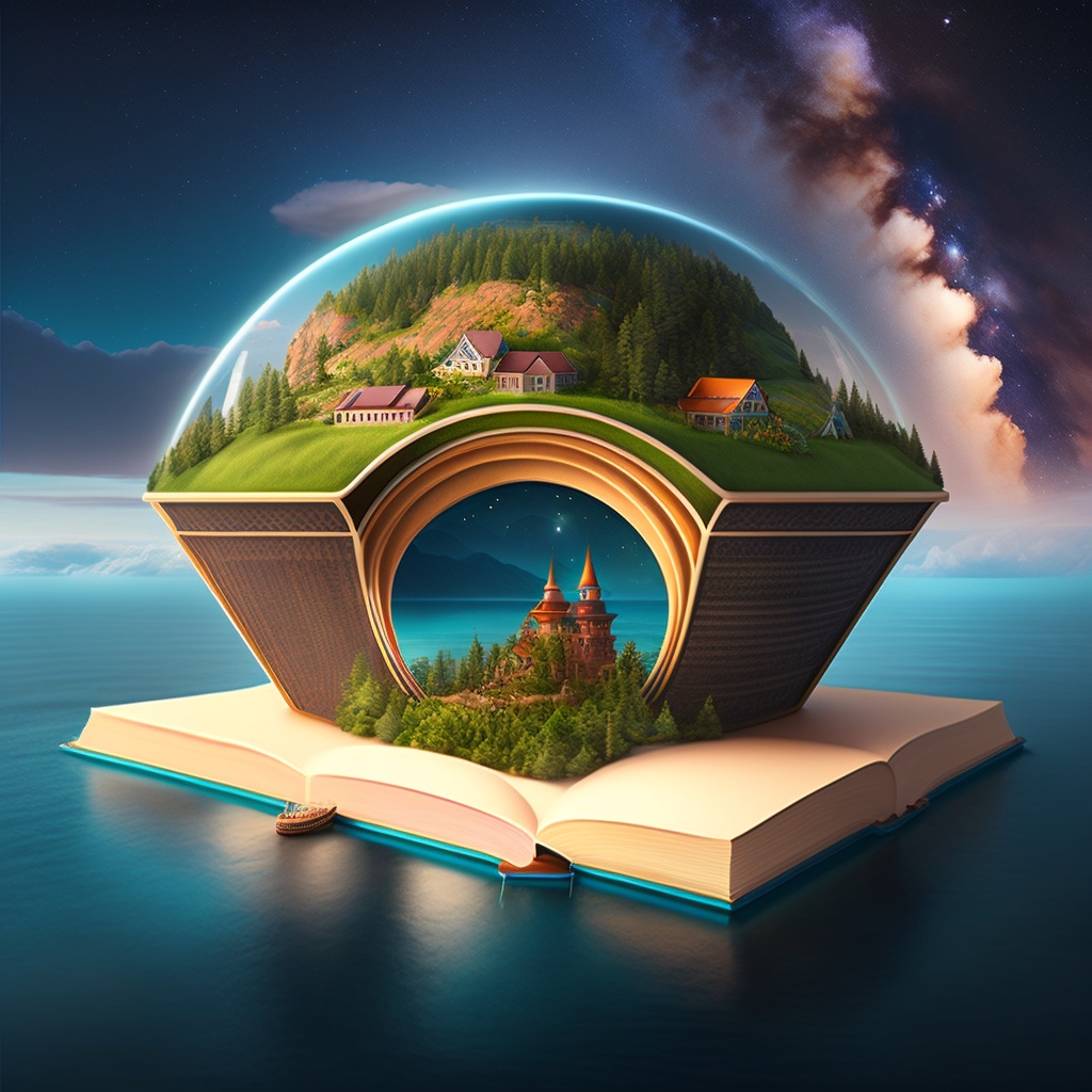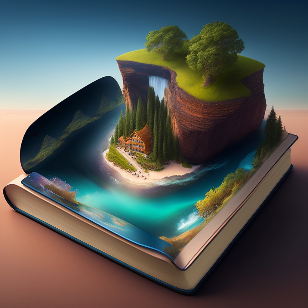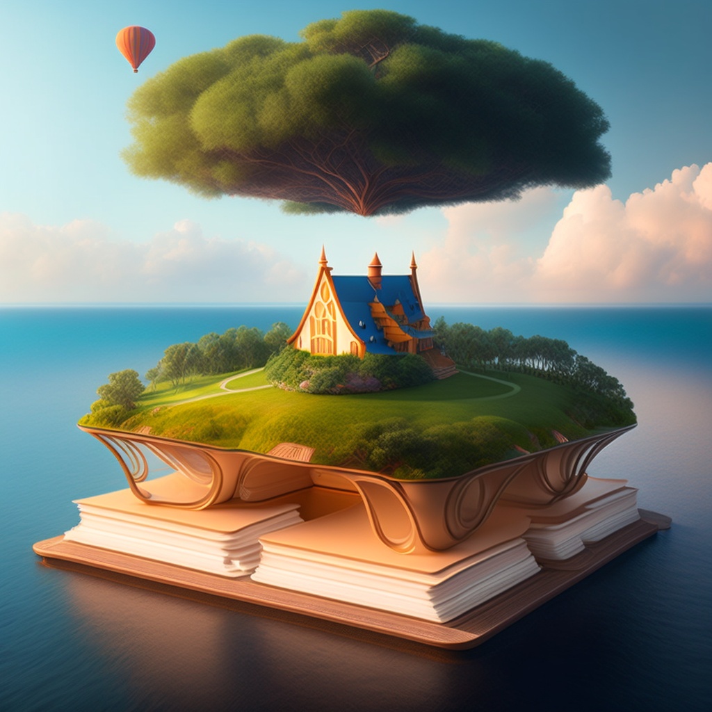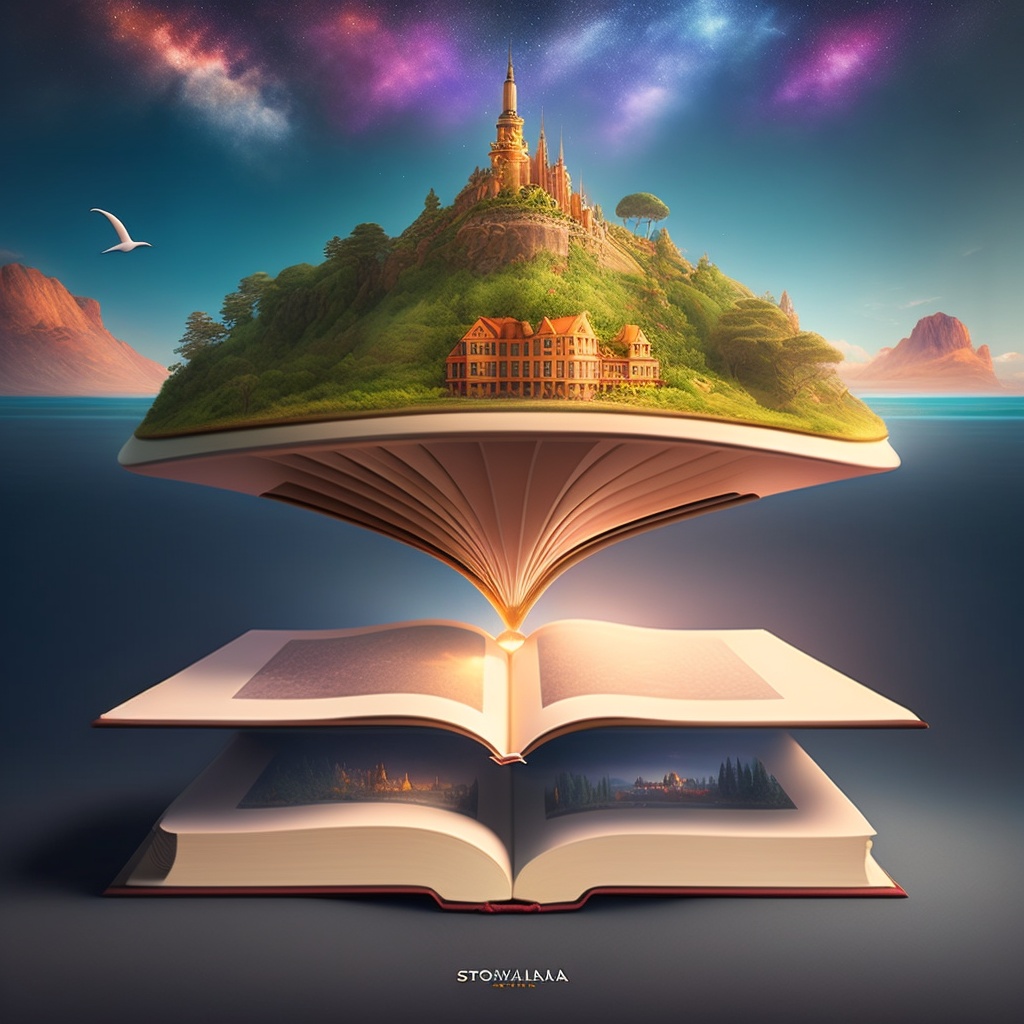 An island in the air looks like a book opened with a huge book below the island is called storylandia, it's a 3d imagined.