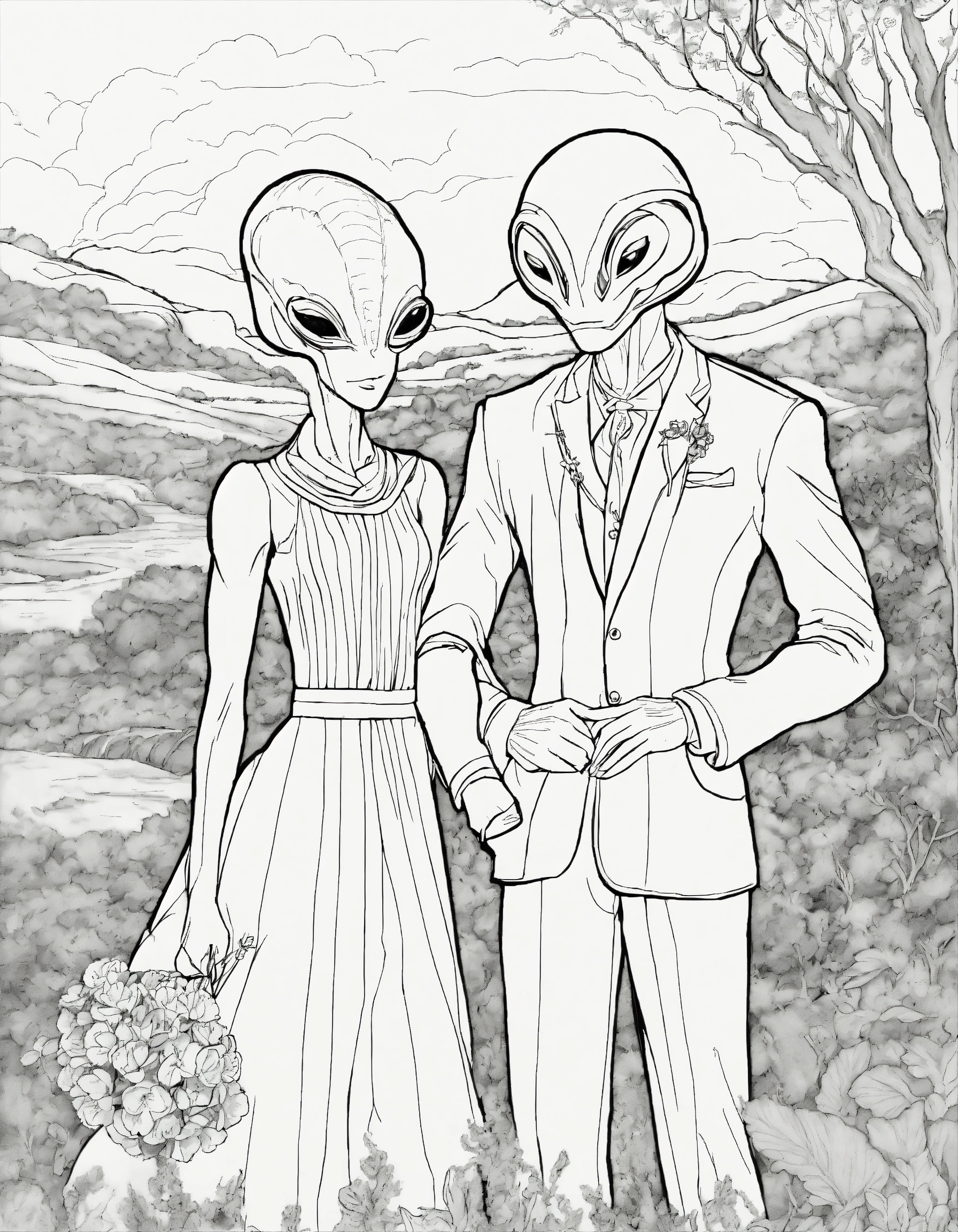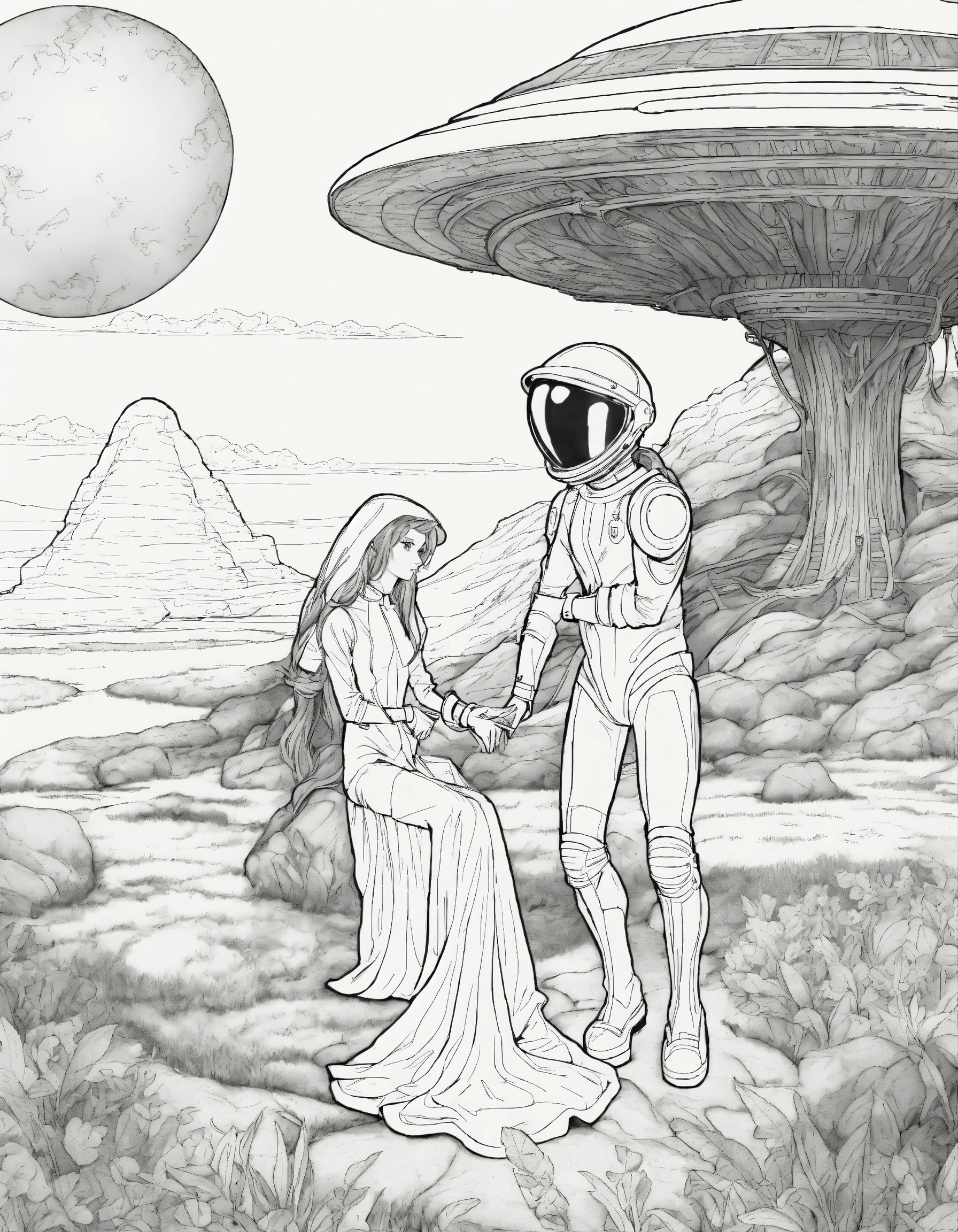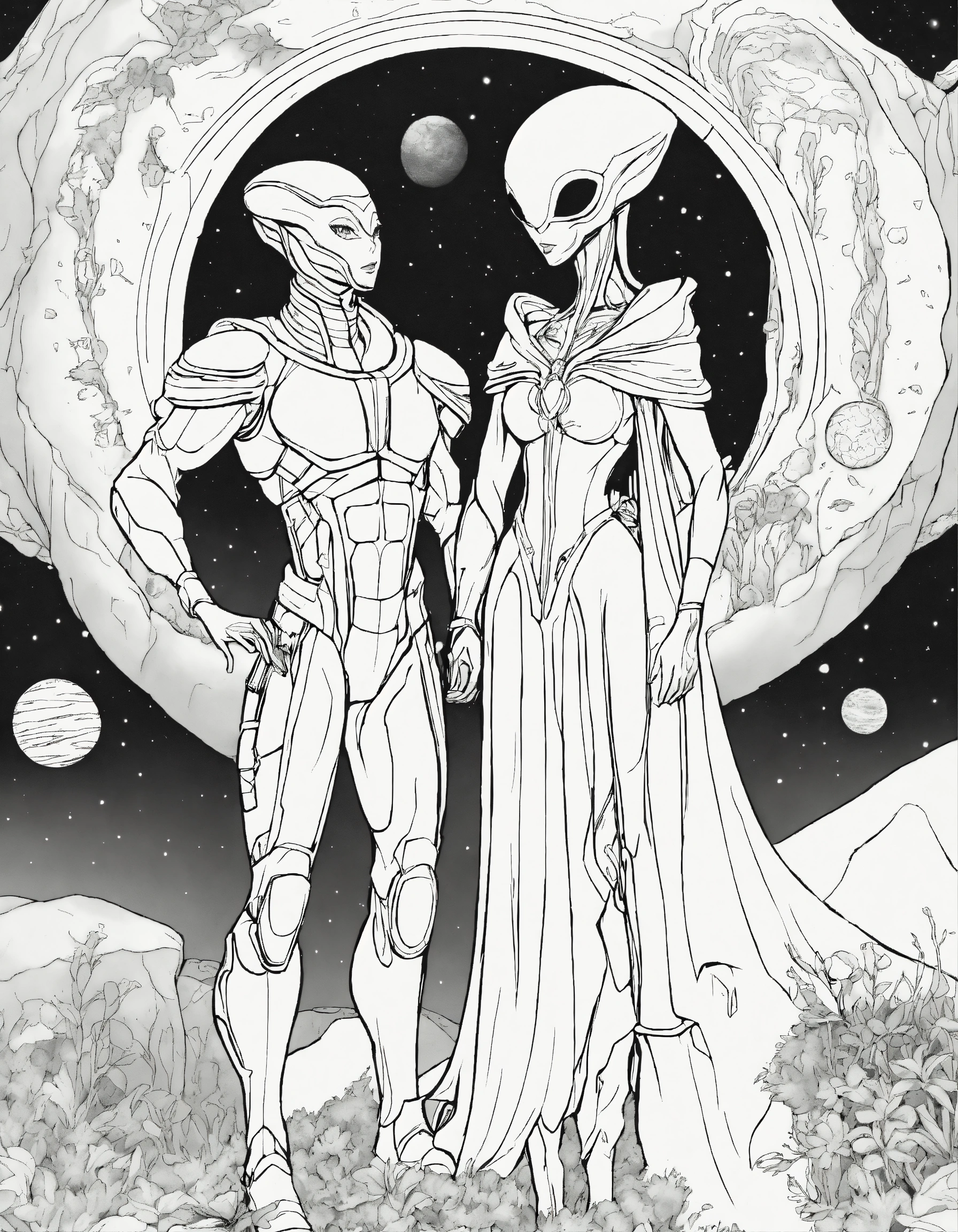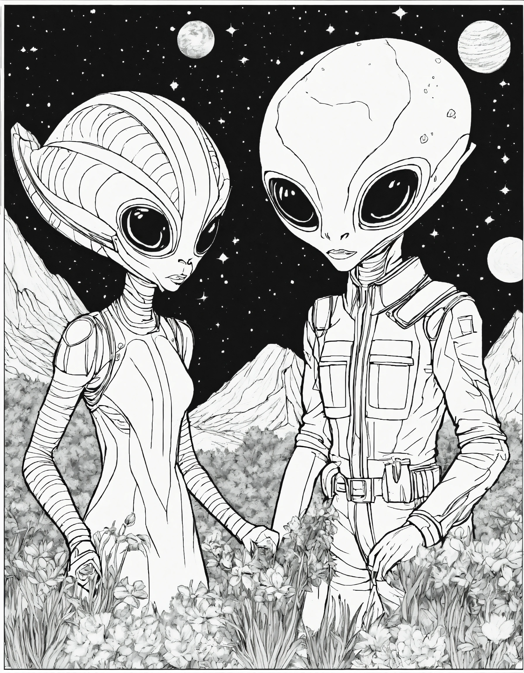 Coloring pages white and black only no color, no grayscale, depicting alien romantic couple in some out of earth setting