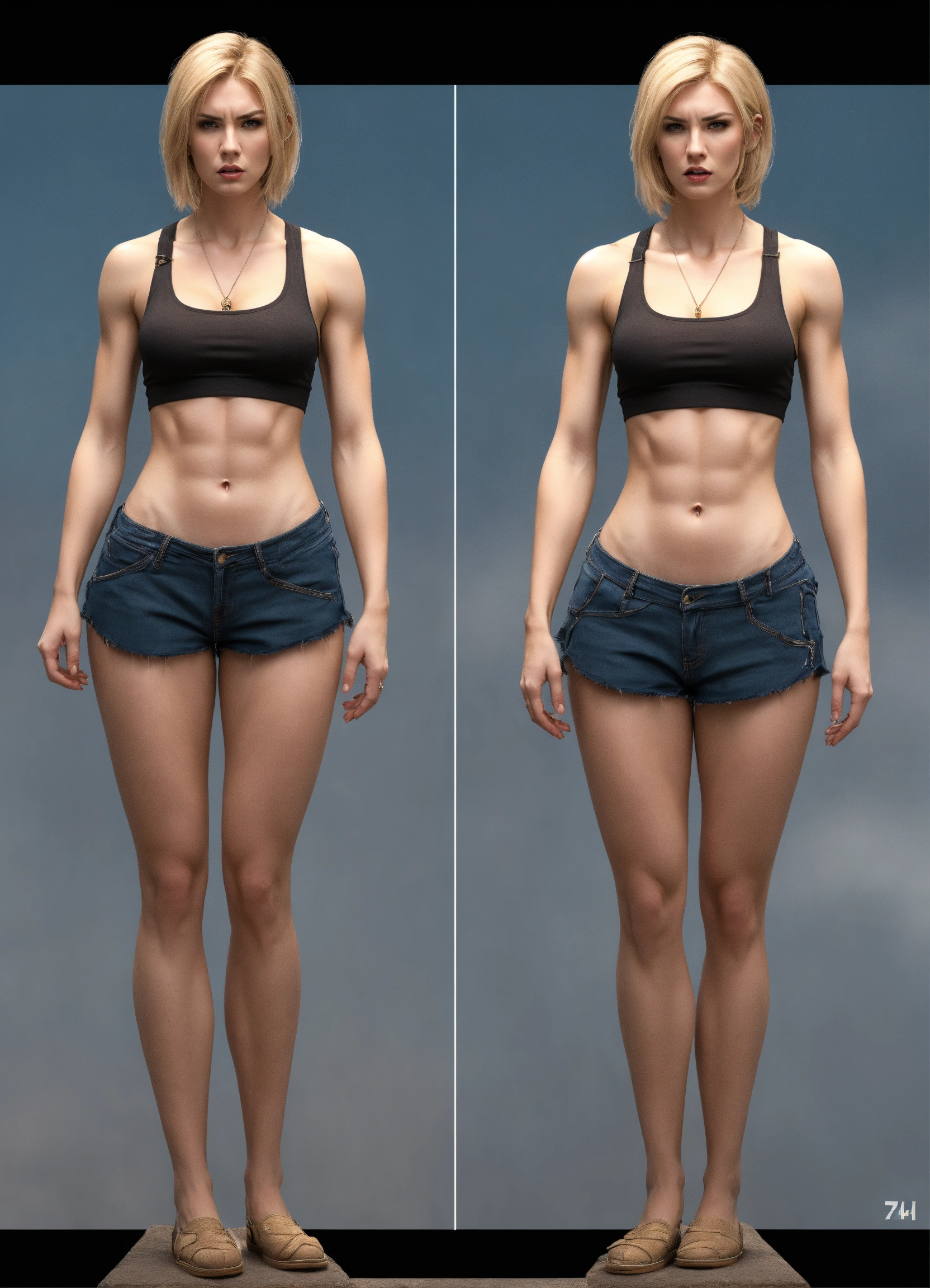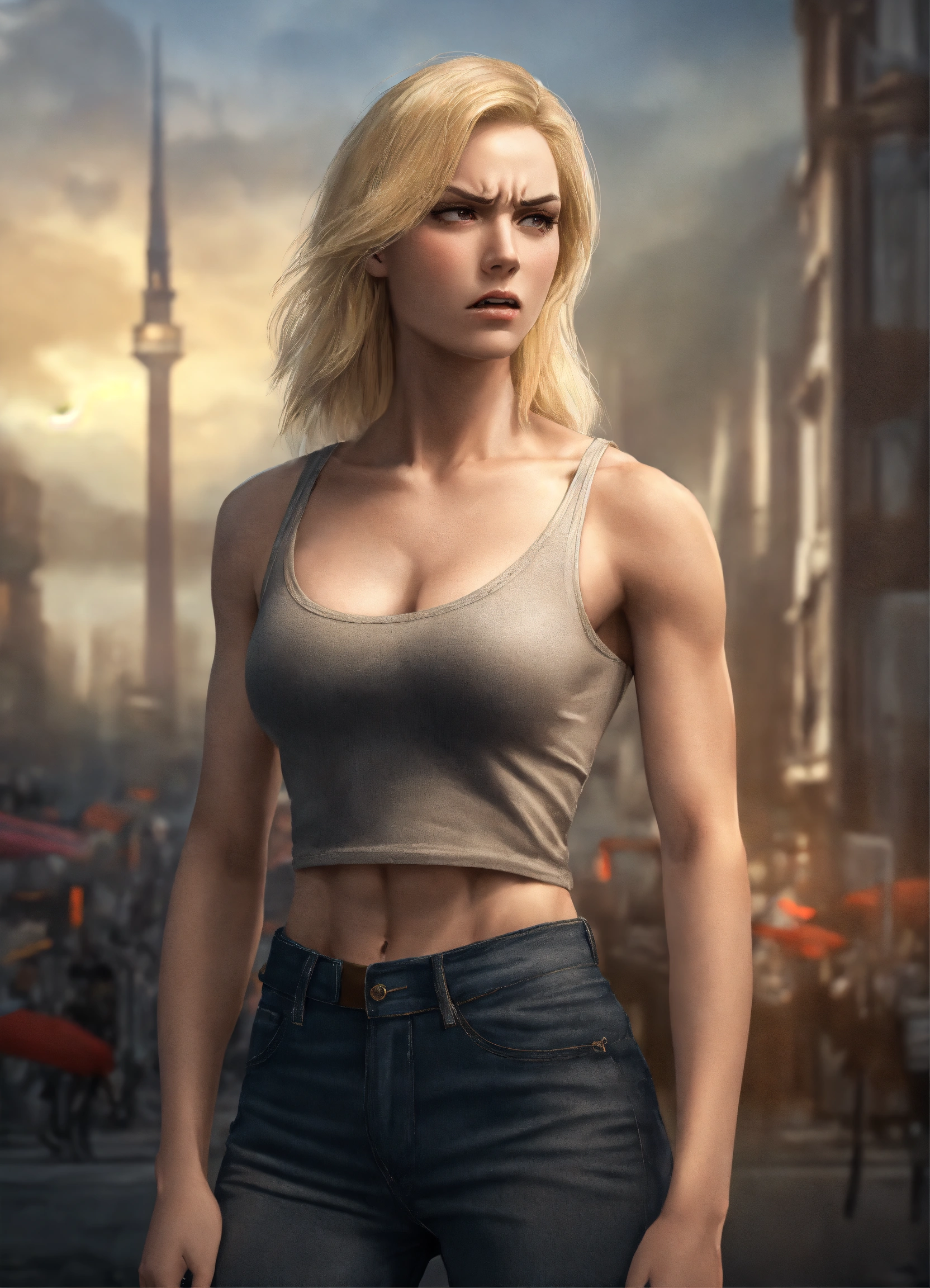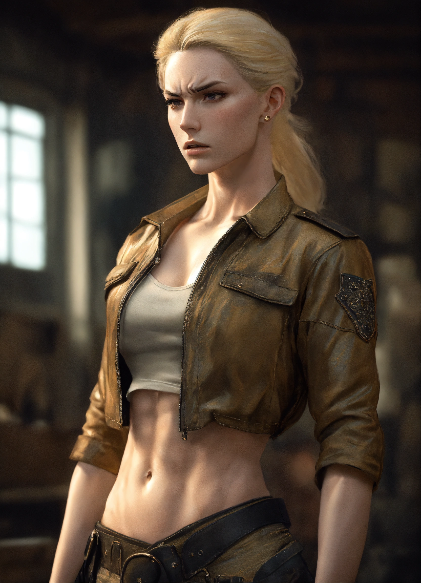 Full body potrait of a tall woman with high cheekbones, very pale skin, blonde hair, heavy chest, thin muscular midriff with angry face, hyper realistic, highly detailed, side glamor pose, 4k, hdr, smooth, sharp focus, high resolution.