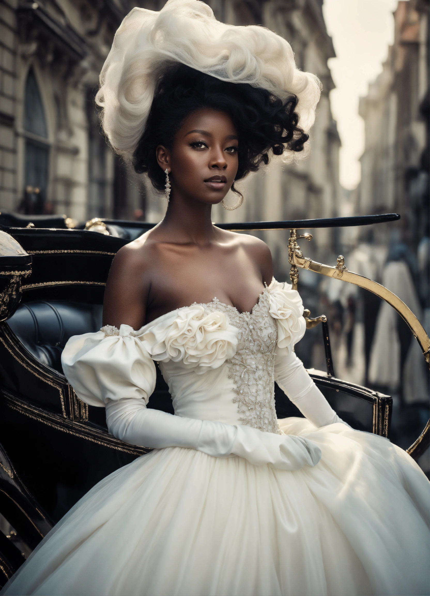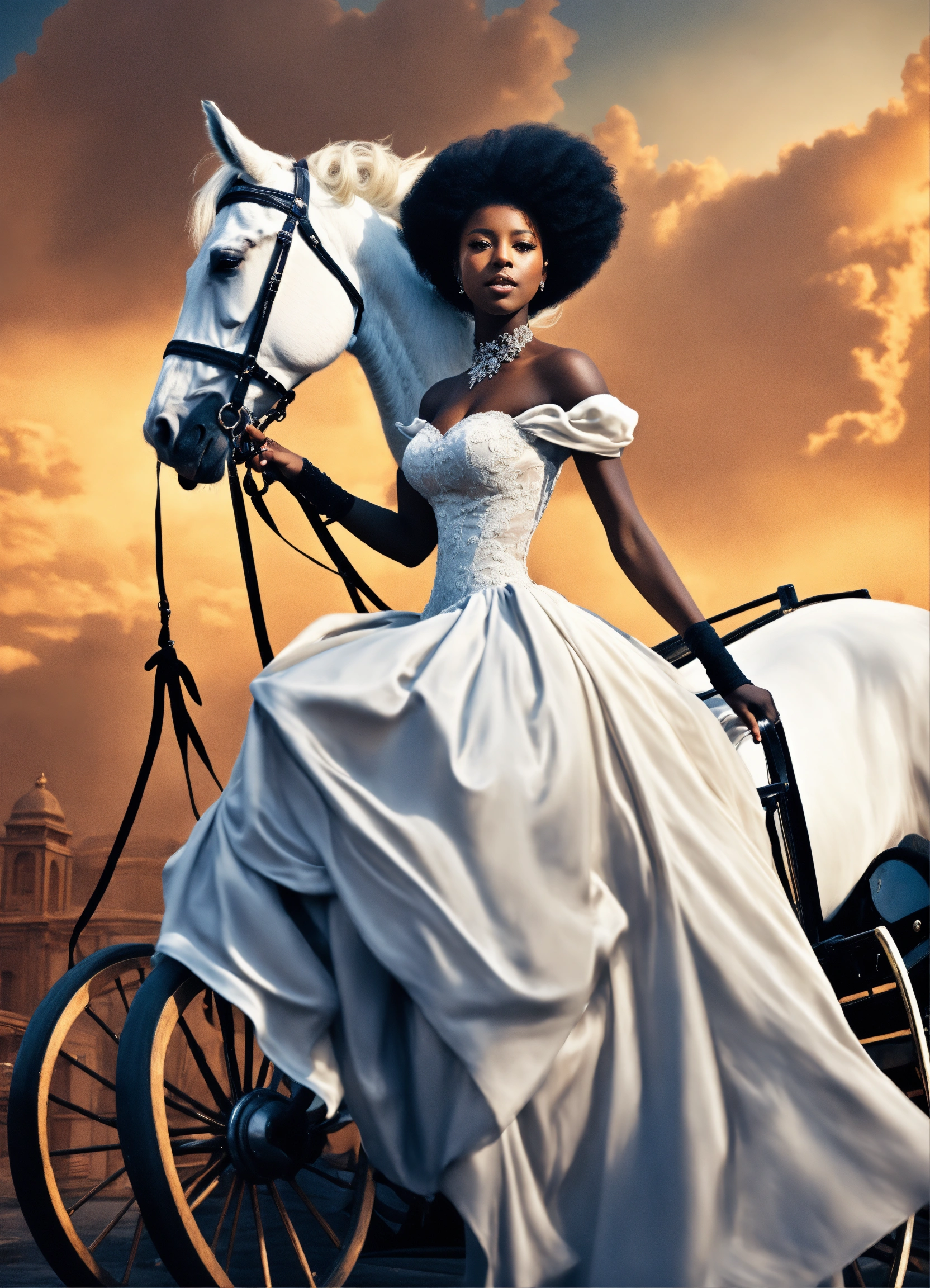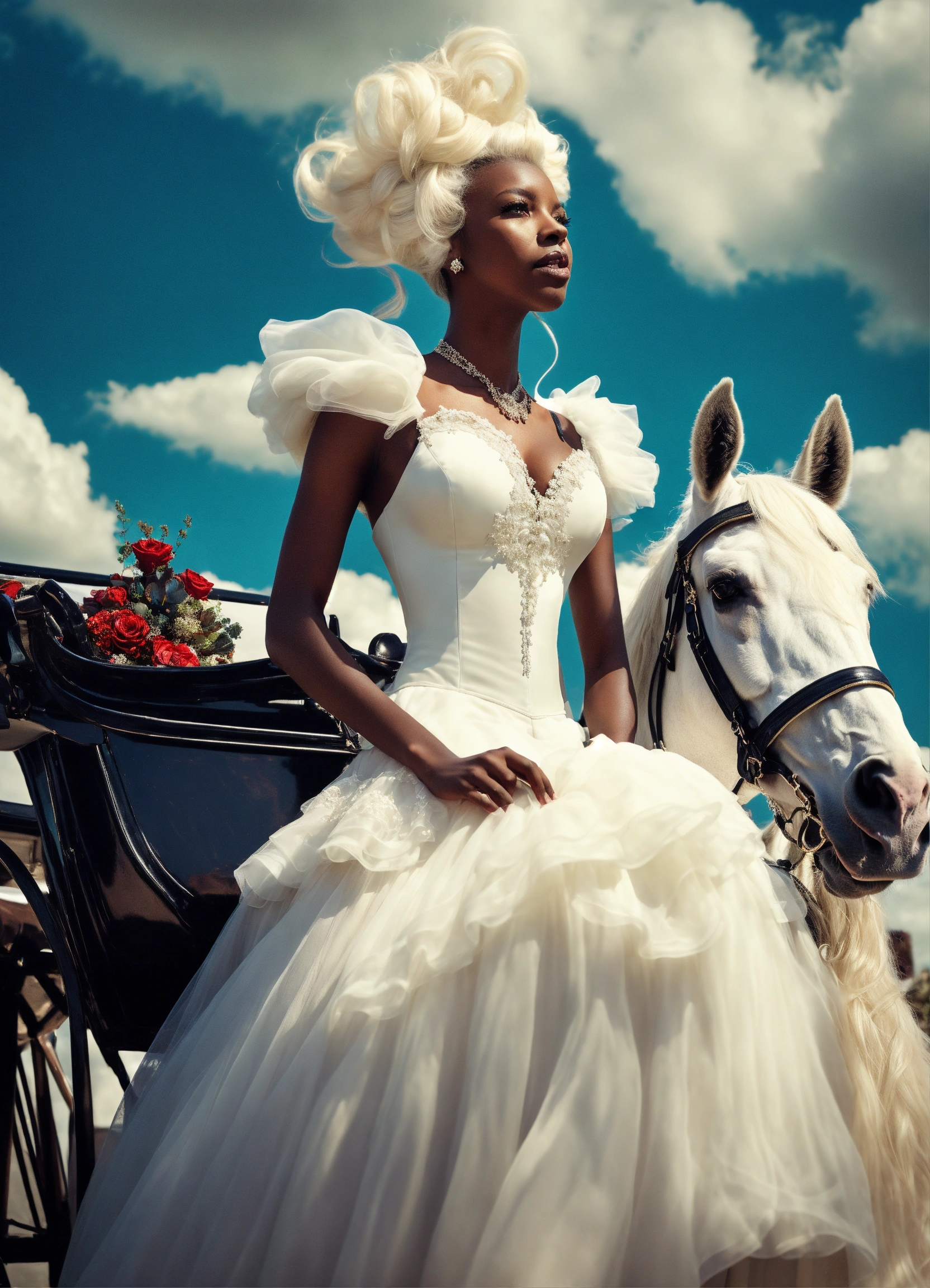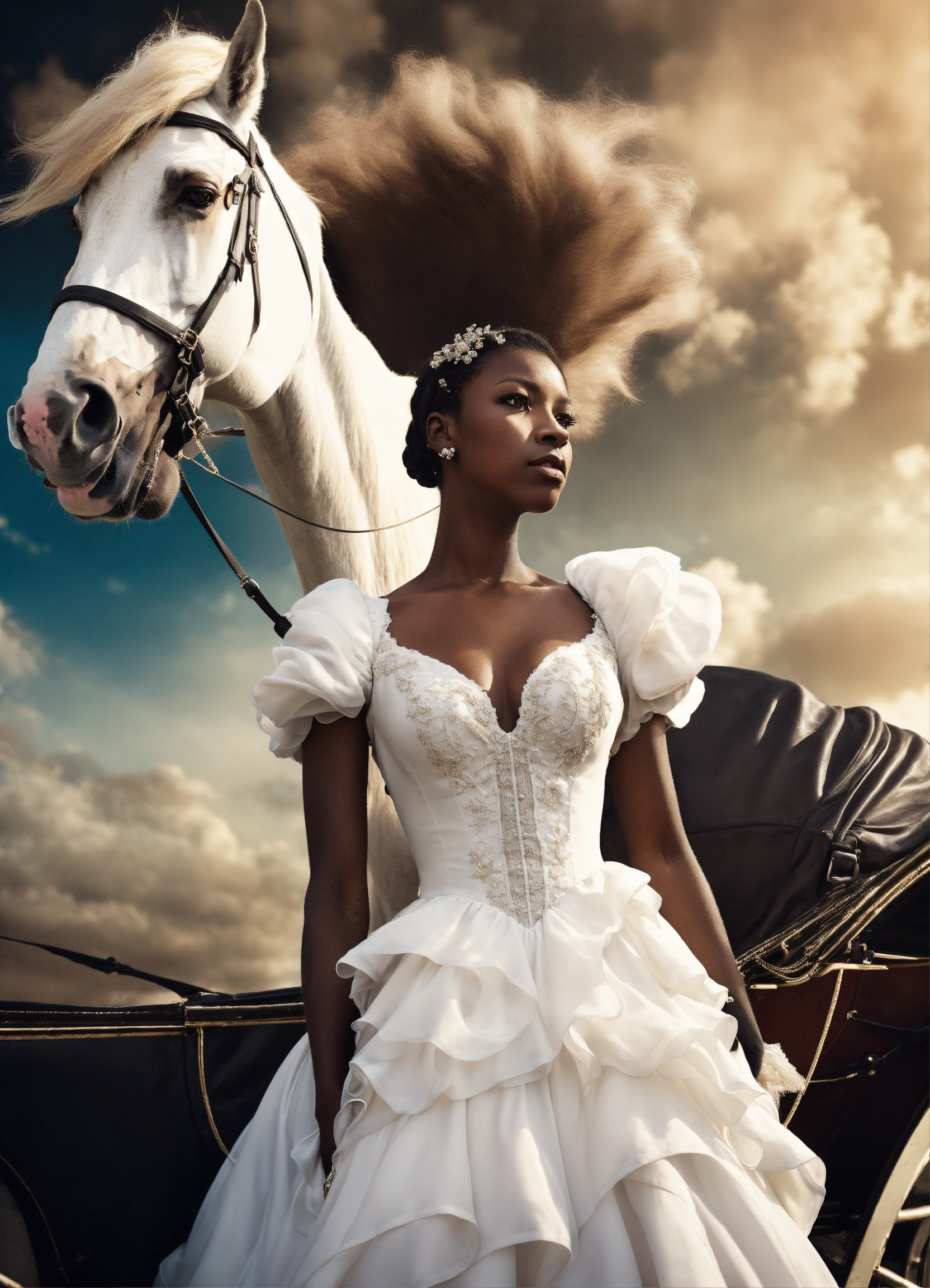 Vintage anime. editorial fashion line shot from the sky, from 20 meters high, looking up at the camera, dark skinned black woman with vintage white horse drawn carriage, edgy, in white ball gown, with white flowing hair, very large shot, super realistic image quality, photorealistic, it s very important that the woman looking up at the camera