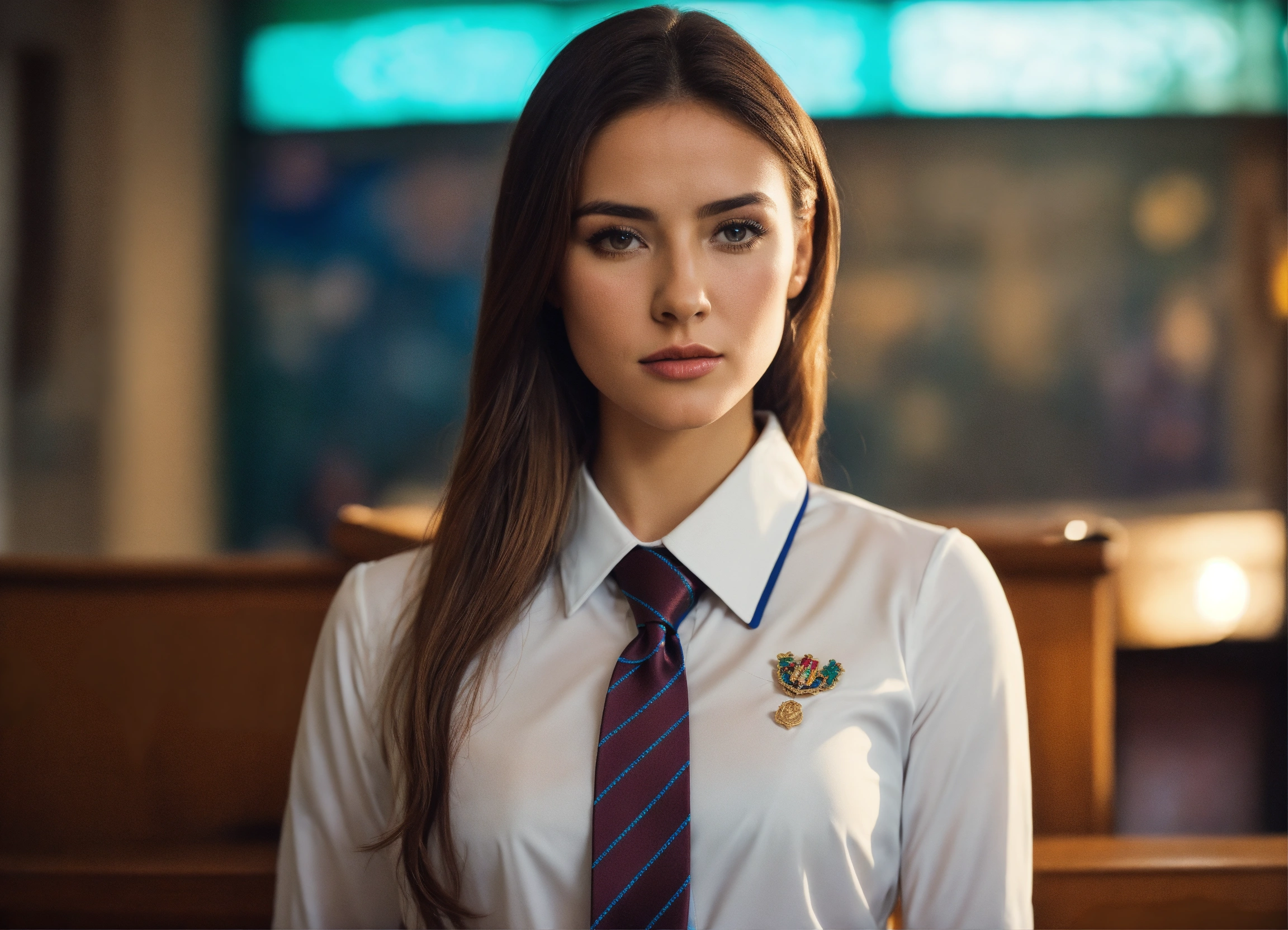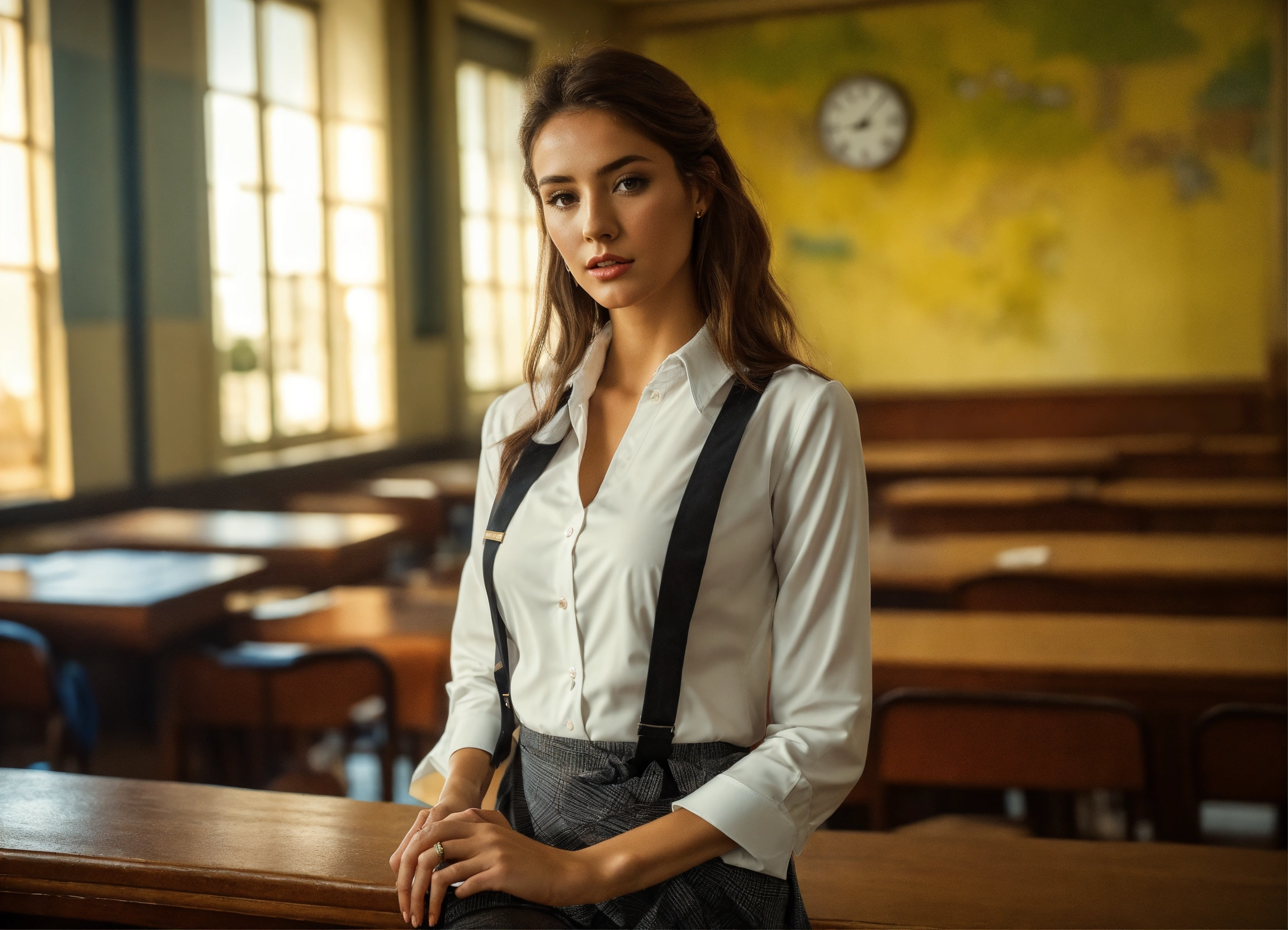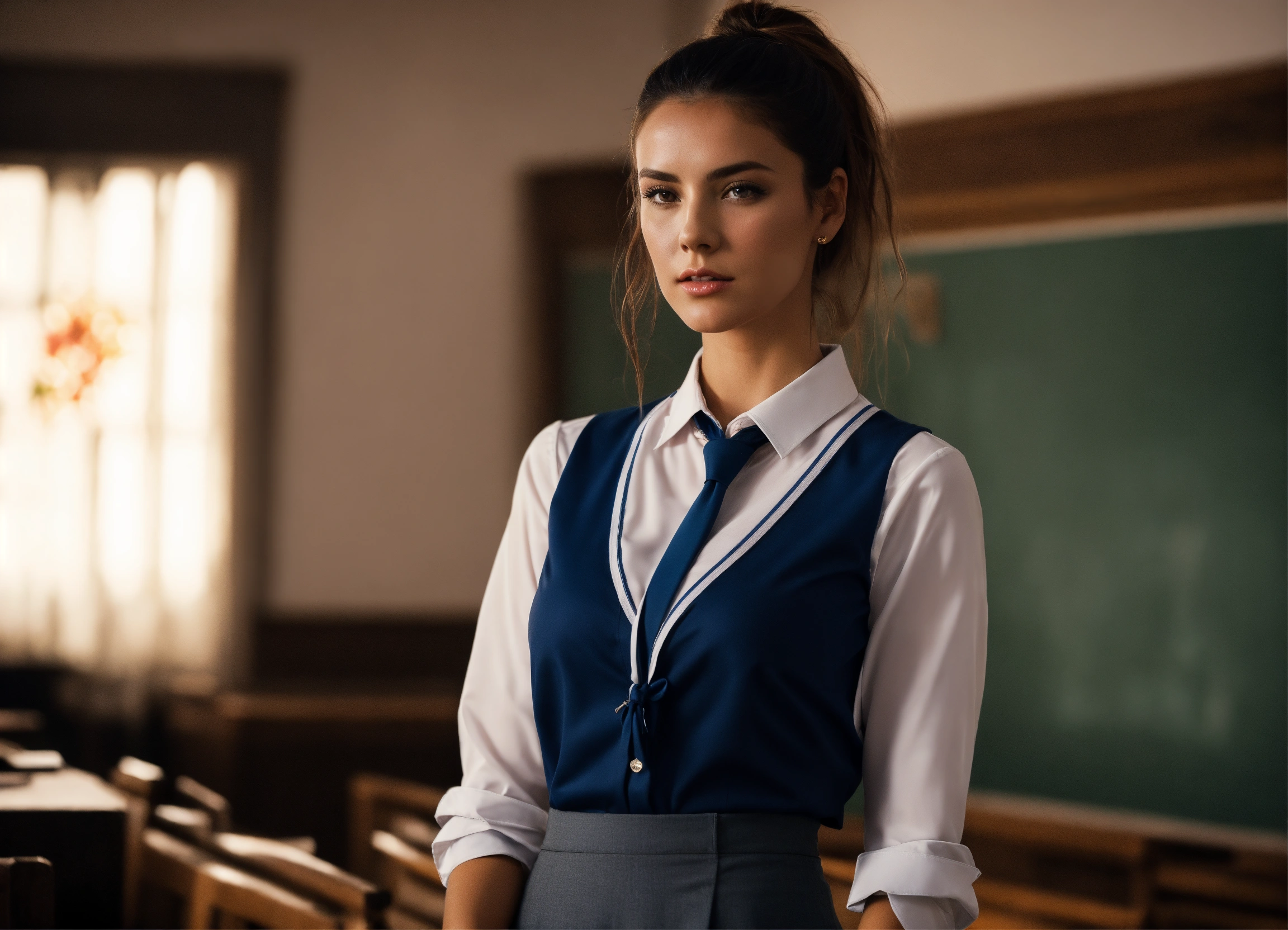 Hot adult woman, southern european, passionate with a boy, spain, taking care, schoolgirls in uniform, private school uniform, jacket, tight shirt, skirt, tights, feminine, school scenes, aura of beauty, relaxation, released tie, wide bust, pure spanish woman, sharp focus, 8k high definition, clothes too small and thin, undersized shirt and prominent body, shot on lo-fi], cinematic, 8k, masterpiece, xf iq 4, 1 5 0 mp, 5 0 mm, iso 2 0 0, 1 / 1 6 0 s, realistic, leading lines composition, symmetrical balance, depth layering, sense of depth, ai enhanced, tailored shirt, tight-fitting, increased bust