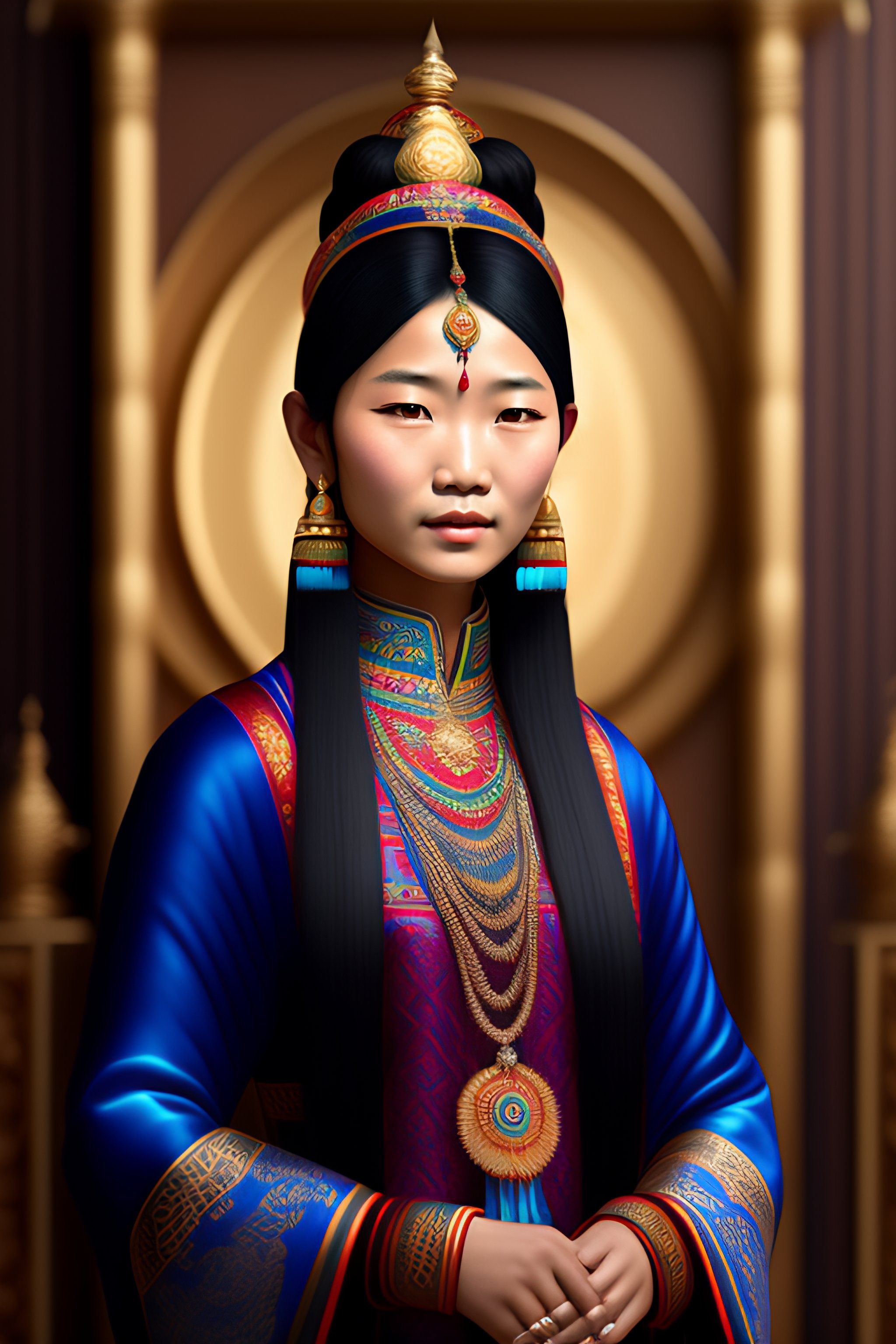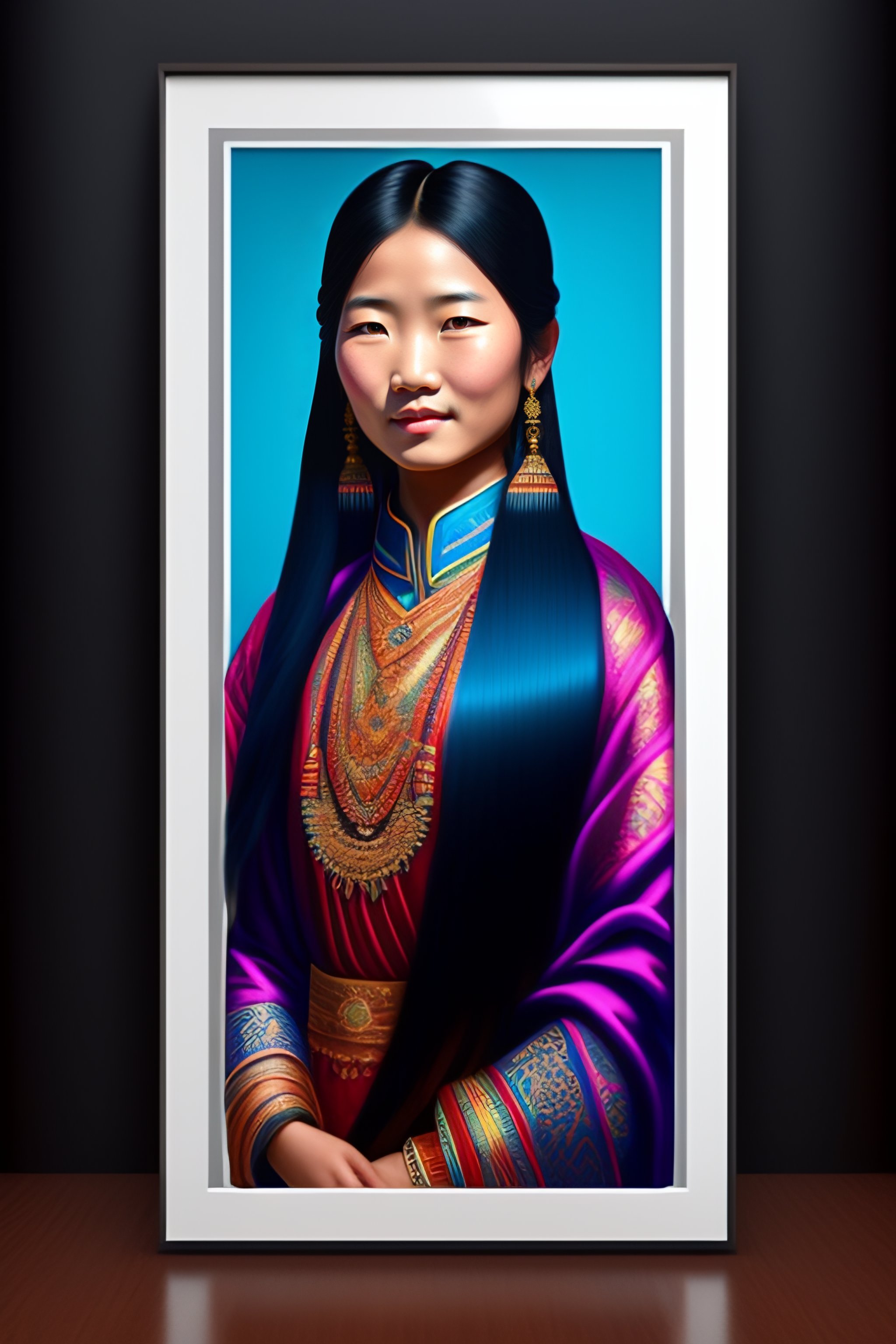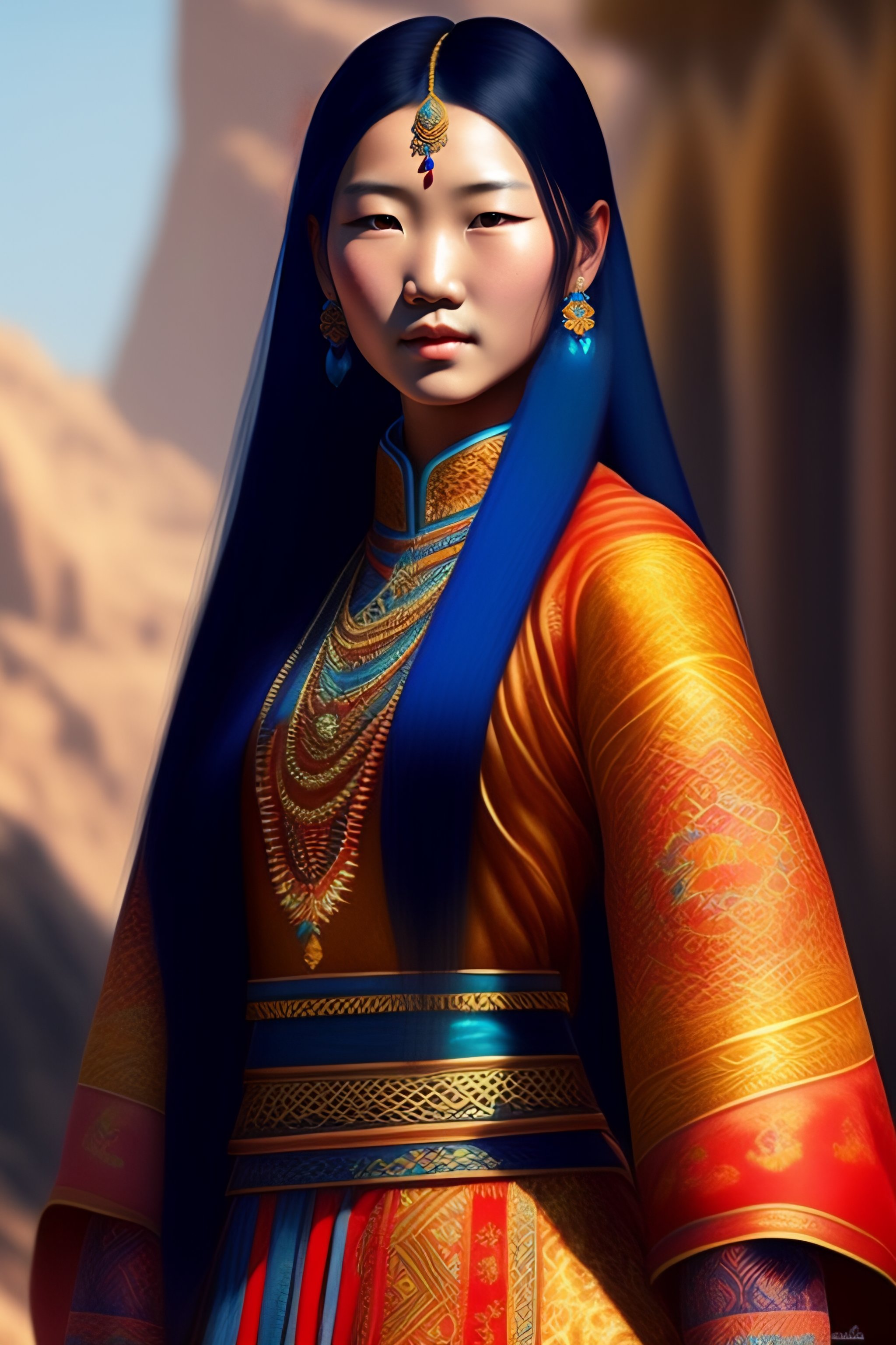 A tibetan girl with blue asian dressing long hair intricate, elegant, highly detailed, realistic arrogant, 3d art