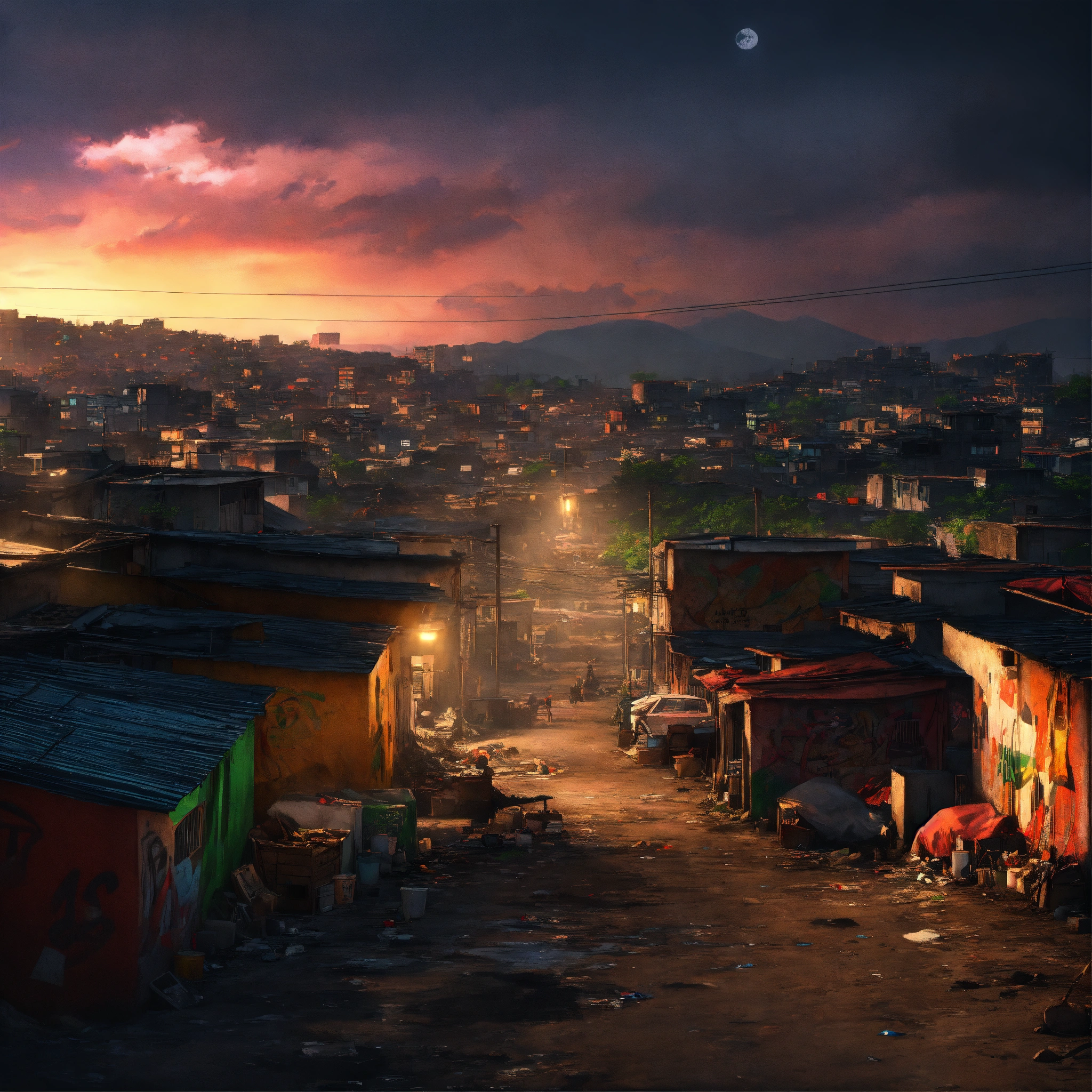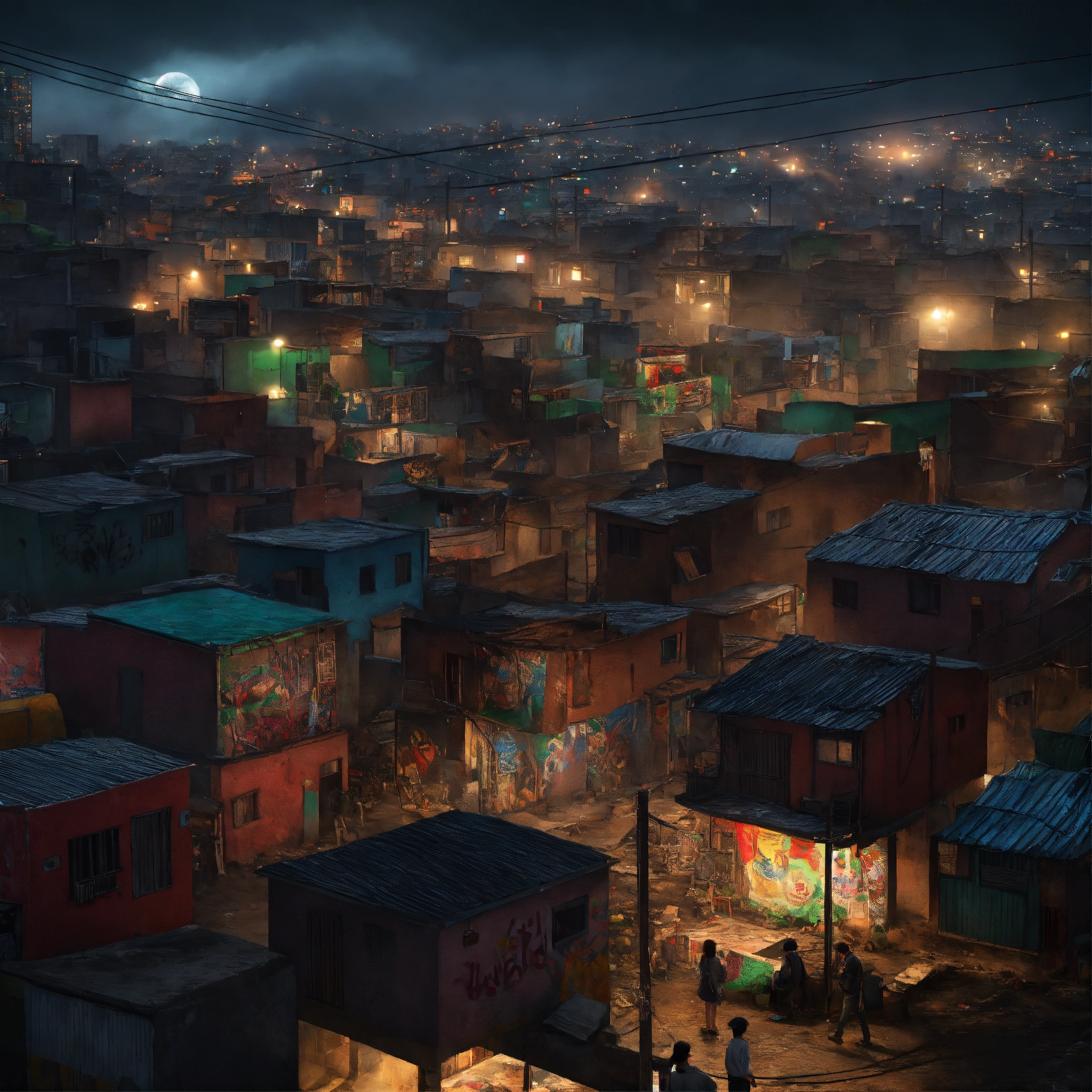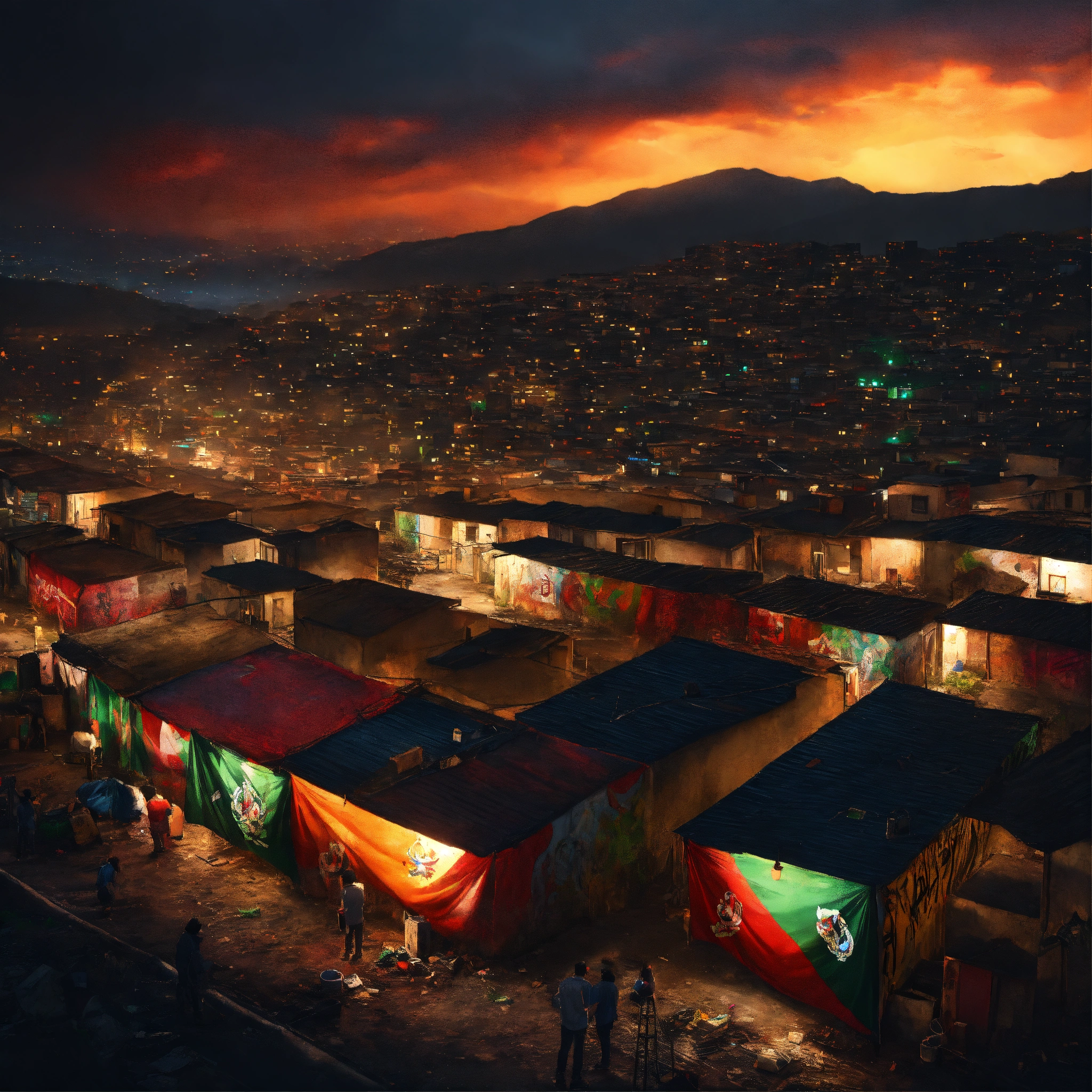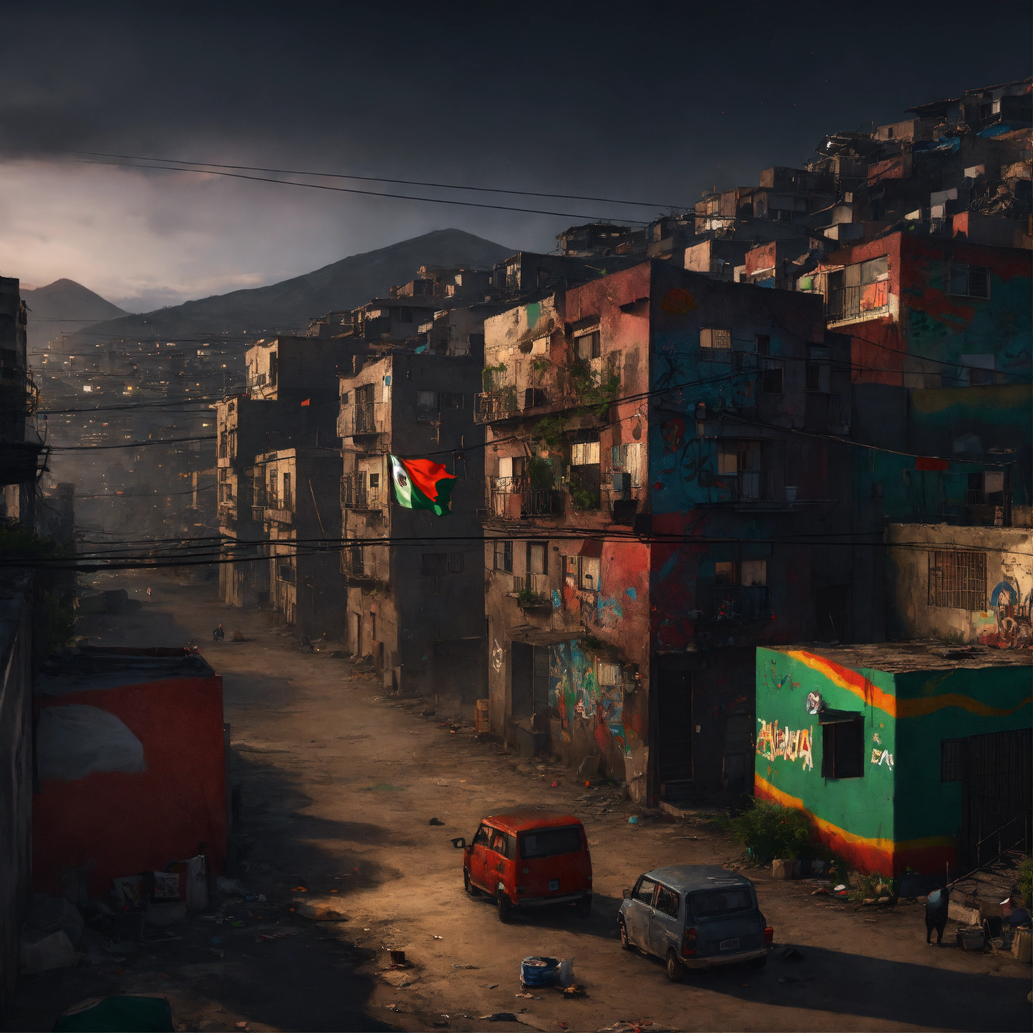 Dark night, mexican flags, 8k resolution, housing project buildings tall, super realistic, graffitti everywhere, mexico slums, stray animals around